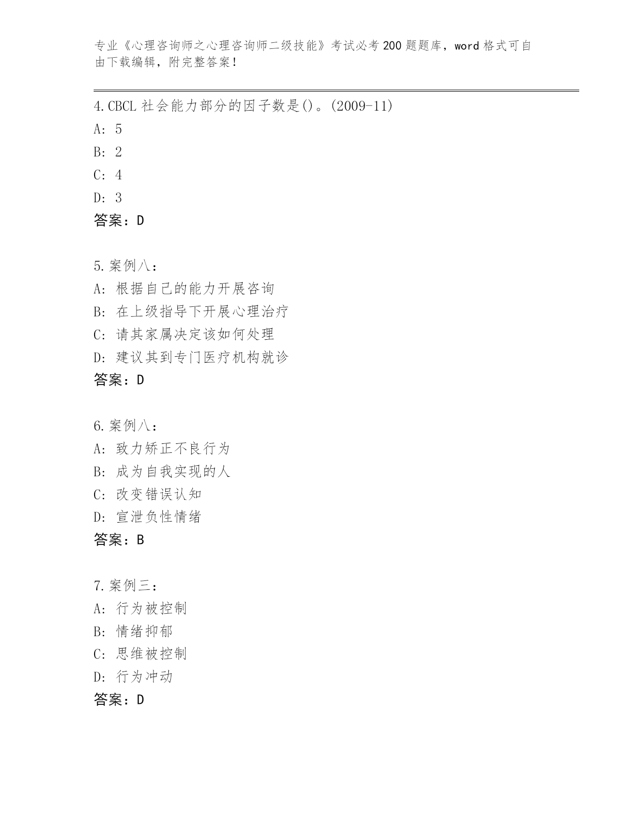 辽宁省完整版《心理咨询师之心理咨询师二级技能》考试必考200题内部题库及答案(全国通用)