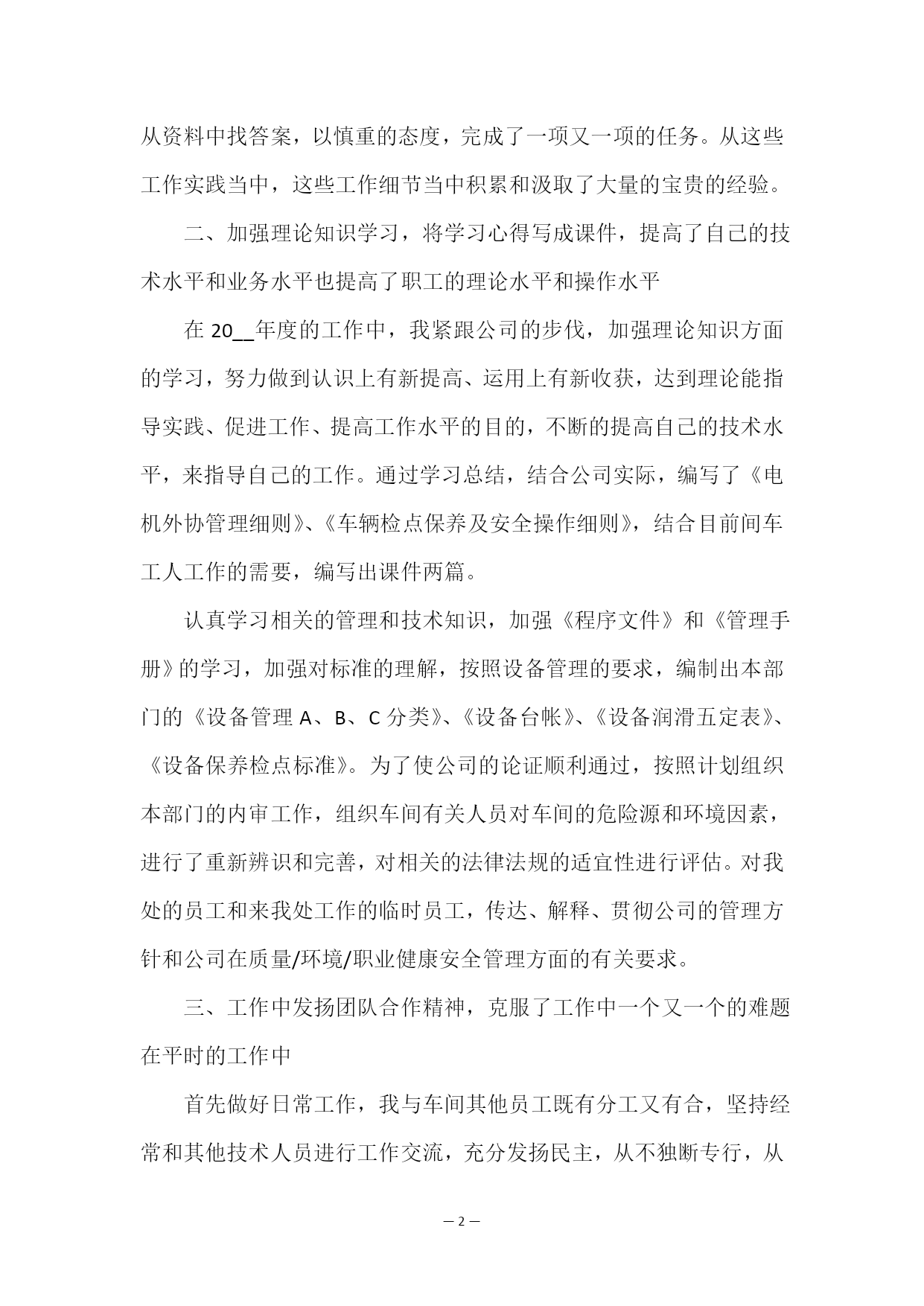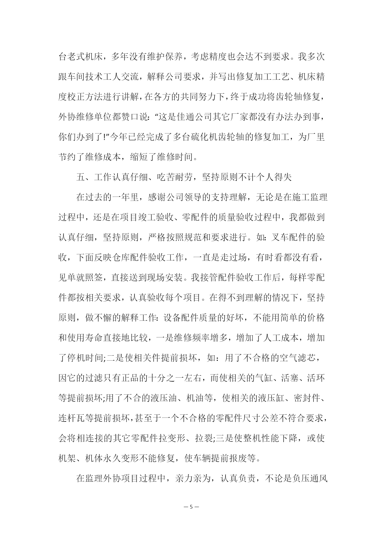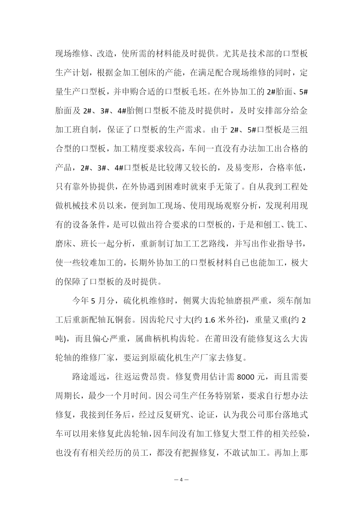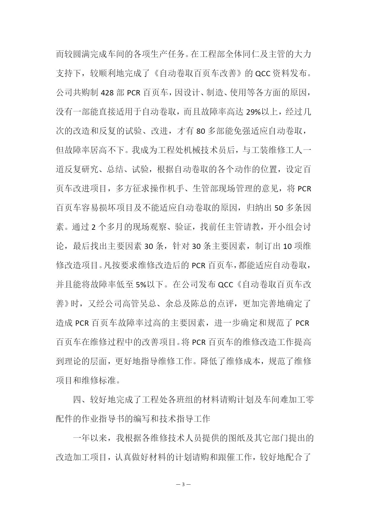 —PAGE\*MERGEFORMAT17—最新技术员年终工作总结模板5篇总结就是对一个时期的学习、工作或其完成情况进行一次全面系统的回顾和分析的书面材料,他能够提升我们的书面表达能力,让我们来为自己写一份总结吧。总结怎么写才是正确的呢?以下我在这给大家整理了一些最新技术员年终工作总结模板,希望对大家有帮助!最新技术员年终工作总结模板120__年是不平凡的一年,对公司来说也是不平凡的一年,也是我个人专业技能全面进步的一年。在过去的一年之中作为一名机械技术员,在公司领导和工友们的关心和支持下,通过努力工作,为企业做出了应有的贡献,也有许多做得不足的一面。现将一年来的工作总结如下:一、工作概况因工程处只有我一个技术员,整个20__年度我负责工程处的机械技术工作。安装班现场技术指导、施工材料预算、请购、跟催及验收;非标制作、金加工班技术指导、材料预算、请购、跟催及验收;叉车维修班零配件请购、跟催及检验;工程处外协项目的监理;因没有电器技术员,还兼综合班电器维修技术指导,电源改造、现场亮度改善、空调维保等技术指导及材料请购、跟催、外协验收等工作。面对一系列繁忙的日常工作任务及繁重的外协监理、验收任务;面对一项项陌生的技术工作。我和工程处全体员工一起共同探讨,在工作中找方法,从资料中找答案,以慎重的态度,完成了一项又一项的任务。从这些工作实践当中,这些工作细节当中积累和汲取了大量的宝贵的经验。二、加强理论知识学习,将学习心得写成课件,提高了自己的技术水平和业务水平也提高了职工的理论水平和操作水平在20__年度的工作中,我紧跟公司的步伐,加强理论知识方面的学习,努力做到认识上有新提高、运用上有新收获,达到理论能指导实践、促进工作、提高工作水平的目的,不断的提高自己的技术水平,来指导自己的工作。通过学习总结,结合公司实际,编写了《电机外协管理细则》、《车辆检点保养及安全操作细则》,结合目前间车工人工作的需要,编写出课件两篇。认真学习相关的管理和技术知识,加强《程序文件》和《管理手册》的学习,加强对标准的理解,按照设备管理的要求,编制出本部门的《设备管理A、B、C分类》、《设备台帐》、《设备润滑五定表》、《设备保养检点标准》。为了使公司的论证顺利通过,按照计划组织本部门的内审工作,组织车间有关人员对车间的危险源和环境因素,进行了重新辨识和完善,对相关的法律法规的适宜性进行评估。对我处的员工和来我处工作的临时员工,传达、解释、贯彻公司的管理方针和公司在质量/环境/职业健康安全管理方面的有关要求。三、工作中发扬团队合作精神,克服了工作中一个又一个的难题在平时的工作中首先做好日常工作,我与车间其他员工既有分工又有合,坚持经常和其他技术人员进行工作交流,充分发扬民主,从不独断专行,从而较圆满完成车间的各项生产任务。在工程部全体同仁及主管的大力支持下,较顺利地完成了《自动卷取百页车改善》的QCC资料发布。公司共购制428部PCR百页车,因设计、制造、使用等各方面的原因,没有一部能直接适用于自动卷取,而且故障率高达29%以上,经过几次的改造和反复的试验、改进,才有80多部能免强适应自动卷取,但故障率居高不下。我成为工程处机械技术员后,与工装维修工人一道反复研究、总结、试验,根据自动卷取的各个动作的位置,设定百页车改进项目,多方征求操作机手、生管部现场管理的意见,将PCR百页车容易损坏项目及不能适应自动卷取的原因,归纳出50多条因素。通过2个多月的现场观察、验证,找前任主管请教,开小组会讨论,最后找出主要因素30条,针对30条主要因素,制订出10项维修改造项目。凡按要求维修改造后的PCR百页车,都能适应自动卷取,并且能将故障率低至5%以下。在公司发布QCC《自动卷取百页车改善》时,又经公司高管吴总、余总及陈总的点评,更加完善地确定了造成PCR百页车故障率过高的主要因素,进一步确定和规范了PCR百页车在维修过程中的改善项目。将PCR百页车的维修改造工作提高到理论的层面,更好地指导维修工作。降低了维修成本,规范了维修项目和维修标准。四、较好地完成了工程处各班组的材料请购计划及车间难加工零配件的作业指导书的编写和技术指导工作一年以来,我根据各维修技术人员提供的图纸及其它部门提出的改造加工项目,认真做好材料的计划请购和跟催工作,较好地配合了现场维修、改造,使所需的材料能及时提供。尤其是技术部的口型板生产计划,根据金加工刨床的产能,在满足配合现场维修的同时,定量生产口型板,并申购合适的口型板毛坯。在外协加工的2#胎面、5#胎面及2#、3#、4#胎侧口型板不能及时提供时,及时安排部分给金加工班自制,保证了口型板的生产需求。由于2#、5#口型板是三组合型的口型板,加工精度要求较高,车间一直没有办法加工出合格的产品,2#、3#、4#