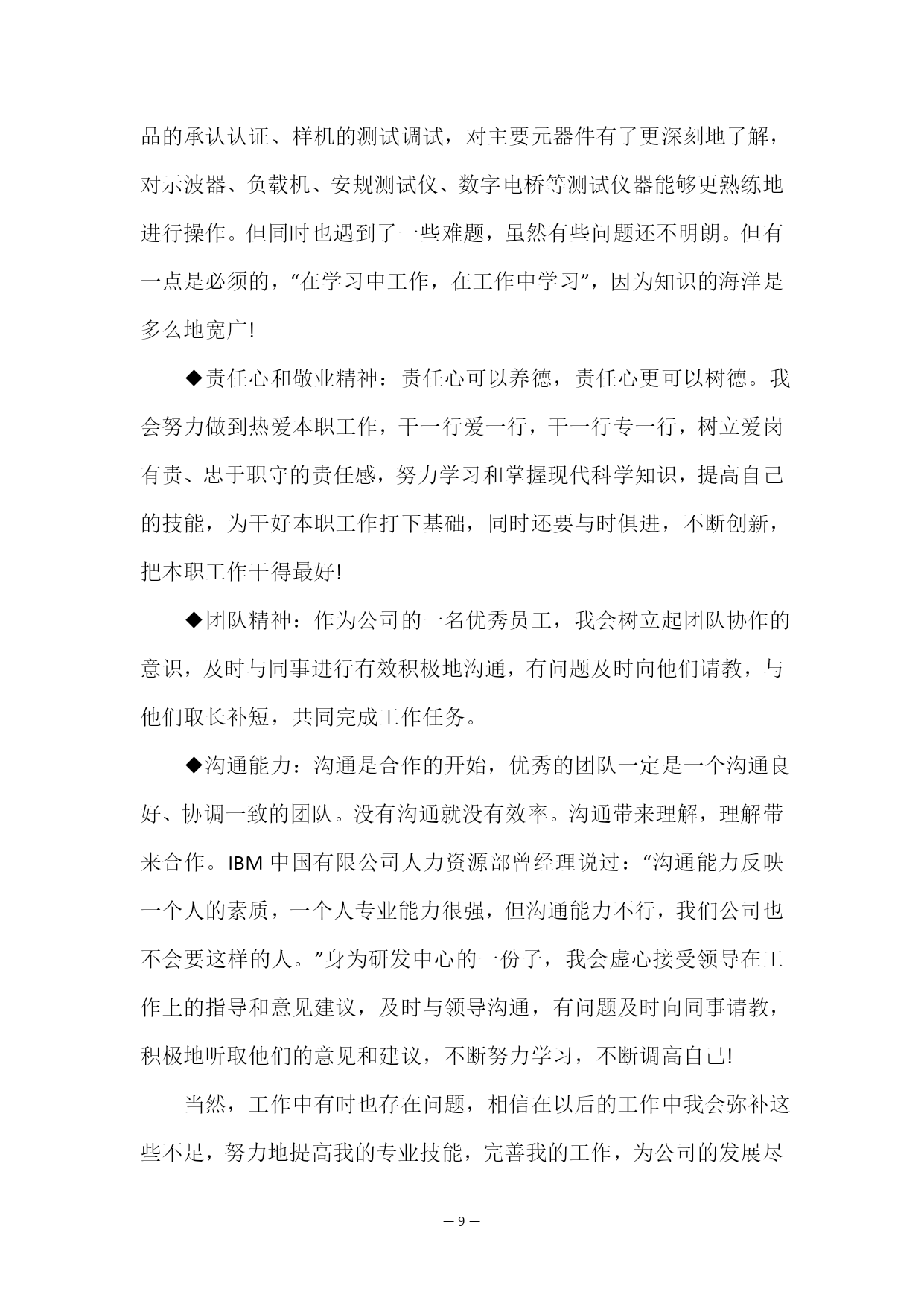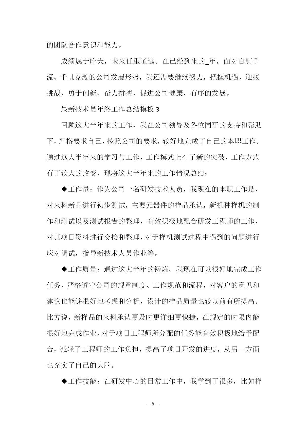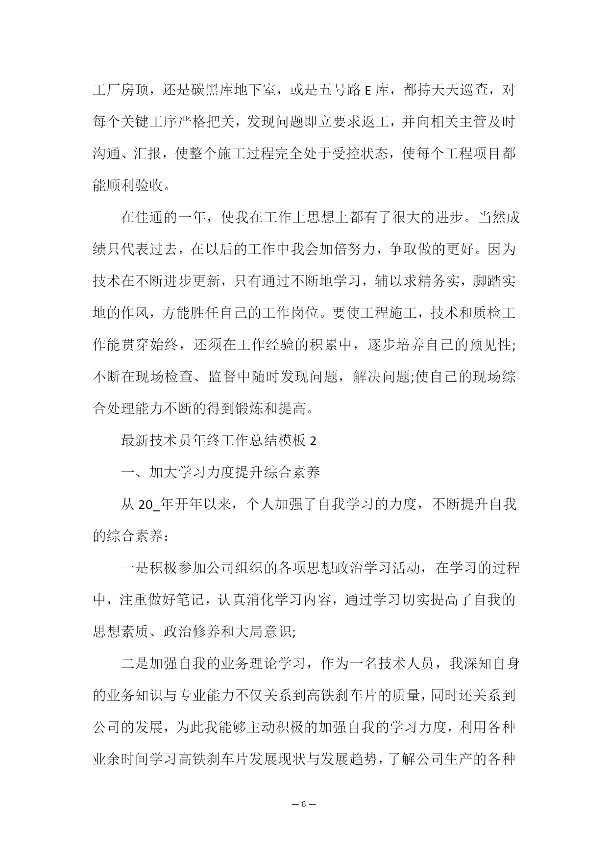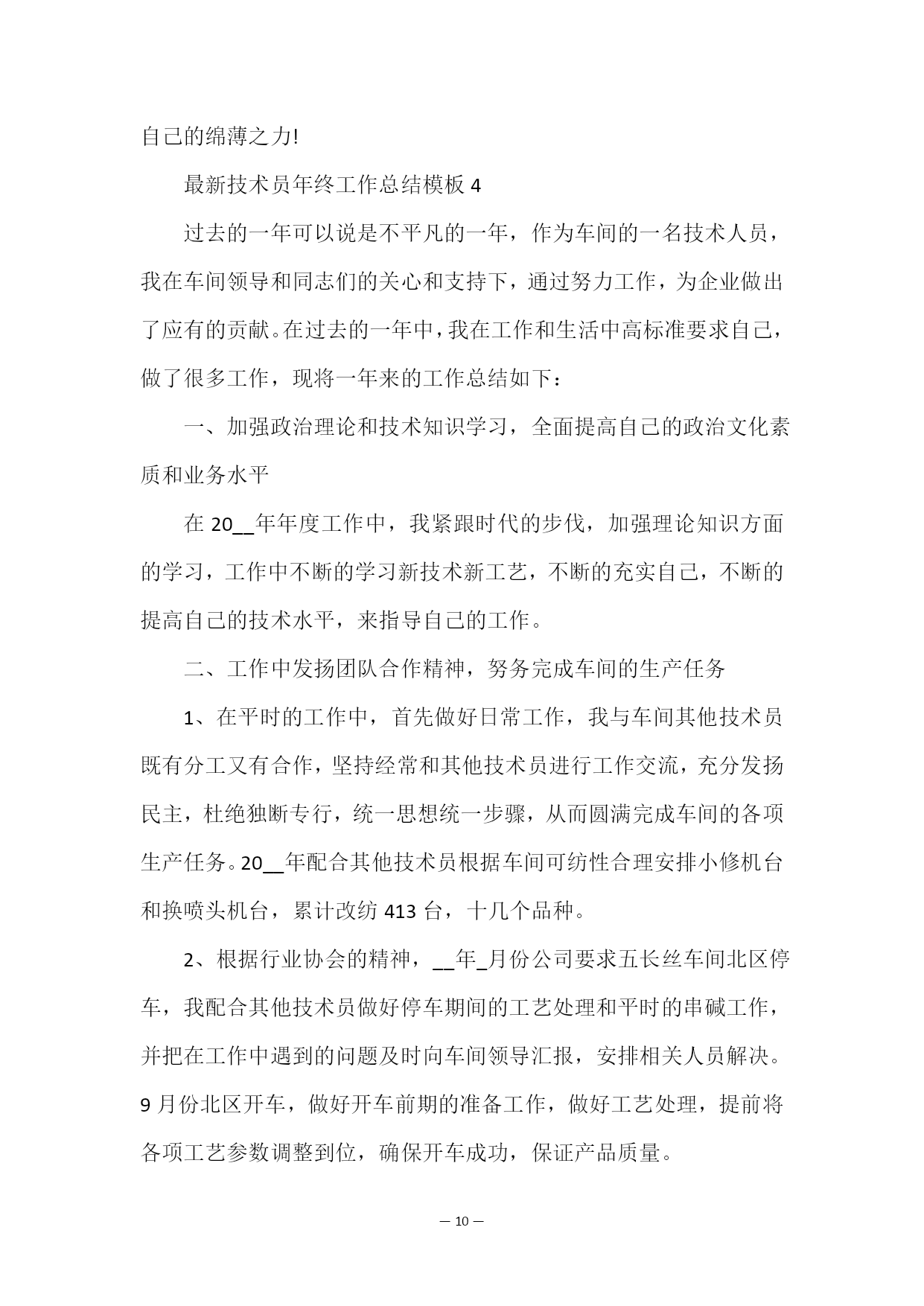 —PAGE\*MERGEFORMAT17—最新技术员年终工作总结模板5篇总结就是对一个时期的学习、工作或其完成情况进行一次全面系统的回顾和分析的书面材料,他能够提升我们的书面表达能力,让我们来为自己写一份总结吧。总结怎么写才是正确的呢?以下我在这给大家整理了一些最新技术员年终工作总结模板,希望对大家有帮助!最新技术员年终工作总结模板120__年是不平凡的一年,对公司来说也是不平凡的一年,也是我个人专业技能全面进步的一年。在过去的一年之中作为一名机械技术员,在公司领导和工友们的关心和支持下,通过努力工作,为企业做出了应有的贡献,也有许多做得不足的一面。现将一年来的工作总结如下:一、工作概况因工程处只有我一个技术员,整个20__年度我负责工程处的机械技术工作。安装班现场技术指导、施工材料预算、请购、跟催及验收;非标制作、金加工班技术指导、材料预算、请购、跟催及验收;叉车维修班零配件请购、跟催及检验;工程处外协项目的监理;因没有电器技术员,还兼综合班电器维修技术指导,电源改造、现场亮度改善、空调维保等技术指导及材料请购、跟催、外协验收等工作。面对一系列繁忙的日常工作任务及繁重的外协监理、验收任务;面对一项项陌生的技术工作。我和工程处全体员工一起共同探讨,在工作中找方法,从资料中找答案,以慎重的态度,完成了一项又一项的任务。从这些工作实践当中,这些工作细节当中积累和汲取了大量的宝贵的经验。二、加强理论知识学习,将学习心得写成课件,提高了自己的技术水平和业务水平也提高了职工的理论水平和操作水平在20__年度的工作中,我紧跟公司的步伐,加强理论知识方面的学习,努力做到认识上有新提高、运用上有新收获,达到理论能指导实践、促进工作、提高工作水平的目的,不断的提高自己的技术水平,来指导自己的工作。通过学习总结,结合公司实际,编写了《电机外协管理细则》、《车辆检点保养及安全操作细则》,结合目前间车工人工作的需要,编写出课件两篇。认真学习相关的管理和技术知识,加强《程序文件》和《管理手册》的学习,加强对标准的理解,按照设备管理的要求,编制出本部门的《设备管理A、B、C分类》、《设备台帐》、《设备润滑五定表》、《设备保养检点标准》。为了使公司的论证顺利通过,按照计划组织本部门的内审工作,组织车间有关人员对车间的危险源和环境因素,进行了重新辨识和完善,对相关的法律法规的适宜性进行评估。对我处的员工和来我处工作的临时员工,传达、解释、贯彻公司的管理方针和公司在质量/环境/职业健康安全管理方面的有关要求。三、工作中发扬团队合作精神,克服了工作中一个又一个的难题在平时的工作中首先做好日常工作,我与车间其他员工既有分工又有合,坚持经常和其他技术人员进行工作交流,充分发扬民主,从不独断专行,从而较圆满完成车间的各项生产任务。在工程部全体同仁及主管的大力支持下,较顺利地完成了《自动卷取百页车改善》的QCC资料发布。公司共购制428部PCR百页车,因设计、制造、使用等各方面的原因,没有一部能直接适用于自动卷取,而且故障率高达29%以上,经过几次的改造和反复的试验、改进,才有80多部能免强适应自动卷取,但故障率居高不下。我成为工程处机械技术员后,与工装维修工人一道反复研究、总结、试验,根据自动卷取的各个动作的位置,设定百页车改进项目,多方征求操作机手、生管部现场管理的意见,将PCR百页车容易损坏项目及不能适应自动卷取的原因,归纳出50多条因素。通过2个多月的现场观察、验证,找前任主管请教,开小组会讨论,最后找出主要因素30条,针对30条主要因素,制订出10项维修改造项目。凡按要求维修改造后的PCR百页车,都能适应自动卷取,并且能将故障率低至5%以下。在公司发布QCC《自动卷取百页车改善》时,又经公司高管吴总、余总及陈总的点评,更加完善地确定了造成PCR百页车故障率过高的主要因素,进一步确定和规范了PCR百页车在维修过程中的改善项目。将PCR百页车的维修改造工作提高到理论的层面,更好地指导维修工作。降低了维修成本,规范了维修项目和维修标准。四、较好地完成了工程处各班组的材料请购计划及车间难加工零配件的作业指导书的编写和技术指导工作一年以来,我根据各维修技术人员提供的图纸及其它部门提出的改造加工项目,认真做好材料的计划请购和跟催工作,较好地配合了现场维修、改造,使所需的材料能及时提供。尤其是技术部的口型板生产计划,根据金加工刨床的产能,在满足配合现场维修的同时,定量生产口型板,并申购合适的口型板毛坯。在外协加工的2#胎面、5#胎面及2#、3#、4#胎侧口型板不能及时提供时,及时安排部分给金加工班自制,保证了口型板的生产需求。由于2#、5#口型板是三组合型的口型板,加工精度要求较高,车间一直没有办法加工出合格的产品,2#、3#、4#