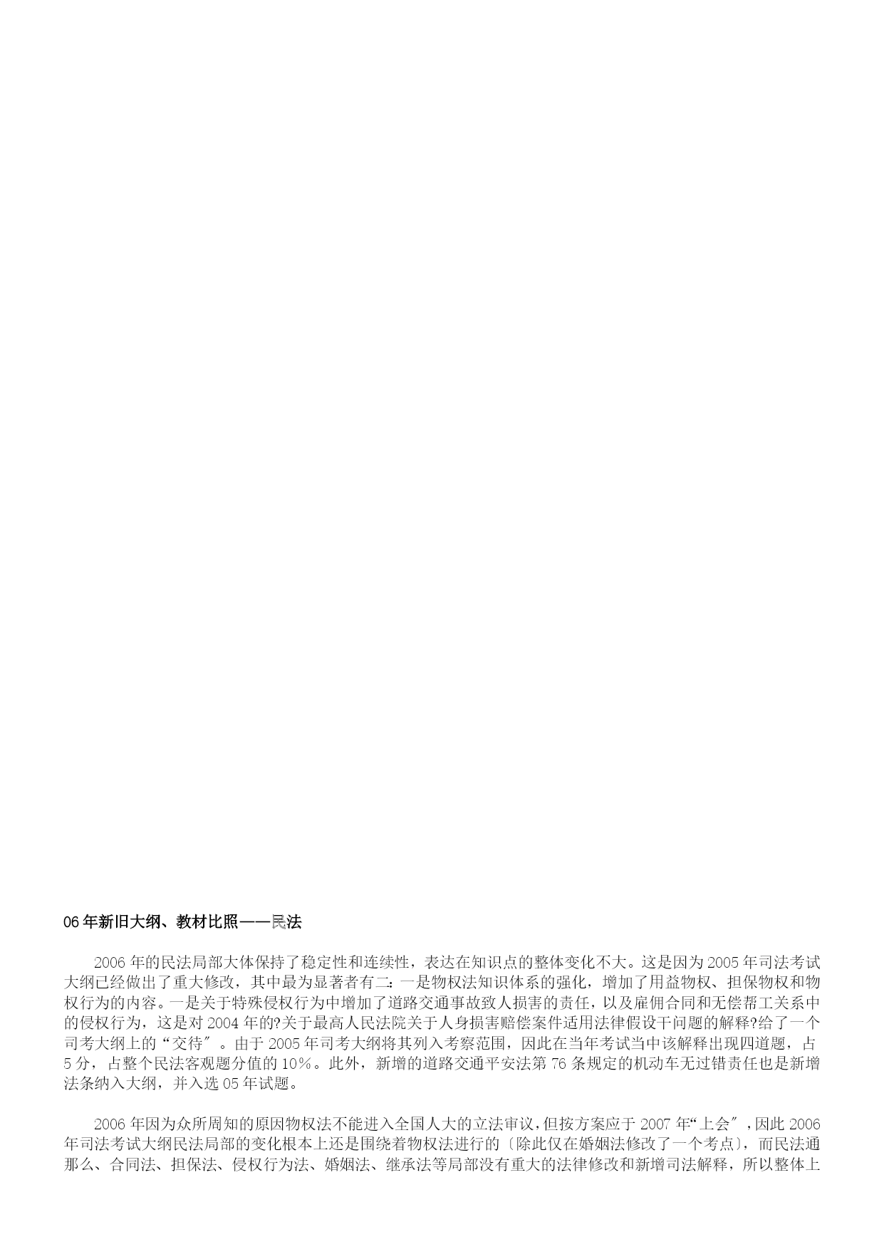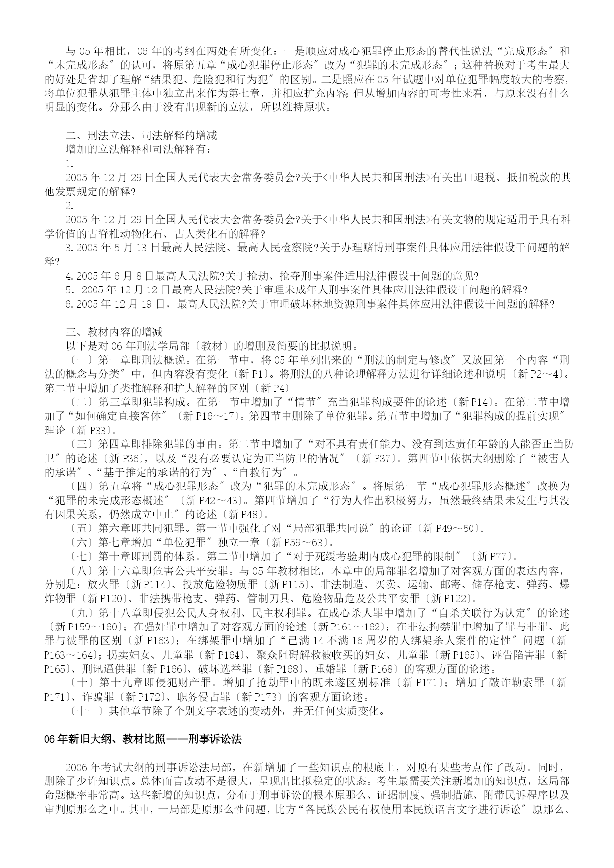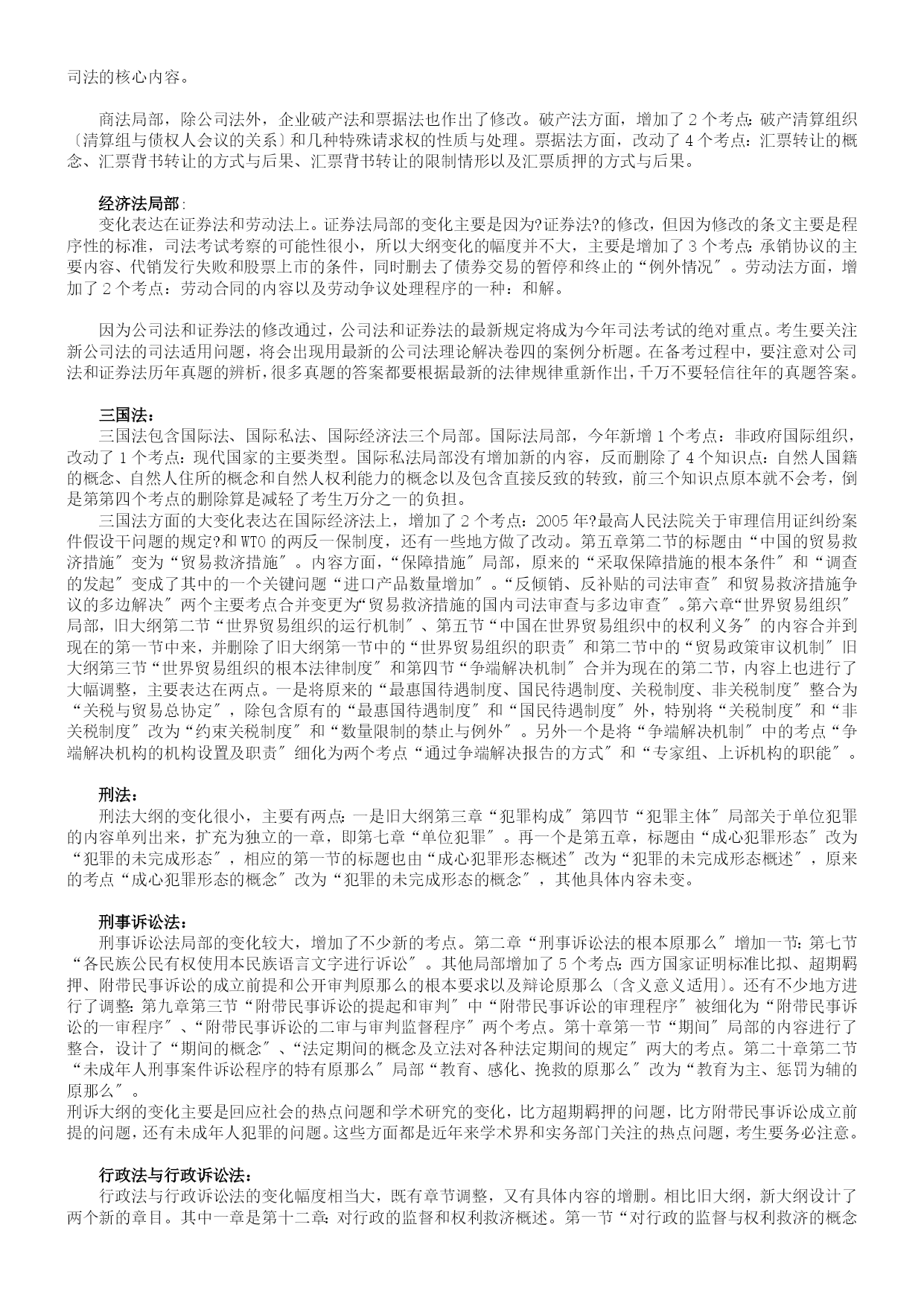 全面解读2006年司法考试大纲doc【完整版】(文档可以直接使用,也可根据实际需要修订后使用,可编辑放心下载)全面解读2006年司法考试大纲众多考生期盼已久的2006年司法考试大纲已经于3月30日公布了。为方便广阔考生用好大纲,特别组织专家对2006年大纲和2005年大纲进行细致的对照比拟,分析出2006年大纲变动的核心考点及其对2006年司法考试命题的影响。综观2006年大纲,可以说变动的幅度非常大,从近年来出台的司法考试大纲来看,也是考试内容变化最大的一年,大纲增加了53个知识点,删除了20个知识点,同时对很多知识点的具体表述进行了修改。如此大幅度修改,主要是因为司法部对2005年8月1日以来的立法、司法变动以及社会热点作出了积极的回应。立法方面,比方?公司法?、?证券法?的大规模修改;司法方面,比方最高院?关于审理未成年人刑事案件具体应用法律假设干问题的解释?;社会热点问题,比方近年来全国人大地位的加强,两会对和谐社会与节约型社会的强调等等。所有这些影响司法考试的外在环境的变化加上学术界研究的完善,就导致了2006年大纲在结构上和具体内容上的一系列变化,最突出的就是新大纲整合相关内容,推出了“司法制度和法律职业道德〞这样一样全新的部门,使得原先“法律职业道德〞局部的内容大为丰富。多年来,司法考试命题人对大纲新增知识点青眼有加,每年的相关考核内容大概有四五十分,几乎占到总分值的十分之一。所以,我们一再强调广阔考生对大纲新增内容和变动内容的复习。为了方便大家掌握最新大纲的新增内容,我们对2006年大纲所涉及各个科目的变动情况做一总括性的说明。理论法学:理论法学包含法理学、法制史、宪法学、司法制度和法律职业道德四个局部。法理学方面,大纲新增了4个知识点,分别是法律责任的竞合、法律解释与法律推理在审判活动中的应用、法与和谐社会、法与节约型社会,同时删除了4个考点,与当代中国的司法体制相关的局部转移到司法制度与法律职业道德中去。法制史方面,变化集中在中国法制史上面,增加了3个考点,分别是唐宋至元明时期的律例关系、死刑复奏和提刑按察使司制度,同时对周秦时代的大司寇和唐宋以后的御史台与督察院进行了改动。宪法方面的变动相对大一些,增加了6个考点:宪法开展的趋势、人民代表大会制度的完善、公检法三机关的关系以及宪法制定方面的制宪主体、制宪机关、制宪权,同时对全国人大及其常委会的工作程序、中央军委的领导体制以及基层政权与基层群众自治性组织的关系进行了改动,此外还删除了第五章第七节“人民法院和人民检察院〞中的大局部内容,相关知识点转移至司法制度与法律职业道德中去。旧大纲中的法律职业道德,因为今年整合了很多新的内容,各方面都有很大调整。该局部的标题由05年的“法律职业道德〞改为06年“司法制度和法律职业道德〞,相应的内容增加了很多。第一章标题由“法律职业道德概述〞改为“司法制度和法律职业道德概述〞,增加了三节:第一节“司法与司法制度的概念〞、第二节“司法的功能和原那么〞、第三节“司法制度的根本范畴〞。增加了第二章“审判制度〞、第三章“检察制度〞、第四章“律师制度〞、第五章“公证制度〞、第九章“公证员职业道德和职业责任〞等五章全新的内容。同时,旧大纲第二章、第三章和第四章都根据新的框架进行了调整,尤其是旧大纲第四章“律师职业道德〞改为新大纲的第八章“律师职业道德和职业责任〞,旧大纲第二节到第十一节林林总总的内容整合为新大纲的第二节“律师职业道德的内容〞和第三节“律师执业行为标准〞,形式上变动极大,具体内容那么无大的变动。真个司法制度和法律职业道德这一体系包括审判制度、检察制度、律师制度、公证制度及这些领域职业者的职业道德。由于法律职业道德在司法考试中所占的比例很小〔10-12分〕,预计今年的考试重点在对新增知识点的考查和传统重点知识点的考查。理论法学方面的变动主要是我国政治、司法层面的变化推动,比方人大地位的逐步提升,比方司法改革方向的日趋明朗,就连中国法制史的内容也是主要围绕着现实的司法改革进行调整。该局部内容的最大变化就是司法制度和法律职业道德这一新部门的出现,今年会考察很多新的知识点,考生务必重视。复习过程中,要联系社会热点如法理学的法与和谐社会,法与节约型社会等知识点,去思考社会问题,为论述题准备素材。商经法:商经局部包含公司法、证券法等众多法律部门,因为多个法律的修改而成为今年大纲中变化最大的局部。最最突出的当然是公司法。公司法的修改不仅使大纲同一名目下的内容变得极为不同,就连大纲本身也根据情况进行了大幅度的调整。第一节“公司法概述〞的内容大大扩充,增加了我国公司法上的公司概念、公司法的概念和属性以及公司的权利能力和行为能力等10多个考点。旧大纲第二节“公司的一般制度〞扩展为新大纲的第二节