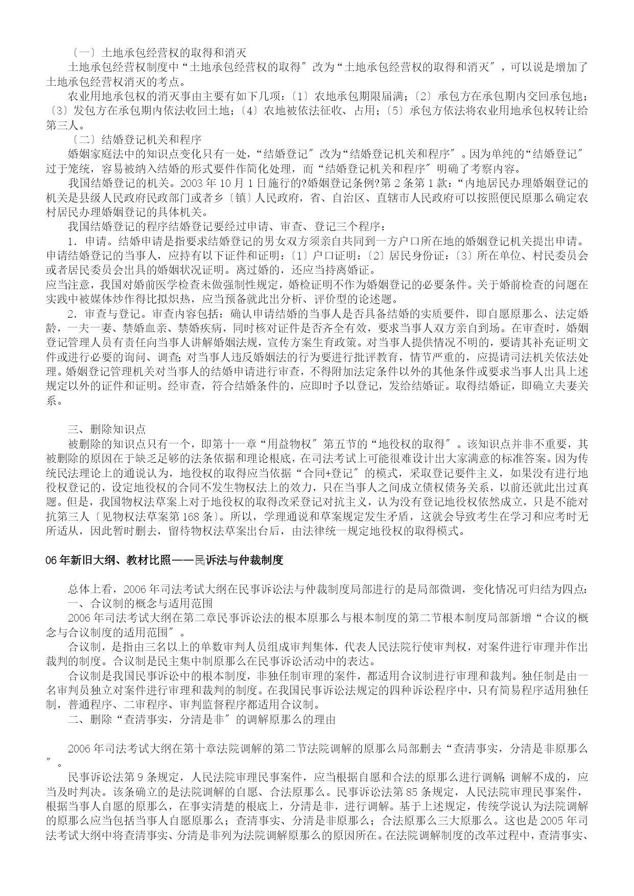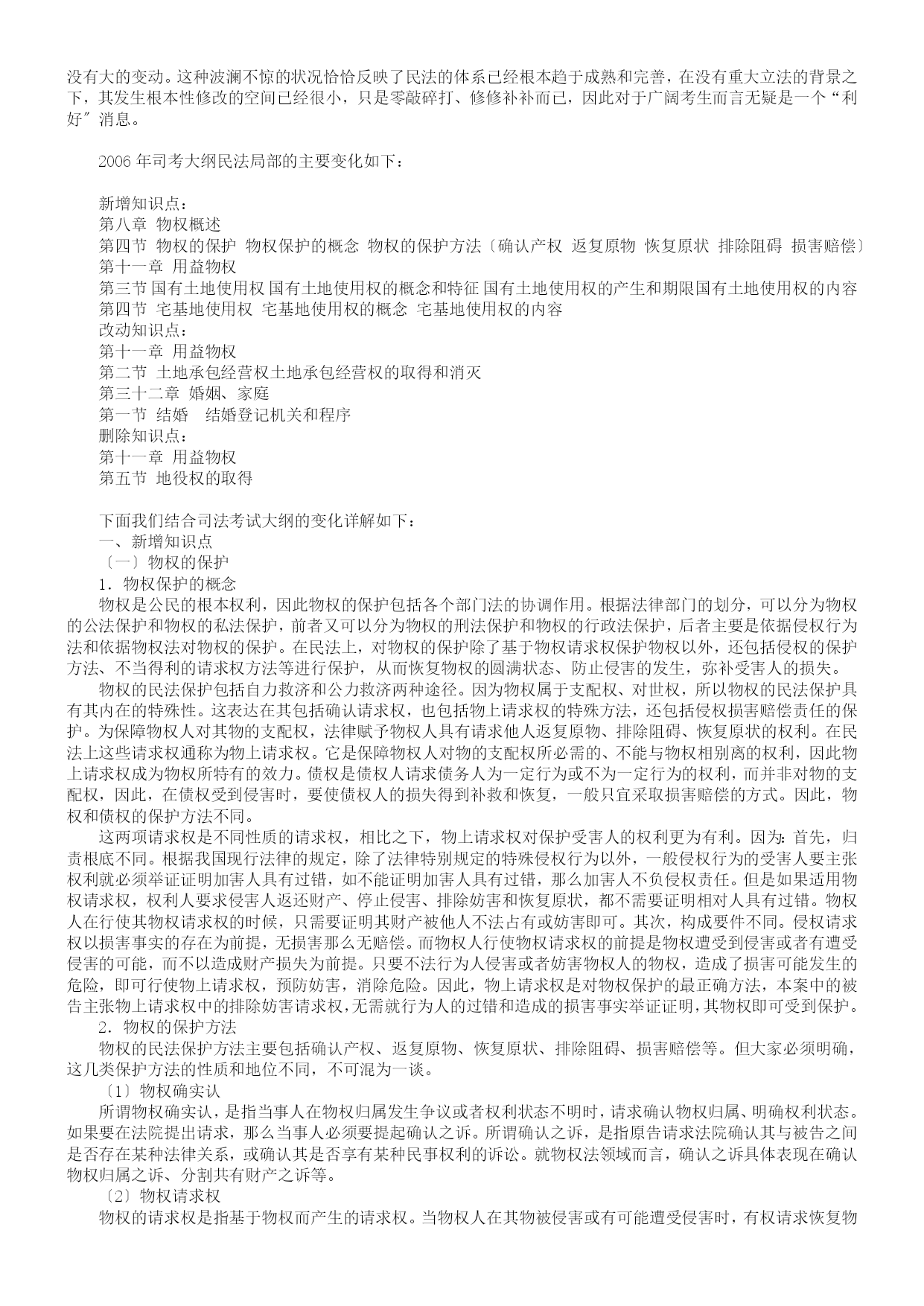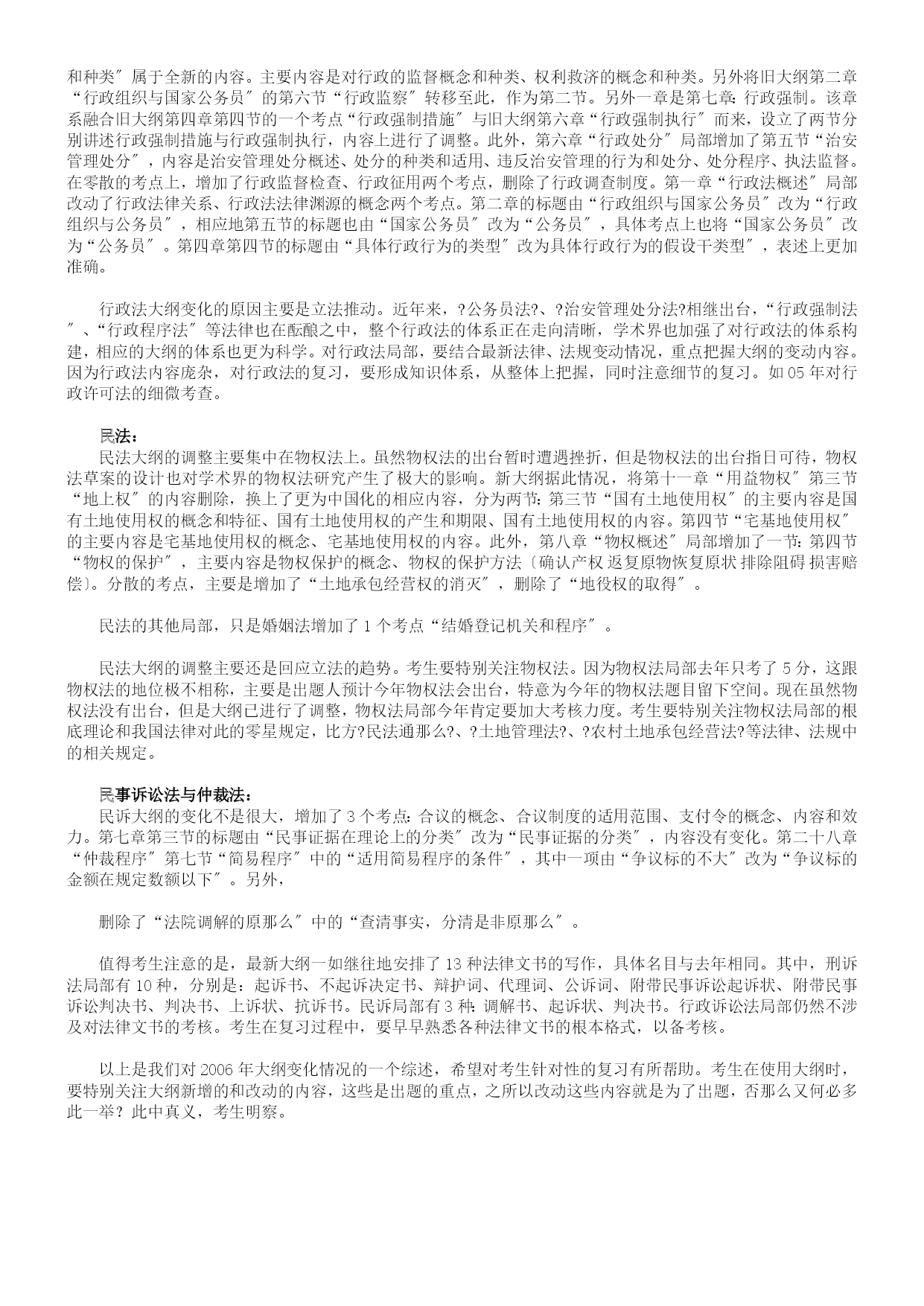 全面解读2006年司法考试大纲doc【完整版】(文档可以直接使用,也可根据实际需要修订后使用,可编辑放心下载)全面解读2006年司法考试大纲众多考生期盼已久的2006年司法考试大纲已经于3月30日公布了。为方便广阔考生用好大纲,特别组织专家对2006年大纲和2005年大纲进行细致的对照比拟,分析出2006年大纲变动的核心考点及其对2006年司法考试命题的影响。综观2006年大纲,可以说变动的幅度非常大,从近年来出台的司法考试大纲来看,也是考试内容变化最大的一年,大纲增加了53个知识点,删除了20个知识点,同时对很多知识点的具体表述进行了修改。如此大幅度修改,主要是因为司法部对2005年8月1日以来的立法、司法变动以及社会热点作出了积极的回应。立法方面,比方?公司法?、?证券法?的大规模修改;司法方面,比方最高院?关于审理未成年人刑事案件具体应用法律假设干问题的解释?;社会热点问题,比方近年来全国人大地位的加强,两会对和谐社会与节约型社会的强调等等。所有这些影响司法考试的外在环境的变化加上学术界研究的完善,就导致了2006年大纲在结构上和具体内容上的一系列变化,最突出的就是新大纲整合相关内容,推出了“司法制度和法律职业道德〞这样一样全新的部门,使得原先“法律职业道德〞局部的内容大为丰富。多年来,司法考试命题人对大纲新增知识点青眼有加,每年的相关考核内容大概有四五十分,几乎占到总分值的十分之一。所以,我们一再强调广阔考生对大纲新增内容和变动内容的复习。为了方便大家掌握最新大纲的新增内容,我们对2006年大纲所涉及各个科目的变动情况做一总括性的说明。理论法学:理论法学包含法理学、法制史、宪法学、司法制度和法律职业道德四个局部。法理学方面,大纲新增了4个知识点,分别是法律责任的竞合、法律解释与法律推理在审判活动中的应用、法与和谐社会、法与节约型社会,同时删除了4个考点,与当代中国的司法体制相关的局部转移到司法制度与法律职业道德中去。法制史方面,变化集中在中国法制史上面,增加了3个考点,分别是唐宋至元明时期的律例关系、死刑复奏和提刑按察使司制度,同时对周秦时代的大司寇和唐宋以后的御史台与督察院进行了改动。宪法方面的变动相对大一些,增加了6个考点:宪法开展的趋势、人民代表大会制度的完善、公检法三机关的关系以及宪法制定方面的制宪主体、制宪机关、制宪权,同时对全国人大及其常委会的工作程序、中央军委的领导体制以及基层政权与基层群众自治性组织的关系进行了改动,此外还删除了第五章第七节“人民法院和人民检察院〞中的大局部内容,相关知识点转移至司法制度与法律职业道德中去。旧大纲中的法律职业道德,因为今年整合了很多新的内容,各方面都有很大调整。该局部的标题由05年的“法律职业道德〞改为06年“司法制度和法律职业道德〞,相应的内容增加了很多。第一章标题由“法律职业道德概述〞改为“司法制度和法律职业道德概述〞,增加了三节:第一节“司法与司法制度的概念〞、第二节“司法的功能和原那么〞、第三节“司法制度的根本范畴〞。增加了第二章“审判制度〞、第三章“检察制度〞、第四章“律师制度〞、第五章“公证制度〞、第九章“公证员职业道德和职业责任〞等五章全新的内容。同时,旧大纲第二章、第三章和第四章都根据新的框架进行了调整,尤其是旧大纲第四章“律师职业道德〞改为新大纲的第八章“律师职业道德和职业责任〞,旧大纲第二节到第十一节林林总总的内容整合为新大纲的第二节“律师职业道德的内容〞和第三节“律师执业行为标准〞,形式上变动极大,具体内容那么无大的变动。真个司法制度和法律职业道德这一体系包括审判制度、检察制度、律师制度、公证制度及这些领域职业者的职业道德。由于法律职业道德在司法考试中所占的比例很小〔10-12分〕,预计今年的考试重点在对新增知识点的考查和传统重点知识点的考查。理论法学方面的变动主要是我国政治、司法层面的变化推动,比方人大地位的逐步提升,比方司法改革方向的日趋明朗,就连中国法制史的内容也是主要围绕着现实的司法改革进行调整。该局部内容的最大变化就是司法制度和法律职业道德这一新部门的出现,今年会考察很多新的知识点,考生务必重视。复习过程中,要联系社会热点如法理学的法与和谐社会,法与节约型社会等知识点,去思考社会问题,为论述题准备素材。商经法:商经局部包含公司法、证券法等众多法律部门,因为多个法律的修改而成为今年大纲中变化最大的局部。最最突出的当然是公司法。公司法的修改不仅使大纲同一名目下的内容变得极为不同,就连大纲本身也根据情况进行了大幅度的调整。第一节“公司法概述〞的内容大大扩充,增加了我国公司法上的公司概念、公司法的概念和属性以及公司的权利能力和行为能力等10多个考点。旧大纲第二节“公司的一般制度〞扩展为新大纲的第二节