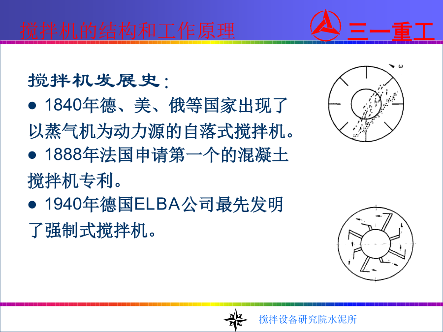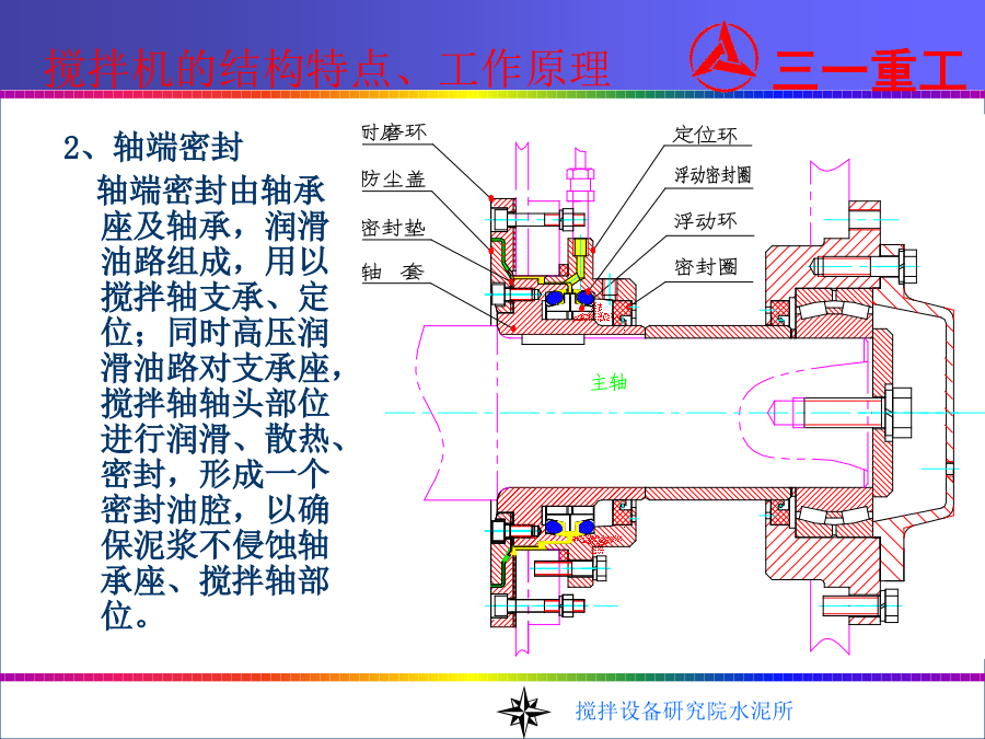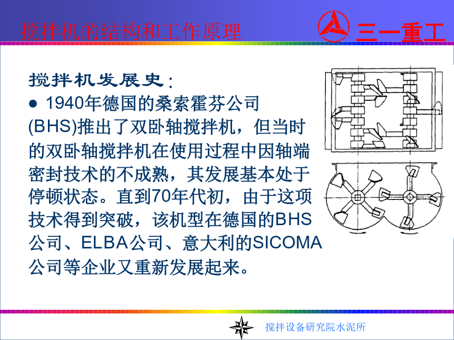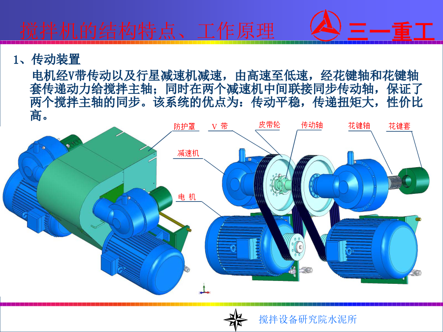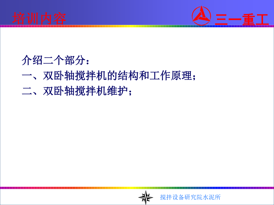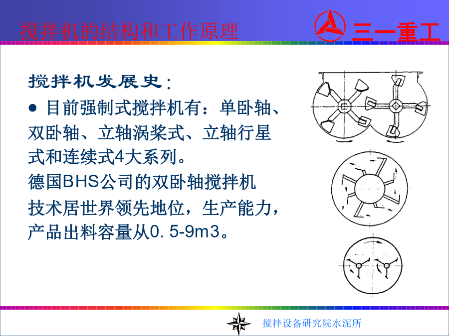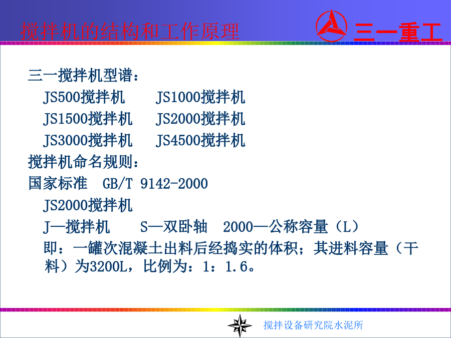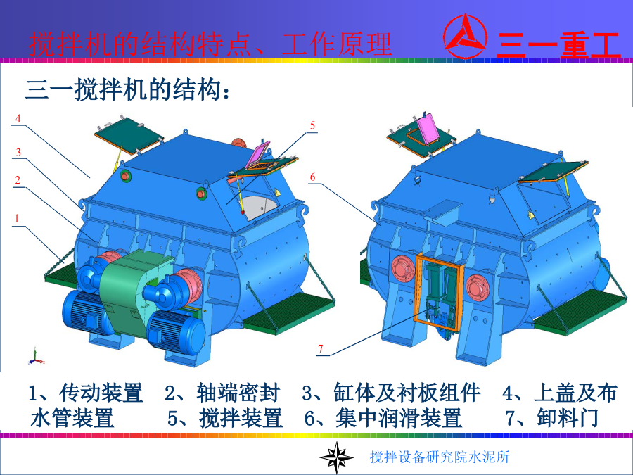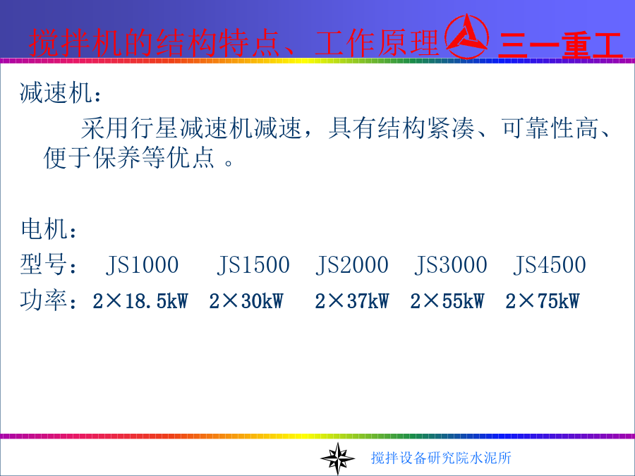 双卧轴搅拌机培训教程培训内容搅拌机的结构和工作原理搅拌机的结构和工作原理搅拌机的结构和工作原理搅拌机的结构和工作原理搅拌机的结构特点、工作原理搅拌机的结构特点、工作原理减速机:采用行星减速机减速,具有结构紧凑、可靠性高、便于保养等优点。电机:型号:JS1000JS1500JS2000JS3000JS4500功率:2×18.5kW2×30kW2×37kW2×55kW2×75kW搅拌机的结构特点、工作原理搅拌机的结构特点、工作原理润滑系统:采用集中润滑系统。有4个泵分别向4个轴端密封加油。搅拌机的结构特点、工作原理衬板叶片:采用高铬耐磨铸铁。寿命长达7万罐次。搅拌机的结构特点、工作原理搅拌机的结构特点、工作原理搅拌机的结构特点、工作原理工作原理:双卧轴强制式混凝土搅拌机是分批型混凝土搅拌机。按一定的时间间隔投入骨料、水泥、水等材料。两根装有搅拌臂及搅拌叶片的搅拌轴同时旋转,实现了正确而强制的搅拌。搅拌缸体中的材料被强制性地按水平、垂直方向流动,并被充分地搅拌。搅拌轴同时旋转,使搅拌材料时而被托起,时而又被送入内部,以这种方式循环运动,这种运动方式使搅拌得最为均匀的混凝土能以最短的时间生产出来。1、减速机:正确选择润滑油,美孚629、工业齿轮油L-CKD150;加油至油标中部。加油时不要混入异物;搅拌机上有油位计,通过油管与减速机连通,应经常检查油位液面,不足时请及时补充;各种润滑油不得混用。2、电机:两皮带轮对齐,在一平面上。电机支座用顶丝顶紧,不能晃动。两电机的转向。(站在正面看朝外转)3、V带:同步上紧电机底座的调节螺栓,使V带拉紧;当给V带悬空处中部施加10Kgf压力时,皮带沿该力方向变形距离不超过20mm,可用中指压紧经验确定。出厂实试运转后,及时检查V带张紧度,如果松弛,及时上紧。3、传动轴:安装前用工业2号锂基润滑脂对传动轴润滑(3处)加油。装上同步传动轴,检查两个搅拌主轴的搅拌臂和搅拌叶片的相位角与是否正确;手动盘动皮带使搅拌主轴运转360°,检查两搅拌轴是否干涉。注意:上紧上述各部分螺栓时,应使用扭力扳手,拧紧力矩见搅拌装置部分。。搅拌机装配注意事项搅拌机装配注意事项搅拌机装配注意事项特别注意事项