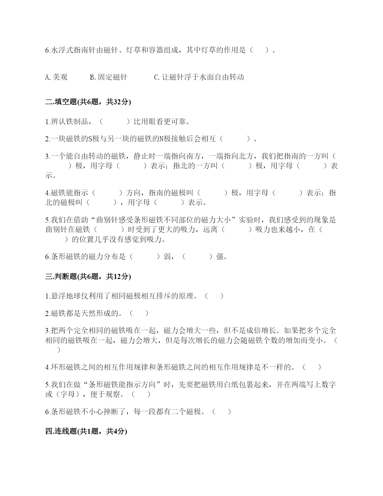小学科学《磁铁》练习题一.选择题(共6题,共12分)1.下列物体能被磁铁吸引的是()。A.铁钉B.铅笔2.使用指南针观察方向时,应()放置指南针。A.竖直B.倾斜C.水平3.下列物体中,()没有用到磁铁。A.B.C.4.使用指南针辨别方向时,附近有()对指南针没有影响。A.橡皮B.铁柜C.磁铁5.将磁铁放在装有铁粉的盒子上,并轻轻晃动盒子,如下图所示,图中的现象不能说明磁铁()。A.有两个磁极B.磁极磁性最强C.磁铁只能吸引铁6.水浮式指南针由磁针、灯草和容器组成,其中灯草的作用是()。A.美观B.固定磁针C.让磁针浮于水面自由转动二.填空题(共6题,共32分)1.辨认铁制品,()比用眼看更可靠。2.一块磁铁的S极与另一块的磁铁的N极接触后会相互()。3.一个能自由转动的磁铁,静止时一端指向南方,一端指向北方,我们把指南的一方叫()极,用字母()表示;指北的一方叫()极,用字母()表示。4.磁铁能指示()方向,指南的磁极叫()极,用字母()表示;指北的磁极叫(),用字母()表示。5.我们在借助“曲别针感受条形磁铁不同部位的磁力大小”实验时,我们感受到的现象是曲别针在磁铁()时受到了更大的吸力,远离()吸力也来越小,在()的位置几乎没有感觉到吸力。6.条形磁铁的磁力分布是()弱,()强。三.判断题(共6题,共12分)1.悬浮地球仪利用了相同磁极相互排斥的原理。()2.磁铁都是天然形成的。()3.把两个完全相同的磁铁吸在一起,磁力会增大一些,但不是成倍增长。如果把多个完全相同的磁铁吸在一起,磁力会增大,但是每次增长的磁力会随磁铁个数的增加而变小。()4.环形磁铁之间的相互作用规律和条形磁铁之间的相互作用规律是不一样的。()5.我们在做“条形磁铁能指示方向”时,先要把磁铁用白纸包裹起来,并在两端写上数字或(字母),便于观察。()6.条形磁铁不小心摔断了,每一段都有二个磁极。()四.连线题(共1题,共4分)1.请将生活中的物品与对应的磁铁的作用连线。记录信息指示方向固定物体磁悬浮五.简答题(共5题,共25分)1.如何尽快地拾起木屑中的回形针(如下图)?2.如何辨别门把手中是否含有铁(如下图)?()3.简单说一说制作一个水浮式指南针的基本步骤有哪些?4.除了用磁铁,你还能用什么方法不接触小车就让它运动起来?5.如何使用指南针辨认方向?六.综合题(共5题,共36分)1.有一块没有标明磁极的磁铁,两位同学用红蓝磁铁进行实验。请你根据图中两位同学说的话来判断磁极。(填序号)2.阅读并完成填空。磁铁为什么能指示南北方向我们知道,水平悬挂的条形磁铁静止后总是能够指示南北方向。指南针就是利用磁铁的这个特点制成的。那么,磁铁为什么能够指示方向呢?原来,地球本身就是一个巨大的磁体,也有两个磁极,分别称为地磁南极、地磁北极。地磁南极在地球的北极附近,而地磁北极在地球的南极附近。由于磁铁具有同极相斥、异极相吸的特点,所以指南针的南极会指向地磁北极,也就是指向地球的南端。(1)地磁的南极在地球的()极附近,而地磁北极在地球的()极附近。(2)磁铁具有同极相互()、异极互相()的特点。(3)地球有两个磁极分别是()、()。3.用磁铁学具盒中的环形磁铁设计一个悬浮塔,有两种摆放方式。请在下面右图中用字母标出这两种摆法的磁极。4.用符号标明磁铁之间的相互作用。下面是4组没有标明磁极的条形磁铁,已知A端和C端相互排斥。请用符号“→←”表示相互吸引的情况,用符号“←→”表示相互排斥的情况。5.子枫想用钢针制作一个指南针,他的操作过程如下图所示,请仔细观察,并解决问题。1.如图所示的步骤叫做()。A.消磁B.磁化C.加磁2.制作磁针时,要用磁铁的磁极位置在钢针上()。A.来回反复摩擦B.沿一个方向反复摩擦C.先沿一个方向摩擦几次,再沿反方向摩擦几次3.制作磁针时,用磁铁的()在钢针上反复摩擦。A.一个磁极B.两个磁极C.中间部位4.如图是子枫在()。A.固定钢针B.测试钢针的磁性如图是子枫在用真正的指南针()。A.确定方向B.测量方向参考答案一.选择题1.A2.C3.C4.A5.C6.C二.填空题1.使用磁铁检测2.吸引3.南;S;北;N4.南北;南;S;北;N5.两端;两端;中间6.中间;两端三.判断题1.√2.×3.×4.×5.√6.√四.连线题1.如下:五.简答题1.利用磁铁的磁性很快地能拾起木屑里的回形针。2.利用磁铁的磁性来检查门把手是否含有铁,如果吸引说明含有铁,如果不吸引说明不含有铁。3.制作步骤为:(1)准备材料;(2)制作磁针;(3)安装磁针;(4)