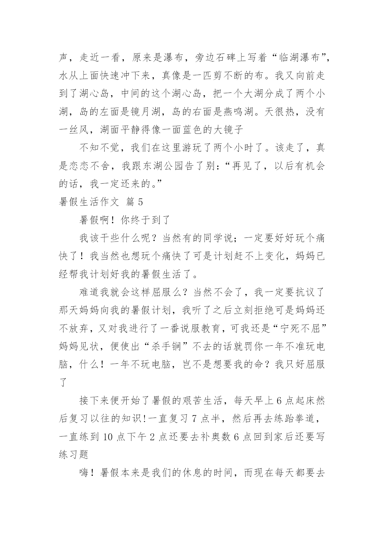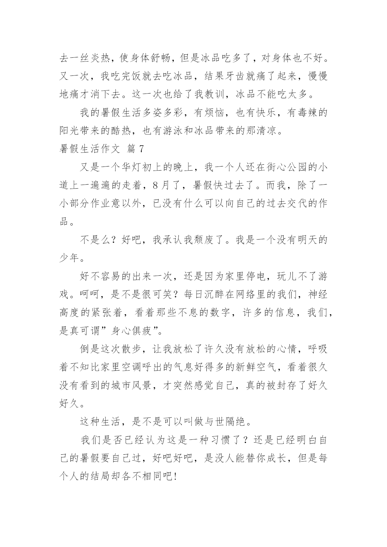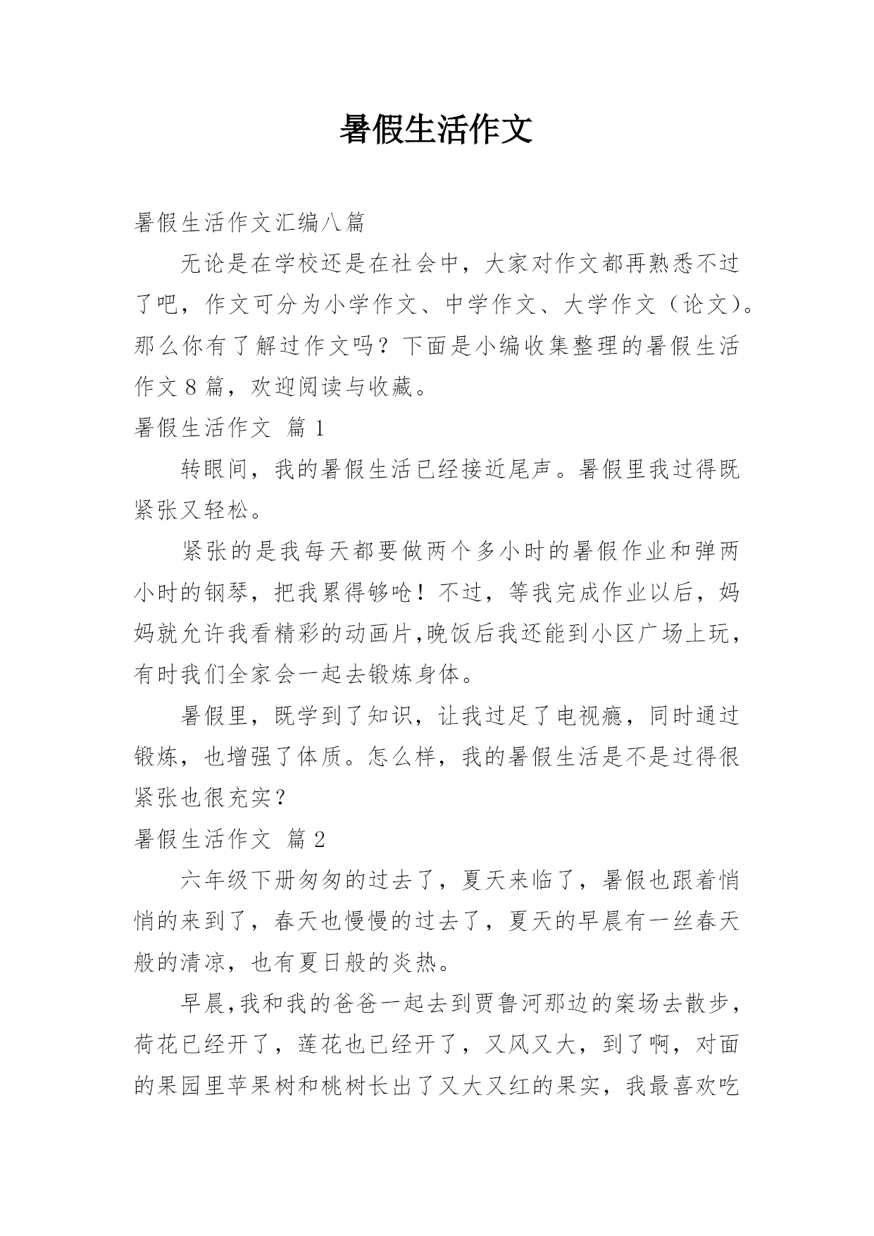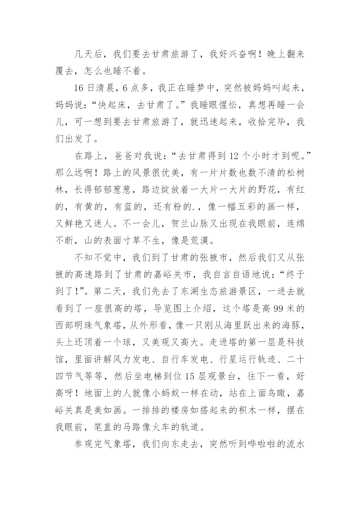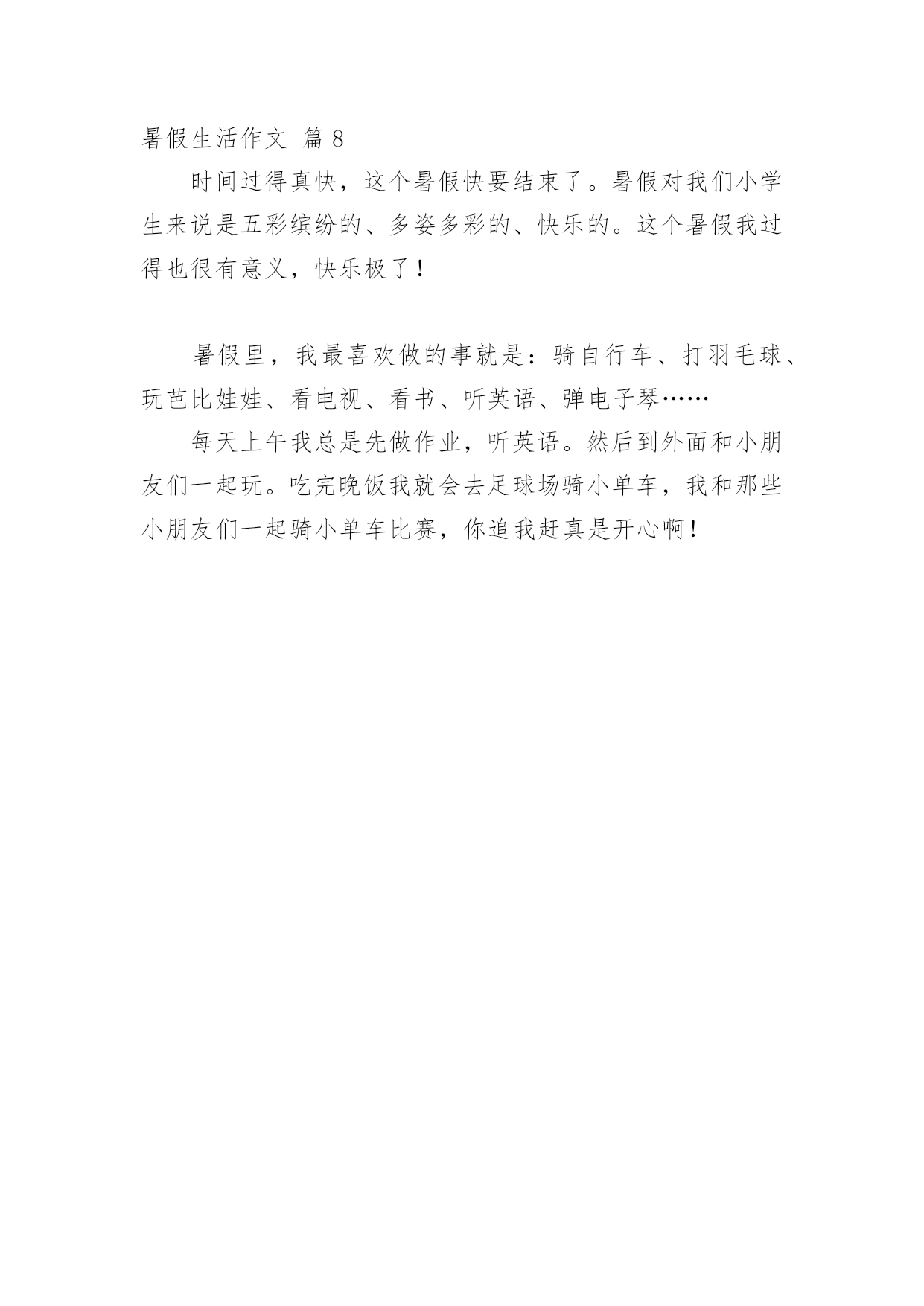 暑假生活作文暑假生活作文汇编八篇无论是在学校还是在社会中,大家对作文都再熟悉不过了吧,作文可分为小学作文、中学作文、大学作文(论文)。那么你有了解过作文吗?下面是小编收集整理的暑假生活作文8篇,欢迎阅读与收藏。暑假生活作文篇1转眼间,我的暑假生活已经接近尾声。暑假里我过得既紧张又轻松。紧张的是我每天都要做两个多小时的暑假作业和弹两小时的钢琴,把我累得够呛!不过,等我完成作业以后,妈妈就允许我看精彩的动画片,晚饭后我还能到小区广场上玩,有时我们全家会一起去锻炼身体。暑假里,既学到了知识,让我过足了电视瘾,同时通过锻炼,也增强了体质。怎么样,我的暑假生活是不是过得很紧张也很充实?暑假生活作文篇2六年级下册匆匆的过去了,夏天来临了,暑假也跟着悄悄的来到了,春天也慢慢的过去了,夏天的早晨有一丝春天般的清凉,也有夏日般的炎热。早晨,我和我的爸爸一起去到贾鲁河那边的案场去散步,荷花已经开了,莲花也已经开了,又风又大,到了啊,对面的果园里苹果树和桃树长出了又大又红的果实,我最喜欢吃的李子,李子树上也结出了又大又紫红紫红的李子,好看极了,柿子树上也长出了绿油油的小柿子,好像一个小婴儿,抓住妈妈的手臂,永不松开。夏天真是夏日炎炎的,中午的时候吃过午饭之后来到树荫底下,我们三口背着小板凳,拿着鸽子的水,妈妈拿的是茶,我拿的是果汁,爸爸拿的是龙井茶,我们三口在树荫下,一会儿就睡着了,到了晚上我们要么去跟着老奶奶或者是阿姨们一起去跳广场舞,要么就跟着各自的父母一起去散步,要么和我们一起在草丛里面捉蝈蝈蛐蛐,夏日的生活是多么的美暑假生活作文篇3快到中午的时候,妈妈准备做饭了,我突然就有一个想法。对妈妈说:“我今天能不能炒一个菜,行不行?”妈妈说:“行啊,你要炒什么?”我毫不犹豫地回答说:“吃我最喜欢的卷心菜。”因为第一次做菜,所以我让妈妈站在旁边指导我。我从冰箱里拿出卷心菜,把它一层层地剥开,然后把它洗好,撕成一小片一小片的。准备工作好以后,就是最重要的环节——炒卷心菜。小心地点开燃气炉。倒进一些油在锅里,等油升温了,妈妈怕我被油溅着,就帮我把菜放进锅中,然后我就拿起铲子把菜翻来覆去的炒、放了一点盐和一点鸡精。虽然最后味道有点重。不过我很开心能炒菜、体会了这个过程。暑假生活作文篇4几天后,我们要去甘肃旅游了,我好兴奋啊!晚上翻来覆去,怎么也睡不着。16日清晨,6点多,我正在睡梦中,突然被妈妈叫起来,妈妈说:“快起床,去甘肃了。”我睡眼惺忪,真想再睡一会儿,可一想到要去甘肃旅游了,就迅速起来,收拾完毕,我们出发了。在路上,爸爸对我说:“去甘肃得到12个小时才到呢。”那么远啊!路上的风景很优美,有一片片数也数不清的松树林,长得郁郁葱葱,路边绽放着一大片一大片的野花,有红的,有黄的,有蓝的,还有粉的.,像一幅五彩的画一样,又鲜艳又迷人。不一会儿,贺兰山脉又出现在我眼前,连绵不断,山的表面寸草不生,像是荒漠。不知不觉中,我们到了甘肃的张掖市,然后我们又从张掖的高速路到了甘肃的嘉峪关市,我自言自语地说:“终于到了!”。第二天,我们先去了东湖生态旅游景区,一进去就看到了一座很高的塔,导览图上介绍,这个塔是高99米的西部明珠气象塔,从外形看,像一只刚从海里跃出来的海豚,头上还顶着一个球,又美观又高大。走进塔的第一层是科技馆,里面讲解风力发电、自行车发电、行星运行轨迹、二十四节气等等,然后坐电梯到位15层观景台,往下一看,好高呀!地面上的人就像小蚂蚁一样在动,站在上面鸟瞰,嘉峪关真是美如画。一排排的楼房如搭起来的积木一样,摆在我眼前,笔直的马路像火车的轨道。参观完气象塔,我们向东走去,突然听到哗啦啦的流水声,走近一看,原来是瀑布,旁边石碑上写着“临湖瀑布”,水从上面快速冲下来,真像是一匹剪不断的布。我又向前走到了湖心岛,中间的这个湖心岛,把一个大湖分成了两个小湖,岛的左面是镜月湖,岛的右面是燕鸣湖。天很热,没有一丝风,湖面平静得像一面蓝色的大镜子不知不觉,我们在这里游玩了两个小时了。该走了,真是恋恋不舍,我跟东湖公园告了别:“再见了,以后有机会的话,我一定还来的。”暑假生活作文篇5暑假啊!你终于到了我该干些什么呢?当然有的同学说;一定要好好玩个痛快了!我当然也想玩个痛快了可是计划赶不上变化,妈妈已经帮我计划好我的暑假生活了。难道我就会这样屈服么?当然不会了,我一定要抗议了那天妈妈向我的暑假计划,我听了之后立刻拒绝可是妈妈还不放弃,又对我进行了一番说服教育,可我还是“宁死不屈”妈妈见状,便使出“杀手锏”不去的话就罚你一年不准玩电脑,什么!一年不玩电脑,岂不是想要我的命?我只好屈服了接下来便开始了暑假的艰苦生活,每天早上6点起床然后复习以往的知识!一直复习7点半,然后再去练跆拳道,一直练到10点下午2点还要去补奥数6点回到家后还要写练习题嗨!暑假本来是我们的休息的时间