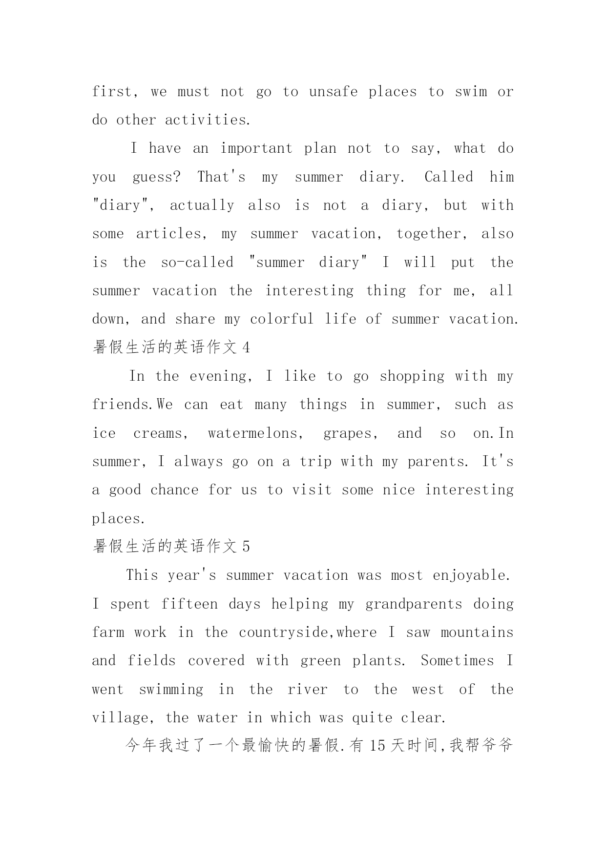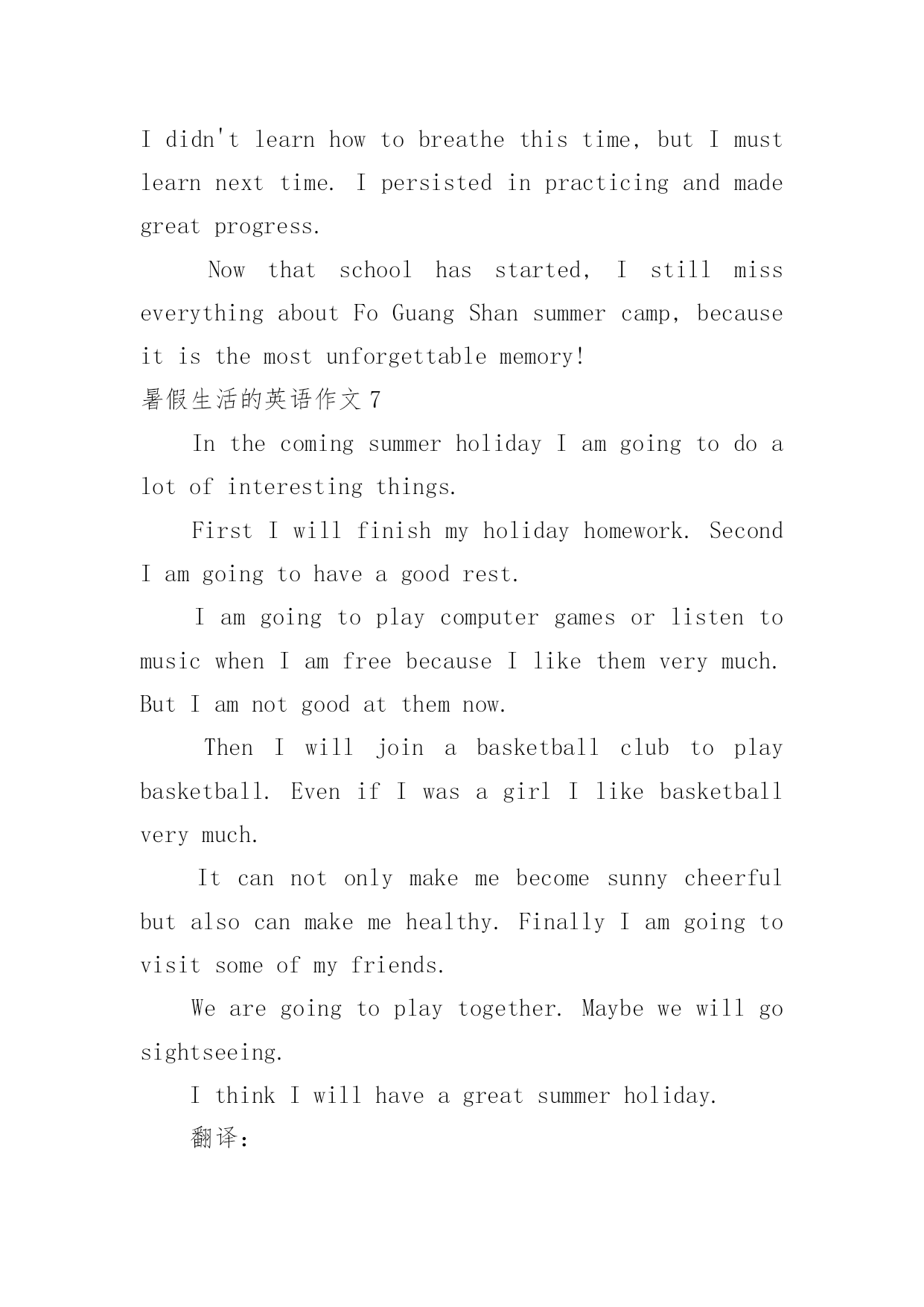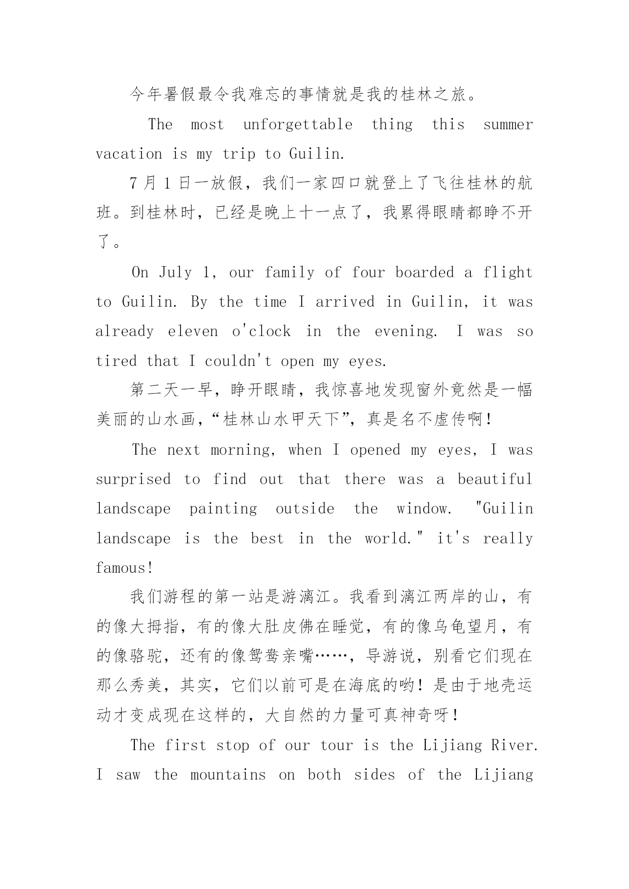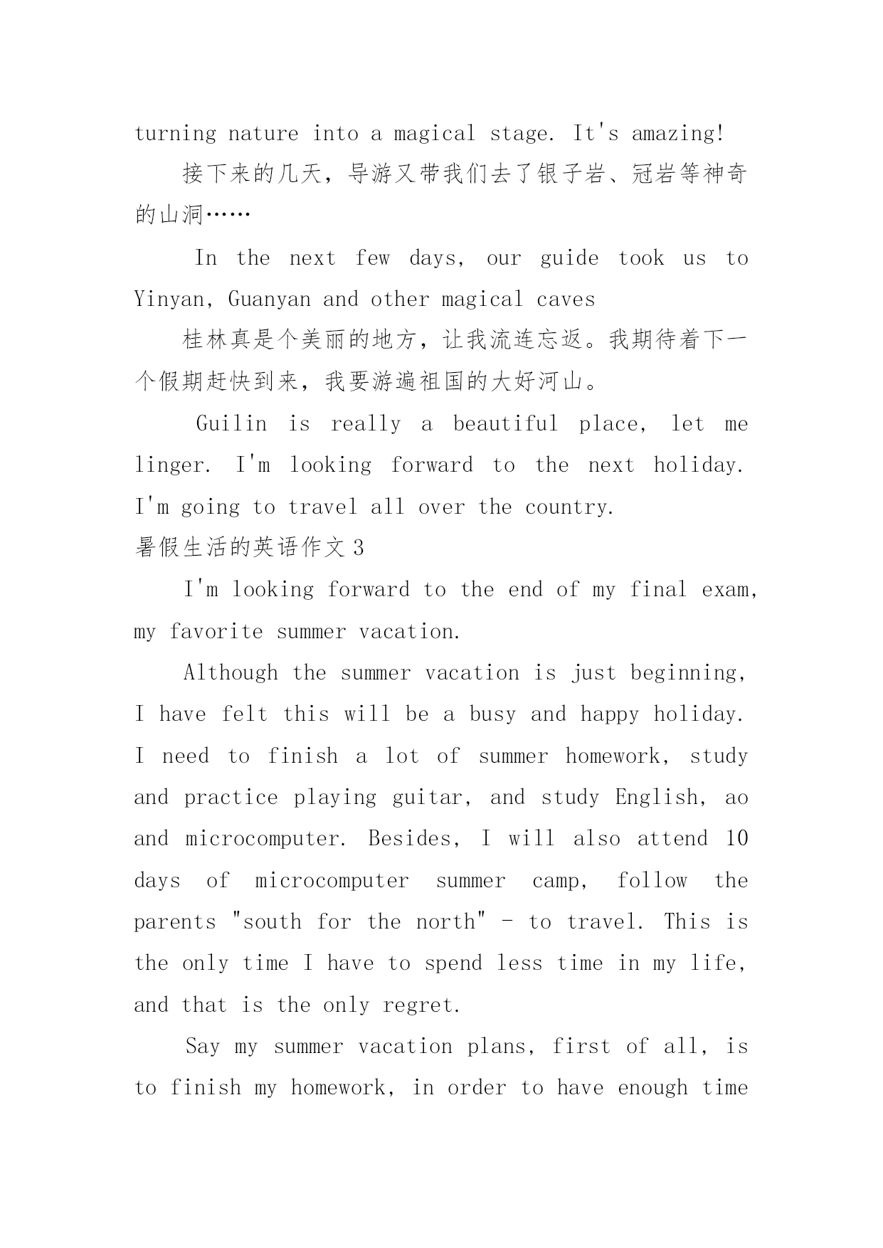 暑假生活的英语作文暑假生活的英语作文在我们平凡的日常里,大家都跟作文打过交道吧,根据写作命题的特点,作文可以分为命题作文和非命题作文。如何写一篇有思想、有文采的作文呢?以下是小编为大家整理的暑假生活的英语作文,供大家参考借鉴,希望可以帮助到有需要的朋友。暑假生活的英语作文1LastsummerIhavevisitedHainanisland.DuringtheholidayIhaveagoodtime.InHainanthebestinterestingthingsisscubaping.Intheseabedthecoralreefswereverybeautiful!Ilikeitverymuch,andIhavetakenmanyphotosbymycamera.AndalsothescenaryofHainanisbeautiful,forexample"theedgeoftheskyandtherimofthesea."isveryfamousanditmeans"TianyaHaijiao."Andthere'sevenadeerpark,intheparkwecanseemangkindsofdeer.Thedeerareverylovely,Ilikeitverymuch.Inconclusion,Ihaveinterestedinmylastvacation.暑假生活的英语作文2今年暑假最令我难忘的事情就是我的桂林之旅。ThemostunforgettablethingthissummervacationismytriptoGuilin.7月1日一放假,我们一家四口就登上了飞往桂林的航班。到桂林时,已经是晚上十一点了,我累得眼睛都睁不开了。OnJuly1,ourfamilyoffourboardedaflighttoGuilin.BythetimeIarrivedinGuilin,itwasalreadyeleveno'clockintheevening.IwassotiredthatIcouldn'topenmyeyes.第二天一早,睁开眼睛,我惊喜地发现窗外竟然是一幅美丽的山水画,“桂林山水甲天下”,真是名不虚传啊!Thenextmorning,whenIopenedmyeyes,Iwassurprisedtofindoutthattherewasabeautifullandscapepaintingoutsidethewindow."Guilinlandscapeisthebestintheworld."it'sreallyfamous!我们游程的第一站是游漓江。我看到漓江两岸的山,有的像大拇指,有的像大肚皮佛在睡觉,有的像乌龟望月,有的像骆驼,还有的像鸳鸯亲嘴……,导游说,别看它们现在那么秀美,其实,它们以前可是在海底的哟!是由于地壳运动才变成现在这样的,大自然的力量可真神奇呀!ThefirststopofourtouristheLijiangRiver.IsawthemountainsonbothsidesoftheLijiangRiver,someofthemwerelikethumbs,someofthemweresleepinglikeabigbellyBuddha,someofthemwereliketortoiseslookingatthemoon,someofthemwerelikecamels,andsomeofthemwerelikemandarinduckskissing,theguidesaid,althoughtheyaresobeautifulnow,infact,theyusedtobeatthebottomofthesea!It'sbecauseofthemovementoftheearth'scrustthatithasbecomelikethis.Thepowerofnatureisamazing!桂林之旅的第二天晚上是最最精彩的一个夜晚。我们跟随导游去看了大名鼎鼎的大型山水实景演出“印象刘三姐”。令我惊奇的是这场演出不是在大剧院里举行的,舞台竟设在实实在在的山水之间。我们来到了表演的现场,看到看台就像一片绿油油的梯田。坐在看台上,前方是一片漆黑,我心想:这么黑,怎么表演?舞台到底在哪里?正在我疑惑不解的时候,耳边传来美妙的歌声,寻着歌声的方向,竟然发现一片漆黑的河面上,不知何时飘来了一片扁舟。突然,对面的山水都亮了起来,夜空仿佛成了黑黑的幕布,把山水映衬得犹如一幅水墨画。随着灯光的变换,河面一会儿变成绿色,一会儿变成红色,看得我们眼花缭乱。最后,许多位苗族姑娘衣服上串着电珠,载歌载舞,身上的.电珠灭了,姑娘就神秘地消失了,电珠一亮,美丽的姑娘就一下子又出现在你的