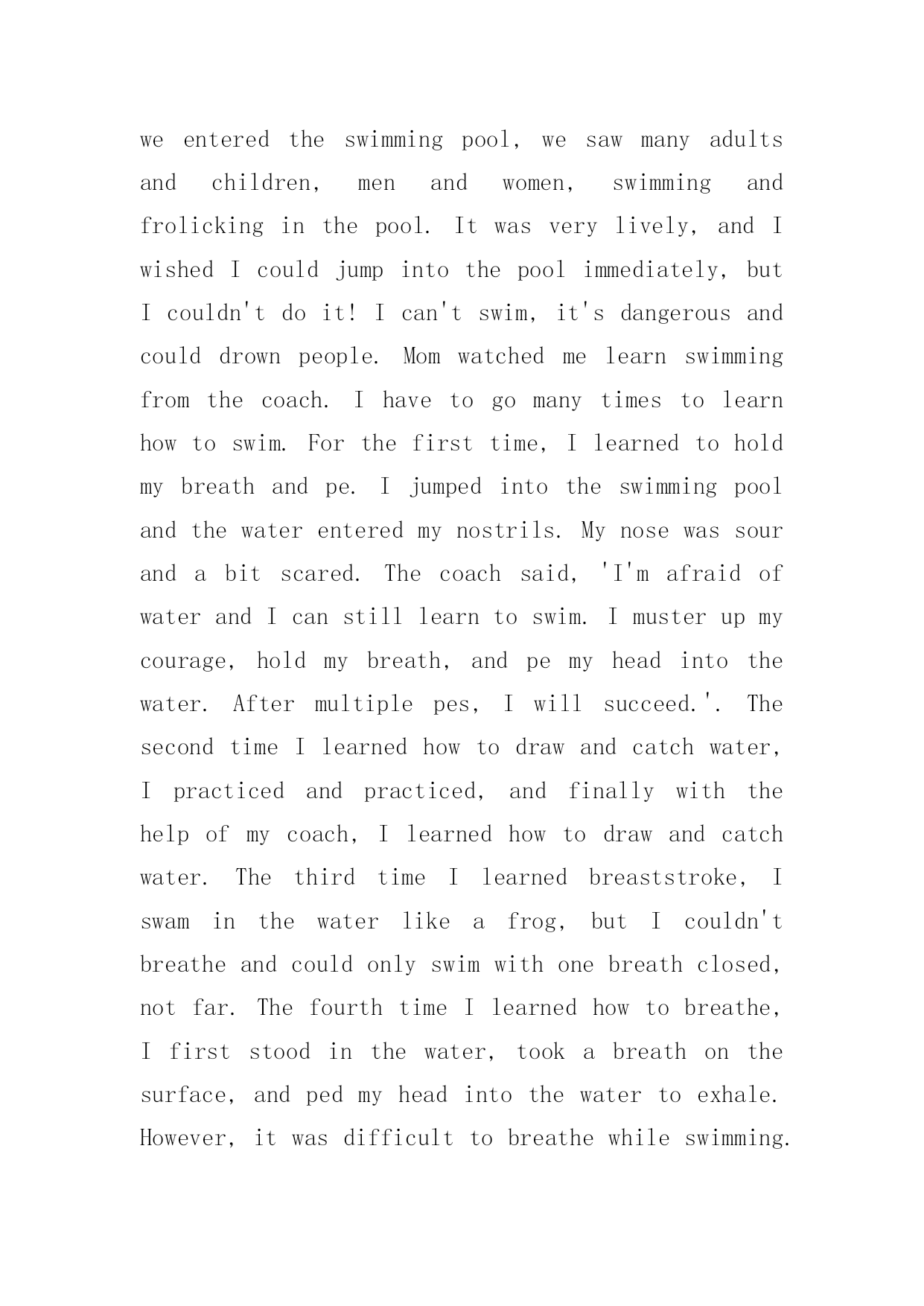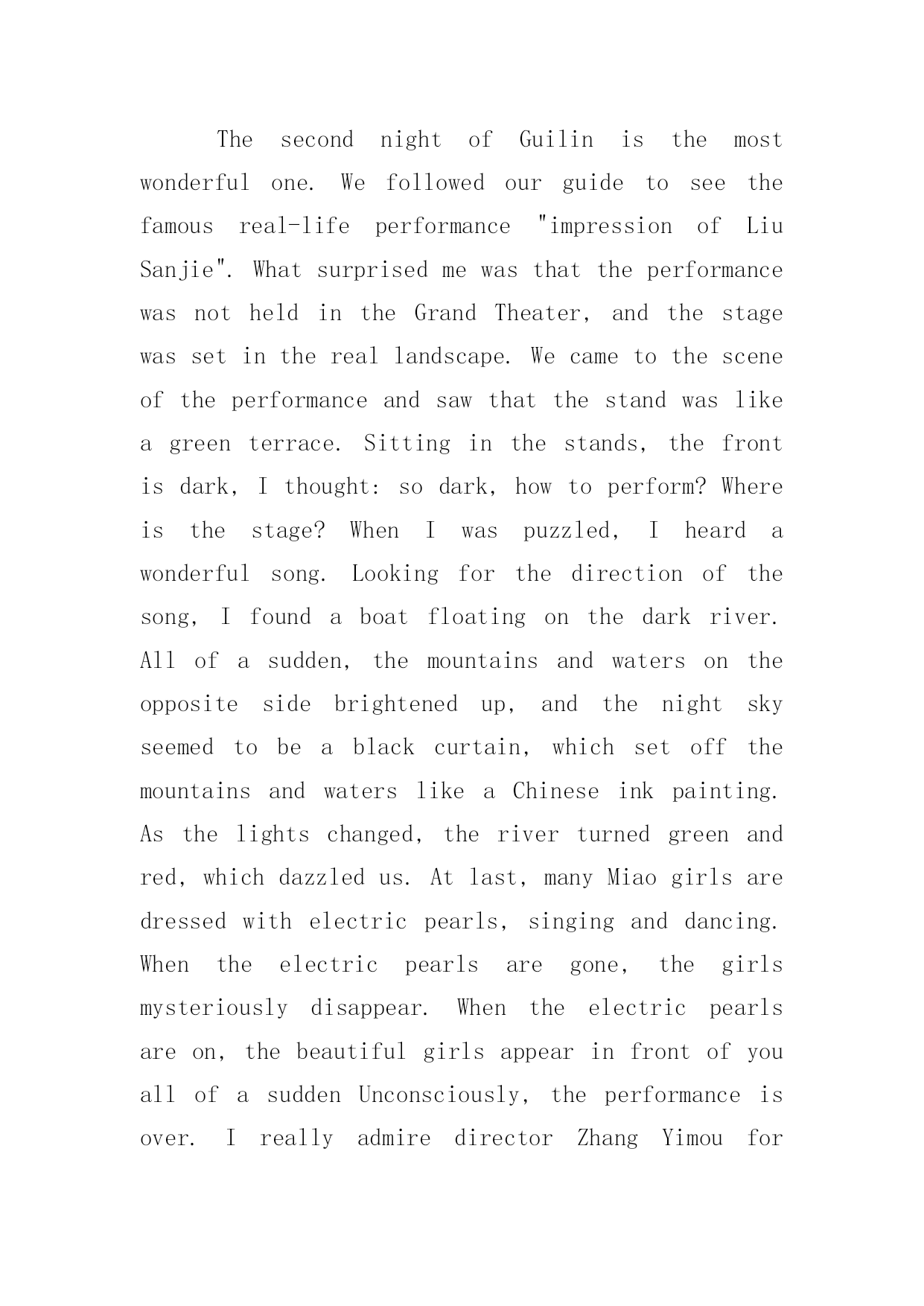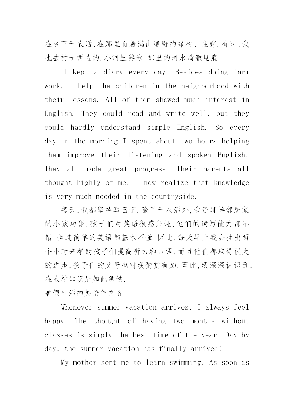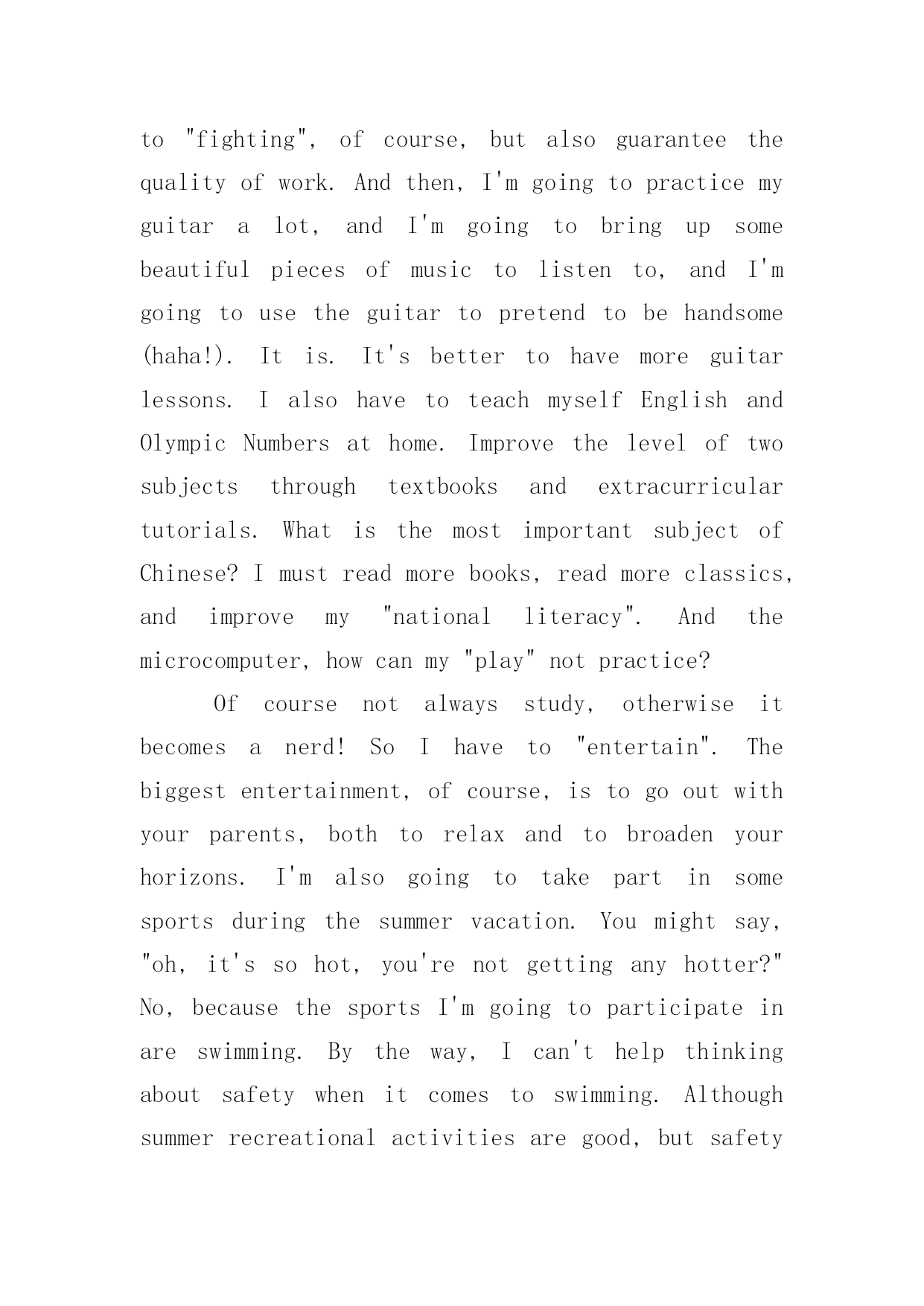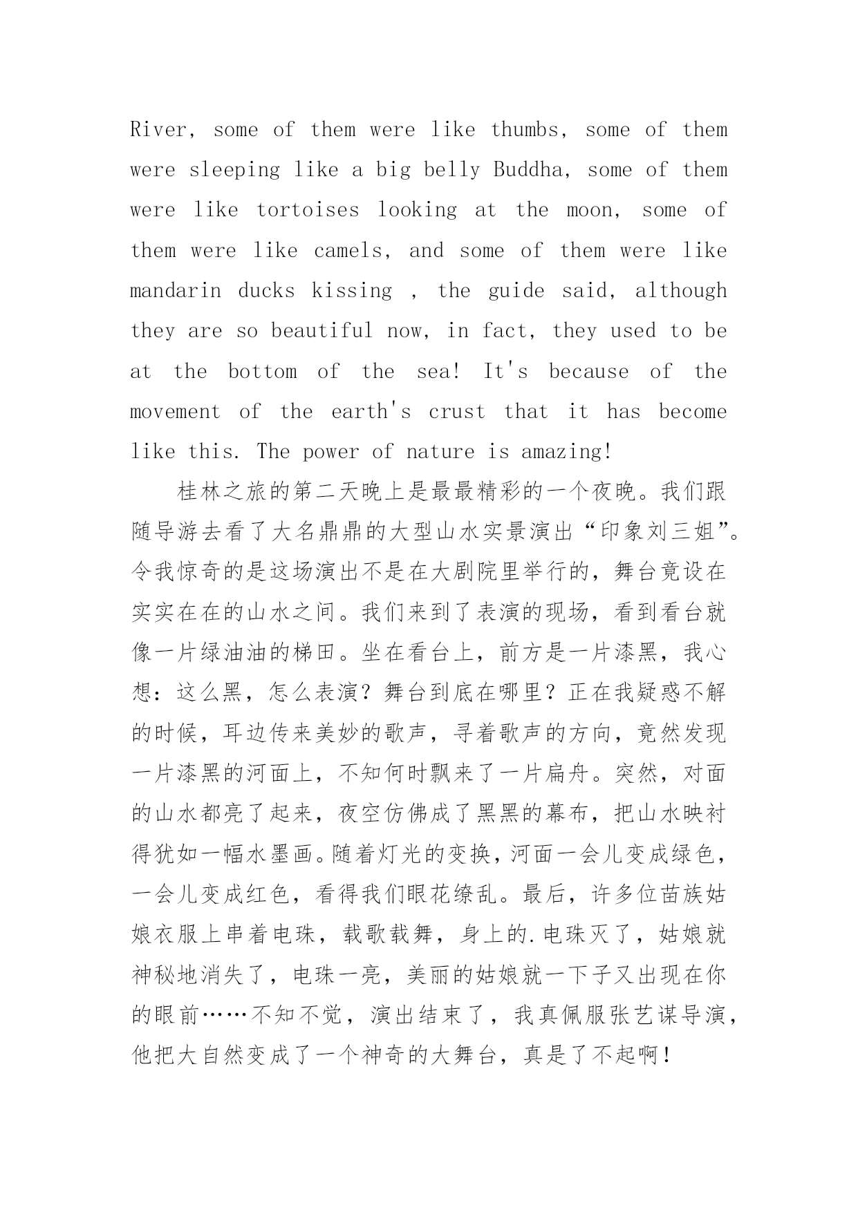 暑假生活的英语作文暑假生活的英语作文在我们平凡的日常里,大家都跟作文打过交道吧,根据写作命题的特点,作文可以分为命题作文和非命题作文。如何写一篇有思想、有文采的作文呢?以下是小编为大家整理的暑假生活的英语作文,供大家参考借鉴,希望可以帮助到有需要的朋友。暑假生活的英语作文1LastsummerIhavevisitedHainanisland.DuringtheholidayIhaveagoodtime.InHainanthebestinterestingthingsisscubaping.Intheseabedthecoralreefswereverybeautiful!Ilikeitverymuch,andIhavetakenmanyphotosbymycamera.AndalsothescenaryofHainanisbeautiful,forexample"theedgeoftheskyandtherimofthesea."isveryfamousanditmeans"TianyaHaijiao."Andthere'sevenadeerpark,intheparkwecanseemangkindsofdeer.Thedeerareverylovely,Ilikeitverymuch.Inconclusion,Ihaveinterestedinmylastvacation.暑假生活的英语作文2今年暑假最令我难忘的事情就是我的桂林之旅。ThemostunforgettablethingthissummervacationismytriptoGuilin.7月1日一放假,我们一家四口就登上了飞往桂林的航班。到桂林时,已经是晚上十一点了,我累得眼睛都睁不开了。OnJuly1,ourfamilyoffourboardedaflighttoGuilin.BythetimeIarrivedinGuilin,itwasalreadyeleveno'clockintheevening.IwassotiredthatIcouldn'topenmyeyes.第二天一早,睁开眼睛,我惊喜地发现窗外竟然是一幅美丽的山水画,“桂林山水甲天下”,真是名不虚传啊!Thenextmorning,whenIopenedmyeyes,Iwassurprisedtofindoutthattherewasabeautifullandscapepaintingoutsidethewindow."Guilinlandscapeisthebestintheworld."it'sreallyfamous!我们游程的第一站是游漓江。我看到漓江两岸的山,有的像大拇指,有的像大肚皮佛在睡觉,有的像乌龟望月,有的像骆驼,还有的像鸳鸯亲嘴……,导游说,别看它们现在那么秀美,其实,它们以前可是在海底的哟!是由于地壳运动才变成现在这样的,大自然的力量可真神奇呀!ThefirststopofourtouristheLijiangRiver.IsawthemountainsonbothsidesoftheLijiangRiver,someofthemwerelikethumbs,someofthemweresleepinglikeabigbellyBuddha,someofthemwereliketortoiseslookingatthemoon,someofthemwerelikecamels,andsomeofthemwerelikemandarinduckskissing,theguidesaid,althoughtheyaresobeautifulnow,infact,theyusedtobeatthebottomofthesea!It'sbecauseofthemovementoftheearth'scrustthatithasbecomelikethis.Thepowerofnatureisamazing!桂林之旅的第二天晚上是最最精彩的一个夜晚。我们跟随导游去看了大名鼎鼎的大型山水实景演出“印象刘三姐”。令我惊奇的是这场演出不是在大剧院里举行的,舞台竟设在实实在在的山水之间。我们来到了表演的现场,看到看台就像一片绿油油的梯田。坐在看台上,前方是一片漆黑,我心想:这么黑,怎么表演?舞台到底在哪里?正在我疑惑不解的时候,耳边传来美妙的歌声,寻着歌声的方向,竟然发现一片漆黑的河面上,不知何时飘来了一片扁舟。突然,对面的山水都亮了起来,夜空仿佛成了黑黑的幕布,把山水映衬得犹如一幅水墨画。随着灯光的变换,河面一会儿变成绿色,一会儿变成红色,看得我们眼花缭乱。最后,许多位苗族姑娘衣服上串着电珠,载歌载舞,身上的.电珠灭了,姑娘就神秘地消失了,电珠一亮,美丽的姑娘就一下子又出现在你的