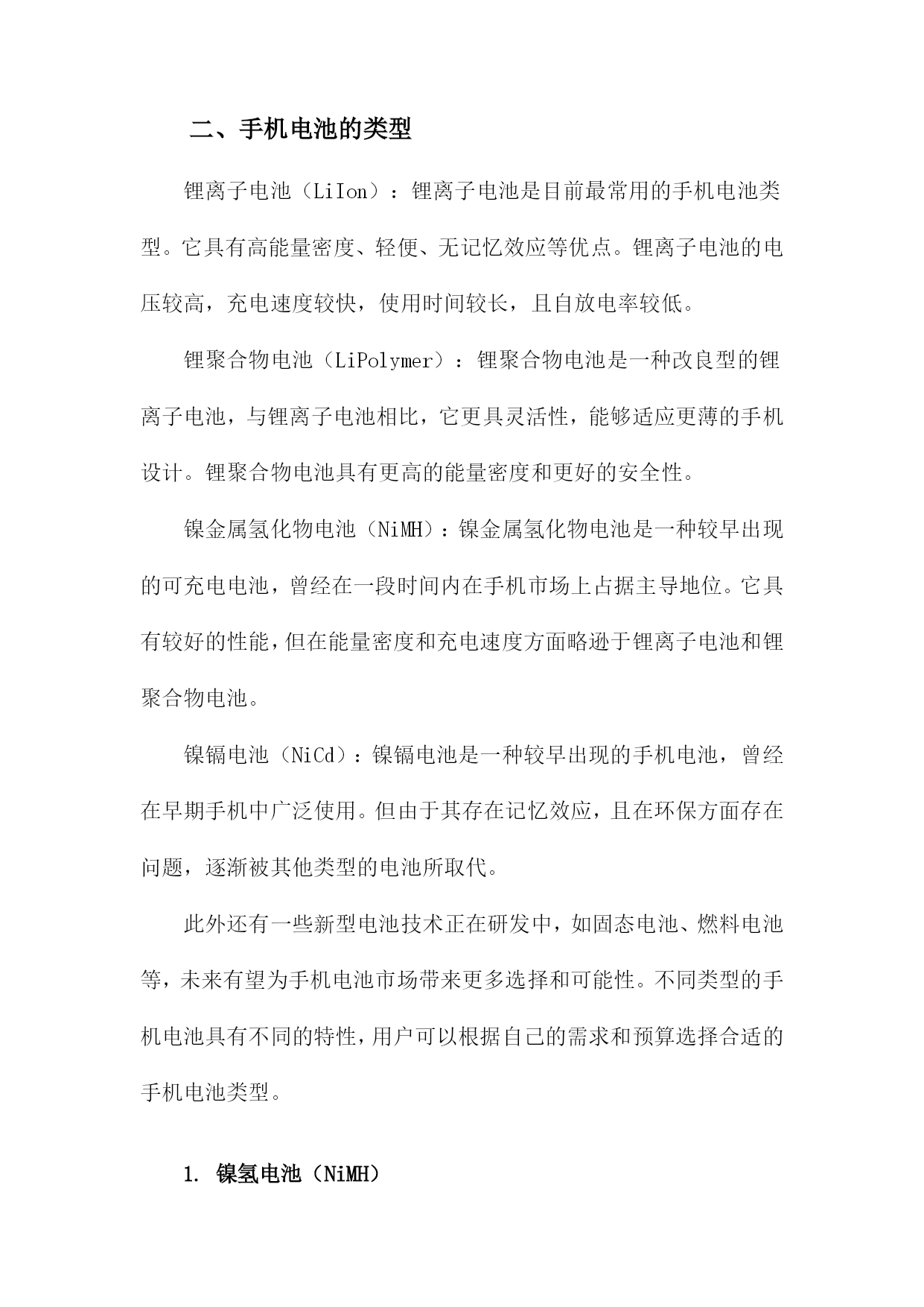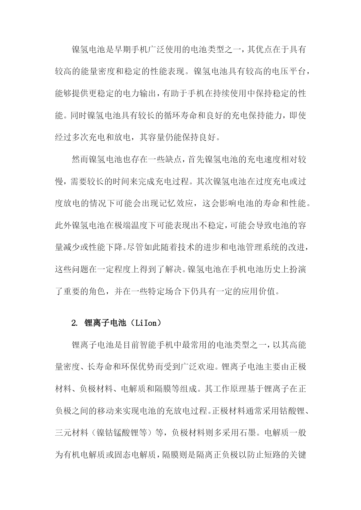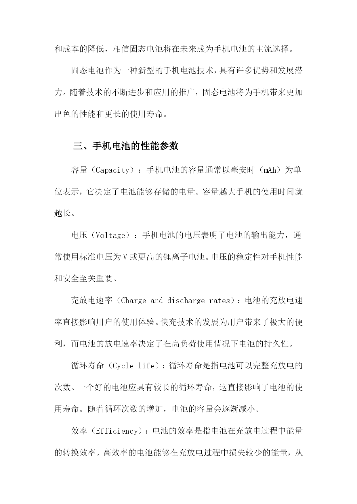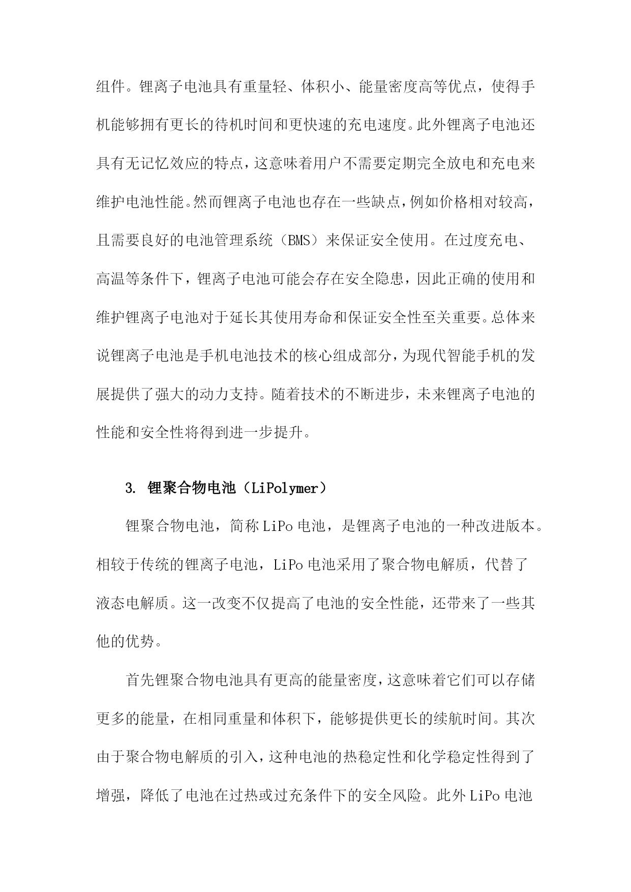 手机电池详解一、综述随着科技的飞速发展,手机已成为人们日常生活中不可或缺的伙伴,而手机电池作为这一重要设备的能量来源,其性能和质量直接关系到用户的使用体验。本文旨在全面解析手机电池的工作原理、技术种类、性能评估、市场现状以及未来发展趋势。手机电池是移动设备的核心组成部分,其演变历程与技术革新息息相关。从早期的镍氢电池到现在的锂离子电池,再到未来可能涌现的更多新技术,手机电池不断在容量、充电速度、寿命和安全性等方面取得突破。本文将深入探讨这些技术细节,同时分析市场主流产品及其优缺点,为消费者提供全面详尽的选购参考。通过本文的阅读,读者将更深入地了解手机电池的奥秘,并能在选择和使用手机时更加得心应手。1.手机电池的普及与重要性随着科技的飞速发展,手机已经成为我们日常生活中不可或缺的一部分。而在这其中,手机电池的作用及其重要性愈发凸显。我们每天都会依赖于手机进行各种活动和沟通,无论是工作、学习还是娱乐,手机的普及程度已经达到了前所未有的高度。这一切都离不开手机电池的支撑,因此了解手机电池的发展历程、种类特点以及其重要性,对于我们更好地使用和保护手机具有重要意义。手机电池作为手机的能量来源,其普及程度随着智能手机的广泛普及而不断扩大。从最初的镍氢电池到锂离子电池,再到如今更为先进的固态电池,手机电池的技术在不断进步,为我们的生活带来了极大的便利。无论是在繁华的都市还是偏远的乡村,手机电池的重要性都不可忽视。它不仅是我们的通信工具的动力源泉,更是我们在户外活动、旅行探险等关键时刻的救命稻草。因此了解手机电池的特性和性能,对于我们的日常生活至关重要。2.电池技术革新对手机行业的影响随着科技的飞速发展,电池技术革新对手机行业产生了深远的影响。电池技术的进步不仅推动了手机性能的提升,还使得手机在续航能力上取得了显著的进步。从最初的镍氢电池到现在的锂离子电池,再到未来可能的高能量密度电池,每一次技术的飞跃都为手机行业带来了革命性的变革。首先电池技术的持续创新使得手机的续航能力得到了极大的提升。在智能手机功能日益丰富的今天,用户对手机的依赖程度越来越高,这就需要更强大的电池来支撑手机的长时间使用。例如锂离子电池的普及使得手机能够实现全天候的待机时间,并支持长时间的视频播放、游戏娱乐和移动网络使用等高强度应用场景。这为手机行业的发展打开了更广阔的市场空间和应用场景。其次电池技术的革新也推动了手机行业的快速发展,随着智能手机的功能越来越丰富,对电池的性能要求也越来越高。这就促使电池制造商不断研发新技术、新工艺来满足手机市场的需求。而手机的更新换代又进一步促进了电池技术的进步,形成了相互促进的良性闭环。这不仅推动了手机行业的技术创新,还催生了大量的新应用和商业模式。此外未来电池技术的发展还将为手机行业带来更多的可能性,随着高能量密度电池的研发和应用,未来手机将实现更长的续航时间和更轻薄的设计。这将使得手机能够支持更多的应用场景,如虚拟现实、增强现实、人工智能等领域的应用,从而为用户带来更加丰富和便捷的移动生活体验。电池技术的革新对手机行业产生了深远的影响,它不仅推动了手机性能的提升和续航能力的提升,还促进了手机行业的快速发展和创新。未来随着电池技术的不断进步,手机行业将迎来更加广阔的发展前景和更多的可能性。3.手机电池的基本知识概述随着智能手机的普及,手机电池作为设备的核心组成部分,其性能和质量对于用户的日常体验至关重要。手机电池的基本知识概述,是理解其工作原理、性能特点以及维护管理的重要前提。首先手机电池是一种便携式电池,通常采用锂离子电池(LiIon)或锂聚合物电池(LiPolymer)。这些电池以其高能量密度、较长的寿命以及良好的充电性能而被广泛应用。锂离子电池由正极、负极、电解质以及隔膜等关键部分组成,通过化学反应产生电能。手机电池的充电和放电过程涉及锂离子在正负极之间的移动,这一反应过程的安全性是评价电池质量的重要指标之一。其次手机电池具有一些基本性能参数,如容量、电压和充电速度等。容量通常以毫安时(mAh)为单位表示,反映了电池能够存储的电量。电压则决定了电池供电的稳定性,充电速度则取决于电池的充电协议以及充电器的功率。了解这些参数有助于用户选择合适的充电器和充电方式,延长电池的使用寿命。此外用户在日常使用中还需要了解如何维护和管理手机电池,这包括避免过度充电和放电、保持适宜的使用温度、避免频繁充电等。正确的维护和管理方式不仅可以延长电池寿命,还能提高设备的安全性。手机电池的基本知识概述涵盖了其工作原理、性能特点以及维护管理等方面。了解这些知识有助于用户更好地使用智能手机,提高设备的使用体验和使用寿命。二、手机电池的类型锂离子电池(LiIon):锂离子电池是目前最常用的手机电池类型。它具有高能量密度、轻