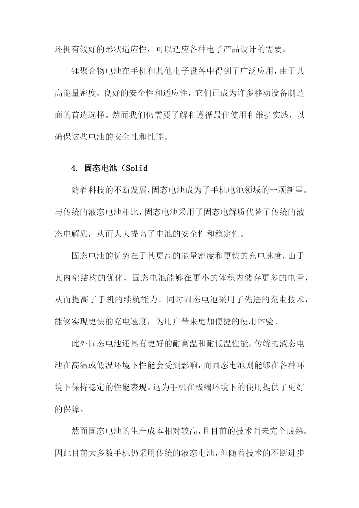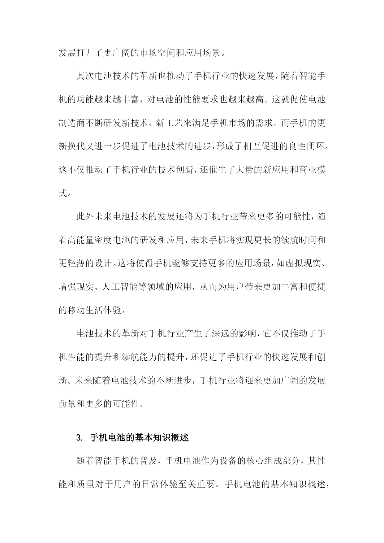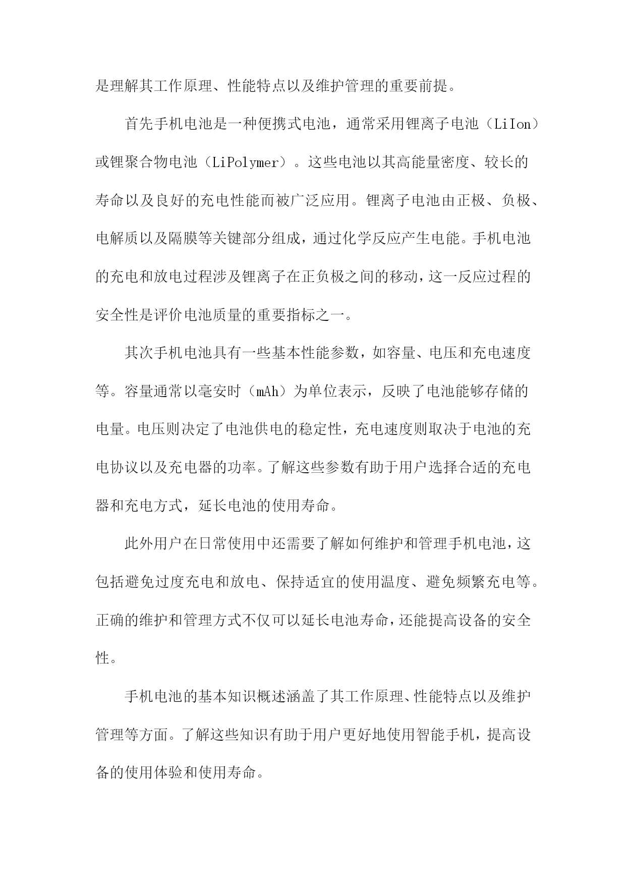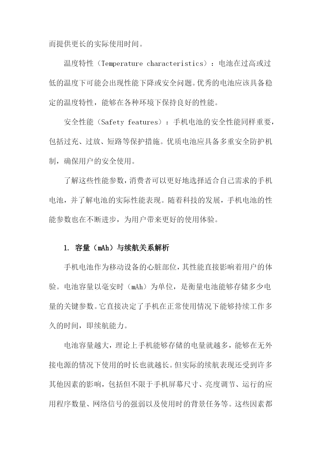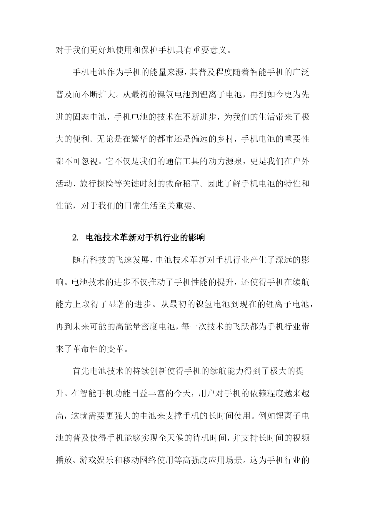 手机电池详解一、综述随着科技的飞速发展,手机已成为人们日常生活中不可或缺的伙伴,而手机电池作为这一重要设备的能量来源,其性能和质量直接关系到用户的使用体验。本文旨在全面解析手机电池的工作原理、技术种类、性能评估、市场现状以及未来发展趋势。手机电池是移动设备的核心组成部分,其演变历程与技术革新息息相关。从早期的镍氢电池到现在的锂离子电池,再到未来可能涌现的更多新技术,手机电池不断在容量、充电速度、寿命和安全性等方面取得突破。本文将深入探讨这些技术细节,同时分析市场主流产品及其优缺点,为消费者提供全面详尽的选购参考。通过本文的阅读,读者将更深入地了解手机电池的奥秘,并能在选择和使用手机时更加得心应手。1.手机电池的普及与重要性随着科技的飞速发展,手机已经成为我们日常生活中不可或缺的一部分。而在这其中,手机电池的作用及其重要性愈发凸显。我们每天都会依赖于手机进行各种活动和沟通,无论是工作、学习还是娱乐,手机的普及程度已经达到了前所未有的高度。这一切都离不开手机电池的支撑,因此了解手机电池的发展历程、种类特点以及其重要性,对于我们更好地使用和保护手机具有重要意义。手机电池作为手机的能量来源,其普及程度随着智能手机的广泛普及而不断扩大。从最初的镍氢电池到锂离子电池,再到如今更为先进的固态电池,手机电池的技术在不断进步,为我们的生活带来了极大的便利。无论是在繁华的都市还是偏远的乡村,手机电池的重要性都不可忽视。它不仅是我们的通信工具的动力源泉,更是我们在户外活动、旅行探险等关键时刻的救命稻草。因此了解手机电池的特性和性能,对于我们的日常生活至关重要。2.电池技术革新对手机行业的影响随着科技的飞速发展,电池技术革新对手机行业产生了深远的影响。电池技术的进步不仅推动了手机性能的提升,还使得手机在续航能力上取得了显著的进步。从最初的镍氢电池到现在的锂离子电池,再到未来可能的高能量密度电池,每一次技术的飞跃都为手机行业带来了革命性的变革。首先电池技术的持续创新使得手机的续航能力得到了极大的提升。在智能手机功能日益丰富的今天,用户对手机的依赖程度越来越高,这就需要更强大的电池来支撑手机的长时间使用。例如锂离子电池的普及使得手机能够实现全天候的待机时间,并支持长时间的视频播放、游戏娱乐和移动网络使用等高强度应用场景。这为手机行业的发展打开了更广阔的市场空间和应用场景。其次电池技术的革新也推动了手机行业的快速发展,随着智能手机的功能越来越丰富,对电池的性能要求也越来越高。这就促使电池制造商不断研发新技术、新工艺来满足手机市场的需求。而手机的更新换代又进一步促进了电池技术的进步,形成了相互促进的良性闭环。这不仅推动了手机行业的技术创新,还催生了大量的新应用和商业模式。此外未来电池技术的发展还将为手机行业带来更多的可能性,随着高能量密度电池的研发和应用,未来手机将实现更长的续航时间和更轻薄的设计。这将使得手机能够支持更多的应用场景,如虚拟现实、增强现实、人工智能等领域的应用,从而为用户带来更加丰富和便捷的移动生活体验。电池技术的革新对手机行业产生了深远的影响,它不仅推动了手机性能的提升和续航能力的提升,还促进了手机行业的快速发展和创新。未来随着电池技术的不断进步,手机行业将迎来更加广阔的发展前景和更多的可能性。3.手机电池的基本知识概述随着智能手机的普及,手机电池作为设备的核心组成部分,其性能和质量对于用户的日常体验至关重要。手机电池的基本知识概述,是理解其工作原理、性能特点以及维护管理的重要前提。首先手机电池是一种便携式电池,通常采用锂离子电池(LiIon)或锂聚合物电池(LiPolymer)。这些电池以其高能量密度、较长的寿命以及良好的充电性能而被广泛应用。锂离子电池由正极、负极、电解质以及隔膜等关键部分组成,通过化学反应产生电能。手机电池的充电和放电过程涉及锂离子在正负极之间的移动,这一反应过程的安全性是评价电池质量的重要指标之一。其次手机电池具有一些基本性能参数,如容量、电压和充电速度等。容量通常以毫安时(mAh)为单位表示,反映了电池能够存储的电量。电压则决定了电池供电的稳定性,充电速度则取决于电池的充电协议以及充电器的功率。了解这些参数有助于用户选择合适的充电器和充电方式,延长电池的使用寿命。此外用户在日常使用中还需要了解如何维护和管理手机电池,这包括避免过度充电和放电、保持适宜的使用温度、避免频繁充电等。正确的维护和管理方式不仅可以延长电池寿命,还能提高设备的安全性。手机电池的基本知识概述涵盖了其工作原理、性能特点以及维护管理等方面。了解这些知识有助于用户更好地使用智能手机,提高设备的使用体验和使用寿命。二、手机电池的类型锂离子电池(LiIon):锂离子电池是目前最常用的手机电池类型。它具有高能量密度、轻