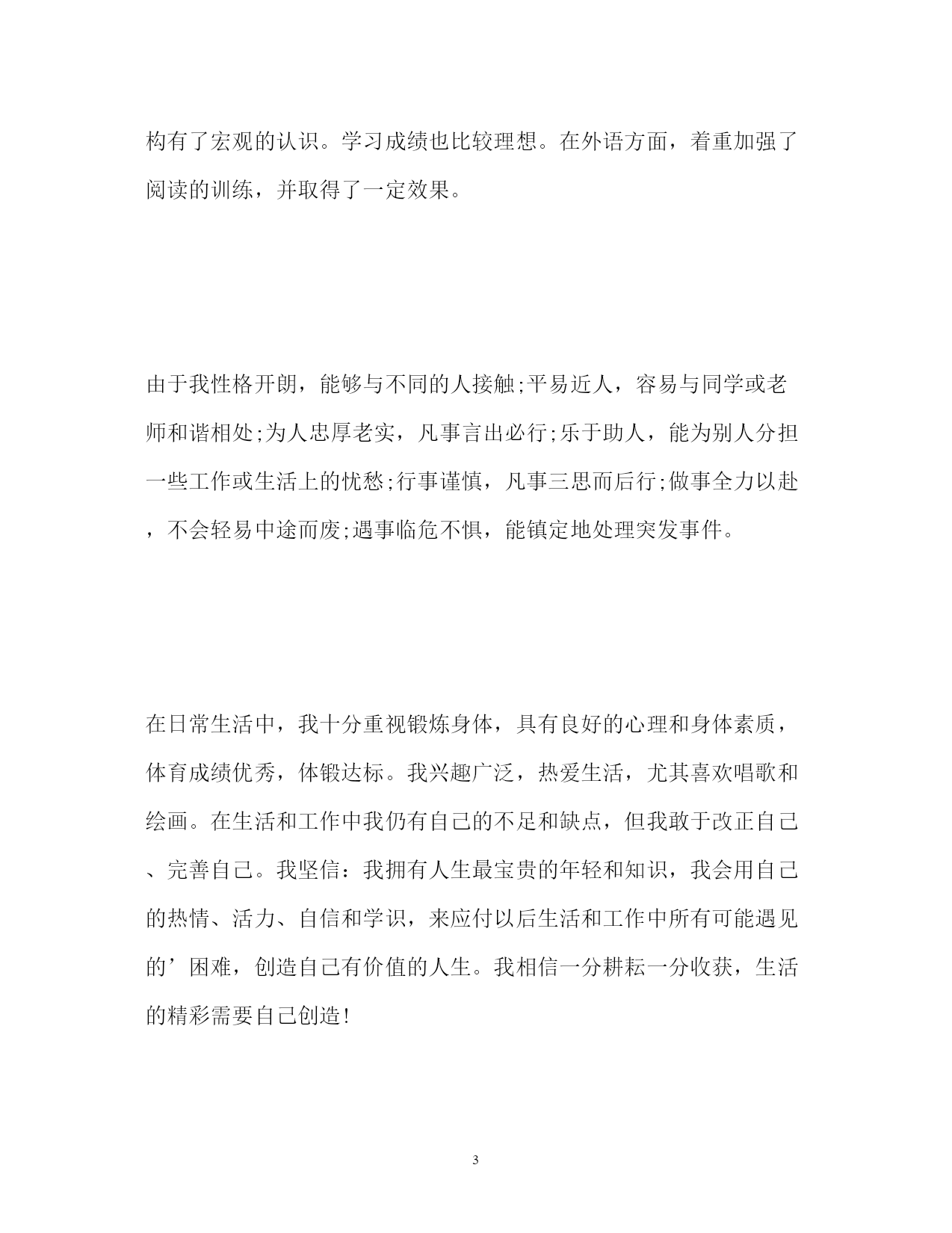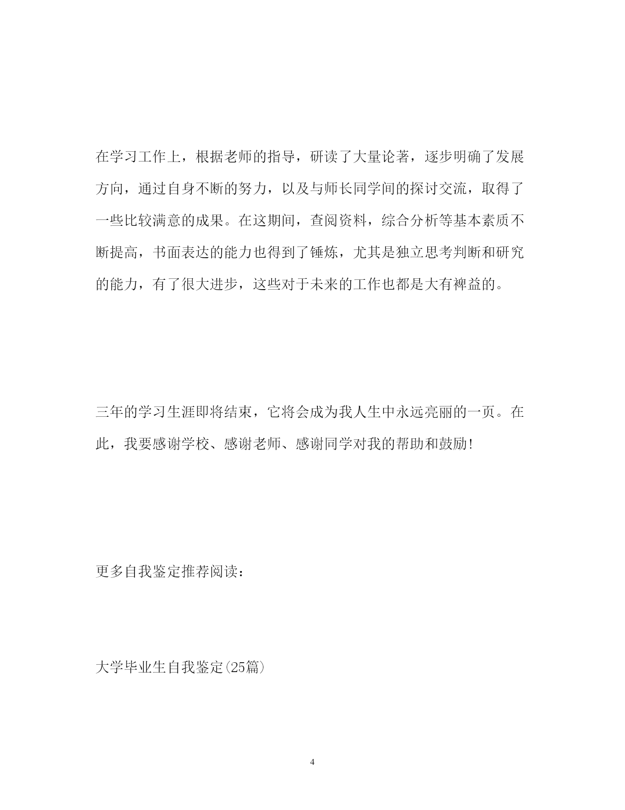 此资料由网络收集而来,如有侵权请告知上传者立即删除。资料共分享,我们负责传递知识。PAGEPAGE5经济管理毕业生自我鉴定经济管理毕业生自我鉴定由就读xx大学经济管理学院开始,在进行MBA学习以来,我深深地为这里浓厚的学术环境所吸引,在理论深厚、学识渊博的老师们的教诲下,我时刻以“厚德博学、以人为本”的校训为宗旨,经过二年的专业知识熏陶,和近一年对专业研究方向的深入钻研和论文撰写,我即将毕业,成为一名光荣的NUST培养出来的硕士研究生。回顾艰辛而快乐的三年求学生涯,作自我鉴定如下。一、不断加强政治修养,树立正确的学习理念。NUST是一所有着光荣革命传统和深刻学术造诣的高等学府,作为这里的学生,我时刻牢记“团结、献身、求是、创新”的办学理念,以一名共产党员的要求,严格要求自己,不断加强政治学习,不断改善自己的世界观、人生观和价值观,树立报效国家、服务人民、为校争光的学习理念。二、刻苦学习专业知识,发扬精益求精的学习精神。在两年的课程学习中,我保持刻苦钻研的学习态度,认真学习所有课程,克服在外地的不便,坚持来校上课,风雨无阻,从不缺课,修完了所有学分。在最后一年的论文撰写过程中,我一次次到图书馆查找资料,一趟趟向导师求教问题,坚持高标准、严要求地完成论文的写作,不辜负导师的期望和自己的汗水,以优异的成绩回报学校的培养。我在思想觉悟上对自己有较高的要求,能用科学发展观来认识世界认识社会,能清醒的意识到自己所担负的社会责任,对个人的人生理想和发展目标,有了相对成熟的认识和定位。在专业课程的学习上,根据自身专业方向的要求,有针对性的认真研读了有关核心课程,为自己的学习工作打下扎实基础;并涉猎了一部分其他课程,开阔视野,对本专业方向的应用背景以及整个学科的结构有了宏观的认识。学习成绩也比较理想。在外语方面,着重加强了阅读的训练,并取得了一定效果。由于我性格开朗,能够与不同的人接触;平易近人,容易与同学或老师和谐相处;为人忠厚老实,凡事言出必行;乐于助人,能为别人分担一些工作或生活上的忧愁;行事谨慎,凡事三思而后行;做事全力以赴,不会轻易中途而废;遇事临危不惧,能镇定地处理突发事件。在日常生活中,我十分重视锻炼身体,具有良好的心理和身体素质,体育成绩优秀,体锻达标。我兴趣广泛,热爱生活,尤其喜欢唱歌和绘画。在生活和工作中我仍有自己的不足和缺点,但我敢于改正自己、完善自己。我坚信:我拥有人生最宝贵的年轻和知识,我会用自己的热情、活力、自信和学识,来应付以后生活和工作中所有可能遇见的’困难,创造自己有价值的人生。我相信一分耕耘一分收获,生活的精彩需要自己创造!在学习工作上,根据老师的指导,研读了大量论著,逐步明确了发展方向,通过自身不断的努力,以及与师长同学间的探讨交流,取得了一些比较满意的成果。在这期间,查阅资料,综合分析等基本素质不断提高,书面表达的能力也得到了锤炼,尤其是独立思考判断和研究的能力,有了很大进步,这些对于未来的工作也都是大有裨益的。三年的学习生涯即将结束,它将会成为我人生中永远亮丽的一页。在此,我要感谢学校、感谢老师、感谢同学对我的帮助和鼓励!更多自我鉴定推荐阅读:大学毕业生自我鉴定(25篇)2014研究生毕业自我鉴定范文大专毕业生自我鉴定范文500字研究生毕业鉴定表自我鉴定500字大学毕业生自我鉴定范文800字(五篇)