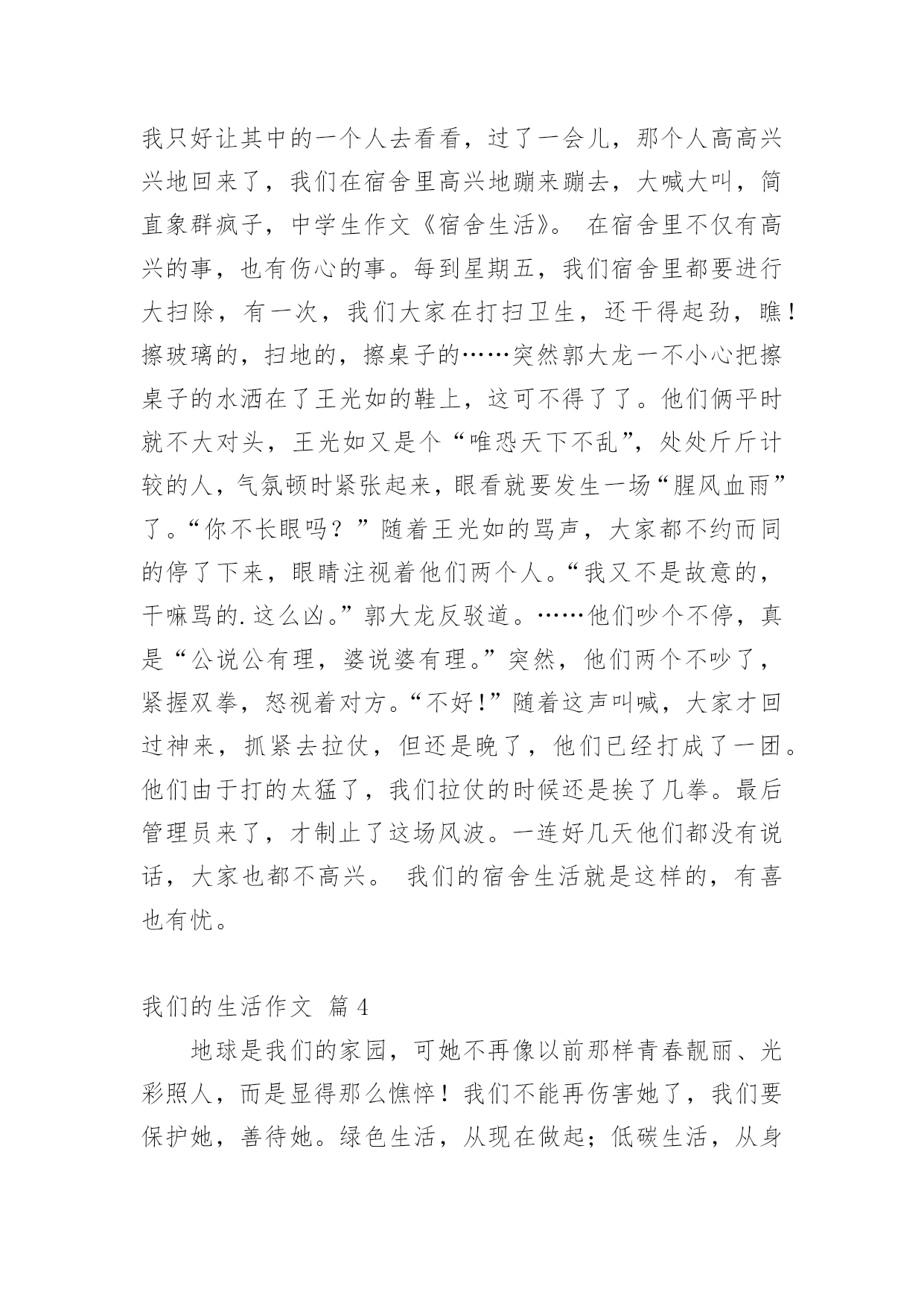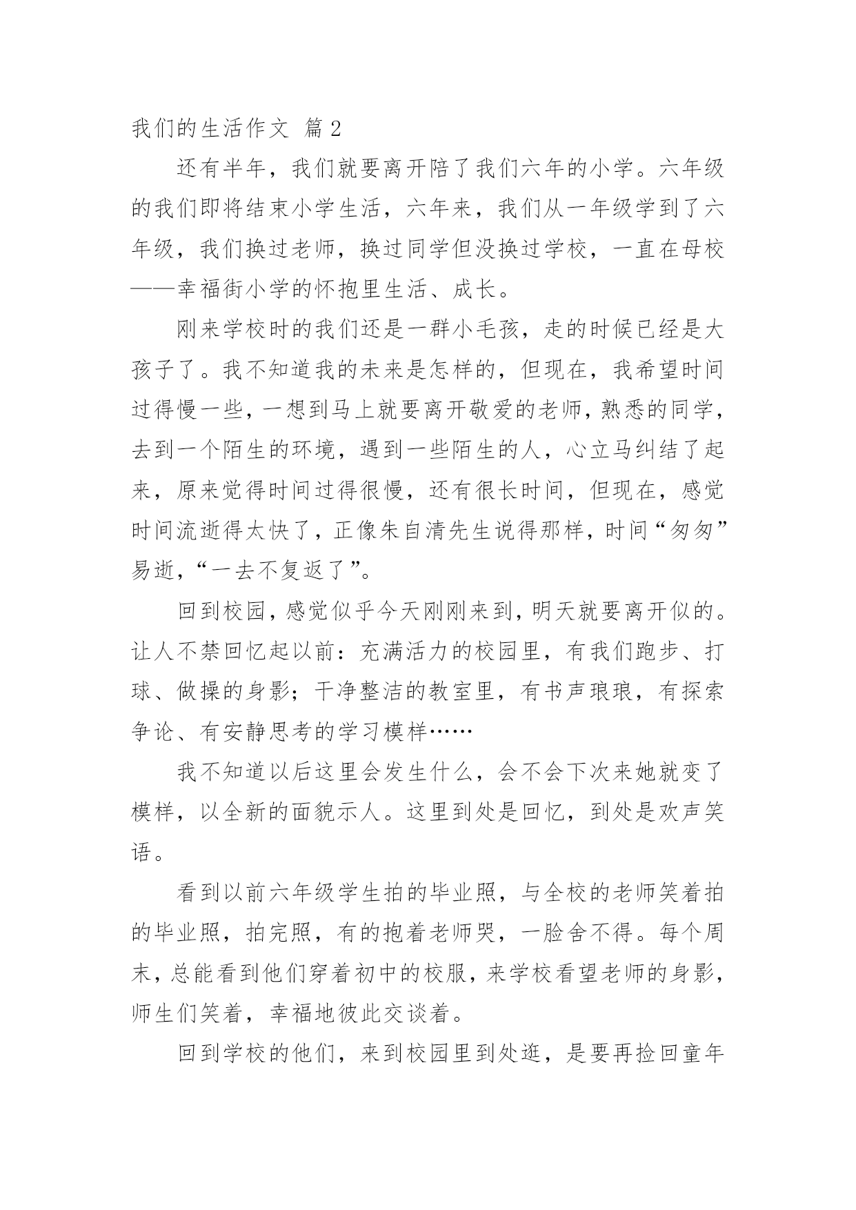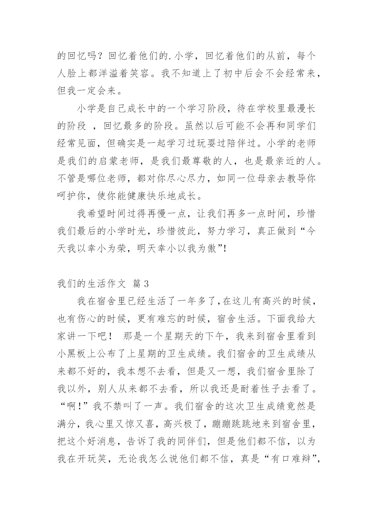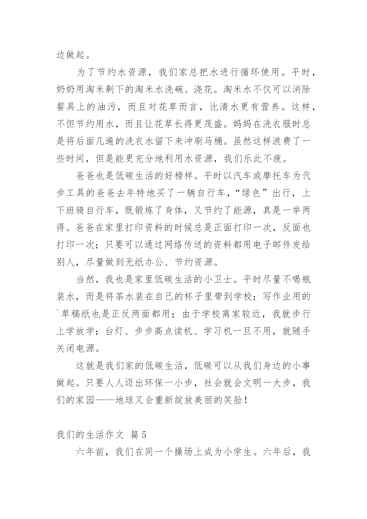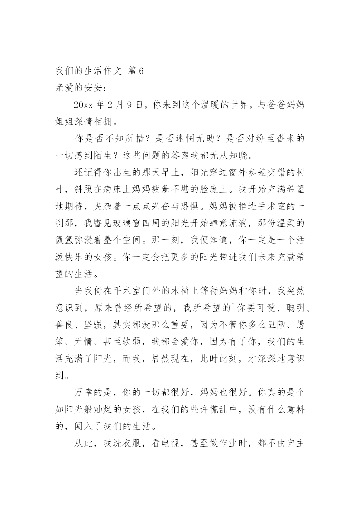 我们的生活作文我们的生活作文6篇在平时的学习、工作或生活中,大家对作文都不陌生吧,借助作文人们可以反映客观事物、表达思想感情、传递知识信息。你知道作文怎样写才规范吗?以下是小编为大家收集的我们的生活作文6篇,仅供参考,大家一起来看看吧。我们的生活作文篇1无论对于什么人,读书都是必不可少的。甚至可以说,读书是我们的一种生活方式,古今皆然。为什么读书是我们的一种生活方式呢?古人的“三不朽”理论已经给予我们很好的诠释。古人认为,人生于天地之间,当修身、齐家、治国、平天下,即“立德、立功、立言”乃人生永恒之追求。一个人要立德和立功,必须要读书方能明理,方能增长才干。而要立言于世,传诸后人,仅读书还远远不够,更要著书立说。从这个意义上来说,读书从来都是古人的重要生活方式之一。人类的文明的延续以及文化的传承,书籍以及人们的读书,功莫大焉。事实上现实社会中还有一种人——既不做学问,也不做事,只喜欢玩。这种人要不要读书呢?我觉得也必须读书。因为“最好消闲是读书”。虽然现今社会消闲的方式很多,如打游戏、上网聊天、看电视剧等等。但是仔细分析一下,大家会发现,这些消闲活动是纯粹的娱乐,除了浪费时间之外,没有太多益处。而读书则不一样,即便是随便读一读,不但可以消闲,而且总是能够有所收获,有所思考,甚至触发我们的灵感,进而有所创造。即使没有创造,也起码让我们减轻了工作压力,培养了生活的情趣。所以说,纯粹为了消闲,读书也不失为最佳的选择之一,是必须的一种生活方式。读书之所以是我们的一种生活方式,许多哲人论述得更为深刻。俄国著名的哲学家和作家赫尔岑1837年在维亚特卡公共图书馆开幕式上说过一段精彩的`话:“人类的全部生活,会在书本上有条不紊地留下印记:即使种族、人群、国家消灭了,书籍将永存下去。书籍是和人类一起成长起来的,一切震撼智慧世界的学说,一切打动心灵的热情都在书籍里结晶形成。……书籍——它是未来的纲领,因此我们要尊敬书籍。”葛蒂斯也说过这样的话:“书是储积智慧的不灭的明灯。”所以书籍记录了我们人类已有的智慧,并正在打造着开启未来智慧之门的钥匙。因此,我们不仅仅应该尊敬书籍,还要认真读书。我们必须明白,在当今社会,一个人可以没有金钱、没有地位、没有车子和房子,但生活中不能没有书。人能读书即为有福。读书是一种需要、一种习惯、一种生活态度、一种生活方式。让我们热爱读书吧!让读书成为我们的一种生活方式。我们的生活作文篇2还有半年,我们就要离开陪了我们六年的小学。六年级的我们即将结束小学生活,六年来,我们从一年级学到了六年级,我们换过老师,换过同学但没换过学校,一直在母校——幸福街小学的怀抱里生活、成长。刚来学校时的我们还是一群小毛孩,走的时候已经是大孩子了。我不知道我的未来是怎样的,但现在,我希望时间过得慢一些,一想到马上就要离开敬爱的老师,熟悉的同学,去到一个陌生的环境,遇到一些陌生的人,心立马纠结了起来,原来觉得时间过得很慢,还有很长时间,但现在,感觉时间流逝得太快了,正像朱自清先生说得那样,时间“匆匆”易逝,“一去不复返了”。回到校园,感觉似乎今天刚刚来到,明天就要离开似的。让人不禁回忆起以前:充满活力的校园里,有我们跑步、打球、做操的身影;干净整洁的教室里,有书声琅琅,有探索争论、有安静思考的学习模样……我不知道以后这里会发生什么,会不会下次来她就变了模样,以全新的面貌示人。这里到处是回忆,到处是欢声笑语。看到以前六年级学生拍的毕业照,与全校的老师笑着拍的毕业照,拍完照,有的抱着老师哭,一脸舍不得。每个周末,总能看到他们穿着初中的校服,来学校看望老师的身影,师生们笑着,幸福地彼此交谈着。回到学校的他们,来到校园里到处逛,是要再捡回童年的回忆吗?回忆着他们的.小学,回忆着他们的从前,每个人脸上都洋溢着笑容。我不知道上了初中后会不会经常来,但我一定会来。小学是自己成长中的一个学习阶段,待在学校里最漫长的阶段,回忆最多的阶段。虽然以后可能不会再和同学们经常见面,但确实是一起学习过玩耍过陪伴过。小学的老师是我们的启蒙老师,是我们最尊敬的人,也是最亲近的人。不管是哪位老师,都对你尽心尽力,如同一位母亲去教导你呵护你,使你能健康快乐地成长。我希望时间过得再慢一点,让我们再多一点时间,珍惜我们最后的小学时光,珍惜彼此,努力学习,真正做到“今天我以幸小为荣,明天幸小以我为傲”!我们的生活作文篇3我在宿舍里已经生活了一年多了,在这儿有高兴的时候,也有伤心的时候,更有难忘的时候,宿舍生活。下面我给大家讲一下吧!那是一个星期天的下午,我来到宿舍里看到小黑板上公布了上星期的卫生成绩。我们宿舍的卫生成绩从来都不好的,我本想不去看,但是又一想,我们宿舍里除了我以外,别人从来都不去看,所以我还是耐着性子去看了。“啊!”我不禁叫了一声。我们宿舍的这次卫生成绩竟然是满分,我心里