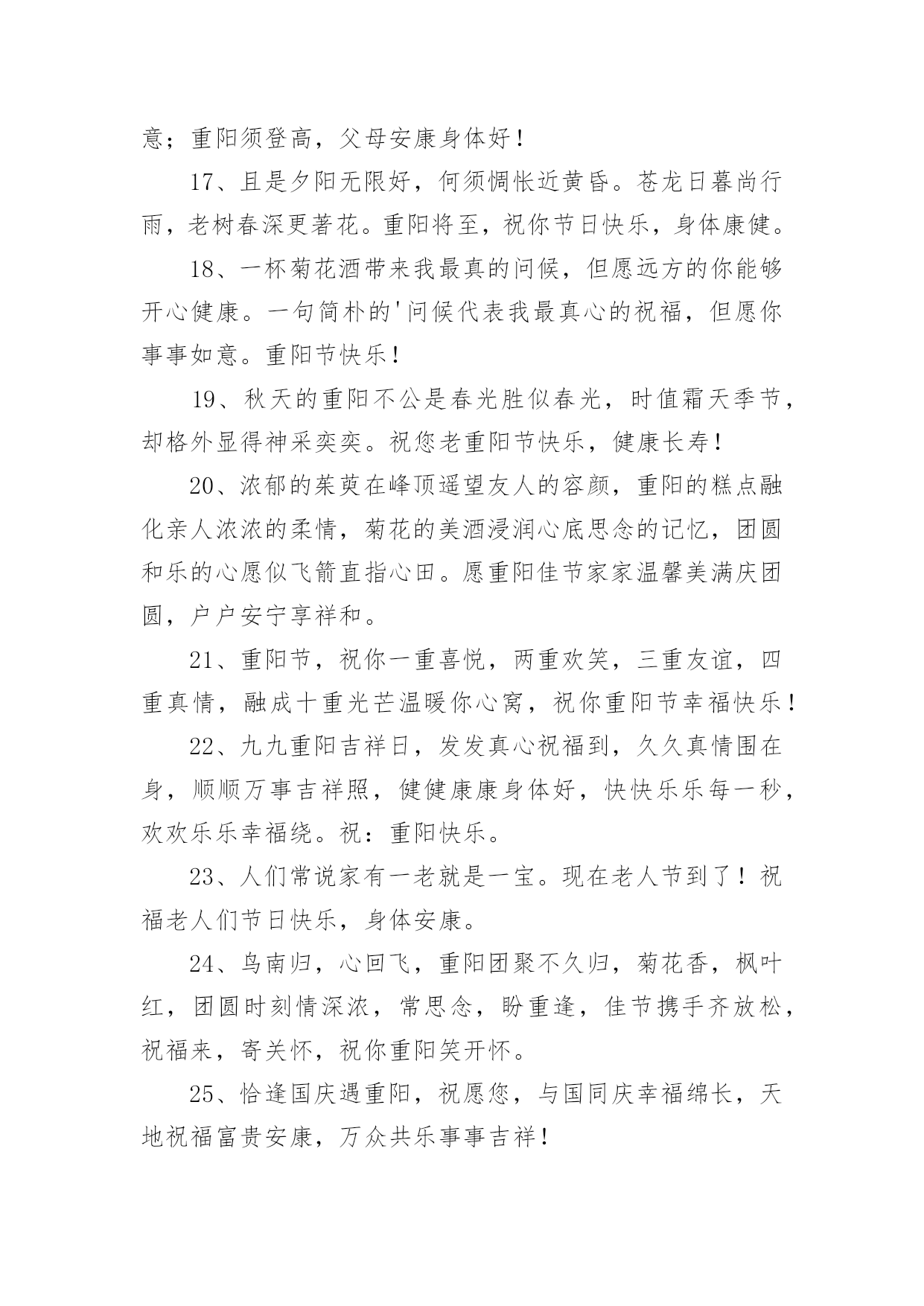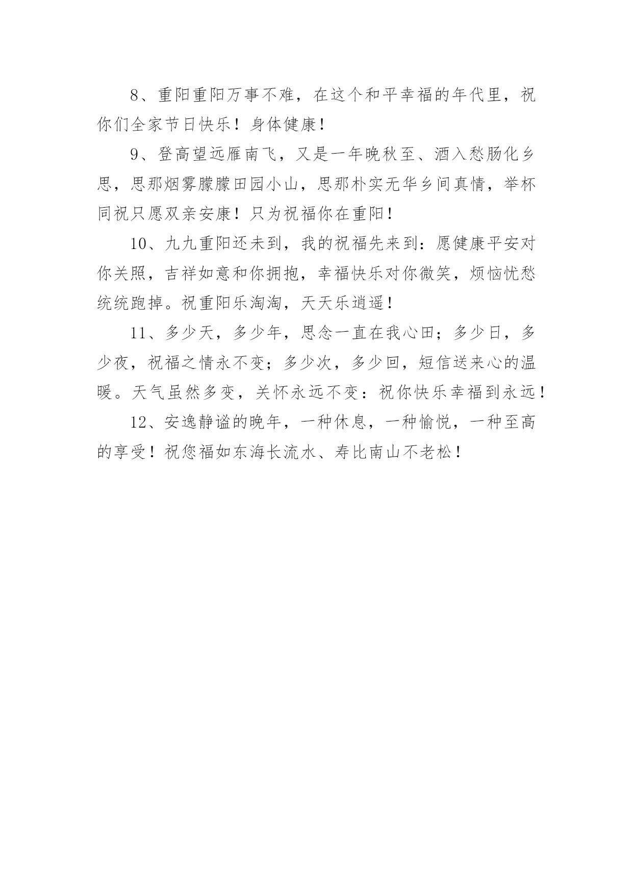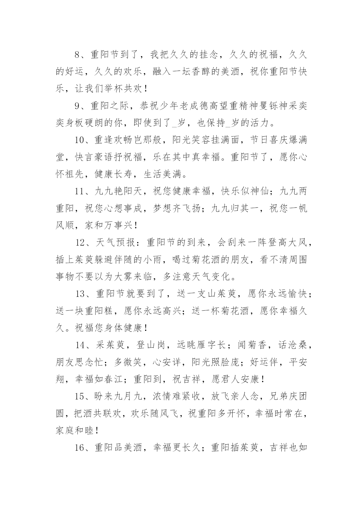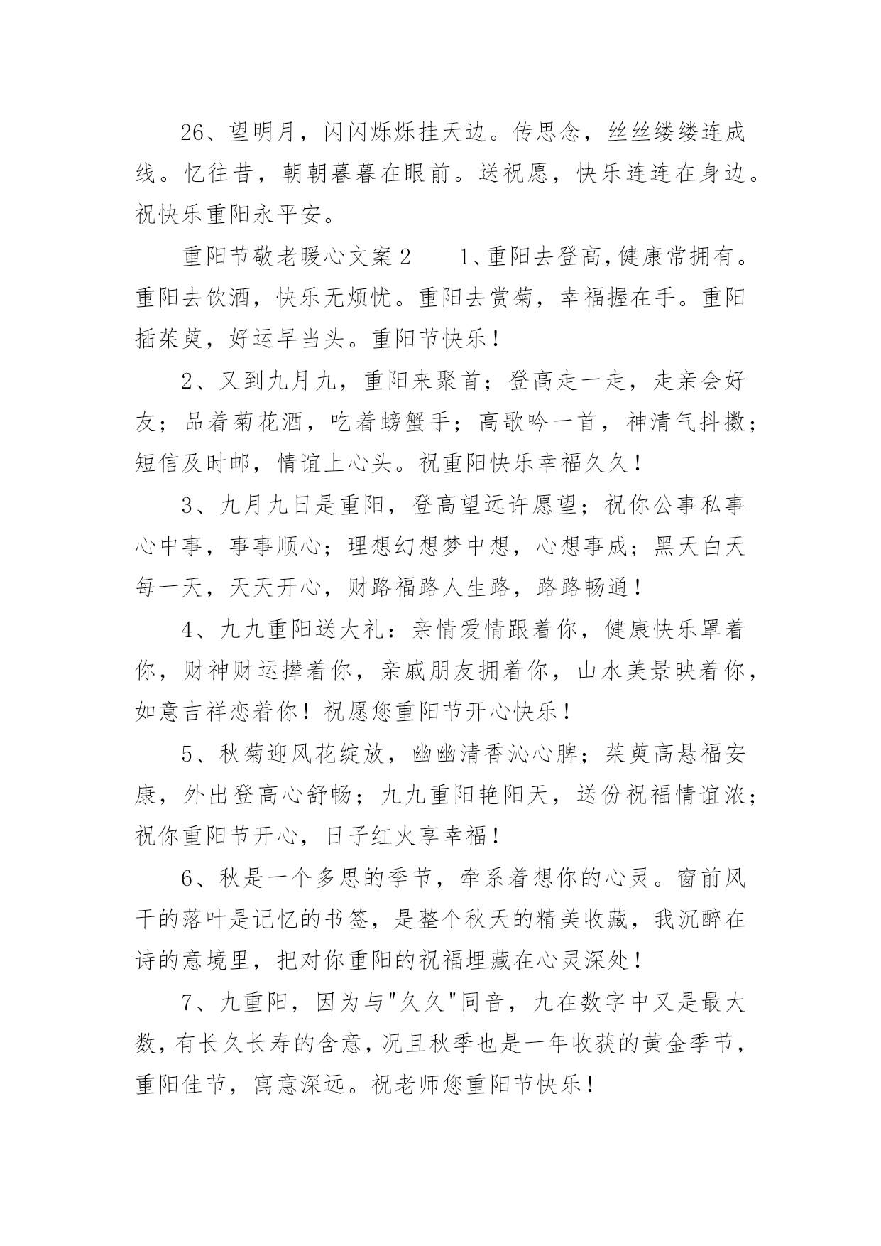 重阳节敬老暖心文案重阳节敬老暖心文案随着社交网络和信息技术的飞速发展,许多人对一些广为流传的文案都不陌生吧,文案用以分享自己对生活的思考,表达自己的喜怒哀乐。那些被广泛运用的文案都是什么样子的呢?下面是小编帮大家整理的重阳节敬老暖心文案,欢迎大家借鉴与参考,希望对大家有所帮助。重阳节敬老暖心文案11、祝天下所有老人身体健康,平平安安,子女孝顺。长命百岁!2、岁月如水,日子很美,若无人牵挂生活就会无味。祝福能让快乐心情加倍,把关心彼此传递,让思念相互温暖:重阳快乐!3、重阳佳节又至,思念增多,愿我浓浓的问候温暖你心里的每一个角落,祝你重阳节快乐。4、重阳到,菊花俏,杯酒妙,举樽共饮乐逍遥,重阳糕,茱萸梢,驱难散愁烦恼消,重阳节节高!5、每逢佳节,重阳在列,片插茱萸,登高望远,举杯怀远,唯思尔等,愿君婵娟,共思美好,祝你重阳节快乐!6、生命的秋天是枫叶一般的色彩,虽然不是明媚春光却胜似,九月初九时值霜季,曾相识有天季节,却格外显得那么神采奕奕。祝您重阳节快乐,健康长寿!7、双喜临门,佳期欣逢佳日;三阳播彩,小阳春叠重阳。重阳节快乐。8、重阳节到了,我把久久的挂念,久久的祝福,久久的好运,久久的欢乐,融入一坛香醇的美酒,祝你重阳节快乐,让我们举杯共欢!9、重阳之际,恭祝少年老成德高望重精神矍铄神采奕奕身板硬朗的你,即使到了_岁,也保持_岁的活力。10、重逢欢畅岂那般,阳光笑容挂满面,节日喜庆爆满堂,快言豪语抒祝福,乐在其中真幸福。重阳节了,愿你心怀祖先,健康长寿,生活美满。11、九九艳阳天,祝您健康幸福,快乐似神仙;九九两重阳,祝您心想事成,梦想齐飞扬;九九归其一,祝您一帆风顺,家和万事兴!12、天气预报:重阳节的到来,会刮来一阵登高大风,插上茱萸躲避伴随的小雨,喝过菊花酒的朋友,看不清周围事物不要以为大雾来临,多注意天气变化。13、重阳节就要到了,送一支山茱萸,愿你永远愉快;送一块重阳糕,愿你永远高兴;送一杯菊花酒,愿你幸福久久。祝福您身体健康!14、采茱萸,登山岗,远眺雁字长;闻菊香,话沧桑,朋友思念忙;多微笑,心安详,阳光照脸庞;好运伴,平安翔,幸福如春江;重阳到,祝吉祥,愿君人安康!15、盼来九月九,浓情难紧收,放飞亲人念,兄弟庆团圆,把酒共联欢,欢乐随风飞,祝重阳多开怀,幸福时常在,家庭和睦!16、重阳品美酒,幸福更长久;重阳插茱萸,吉祥也如意;重阳须登高,父母安康身体好!17、且是夕阳无限好,何须惆怅近黄昏。苍龙日暮尚行雨,老树春深更著花。重阳将至,祝你节日快乐,身体康健。18、一杯菊花酒带来我最真的问候,但愿远方的你能够开心健康。一句简朴的'问候代表我最真心的祝福,但愿你事事如意。重阳节快乐!19、秋天的重阳不公是春光胜似春光,时值霜天季节,却格外显得神采奕奕。祝您老重阳节快乐,健康长寿!20、浓郁的茱萸在峰顶遥望友人的容颜,重阳的糕点融化亲人浓浓的柔情,菊花的美酒浸润心底思念的记忆,团圆和乐的心愿似飞箭直指心田。愿重阳佳节家家温馨美满庆团圆,户户安宁享祥和。21、重阳节,祝你一重喜悦,两重欢笑,三重友谊,四重真情,融成十重光芒温暖你心窝,祝你重阳节幸福快乐!22、九九重阳吉祥日,发发真心祝福到,久久真情围在身,顺顺万事吉祥照,健健康康身体好,快快乐乐每一秒,欢欢乐乐幸福绕。祝:重阳快乐。23、人们常说家有一老就是一宝。现在老人节到了!祝福老人们节日快乐,身体安康。24、鸟南归,心回飞,重阳团聚不久归,菊花香,枫叶红,团圆时刻情深浓,常思念,盼重逢,佳节携手齐放松,祝福来,寄关怀,祝你重阳笑开怀。25、恰逢国庆遇重阳,祝愿您,与国同庆幸福绵长,天地祝福富贵安康,万众共乐事事吉祥!26、望明月,闪闪烁烁挂天边。传思念,丝丝缕缕连成线。忆往昔,朝朝暮暮在眼前。送祝愿,快乐连连在身边。祝快乐重阳永平安。重阳节敬老暖心文案21、重阳去登高,健康常拥有。重阳去饮酒,快乐无烦忧。重阳去赏菊,幸福握在手。重阳插茱萸,好运早当头。重阳节快乐!2、又到九月九,重阳来聚首;登高走一走,走亲会好友;品着菊花酒,吃着螃蟹手;高歌吟一首,神清气抖擞;短信及时邮,情谊上心头。祝重阳快乐幸福久久!3、九月九日是重阳,登高望远许愿望;祝你公事私事心中事,事事顺心;理想幻想梦中想,心想事成;黑天白天每一天,天天开心,财路福路人生路,路路畅通!4、九九重阳送大礼:亲情爱情跟着你,健康快乐罩着你,财神财运撵着你,亲戚朋友拥着你,山水美景映着你,如意吉祥恋着你!祝愿您重阳节开心快乐!5、秋菊迎风花绽放,幽幽清香沁心脾;茱萸高悬福安康,外出登高心舒畅;九九重阳艳阳天,送份祝福情谊浓;祝你重阳节开心,日子红火享幸福!6、秋是一个多思的季节,牵系着想你的心灵。窗前风干的落叶是记忆的书签,是整个秋天的精美收藏,我沉醉在诗的意境里,把对你重阳的祝福埋藏在心灵深处!