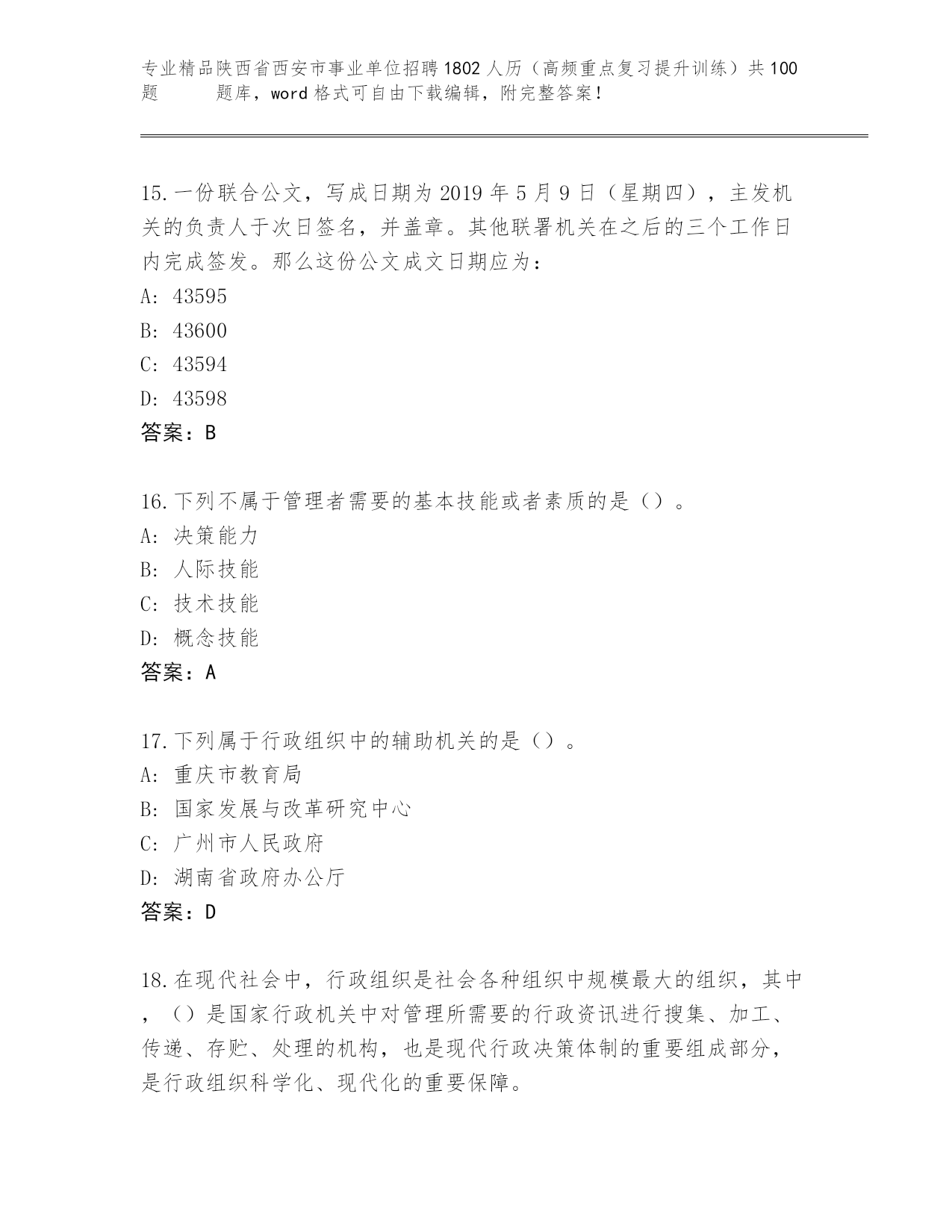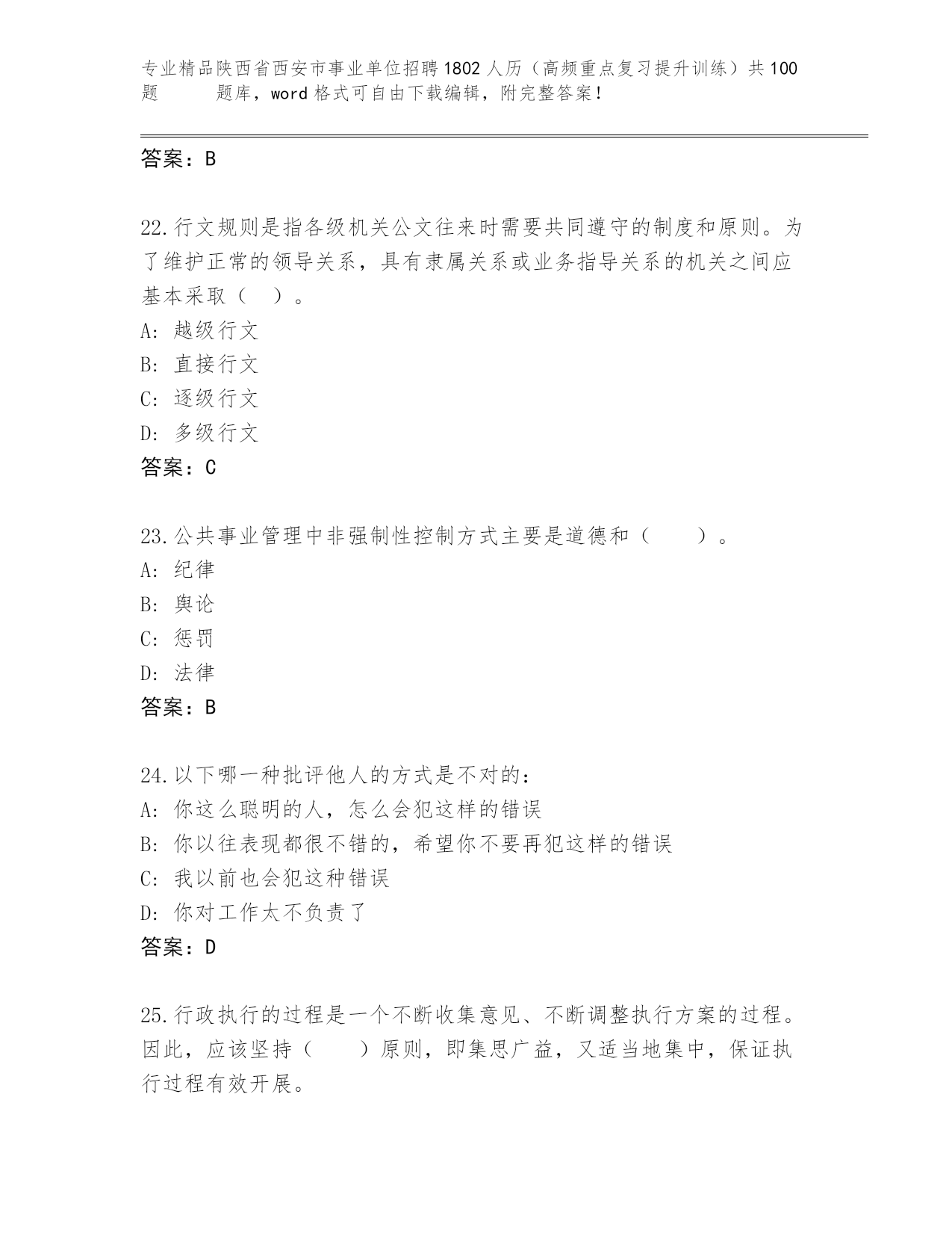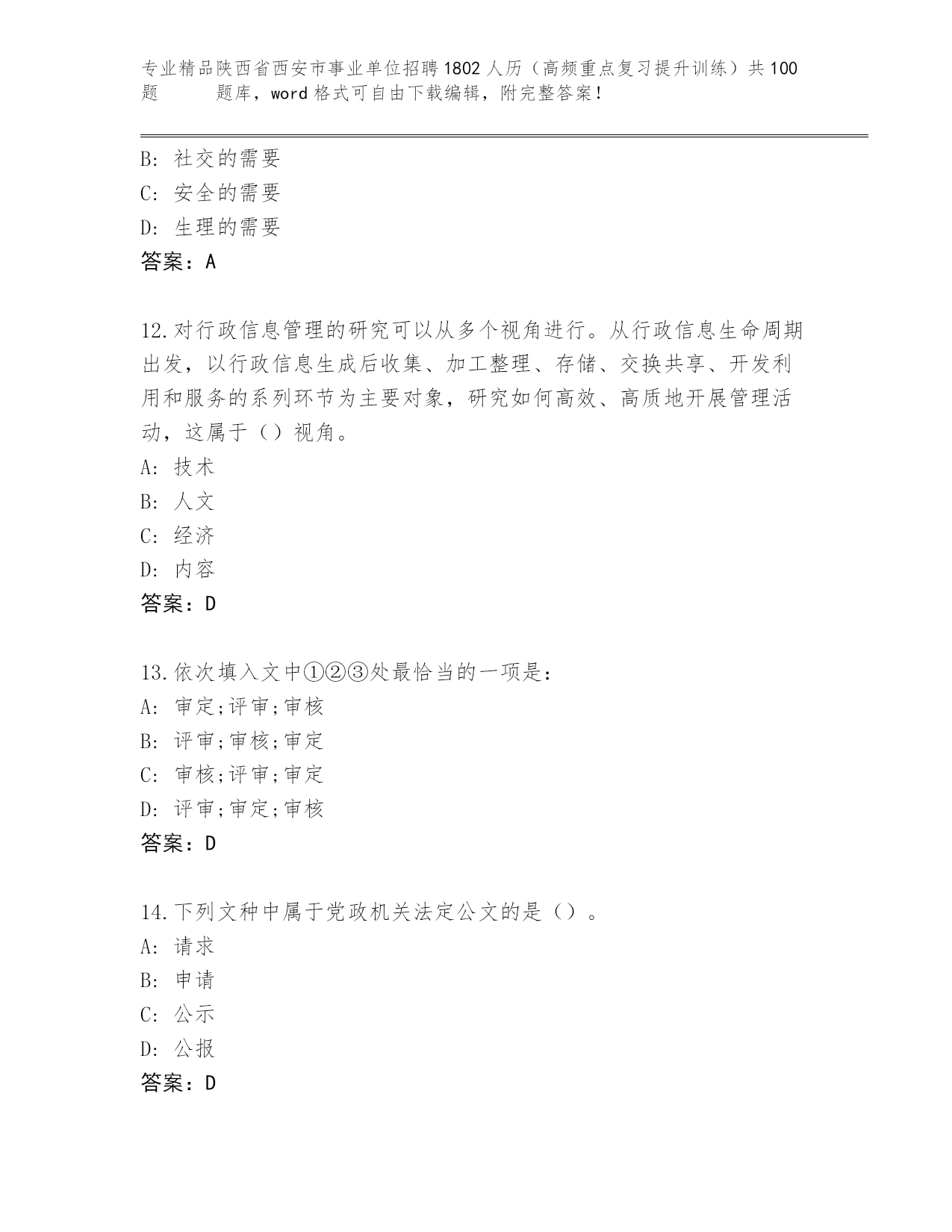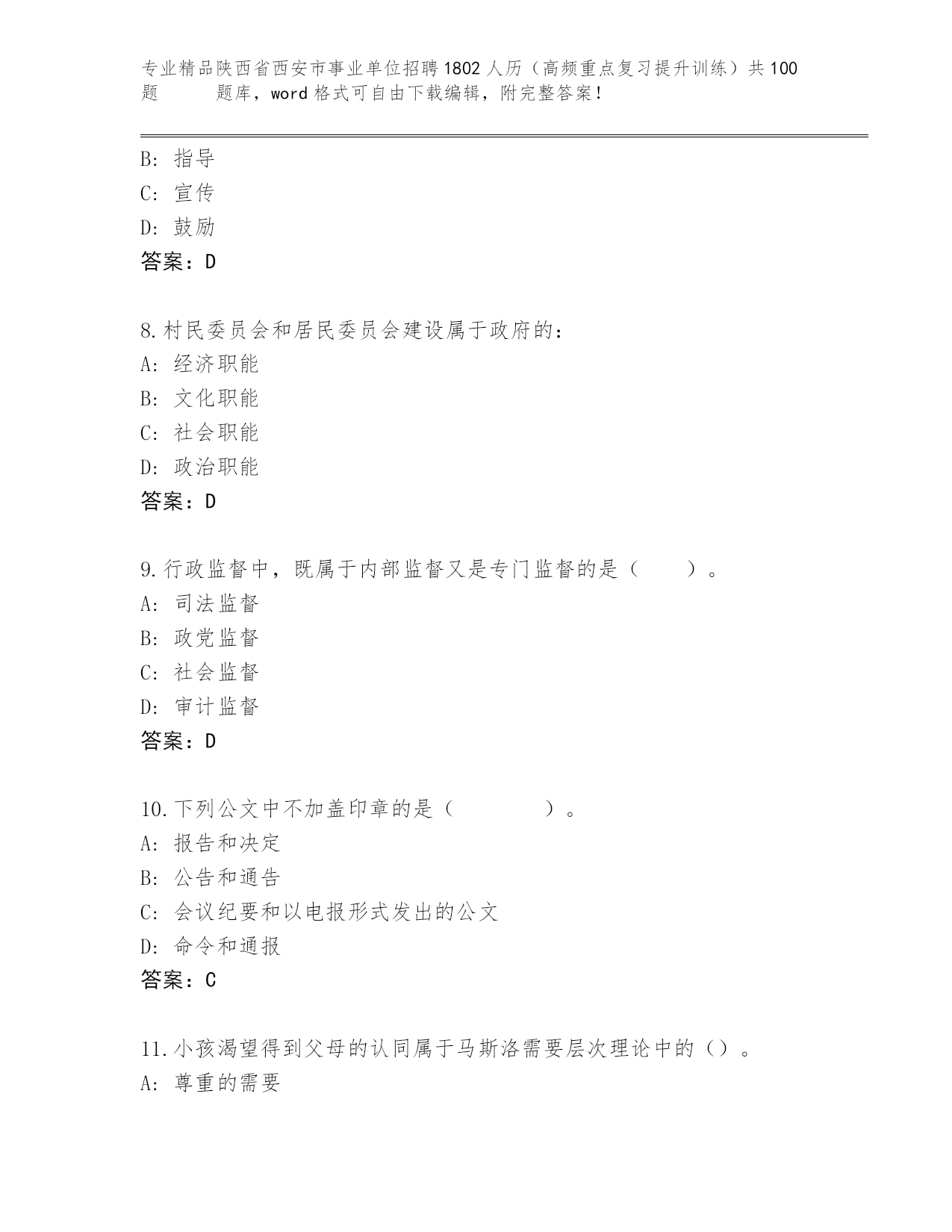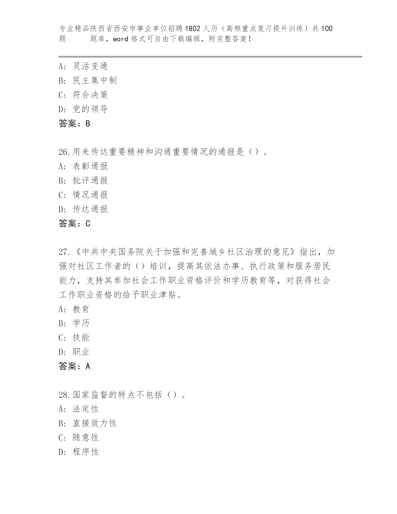 内部培训陕西省西安市事业单位招聘1802人历(高频重点复习提升训练)共100题 真题附答案(培优B卷)
