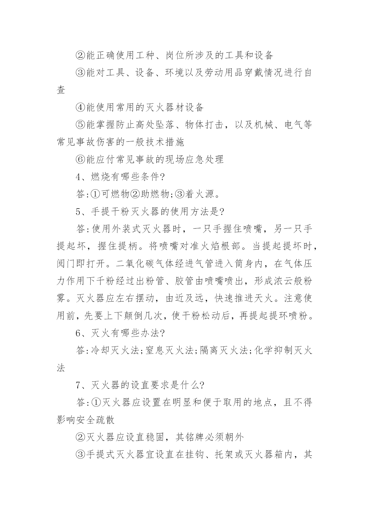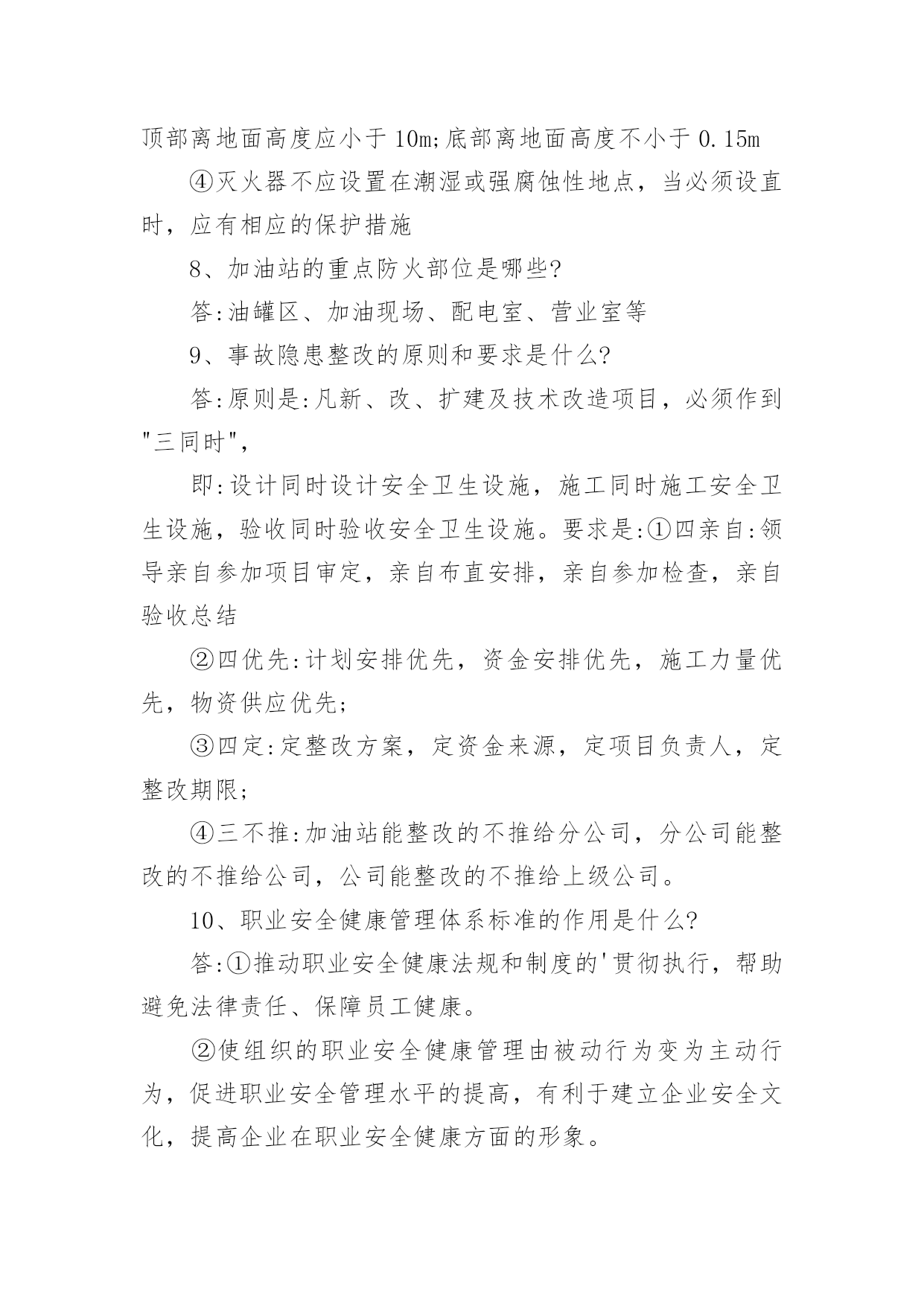 加油站安全防范知识竞赛试题附答案加油站安全防范知识竞赛试题(附答案)引导语:加油站是指为汽车和其它机动车辆服务的、零售汽油和机油的补充站,一般为添加燃料油、润滑油等。以下是小编整理的加油站安全防范知识竞赛试题(附答案),欢迎参考!1、油罐车进站后卸油员卸油前应该怎么做?答:立即检查油罐车安全设施是否齐全有效,引导罐车至计量场地,连接静电接地线,按规定备好消防器材,将罐车静直15分钟经计量后准备接卸。2、在"顾客进站加油须知"中都包括哪些?答:①站内严禁烟火②严禁顾客在站内检修车辆、敲击铁器等易产生火花的作业③严禁向汽车汽化器及塑料桶内加注易燃油品④加油车辆的司机、乘坐人员进站后不得影响加油站安全⑤所有机动车辆均熄火加油⑥拖拉机、摩托车推离危险区域后发动⑦严禁在作业现场穿、脱、拍打化纤服装⑧不准在加油站现场打手提电话3、施工现场上岗作业人员有哪些安全要求?答:①能掌握本工种安全技术操作规程②能正确使用工种、岗位所涉及的工具和设备③能对工具、设备、环境以及劳动用品穿戴情况进行自查④能使用常用的灭火器材设备⑤能掌握防止高处坠落、物体打击,以及机械、电气等常见事故伤害的一般技术措施⑥能应付常见事故的现场应急处理4、燃烧有哪些条件?答:①可燃物②助燃物;③着火源。5、手提干粉灭火器的使用方法是?答:使用外装式灭火器时,一只手握住喷嘴,另一只手提起坏,握住提柄。将喷嘴对准火焰根部。当提起提坏时,阅门即打开。二氧化碳气体经进气管进入筒身内,在气体压力作用下千粉经过出粉管、胶管由喷嘴喷出,形成浓云般粉雾。灭火器应左右摆动,由近及远,快速推进天火。注意使用前,先要上下颠倒几次,使干粉松动后,再提起提环喷粉。6、灭火有哪些办法?答:冷却灭火法;窒息灭火法;隔离灭火法;化学抑制灭火法7、灭火器的设直要求是什么?答:①灭火器应设置在明显和便于取用的地点,且不得影响安全疏散②灭火器应设直稳固,其铭牌必须朝外③手提式灭火器宜设直在挂钩、托架或灭火器箱内,其顶部离地面高度应小于10m;底部离地面高度不小于0.15m④灭火器不应设置在潮湿或强腐蚀性地点,当必须设直时,应有相应的保护措施8、加油站的重点防火部位是哪些?答:油罐区、加油现场、配电室、营业室等9、事故隐患整改的原则和要求是什么?答:原则是:凡新、改、扩建及技术改造项目,必须作到"三同时",即:设计同时设计安全卫生设施,施工同时施工安全卫生设施,验收同时验收安全卫生设施。要求是:①四亲自:领导亲自参加项目审定,亲自布直安排,亲自参加检查,亲自验收总结②四优先:计划安排优先,资金安排优先,施工力量优先,物资供应优先;③四定:定整改方案,定资金来源,定项目负责人,定整改期限;④三不推:加油站能整改的不推给分公司,分公司能整改的不推给公司,公司能整改的不推给上级公司。10、职业安全健康管理体系标准的作用是什么?答:①推动职业安全健康法规和制度的'贯彻执行,帮助避免法律责任、保障员工健康。②使组织的职业安全健康管理由被动行为变为主动行为,促进职业安全管理水平的提高,有利于建立企业安全文化,提高企业在职业安全健康方面的形象。③促进我国职业安全健康管理标准与国际接轨,有利于消除贸易壁垒,增强企业的市场竞争力,减轻外来的职业安全健康压力,减少赔偿成本,避免意外的财务负担。④有利于提高全民的安全意识。