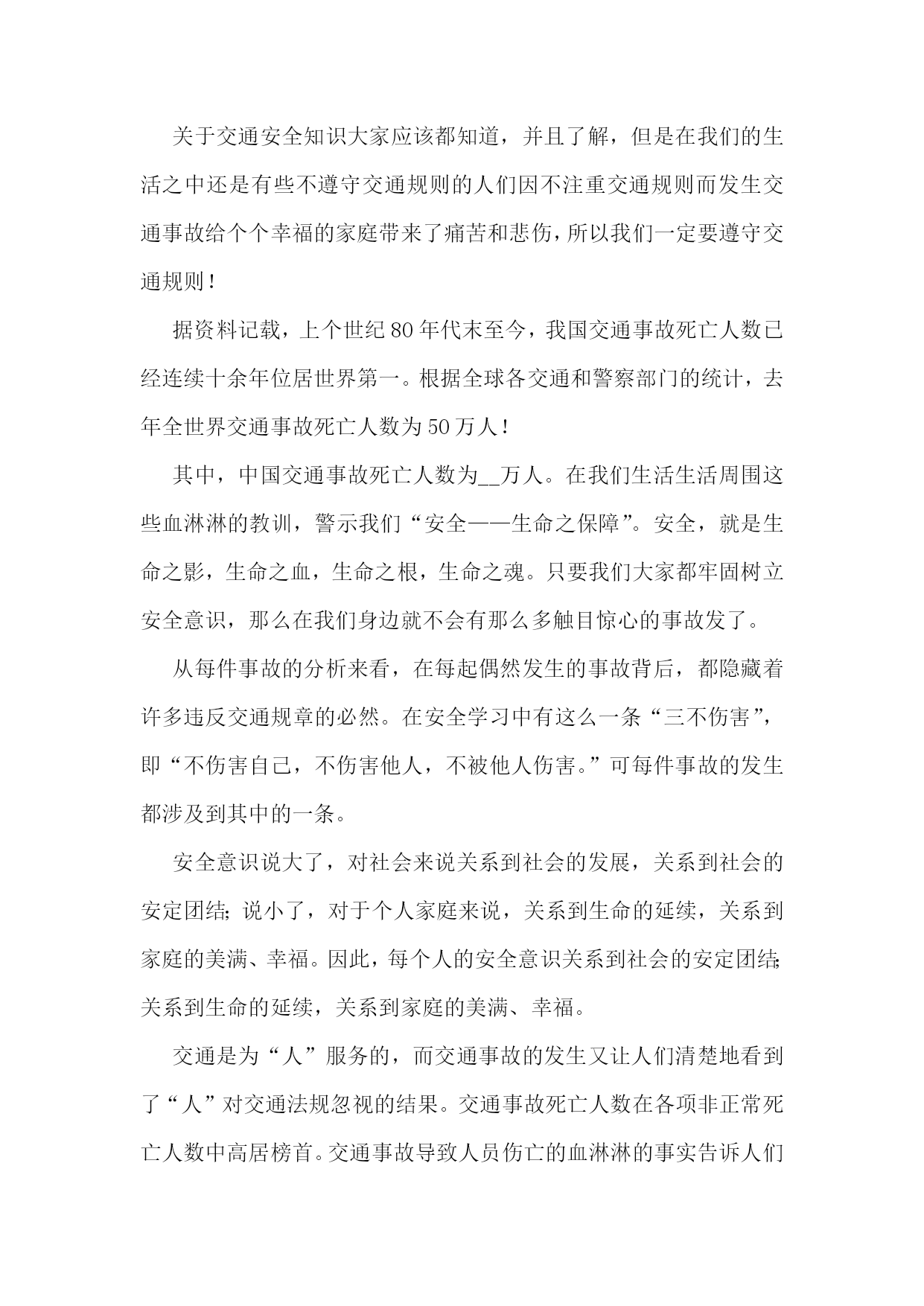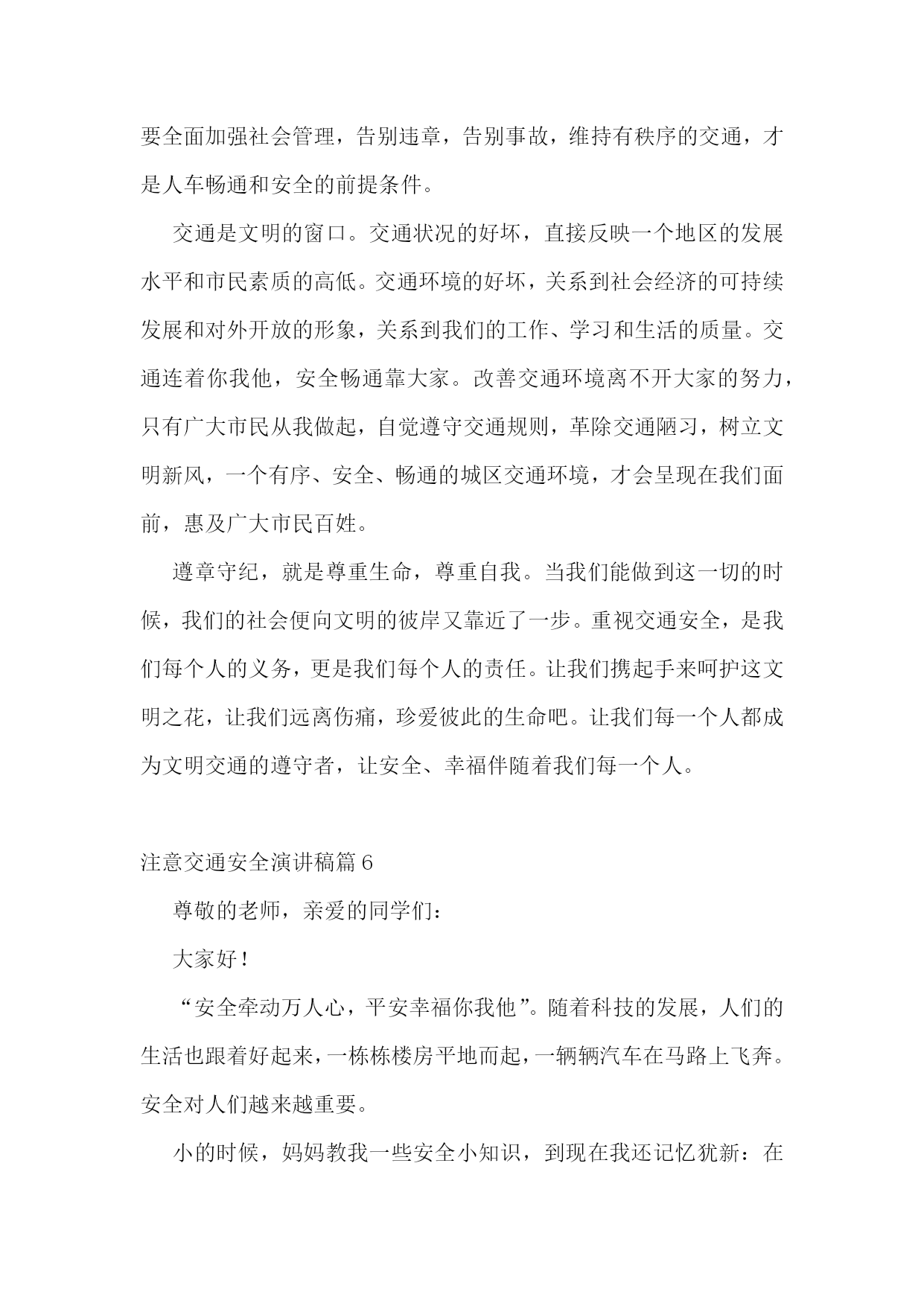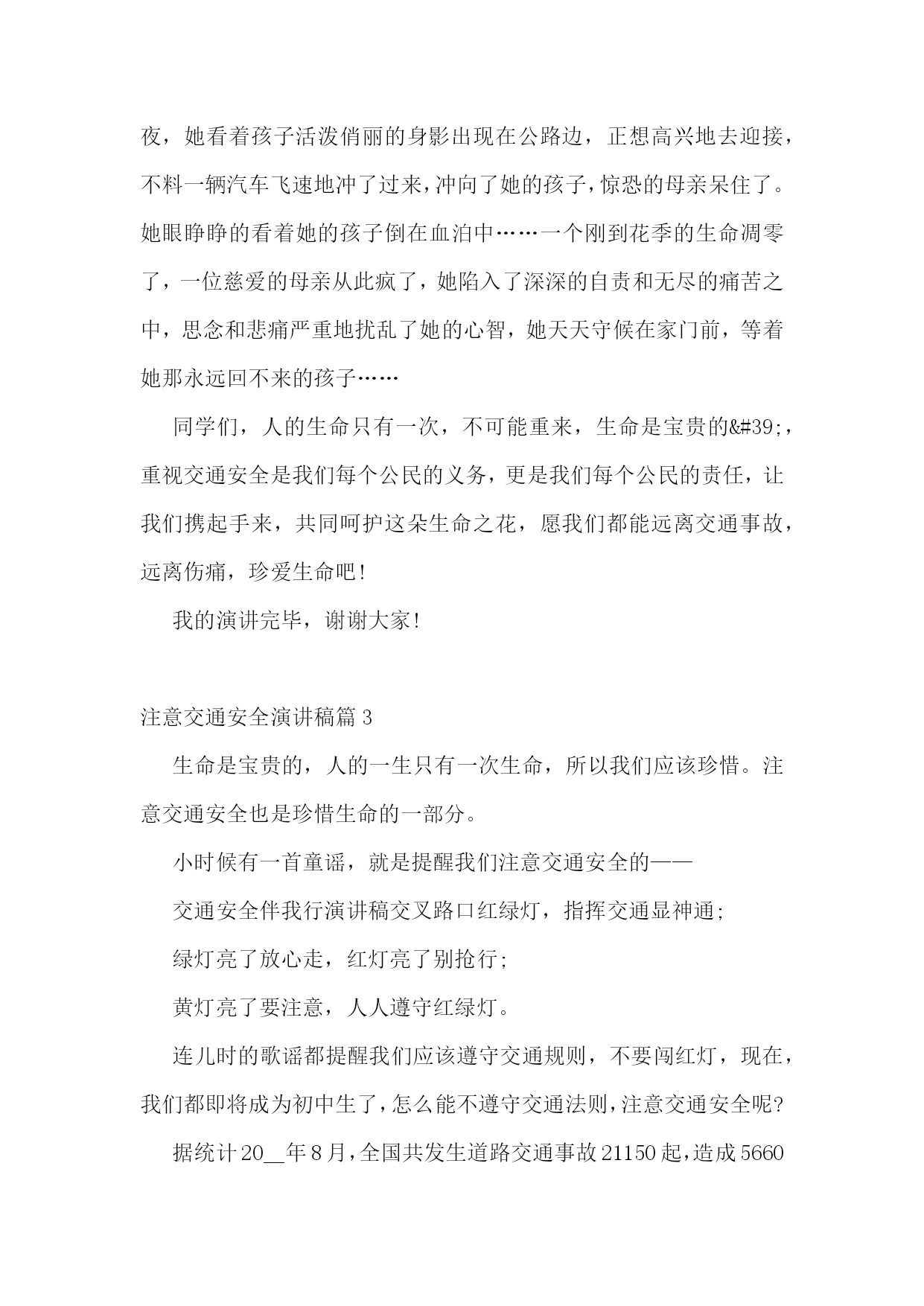 注意交通安全演讲稿注意交通安全演讲稿篇1亲爱的同学们:当我们背起书包,肩负着家人的希望,怀揣着对未来的美好蓝图,来到美丽的校园时,当我们漫步于人来人往的宽阔街道时,常会慨叹美丽的家乡发展的迅速。但你是否注意到隐藏在交通线上的危险呢?随着自行车、机动车等各种交通工具的增多,校园内的交通事故隐患也在增加,不遵守交通规则等同于不珍爱自己的生命。我们拥有年轻的身躯、美好的理想,却往往会忽略交通安全这种“小事”;我们谈理想、谈报国,却常常忽视“珍爱生命”这一底线。遵守交通规则不仅仅是我们所有人的义务,更是我们不可推卸的责任。为了远离血腥和悲痛,远离伤痕和担忧,我们发出如下倡议:一、杜绝不良骑车行为。不逆向行车,转弯时提前减速,看清四周情况,不校内骑车、不抢行猛拐;不多人并骑,不互相攀扶,不互相追逐、打闹;不骑车带人、并排骑车等。为了我们自己和他人的安全,我们要从自身做起,培养良好、文明的骑车习惯,为校园交通创造安全舒适的环境。二、注意校园驾车安全。校园内已有部分同学以电动车、作为出行工具,我们倡议同学们行车时一定要严格遵守交通法规,礼让为先,慢行为上,保障校园出行的祥和氛围,注意控制驾车速度,也不随意停车,给自行车和行人的出行缔造一个安全方便的环境。三、积极反映现存问题。校园内的安全隐患关乎我们每个人的切身安危,平日在校园出行,我们要结合自身体会,积极提出校园安全问题的改进建议。为交大校园的交通安全尽一份心,为我们自己营造一个安全惬意的校园环境出一份力。注意交通安全演讲稿篇2尊敬的老师,亲爱的同学们:大家好!我今天演讲的题目是“交通安全伴我行”。有这样一则笑话,不知道大家有没有听过:一个年轻人在英国结交了一位女朋友,但是他们没有多久就分手了,原因是这位年轻人过马路时闯了红灯,英国姑娘吃惊的说:“连红灯都敢闯,还有什么违法的事不敢做。”这位年轻人回国后,又结交了一位中国姑娘,结果小伙子却因过马路没有闯红灯,而和中国姑娘分手。中国姑娘评价小伙子说:“连红灯都不敢闯,还有什么出息?”当然,这仅仅是个笑话,但它说明了一个问题:中国人在遵守交通规则方面的意识淡薄。下面我想问大家一个问题,健康的身体、聪明的大脑和汽车哪一个更贵重。我想大家一定会毫不犹豫地说,当然是健康的身体和聪明的大脑。这个小孩子都知道,但是我想问的是,为什么总有人无视交通法规的存在,依然我行我素,在马路上横冲直撞呢?试想一下,那沉重的黑橡胶车轮,在你的皮肤上碾过,在你健康的身体上碾过,再聪明的大脑有什么用呢?爸爸妈妈就曾经告诉过我这样一个真实的故事:有一位母亲,天天在晚上九点都在她家门前等候她中学晚自习归来的孩子。有一天雨夜,她看着孩子活泼俏丽的身影出现在公路边,正想高兴地去迎接,不料一辆汽车飞速地冲了过来,冲向了她的孩子,惊恐的母亲呆住了。她眼睁睁的看着她的孩子倒在血泊中……一个刚到花季的生命凋零了,一位慈爱的母亲从此疯了,她陷入了深深的自责和无尽的痛苦之中,思念和悲痛严重地扰乱了她的心智,她天天守候在家门前,等着她那永远回不来的孩子……同学们,人的生命只有一次,不可能重来,生命是宝贵的',重视交通安全是我们每个公民的义务,更是我们每个公民的责任,让我们携起手来,共同呵护这朵生命之花,愿我们都能远离交通事故,远离伤痛,珍爱生命吧!我的演讲完毕,谢谢大家!注意交通安全演讲稿篇3生命是宝贵的,人的一生只有一次生命,所以我们应该珍惜。注意交通安全也是珍惜生命的一部分。小时候有一首童谣,就是提醒我们注意交通安全的——交通安全伴我行演讲稿交叉路口红绿灯,指挥交通显神通;绿灯亮了放心走,红灯亮了别抢行;黄灯亮了要注意,人人遵守红绿灯。连儿时的歌谣都提醒我们应该遵守交通规则,不要闯红灯,现在,我们都即将成为初中生了,怎么能不遵守交通法则,注意交通安全呢?据统计20__年8月,全国共发生道路交通事故21150起,造成5660人死亡,25418人受伤,直接损失财产0。83亿元。由此可见,违反交通规则而造成的交通事故,对国家有着很大的损失。去年10月3日,我们小区的黄阿姨亲生经历了一次酒后驾车的重大交通事故。那天,正是十一黄金周的第三天,黄阿姨去参加同学聚会,到东关品尝哪儿有名的鹅汤。再回来的路上,由于驾驶员醉酒驾车,导致黄阿姨乘坐的那辆轿车与停在路边的大型卡车相撞,造成了“四死一伤”的惨剧,而黄阿姨就是这五人中幸存的一个。当时,黄阿姨的身子是倾斜着的,否则,是不会免遭于这场灾难的。在这场车祸中,一个小女孩失去了母亲。在这场车祸的前不久,她的爸爸远远的离开了她,去了另一个世界。现在,连妈妈也随爸爸远去了。我想,这个小女孩一定会痛不欲生,她幼小的心灵一定承受不了这么沉重的打击。真可怜!现在,全国上下都在谈论发生在南京的一次醉酒驾车造成的事故。根据新闻报道,司机属于重醉驾车,处死刑。就因为那