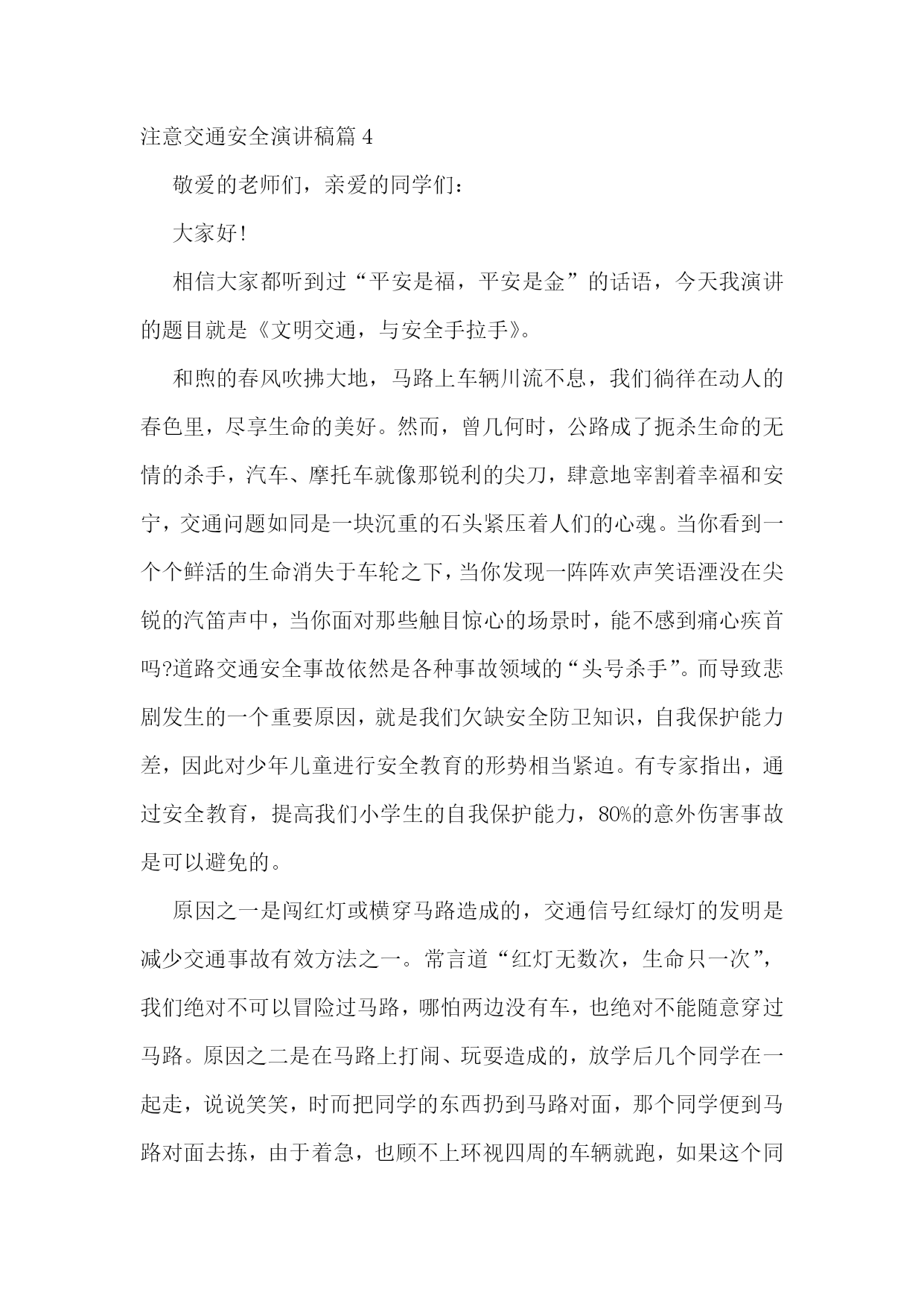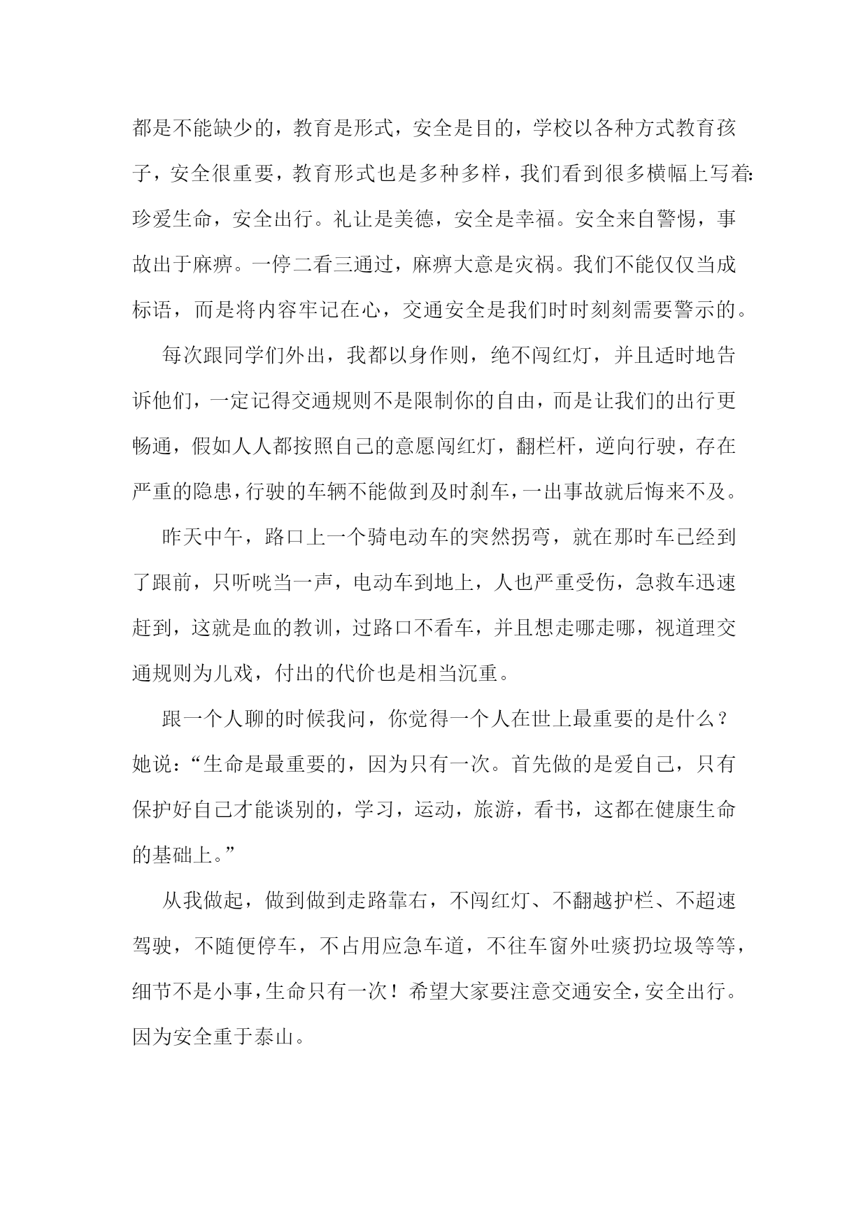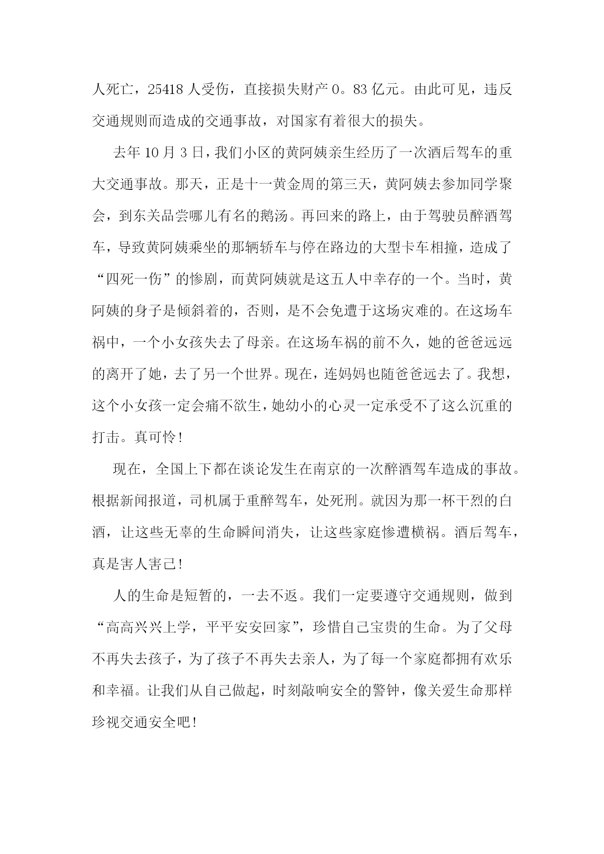 注意交通安全演讲稿注意交通安全演讲稿篇1亲爱的同学们:当我们背起书包,肩负着家人的希望,怀揣着对未来的美好蓝图,来到美丽的校园时,当我们漫步于人来人往的宽阔街道时,常会慨叹美丽的家乡发展的迅速。但你是否注意到隐藏在交通线上的危险呢?随着自行车、机动车等各种交通工具的增多,校园内的交通事故隐患也在增加,不遵守交通规则等同于不珍爱自己的生命。我们拥有年轻的身躯、美好的理想,却往往会忽略交通安全这种“小事”;我们谈理想、谈报国,却常常忽视“珍爱生命”这一底线。遵守交通规则不仅仅是我们所有人的义务,更是我们不可推卸的责任。为了远离血腥和悲痛,远离伤痕和担忧,我们发出如下倡议:一、杜绝不良骑车行为。不逆向行车,转弯时提前减速,看清四周情况,不校内骑车、不抢行猛拐;不多人并骑,不互相攀扶,不互相追逐、打闹;不骑车带人、并排骑车等。为了我们自己和他人的安全,我们要从自身做起,培养良好、文明的骑车习惯,为校园交通创造安全舒适的环境。二、注意校园驾车安全。校园内已有部分同学以电动车、作为出行工具,我们倡议同学们行车时一定要严格遵守交通法规,礼让为先,慢行为上,保障校园出行的祥和氛围,注意控制驾车速度,也不随意停车,给自行车和行人的出行缔造一个安全方便的环境。三、积极反映现存问题。校园内的安全隐患关乎我们每个人的切身安危,平日在校园出行,我们要结合自身体会,积极提出校园安全问题的改进建议。为交大校园的交通安全尽一份心,为我们自己营造一个安全惬意的校园环境出一份力。注意交通安全演讲稿篇2尊敬的老师,亲爱的同学们:大家好!我今天演讲的题目是“交通安全伴我行”。有这样一则笑话,不知道大家有没有听过:一个年轻人在英国结交了一位女朋友,但是他们没有多久就分手了,原因是这位年轻人过马路时闯了红灯,英国姑娘吃惊的说:“连红灯都敢闯,还有什么违法的事不敢做。”这位年轻人回国后,又结交了一位中国姑娘,结果小伙子却因过马路没有闯红灯,而和中国姑娘分手。中国姑娘评价小伙子说:“连红灯都不敢闯,还有什么出息?”当然,这仅仅是个笑话,但它说明了一个问题:中国人在遵守交通规则方面的意识淡薄。下面我想问大家一个问题,健康的身体、聪明的大脑和汽车哪一个更贵重。我想大家一定会毫不犹豫地说,当然是健康的身体和聪明的大脑。这个小孩子都知道,但是我想问的是,为什么总有人无视交通法规的存在,依然我行我素,在马路上横冲直撞呢?试想一下,那沉重的黑橡胶车轮,在你的皮肤上碾过,在你健康的身体上碾过,再聪明的大脑有什么用呢?爸爸妈妈就曾经告诉过我这样一个真实的故事:有一位母亲,天天在晚上九点都在她家门前等候她中学晚自习归来的孩子。有一天雨夜,她看着孩子活泼俏丽的身影出现在公路边,正想高兴地去迎接,不料一辆汽车飞速地冲了过来,冲向了她的孩子,惊恐的母亲呆住了。她眼睁睁的看着她的孩子倒在血泊中……一个刚到花季的生命凋零了,一位慈爱的母亲从此疯了,她陷入了深深的自责和无尽的痛苦之中,思念和悲痛严重地扰乱了她的心智,她天天守候在家门前,等着她那永远回不来的孩子……同学们,人的生命只有一次,不可能重来,生命是宝贵的',重视交通安全是我们每个公民的义务,更是我们每个公民的责任,让我们携起手来,共同呵护这朵生命之花,愿我们都能远离交通事故,远离伤痛,珍爱生命吧!我的演讲完毕,谢谢大家!注意交通安全演讲稿篇3生命是宝贵的,人的一生只有一次生命,所以我们应该珍惜。注意交通安全也是珍惜生命的一部分。小时候有一首童谣,就是提醒我们注意交通安全的——交通安全伴我行演讲稿交叉路口红绿灯,指挥交通显神通;绿灯亮了放心走,红灯亮了别抢行;黄灯亮了要注意,人人遵守红绿灯。连儿时的歌谣都提醒我们应该遵守交通规则,不要闯红灯,现在,我们都即将成为初中生了,怎么能不遵守交通法则,注意交通安全呢?据统计20__年8月,全国共发生道路交通事故21150起,造成5660人死亡,25418人受伤,直接损失财产0。83亿元。由此可见,违反交通规则而造成的交通事故,对国家有着很大的损失。去年10月3日,我们小区的黄阿姨亲生经历了一次酒后驾车的重大交通事故。那天,正是十一黄金周的第三天,黄阿姨去参加同学聚会,到东关品尝哪儿有名的鹅汤。再回来的路上,由于驾驶员醉酒驾车,导致黄阿姨乘坐的那辆轿车与停在路边的大型卡车相撞,造成了“四死一伤”的惨剧,而黄阿姨就是这五人中幸存的一个。当时,黄阿姨的身子是倾斜着的,否则,是不会免遭于这场灾难的。在这场车祸中,一个小女孩失去了母亲。在这场车祸的前不久,她的爸爸远远的离开了她,去了另一个世界。现在,连妈妈也随爸爸远去了。我想,这个小女孩一定会痛不欲生,她幼小的心灵一定承受不了这么沉重的打击。真可怜!现在,全国上下都在谈论发生在南京的一次醉酒驾车造成的事故。根据新闻报道,司机属于重醉驾车,处死刑。就因为那