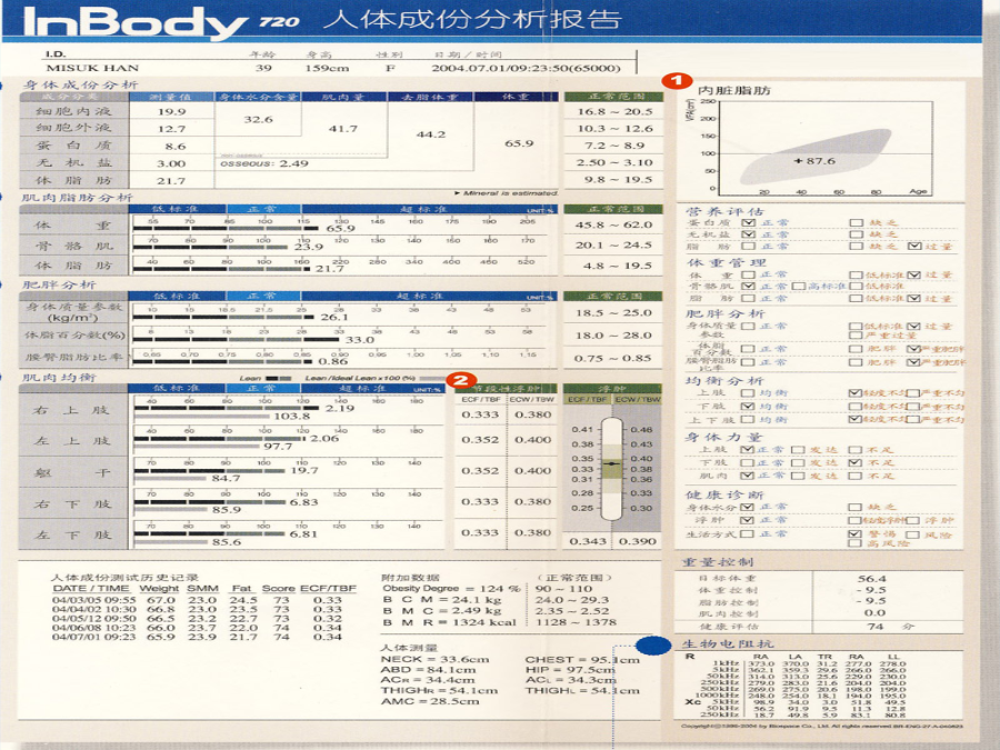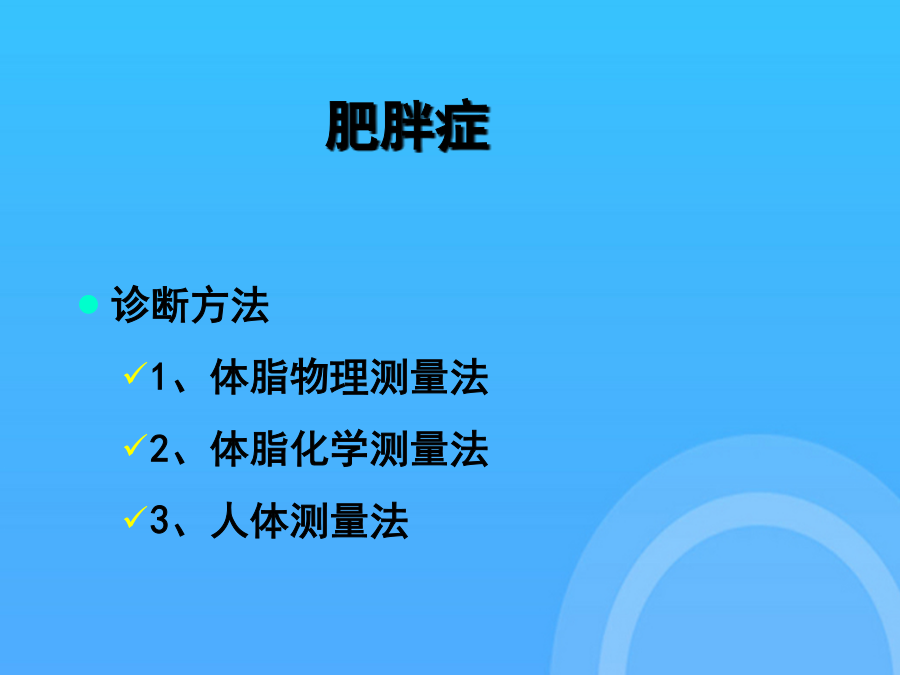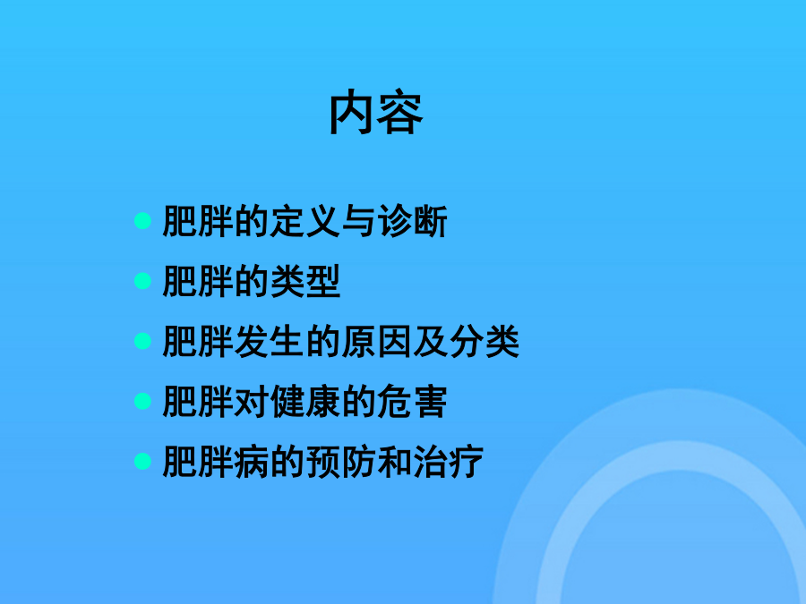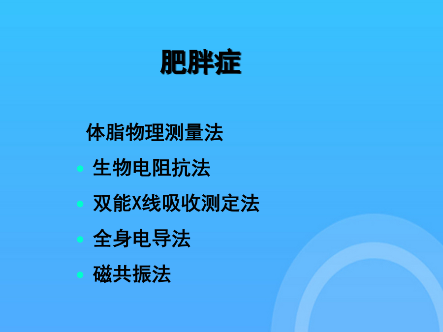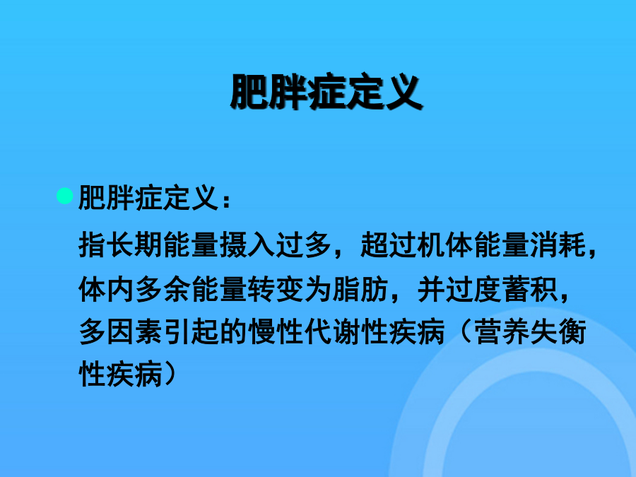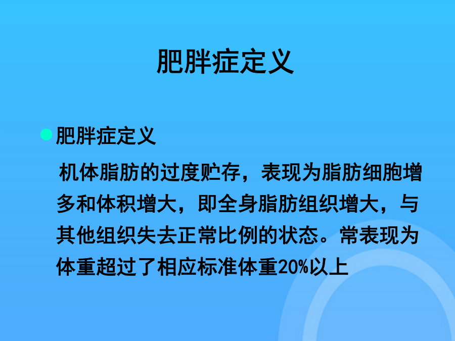 公共营养师辅导肥胖症与营养肥胖的定义与诊断肥胖的类型肥胖发生的原因及分类肥胖对健康的危害肥胖病的预防和治疗肥胖症定义:指长期能量摄入过多,超过机体能量消耗,体内多余能量转变为脂肪,并过度蓄积,多因素引起的慢性代谢性疾病(营养失衡性疾病)肥胖症定义机体脂肪的过度贮存,表现为脂肪细胞增多和体积增大,即全身脂肪组织增大,与其他组织失去正常比例的状态。常表现为体重超过了相应标准体重20%以上诊断方法1、体脂物理测量法2、体脂化学测量法3、人体测量法体脂物理测量法生物电阻抗法双能X线吸收测定法全身电导法磁共振法人体成分分析仪儿童成分分析仪体脂化学测量法稀释法同位素钾计数尿肌苷测定等标准体重指数法标准体重(kg)=身高(cm)-105肥胖度(%)=(实际体重-标准体重)/标准体重×100%判断标准:≥10%为超重;20-29%为轻度肥胖;30-49%中度肥胖;≥50%为重度肥胖标准体重指数法判断体重体质指数法体质指数(BMI)是目前应用较普遍的指标体质指数=体重(kg)/身高(m)的平方判断标准:中国成人判断超重和肥胖的界限值为:BMI:18.5~23.9为正常BMI:≥24为超重BMI:>28为肥胖中国成人体质指数评价表腰围和臀围法:作为上身性肥胖的标准肋骨下缘与髂前上脊连线中点,绕腰腹部一周中国针对腰围提出的标准腹型肥胖男性≥85cm、女性≥80cmWHO建议标准:男性≥94cm、女性≥88cm腰臀比男性≥0.9女性≥0.8肥胖的类型苹果型肥胖鸭梨型肥胖公共营养师辅导肥胖症与营养腹部肥胖,俗称“将军肚”,多见于男性。1、西布曲明(商品名:曲美、澳曲轻)瘦素一方面作用于下丘脑的摄食中枢,产生饱食感而抑制摄食行为;机体脂肪的过度贮存,表现为脂肪细胞增多和体积增大,即全身脂肪组织增大,与其他组织失去正常比例的状态。30-49%中度肥胖;3、芬特明:允许用,应用少18岁及以上居民平均每日业余静态行为时间为2.肥胖症营养治疗热量消耗(kcal/kg.肥胖防治机体脂肪的过度贮存,表现为脂肪细胞增多和体积增大,即全身脂肪组织增大,与其他组织失去正常比例的状态。选择富含膳食纤维丰富的主食瘦素一方面作用于下丘脑的摄食中枢,产生饱食感而抑制摄食行为;内分泌有关的癌症(例如妇女绝经后的乳腺癌、子宫内膜癌、卵巢癌、宫颈癌,男性的前列腺癌)2、奥利司他(商品名:赛尼可)内分泌有关的癌症(例如妇女绝经后的乳腺癌、子宫内膜癌、卵巢癌、宫颈癌,男性的前列腺癌)作用于肠道,抑制胰脂肪酶活性,减少脂肪吸收,使部分(30%)脂肪随粪便排出,副作用小,大便稀软,脂性腹泻,影响脂溶性维生素的吸收鸭梨型肥胖苹果型肥胖:腹部肥胖,俗称“将军肚”,多见于男性。脂肪主要在腹壁和腹腔内蓄积过多,被称为“中心型”或“向心性”、“上身性”肥胖,则对代谢影响很大。中心性肥胖是多种慢性病的最重要危险因素之一鸭梨型肥胖:肚子不大,臀部和大腿粗,脂肪在外周,所以叫“外周型”肥胖、“下身性”肥胖,多见于女性,患心血管疾病、糖尿病的风险小于苹果型肥胖肥胖发生原因及分类遗传因素双亲均为肥胖者,子女中有70%-80%的人表现为肥胖,双亲之一(特别是母亲)为肥胖者,子女中有40%的人较胖。人群的种族、性别不同和年龄差别对致肥胖因子的易感性不同。研究表明遗传因素对肥胖形成的作用约占20%-40%瘦素又称脂肪抑制素,是肥胖基因所编码的蛋白质瘦素对机体能量代谢和肥胖的发生有重要作用。瘦素一方面作用于下丘脑的摄食中枢,产生饱食感而抑制摄食行为;另一方面瘦素广泛作用于肝脏、肾脏、脑组织、脂肪组织等的瘦素受体,使其活跃,增加能量消耗。在肥胖人中有95%以上的人存在内源性瘦素缺乏和瘦素抵抗。饮食因素体力活动神经精神因素摄入过多不良进食习惯咀嚼少、进食速度快,吃甜食频率过多以进食缓解心情压抑或情绪紧张边看电视边进食睡前进食:夜食综合症体力活动过少神经精神紧张遗传性肥胖:肥胖相关基因突变导致的肥胖,有家族倾向性。继发性肥胖:脑部肿瘤、外伤、炎症等后遗症,丘脑综合症候群等;脑垂体前叶功能减退、垂体瘤等;糖尿病前期,胰腺瘤等;肾上腺皮质增生或腺瘤使肾上腺皮质功能亢进,皮质醇分泌过分引起的“柯兴氏综合征”;甲状腺功能减退,并常伴有粘液性水肿;性腺功能减退等。单纯性肥胖:单纯由于营养过剩所造成的全身性脂肪过量积累。占肥胖的绝大多数。肥胖症流行2010年中国疾病预防控制中心在监测18岁及以上居民超重率30.6%,肥胖率12.0%18岁及以上居民经常锻炼(每周至少3次、每次至少10分钟业余锻炼)的比例11.9%18岁及以上居民从不锻炼的比例83.8%18岁及以上居民平均每日业余静态行为时间为2.