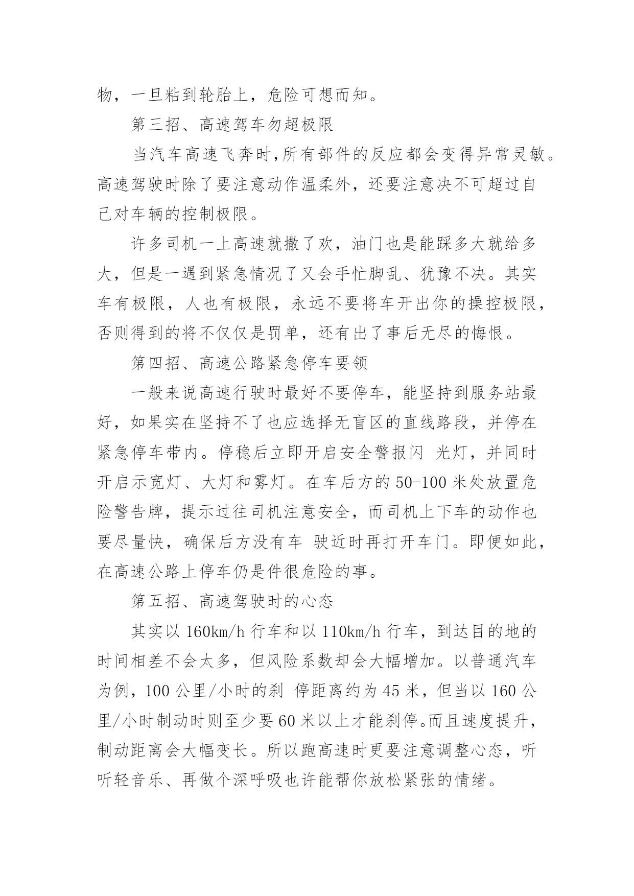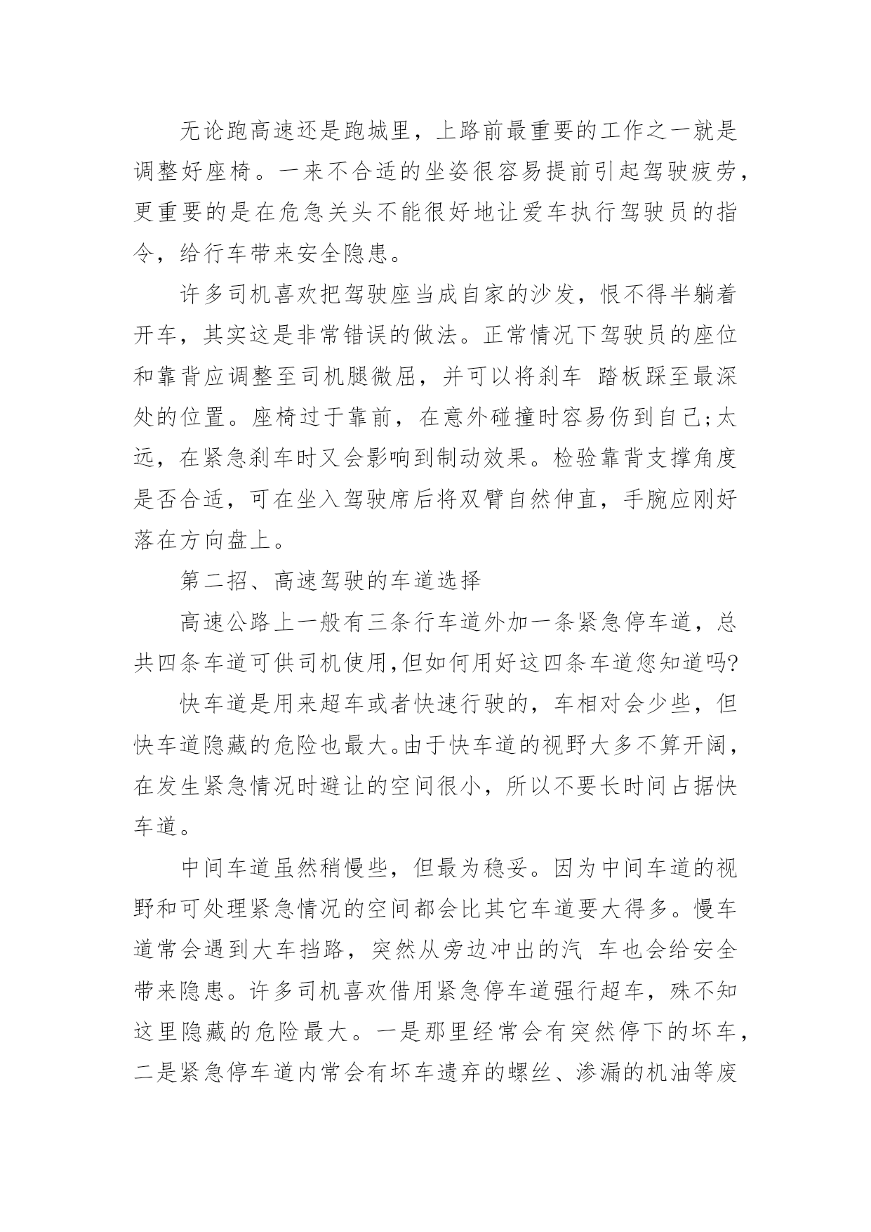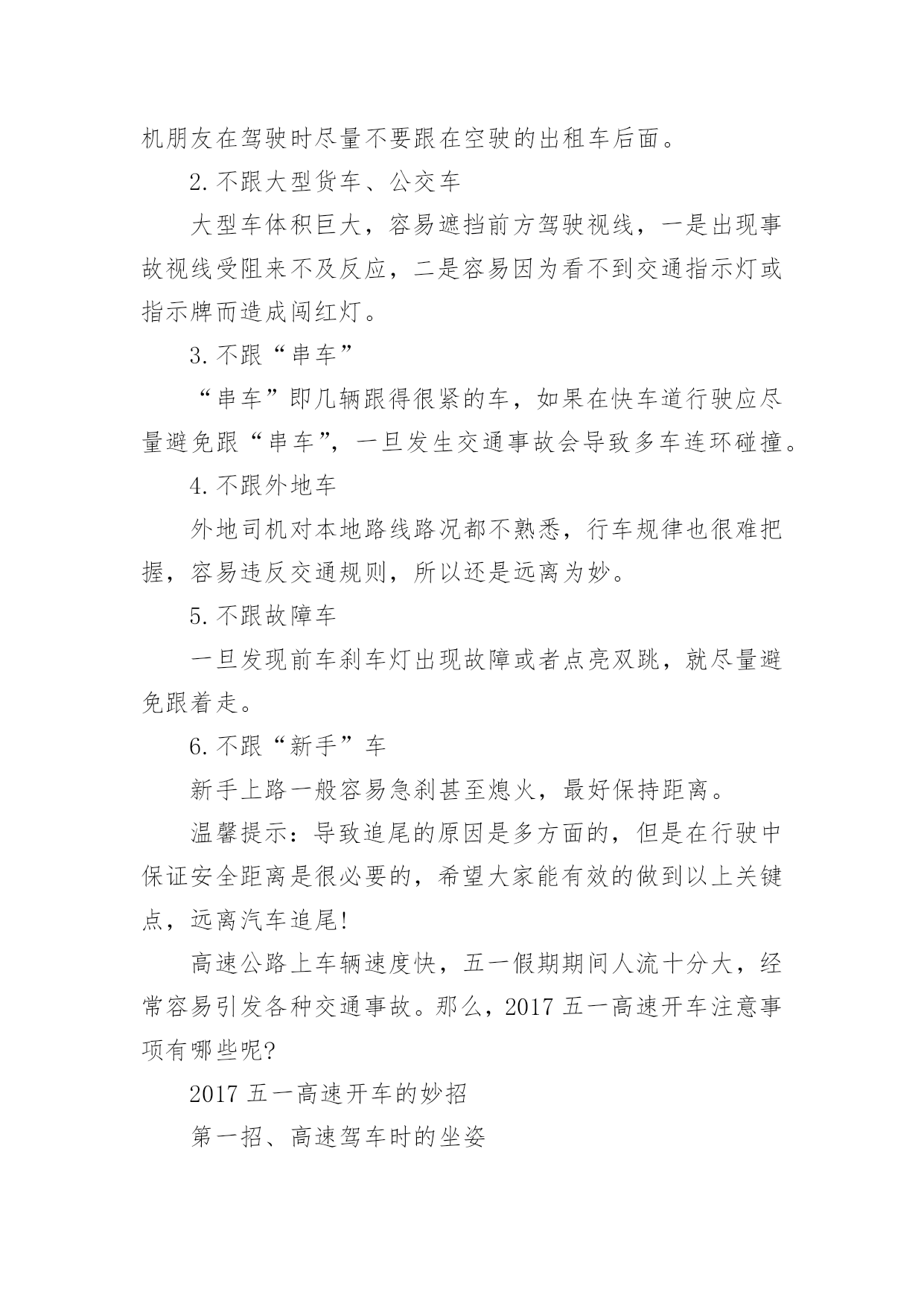 怎样防止汽车追尾怎样防止汽车追尾1.错开视线在车流中车不要整齐对准前车行进,错开一个合适距离,容易看到前一辆车的动态,从而提前做好应急准备。2.保持车距此为预防追尾的第一要领。在高速路上,行车时速超过100公里,应与前车保持100米以上的安全车距;平时城市道路上,开车应保持“三秒车距”,以前车经过某一标志物开始,数三秒。在三秒后你的车才到达该标志物,就在安全距离之内。如在三秒内就到达或经过该标志物,就说明安全距离不够。3.尽量用点刹遇到突发状况,尽量用点刹,在将车速控制下来的同时,也能有效提醒后车减速。4.不乱变道“成都暴打女司机”的新闻再次提醒大家,随意变道要不得,养成良好的驾车习惯,各行其道,才能有效减少危险。除了做到以上几点外,要有效预防车辆追尾、刮擦,还需做到“六不跟”,分别是:1.不跟空驶的出租车出租车的行驶规律是最让人琢磨不透的,只要见到路边有乘客就会迅速变道刹车,让后车司机防不胜防,因此,司机朋友在驾驶时尽量不要跟在空驶的出租车后面。2.不跟大型货车、公交车大型车体积巨大,容易遮挡前方驾驶视线,一是出现事故视线受阻来不及反应,二是容易因为看不到交通指示灯或指示牌而造成闯红灯。3.不跟“串车”“串车”即几辆跟得很紧的车,如果在快车道行驶应尽量避免跟“串车”,一旦发生交通事故会导致多车连环碰撞。4.不跟外地车外地司机对本地路线路况都不熟悉,行车规律也很难把握,容易违反交通规则,所以还是远离为妙。5.不跟故障车一旦发现前车刹车灯出现故障或者点亮双跳,就尽量避免跟着走。6.不跟“新手”车新手上路一般容易急刹甚至熄火,最好保持距离。温馨提示:导致追尾的原因是多方面的,但是在行驶中保证安全距离是很必要的,希望大家能有效的做到以上关键点,远离汽车追尾!高速公路上车辆速度快,五一假期期间人流十分大,经常容易引发各种交通事故。那么,2017五一高速开车注意事项有哪些呢?2017五一高速开车的妙招第一招、高速驾车时的坐姿无论跑高速还是跑城里,上路前最重要的工作之一就是调整好座椅。一来不合适的坐姿很容易提前引起驾驶疲劳,更重要的是在危急关头不能很好地让爱车执行驾驶员的指令,给行车带来安全隐患。许多司机喜欢把驾驶座当成自家的沙发,恨不得半躺着开车,其实这是非常错误的做法。正常情况下驾驶员的座位和靠背应调整至司机腿微屈,并可以将刹车踏板踩至最深处的位置。座椅过于靠前,在意外碰撞时容易伤到自己;太远,在紧急刹车时又会影响到制动效果。检验靠背支撑角度是否合适,可在坐入驾驶席后将双臂自然伸直,手腕应刚好落在方向盘上。第二招、高速驾驶的车道选择高速公路上一般有三条行车道外加一条紧急停车道,总共四条车道可供司机使用,但如何用好这四条车道您知道吗?快车道是用来超车或者快速行驶的,车相对会少些,但快车道隐藏的危险也最大。由于快车道的视野大多不算开阔,在发生紧急情况时避让的空间很小,所以不要长时间占据快车道。中间车道虽然稍慢些,但最为稳妥。因为中间车道的视野和可处理紧急情况的空间都会比其它车道要大得多。慢车道常会遇到大车挡路,突然从旁边冲出的汽车也会给安全带来隐患。许多司机喜欢借用紧急停车道强行超车,殊不知这里隐藏的危险最大。一是那里经常会有突然停下的坏车,二是紧急停车道内常会有坏车遗弃的螺丝、渗漏的机油等废物,一旦粘到轮胎上,危险可想而知。第三招、高速驾车勿超极限当汽车高速飞奔时,所有部件的反应都会变得异常灵敏。高速驾驶时除了要注意动作温柔外,还要注意决不可超过自己对车辆的控制极限。许多司机一上高速就撒了欢,油门也是能踩多大就给多大,但是一遇到紧急情况了又会手忙脚乱、犹豫不决。其实车有极限,人也有极限,永远不要将车开出你的操控极限,否则得到的将不仅仅是罚单,还有出了事后无尽的悔恨。第四招、高速公路紧急停车要领一般来说高速行驶时最好不要停车,能坚持到服务站最好,如果实在坚持不了也应选择无盲区的直线路段,并停在紧急停车带内。停稳后立即开启安全警报闪光灯,并同时开启示宽灯、大灯和雾灯。在车后方的50-100米处放置危险警告牌,提示过往司机注意安全,而司机上下车的动作也要尽量快,确保后方没有车驶近时再打开车门。即便如此,在高速公路上停车仍是件很危险的事。第五招、高速驾驶时的心态其实以160km/h行车和以110km/h行车,到达目的地的时间相差不会太多,但风险系数却会大幅增加。以普通汽车为例,100公里/小时的刹停距离约为45米,但当以160公里/小时制动时则至少要60米以上才能刹停。而且速度提升,制动距离会大幅变长。所以跑高速时更要注意调整心态,听听轻音乐、再做个深呼吸也许能帮你放松紧张的情绪。