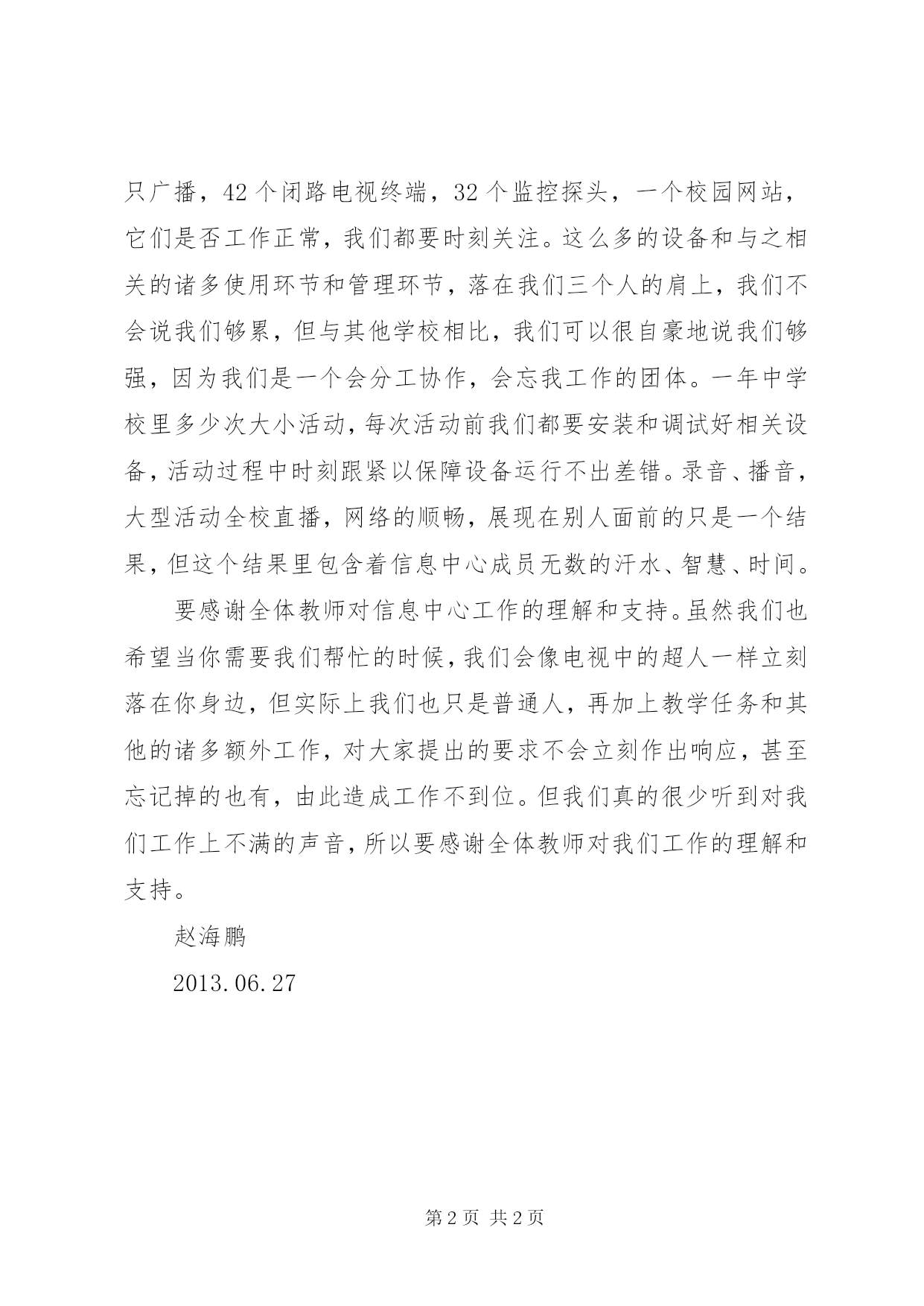 第PAGE\*Arabic\*MERGEFORMAT2页共NUMPAGES\*MERGEFORMAT2页先进个人工作总结信息技术中心信息中心个人工作总结领导们,老师们:本学年,信息中心在学校的正确领导和支持下,在全体教师的理解和配合中,以学校和教师的需要为出发点和工作动力,团结内部成员,分工协作,求真务实,开拓进取,紧紧围绕优质服务这一中心,努力提升服务水平,圆满地完成了各项工作任务。如今用三份感谢来总结我们本学期的工作。要感谢学校的大力支持。“巧妇难为无米之炊”,我们再有能力,但如果少了硬件的支持,那么很多工作也只能在纸上谈兵而不能把它变为现实。新建的报告厅配置的先进设备,使得校园范围内的信息直播更加完美;各种公开课的展示效果更好;即将更新的四楼多媒体教室,会让老师们上课更舒服……。这些投入,在丰富学校信息技术硬件设备的同时,也大大拓展我们发挥的空间。一些陈旧设备的更新换代,既改善了办公和教学环境,同时也适当减少我们以前过重的维护压力,使我们有更多的时间投入研究和深造,进而使我们的服务的能力更上一个台阶。要感谢信息中心成员的协作精神和忘我工作精神。虽然我们只有三个人,但全校工作地点最多的应该算我们了,除了办公室教室以外,还有两个多媒体教室,一个广播室,一个远程教育控制室。全学校近200多台计算机,几公里长的网络线路,60多只广播,42个闭路电视终端,32个监控探头,一个校园网站,它们是否工作正常,我们都要时刻关注。这么多的设备和与之相关的诸多使用环节和管理环节,落在我们三个人的肩上,我们不会说我们够累,但与其他学校相比,我们可以很自豪地说我们够强,因为我们是一个会分工协作,会忘我工作的团体。一年中学校里多少次大小活动,每次活动前我们都要安装和调试好相关设备,活动过程中时刻跟紧以保障设备运行不出差错。录音、播音,大型活动全校直播,网络的顺畅,展现在别人面前的只是一个结果,但这个结果里包含着信息中心成员无数的汗水、智慧、时间。要感谢全体教师对信息中心工作的理解和支持。虽然我们也希望当你需要我们帮忙的时候,我们会像电视中的超人一样立刻落在你身边,但实际上我们也只是普通人,再加上教学任务和其他的诸多额外工作,对大家提出的要求不会立刻作出响应,甚至忘记掉的也有,由此造成工作不到位。但我们真的很少听到对我们工作上不满的声音,所以要感谢全体教师对我们工作的理解和支持。赵海鹏2013.06.27