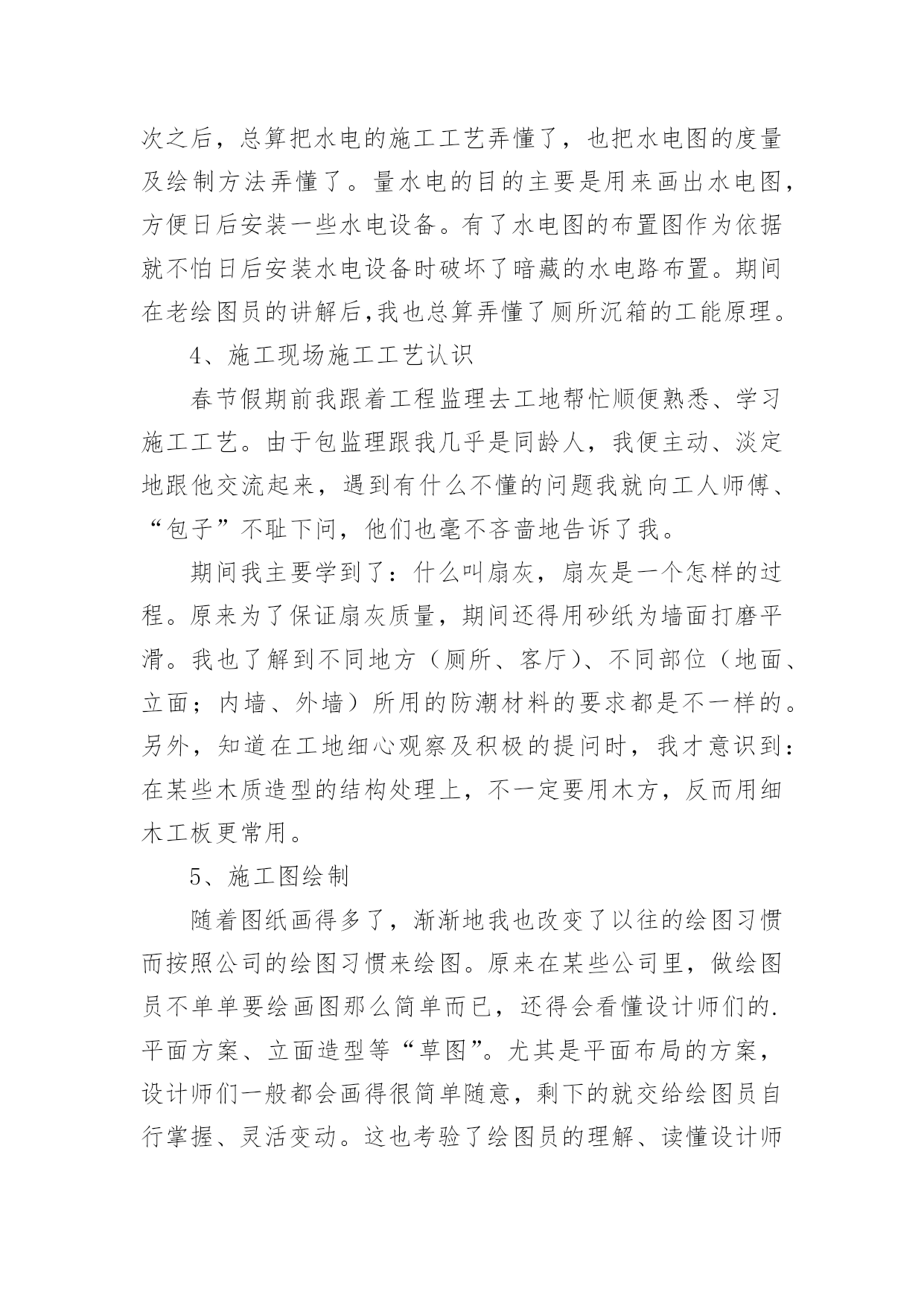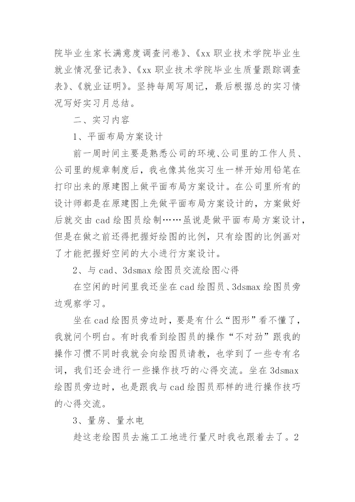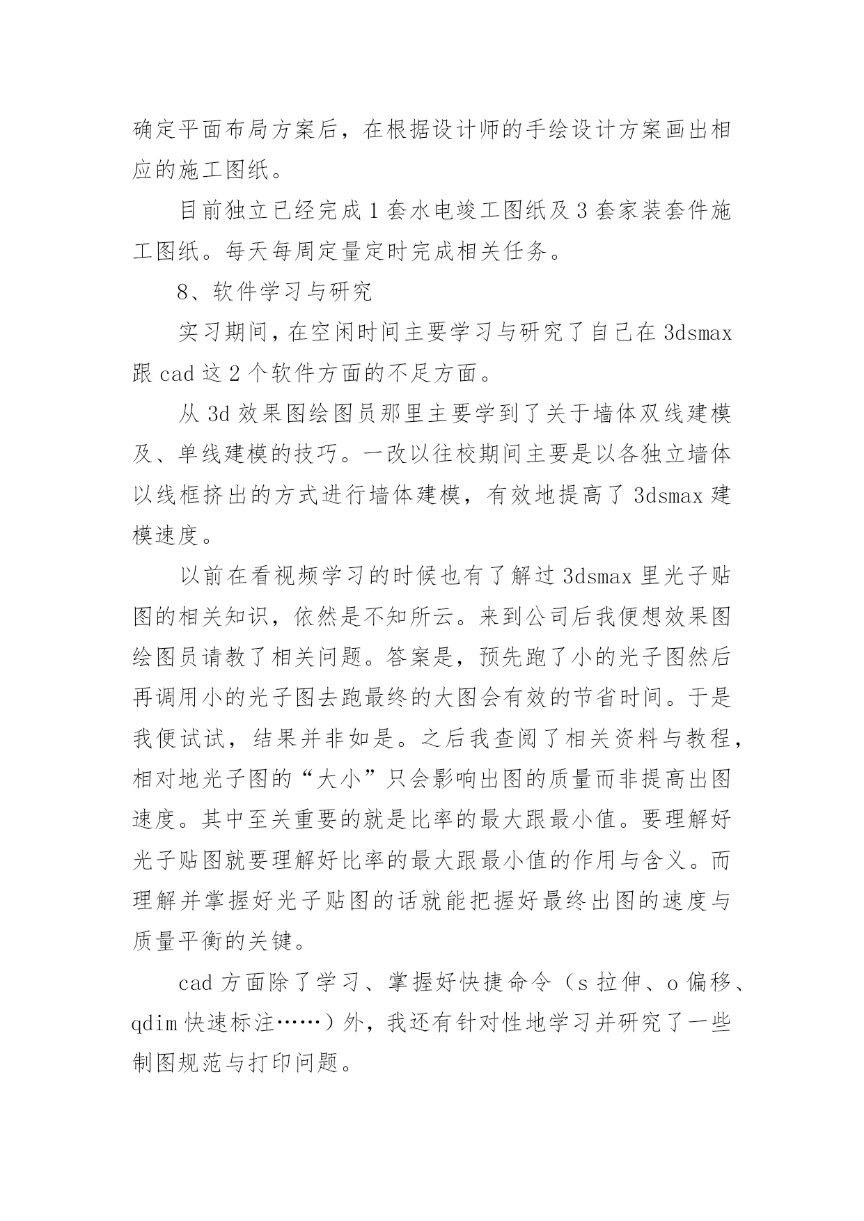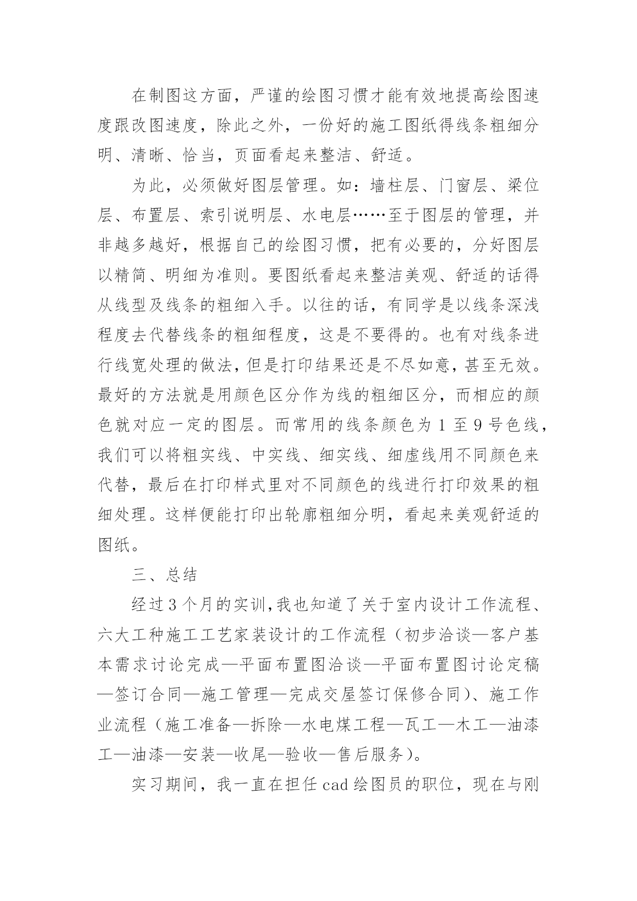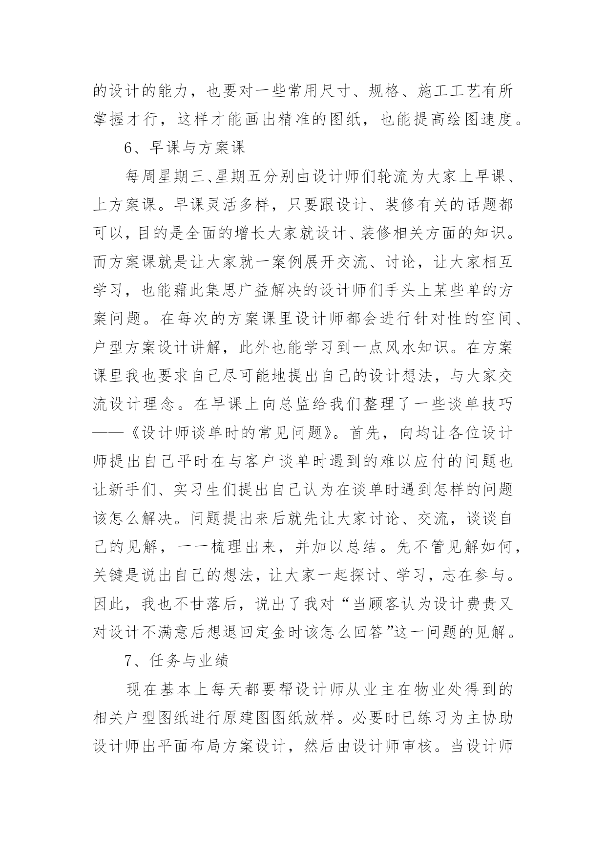 设计顶岗实习报告设计顶岗实习报告在经济飞速发展的今天,我们都不可避免地要接触到报告,报告具有成文事后性的特点。你知道怎样写报告才能写的好吗?下面是小编整理的设计顶岗实习报告,仅供参考,大家一起来看看吧。设计顶岗实习报告1一、概述“天道酬勤?人道酬善?商道酬信”,名匠装饰立志以设计为核心竞争力,为客户提供整体家居解决方案,为客户创造不可复制与无法替代的附加值。勤劳,诚实,有爱心,不走捷径!名匠以达成客户全面满意为终极目标,名匠坚信“只有顾客的满意才是我们的满意”。相信品牌,相信朋友,名匠装饰秉承“一握名匠手,永远是朋友”的服务理念,承诺“用好业主的每一分钱”,把每一位业主的家都当成自己的家来装修,严格执行国际及国家施工标准,引领行业品质典范。“精雕细琢?名匠本色”,名匠装饰以设计与文化为根,诚信与品质为本,努力把每个工程雕琢成一件艺术品,让每位业主都拥有幸福的家。本人,目前的实习岗位是设计师助理。实习期间为XX年1月9日至今,已完成了顶岗实习的相关任务。已上交了《xx职业技术学院毕业生跟踪调查问卷》、《xx职业技术学院毕业生家长满意度调查问卷》、《xx职业技术学院毕业生就业情况登记表》、《xx职业技术学院毕业生质量跟踪调查表》、《就业证明》。坚持每周写周记,最后根据总的实习情况写好实习月总结。二、实习内容1、平面布局方案设计前一周时间主要是熟悉公司的环境、公司里的工作人员、公司里的规章制度后,我也像其他实习生一样开始用铅笔在打印出来的原建图上做平面布局方案设计。在公司里所有的设计师都是在原建图上先做平面布局方案设计的,方案做好后就交由cad绘图员绘制……虽说是做平面布局方案设计,但是在做之前还得把握好绘图的比例,只有绘图的比例画对了才能把握好空间的大小进行方案设计。2、与cad、3dsmax绘图员交流绘图心得在空闲的时间里我还坐在cad绘图员、3dsmax绘图员旁边观察学习。坐在cad绘图员旁边时,要是有什么“图形”看不懂了,我就问个明白。有时我看到绘图员的操作“不对劲”跟我的操作习惯不同时我就会向绘图员请教,也学到了一些专有名词,我们还会进行一些操作技巧的心得交流。坐在3dsmax绘图员旁边时,也是跟我与cad绘图员那样的进行操作技巧的心得交流。3、量房、量水电趁这老绘图员去施工工地进行量尺时我也跟着去了。2次之后,总算把水电的施工工艺弄懂了,也把水电图的度量及绘制方法弄懂了。量水电的目的主要是用来画出水电图,方便日后安装一些水电设备。有了水电图的布置图作为依据就不怕日后安装水电设备时破坏了暗藏的水电路布置。期间在老绘图员的讲解后,我也总算弄懂了厕所沉箱的工能原理。4、施工现场施工工艺认识春节假期前我跟着工程监理去工地帮忙顺便熟悉、学习施工工艺。由于包监理跟我几乎是同龄人,我便主动、淡定地跟他交流起来,遇到有什么不懂的问题我就向工人师傅、“包子”不耻下问,他们也毫不吝啬地告诉了我。期间我主要学到了:什么叫扇灰,扇灰是一个怎样的过程。原来为了保证扇灰质量,期间还得用砂纸为墙面打磨平滑。我也了解到不同地方(厕所、客厅)、不同部位(地面、立面;内墙、外墙)所用的防潮材料的要求都是不一样的。另外,知道在工地细心观察及积极的提问时,我才意识到:在某些木质造型的结构处理上,不一定要用木方,反而用细木工板更常用。5、施工图绘制随着图纸画得多了,渐渐地我也改变了以往的绘图习惯而按照公司的绘图习惯来绘图。原来在某些公司里,做绘图员不单单要绘画图那么简单而已,还得会看懂设计师们的.平面方案、立面造型等“草图”。尤其是平面布局的方案,设计师们一般都会画得很简单随意,剩下的就交给绘图员自行掌握、灵活变动。这也考验了绘图员的理解、读懂设计师的设计的能力,也要对一些常用尺寸、规格、施工工艺有所掌握才行,这样才能画出精准的图纸,也能提高绘图速度。6、早课与方案课每周星期三、星期五分别由设计师们轮流为大家上早课、上方案课。早课灵活多样,只要跟设计、装修有关的话题都可以,目的是全面的增长大家就设计、装修相关方面的知识。而方案课就是让大家就一案例展开交流、讨论,让大家相互学习,也能藉此集思广益解决的设计师们手头上某些单的方案问题。在每次的方案课里设计师都会进行针对性的空间、户型方案设计讲解,此外也能学习到一点风水知识。在方案课里我也要求自己尽可能地提出自己的设计想法,与大家交流设计理念。在早课上向总监给我们整理了一些谈单技巧——《设计师谈单时的常见问题》。首先,向均让各位设计师提出自己平时在与客户谈单时遇到的难以应付的问题也让新手们、实习生们提出自己认为在谈单时遇到怎样的问题该怎么解决。问题提出来后就先让大家讨论、交流,谈谈自己的见解,一一梳理出来,并加以总结。先不管见解如何,关键是说出自己的想法,让大家一起探讨、学习,志在参与。因此,我也不甘落后,说出了我