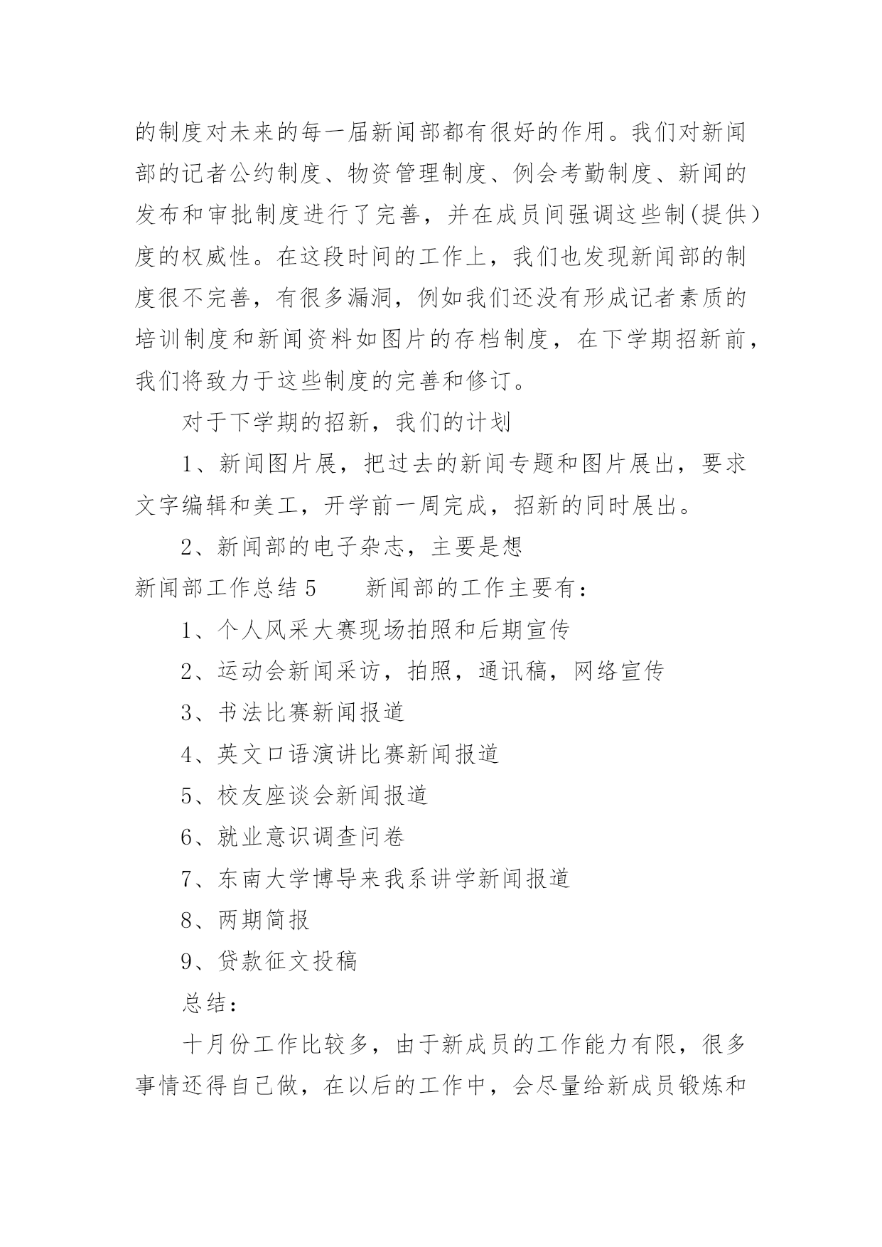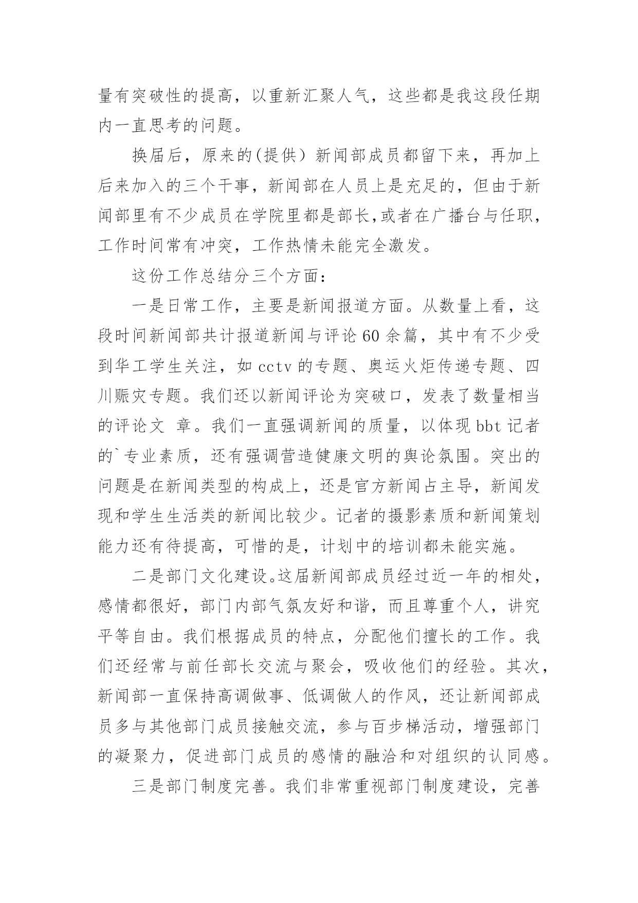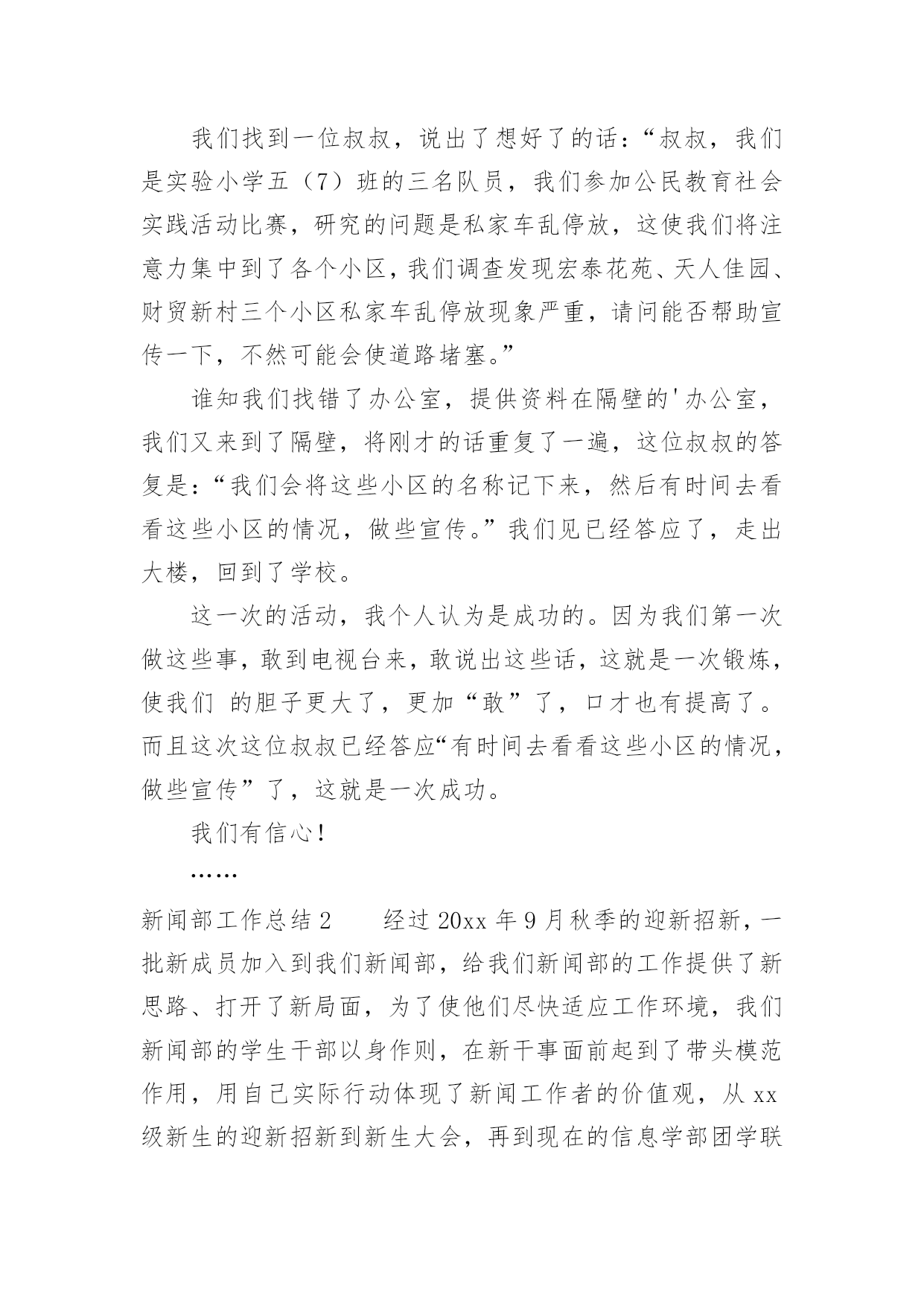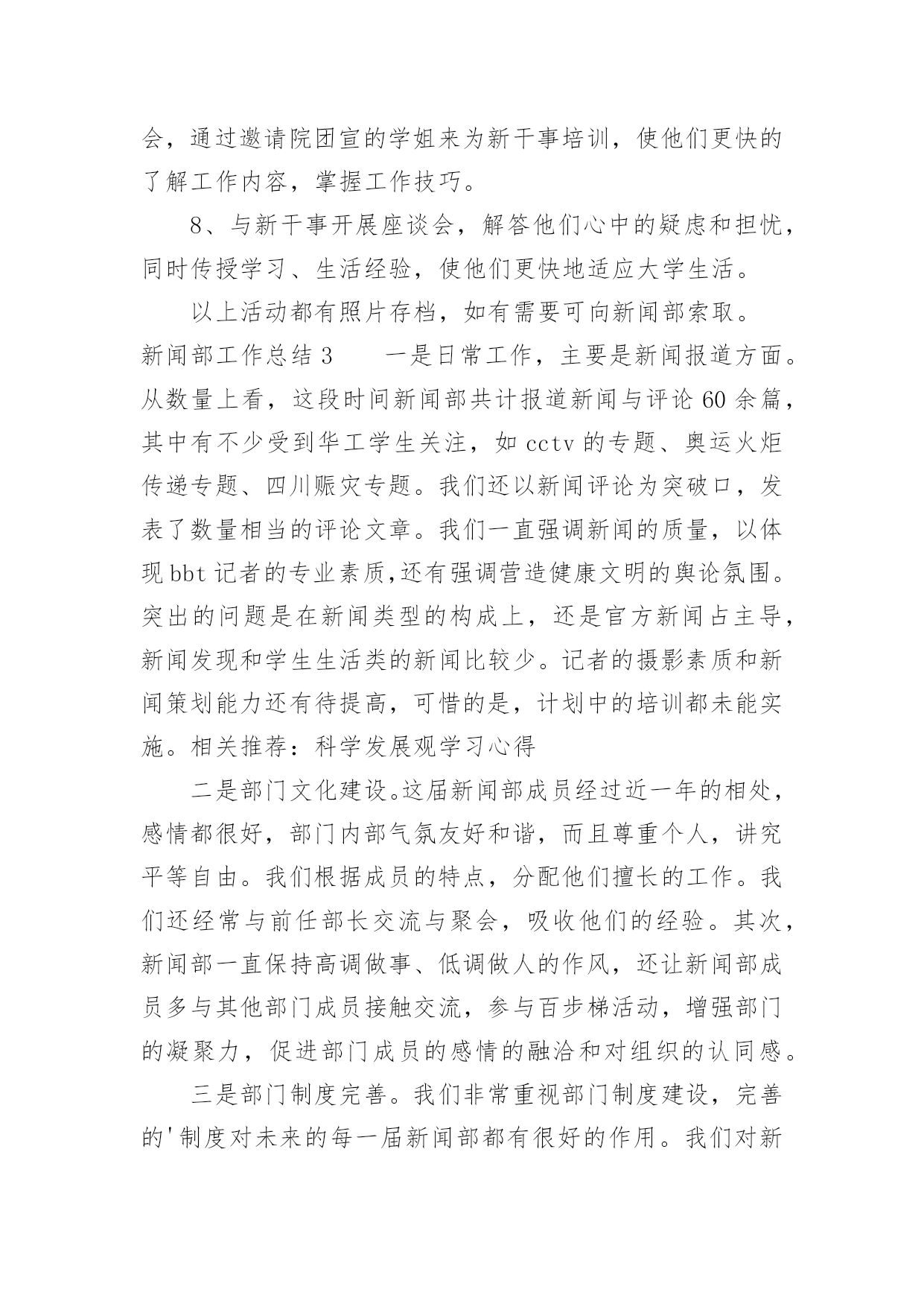 新闻部工作总结新闻部工作总结总结是在某一特定时间段对学习和工作生活或其完成情况,包括取得的成绩、存在的问题及得到的经验和教训加以回顾和分析的书面材料,它在我们的学习、工作中起到呈上启下的作用,让我们一起来学习写总结吧。我们该怎么去写总结呢?下面是小编帮大家整理的新闻部工作总结,欢迎阅读,希望大家能够喜欢。新闻部工作总结1星期二,有三个小学生从县政府大院的一幢办公楼里走了出来,你一定很奇怪,他们不上学吗?事情是这样的:星期二的下午没有必修课,所以我和另外两名同学组织好语言,准备好所需物品,快步走向溧水电视台新闻部。这次走出校门是因为我们参加公民教育社会实践活动比赛,研究的问题是私家车乱停放,这使我们将注意力集中到了各个小区,我们发现宏泰花苑、天人佳园、财贸新村三个小区私家车乱停放现象严重,于是,老师建议我们将情况提供给电视台,让他们帮助宣传一下。我们来到新闻工作室门前,又开始组织语言,生怕在提供资料时出了什么差错。一遍遍的核对语言后,我敲响了新闻办公室的门。“请进!”门内传来了一位叔叔的声音,我们推门进去。我们找到一位叔叔,说出了想好了的话:“叔叔,我们是实验小学五(7)班的三名队员,我们参加公民教育社会实践活动比赛,研究的问题是私家车乱停放,这使我们将注意力集中到了各个小区,我们调查发现宏泰花苑、天人佳园、财贸新村三个小区私家车乱停放现象严重,请问能否帮助宣传一下,不然可能会使道路堵塞。”谁知我们找错了办公室,提供资料在隔壁的'办公室,我们又来到了隔壁,将刚才的话重复了一遍,这位叔叔的答复是:“我们会将这些小区的名称记下来,然后有时间去看看这些小区的情况,做些宣传。”我们见已经答应了,走出大楼,回到了学校。这一次的活动,我个人认为是成功的。因为我们第一次做这些事,敢到电视台来,敢说出这些话,这就是一次锻炼,使我们的胆子更大了,更加“敢”了,口才也有提高了。而且这次这位叔叔已经答应“有时间去看看这些小区的情况,做些宣传”了,这就是一次成功。我们有信心!……新闻部工作总结2经过20xx年9月秋季的迎新招新,一批新成员加入到我们新闻部,给我们新闻部的工作提供了新思路、打开了新局面,为了使他们尽快适应工作环境,我们新闻部的学生干部以身作则,在新干事面前起到了带头模范作用,用自己实际行动体现了新闻工作者的价值观,从xx级新生的迎新招新到新生大会,再到现在的信息学部团学联的换届大会,我们秉承着责任、笃信、务实、创新的精神,在金秋九月完成学部交给我们的每项任务。也必将在今后的工作中一如既往,认真完成团学联的其他工作。具体工作内容:1、迎接新生入校,帮助他们更快地办理入学手续和寝室入住。同时用相机下记录团学联的工作场景。为团学联保留了珍贵的图片资料。2、向新生们介绍学部各专业的特色及发展前景,让他们对各自本专业有更充分更彻底的了解,从而帮助他们制定出适合自己的大学规划。3、在新生军训期间,新闻部派摄影记者全程跟踪训练,从而收集到了大量军训题材摄影作品,为xx级新生留下了丰富的历史资料,同时为今后视频制作提供了珍贵素材。4、在《学工简讯》上报道《新生大会》的情况,讲述读大学的必要性以及如何完成好大学学业,促进学生的'自身发展,强化他们的忧患意识。5、认真、仔细、负责的完成了20xx级部门招新工作,对登记报名本部门的xx级新生进行层层细致的筛选,在广大xx级新生群体中筛选出一批相对优秀的干事。为今后新闻部开展工作打下坚实基础。6、对新加入的成员召开首次部门例会,为他们创造认识彼此,了解彼此的机会,同时完成对部门成员的最终确定方案。7、与信息学部团宣一起,为xx级干事开工作经验交流会,通过邀请院团宣的学姐来为新干事培训,使他们更快的了解工作内容,掌握工作技巧。8、与新干事开展座谈会,解答他们心中的疑虑和担忧,同时传授学习、生活经验,使他们更快地适应大学生活。以上活动都有照片存档,如有需要可向新闻部索取。新闻部工作总结3一是日常工作,主要是新闻报道方面。从数量上看,这段时间新闻部共计报道新闻与评论60余篇,其中有不少受到华工学生关注,如cctv的专题、奥运火炬传递专题、四川赈灾专题。我们还以新闻评论为突破口,发表了数量相当的评论文章。我们一直强调新闻的质量,以体现bbt记者的专业素质,还有强调营造健康文明的舆论氛围。突出的问题是在新闻类型的构成上,还是官方新闻占主导,新闻发现和学生生活类的新闻比较少。记者的摄影素质和新闻策划能力还有待提高,可惜的是,计划中的培训都未能实施。相关推荐:科学发展观学习心得二是部门文化建设。这届新闻部成员经过近一年的相处,感情都很好,部门内部气氛友好和谐,而且尊重个人,讲究平等自由。我们根据成员的特点,分配他们擅长的工作。我们还经常与前任部长交流与聚会,吸收他们的经验。其次,新闻部一直保持高调做事、低调做人的作风,还让