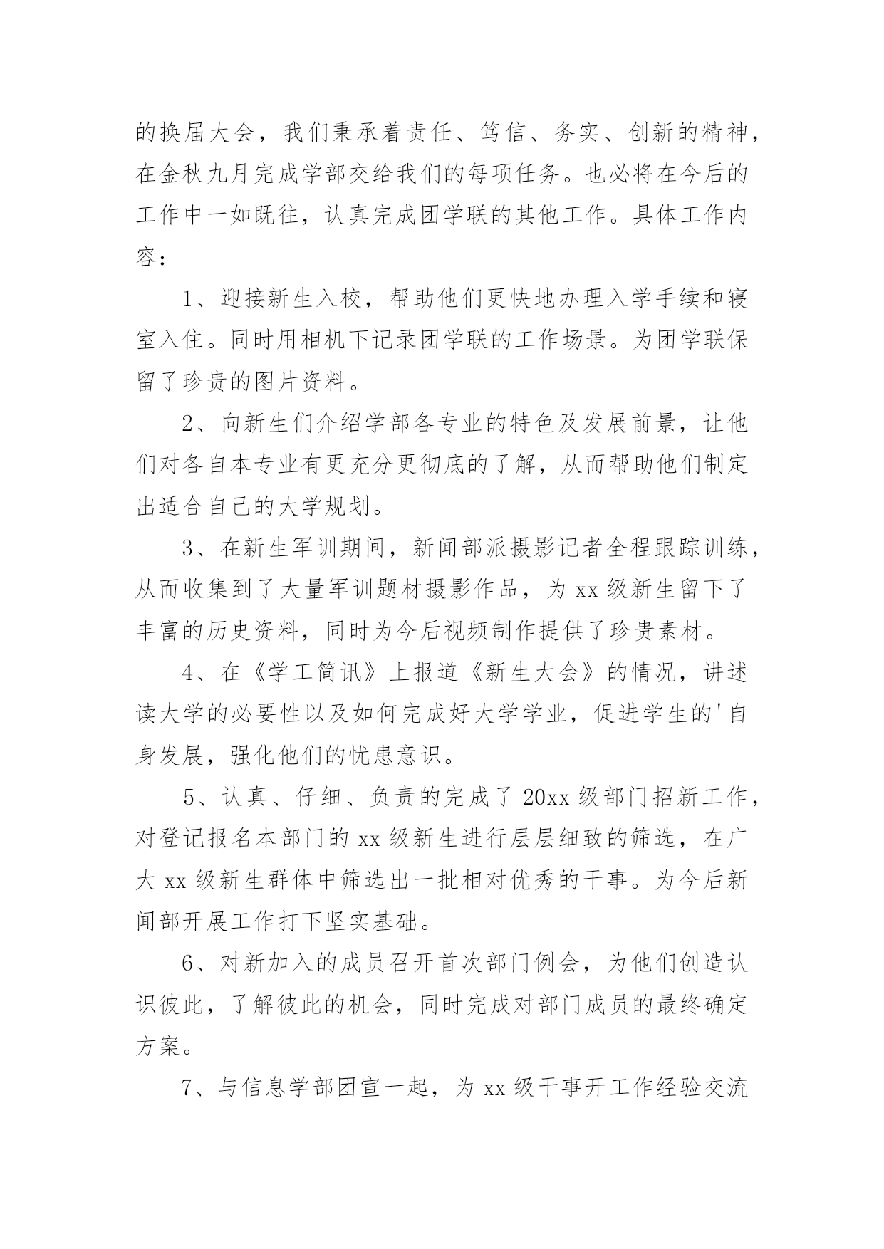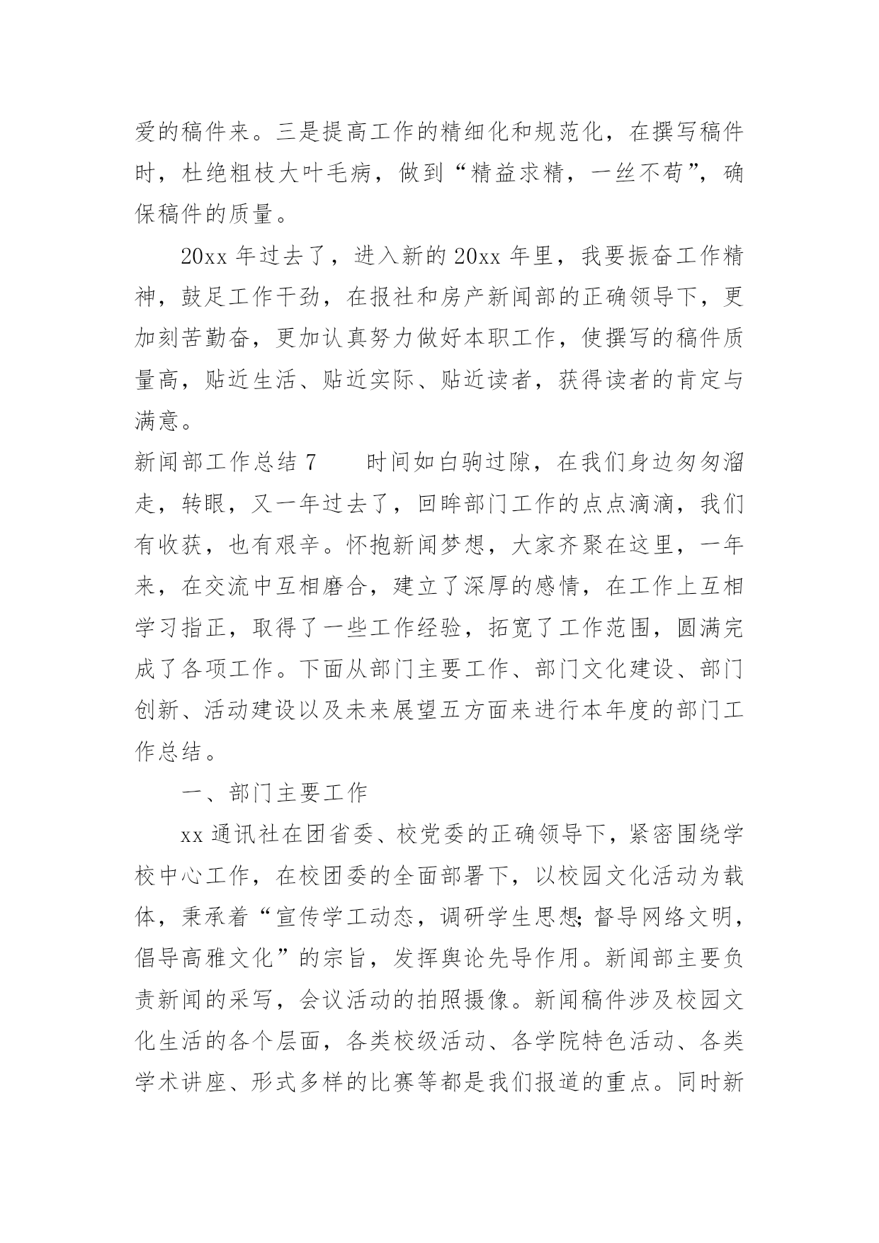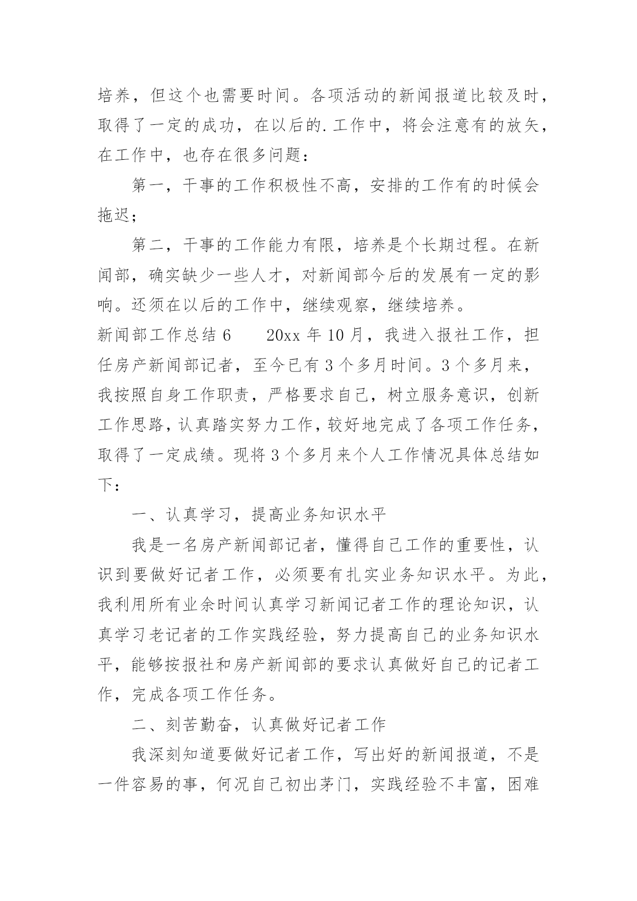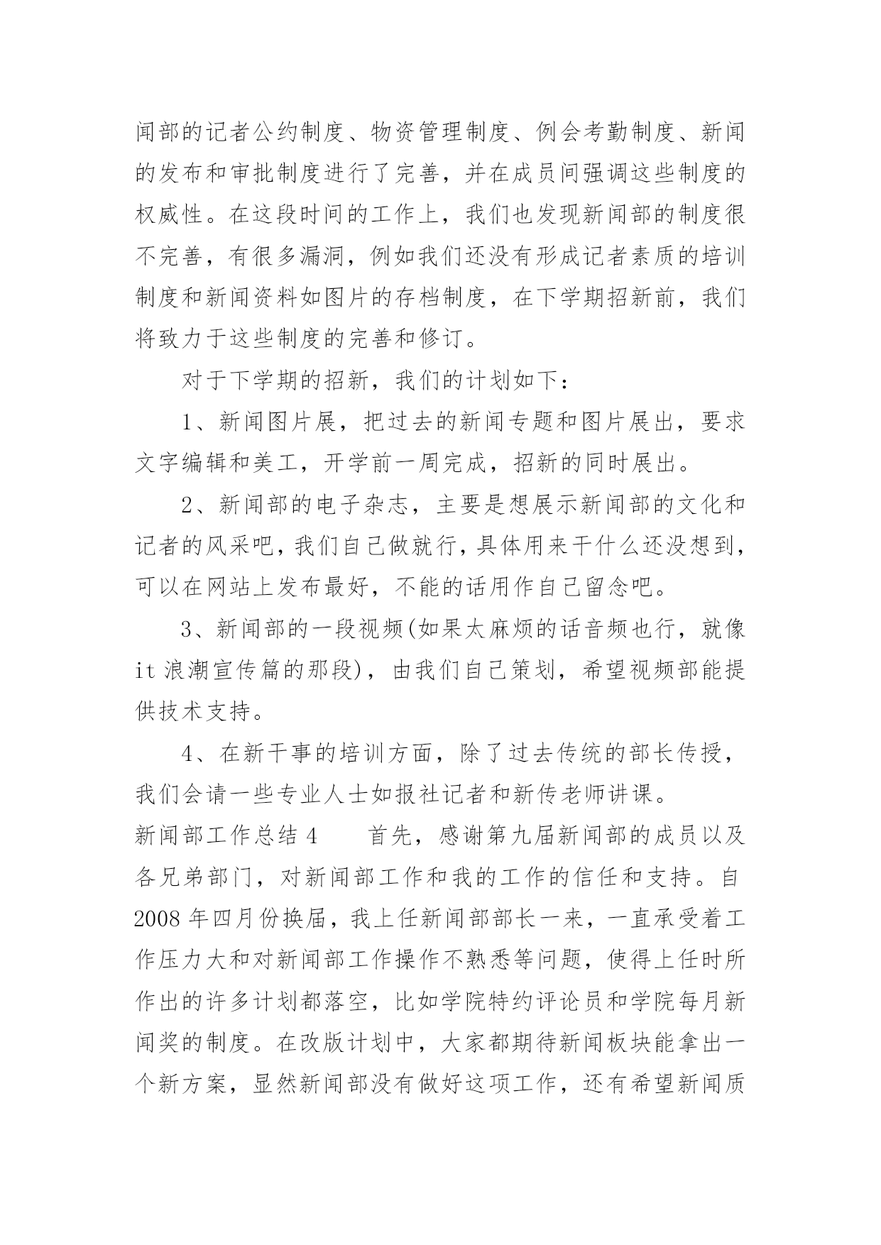 新闻部工作总结新闻部工作总结总结是在某一特定时间段对学习和工作生活或其完成情况,包括取得的成绩、存在的问题及得到的经验和教训加以回顾和分析的书面材料,它在我们的学习、工作中起到呈上启下的作用,让我们一起来学习写总结吧。我们该怎么去写总结呢?下面是小编帮大家整理的新闻部工作总结,欢迎阅读,希望大家能够喜欢。新闻部工作总结1星期二,有三个小学生从县政府大院的一幢办公楼里走了出来,你一定很奇怪,他们不上学吗?事情是这样的:星期二的下午没有必修课,所以我和另外两名同学组织好语言,准备好所需物品,快步走向溧水电视台新闻部。这次走出校门是因为我们参加公民教育社会实践活动比赛,研究的问题是私家车乱停放,这使我们将注意力集中到了各个小区,我们发现宏泰花苑、天人佳园、财贸新村三个小区私家车乱停放现象严重,于是,老师建议我们将情况提供给电视台,让他们帮助宣传一下。我们来到新闻工作室门前,又开始组织语言,生怕在提供资料时出了什么差错。一遍遍的核对语言后,我敲响了新闻办公室的门。“请进!”门内传来了一位叔叔的声音,我们推门进去。我们找到一位叔叔,说出了想好了的话:“叔叔,我们是实验小学五(7)班的三名队员,我们参加公民教育社会实践活动比赛,研究的问题是私家车乱停放,这使我们将注意力集中到了各个小区,我们调查发现宏泰花苑、天人佳园、财贸新村三个小区私家车乱停放现象严重,请问能否帮助宣传一下,不然可能会使道路堵塞。”谁知我们找错了办公室,提供资料在隔壁的'办公室,我们又来到了隔壁,将刚才的话重复了一遍,这位叔叔的答复是:“我们会将这些小区的名称记下来,然后有时间去看看这些小区的情况,做些宣传。”我们见已经答应了,走出大楼,回到了学校。这一次的活动,我个人认为是成功的。因为我们第一次做这些事,敢到电视台来,敢说出这些话,这就是一次锻炼,使我们的胆子更大了,更加“敢”了,口才也有提高了。而且这次这位叔叔已经答应“有时间去看看这些小区的情况,做些宣传”了,这就是一次成功。我们有信心!……新闻部工作总结2经过20xx年9月秋季的迎新招新,一批新成员加入到我们新闻部,给我们新闻部的工作提供了新思路、打开了新局面,为了使他们尽快适应工作环境,我们新闻部的学生干部以身作则,在新干事面前起到了带头模范作用,用自己实际行动体现了新闻工作者的价值观,从xx级新生的迎新招新到新生大会,再到现在的信息学部团学联的换届大会,我们秉承着责任、笃信、务实、创新的精神,在金秋九月完成学部交给我们的每项任务。也必将在今后的工作中一如既往,认真完成团学联的其他工作。具体工作内容:1、迎接新生入校,帮助他们更快地办理入学手续和寝室入住。同时用相机下记录团学联的工作场景。为团学联保留了珍贵的图片资料。2、向新生们介绍学部各专业的特色及发展前景,让他们对各自本专业有更充分更彻底的了解,从而帮助他们制定出适合自己的大学规划。3、在新生军训期间,新闻部派摄影记者全程跟踪训练,从而收集到了大量军训题材摄影作品,为xx级新生留下了丰富的历史资料,同时为今后视频制作提供了珍贵素材。4、在《学工简讯》上报道《新生大会》的情况,讲述读大学的必要性以及如何完成好大学学业,促进学生的'自身发展,强化他们的忧患意识。5、认真、仔细、负责的完成了20xx级部门招新工作,对登记报名本部门的xx级新生进行层层细致的筛选,在广大xx级新生群体中筛选出一批相对优秀的干事。为今后新闻部开展工作打下坚实基础。6、对新加入的成员召开首次部门例会,为他们创造认识彼此,了解彼此的机会,同时完成对部门成员的最终确定方案。7、与信息学部团宣一起,为xx级干事开工作经验交流会,通过邀请院团宣的学姐来为新干事培训,使他们更快的了解工作内容,掌握工作技巧。8、与新干事开展座谈会,解答他们心中的疑虑和担忧,同时传授学习、生活经验,使他们更快地适应大学生活。以上活动都有照片存档,如有需要可向新闻部索取。新闻部工作总结3一是日常工作,主要是新闻报道方面。从数量上看,这段时间新闻部共计报道新闻与评论60余篇,其中有不少受到华工学生关注,如cctv的专题、奥运火炬传递专题、四川赈灾专题。我们还以新闻评论为突破口,发表了数量相当的评论文章。我们一直强调新闻的质量,以体现bbt记者的专业素质,还有强调营造健康文明的舆论氛围。突出的问题是在新闻类型的构成上,还是官方新闻占主导,新闻发现和学生生活类的新闻比较少。记者的摄影素质和新闻策划能力还有待提高,可惜的是,计划中的培训都未能实施。相关推荐:科学发展观学习心得二是部门文化建设。这届新闻部成员经过近一年的相处,感情都很好,部门内部气氛友好和谐,而且尊重个人,讲究平等自由。我们根据成员的特点,分配他们擅长的工作。我们还经常与前任部长交流与聚会,吸收他们的经验。其次,新闻部一直保持高调做事、低调做人的作风,还让