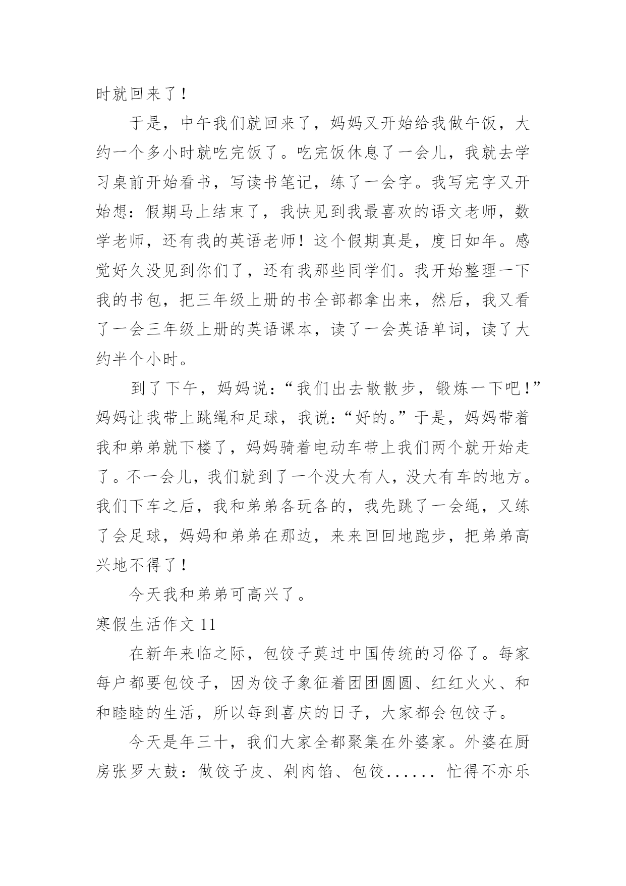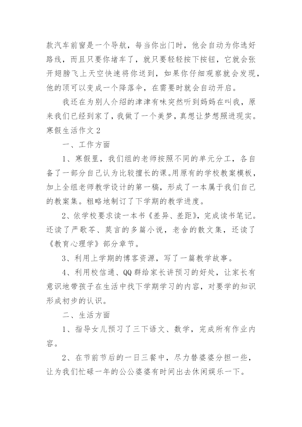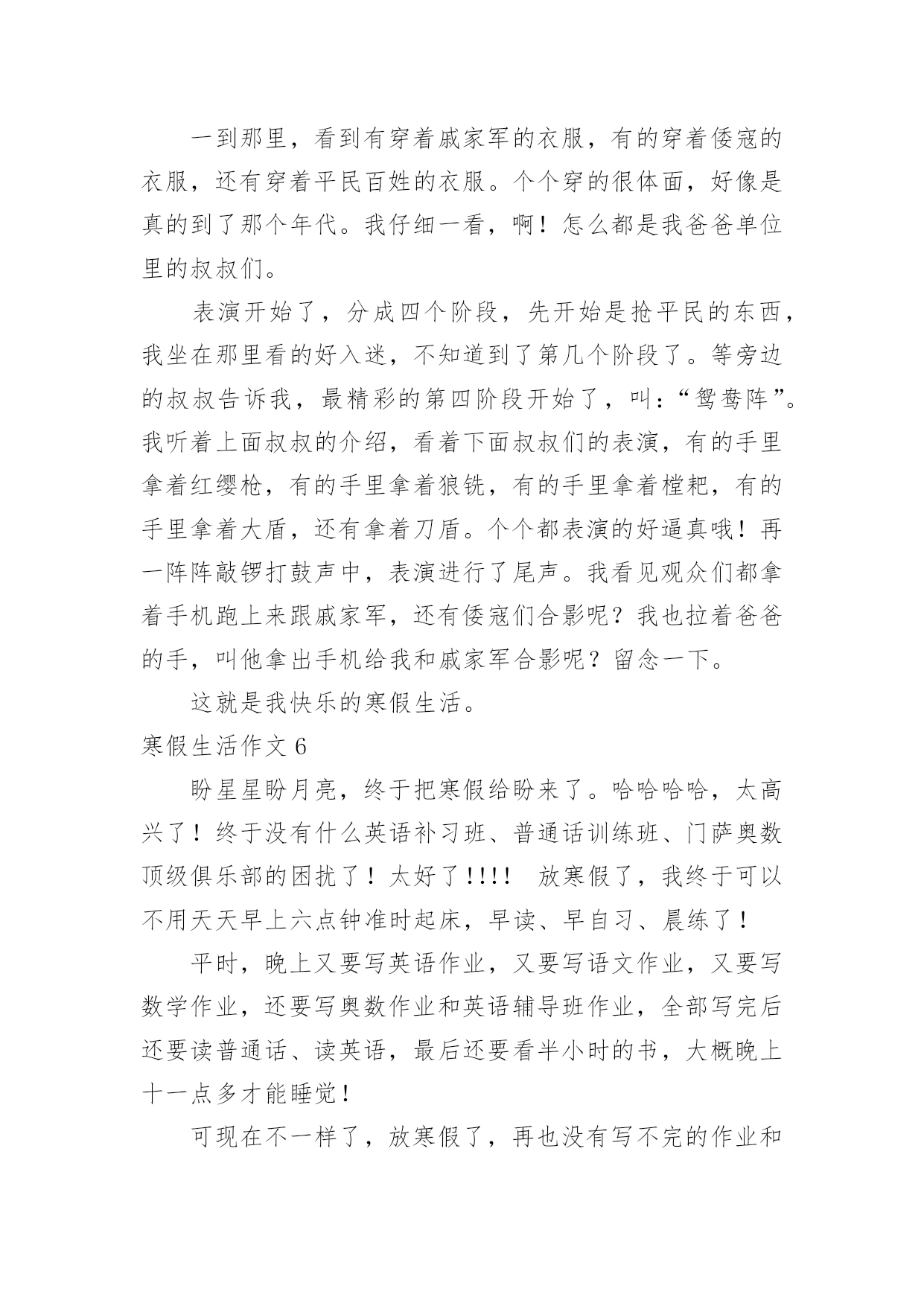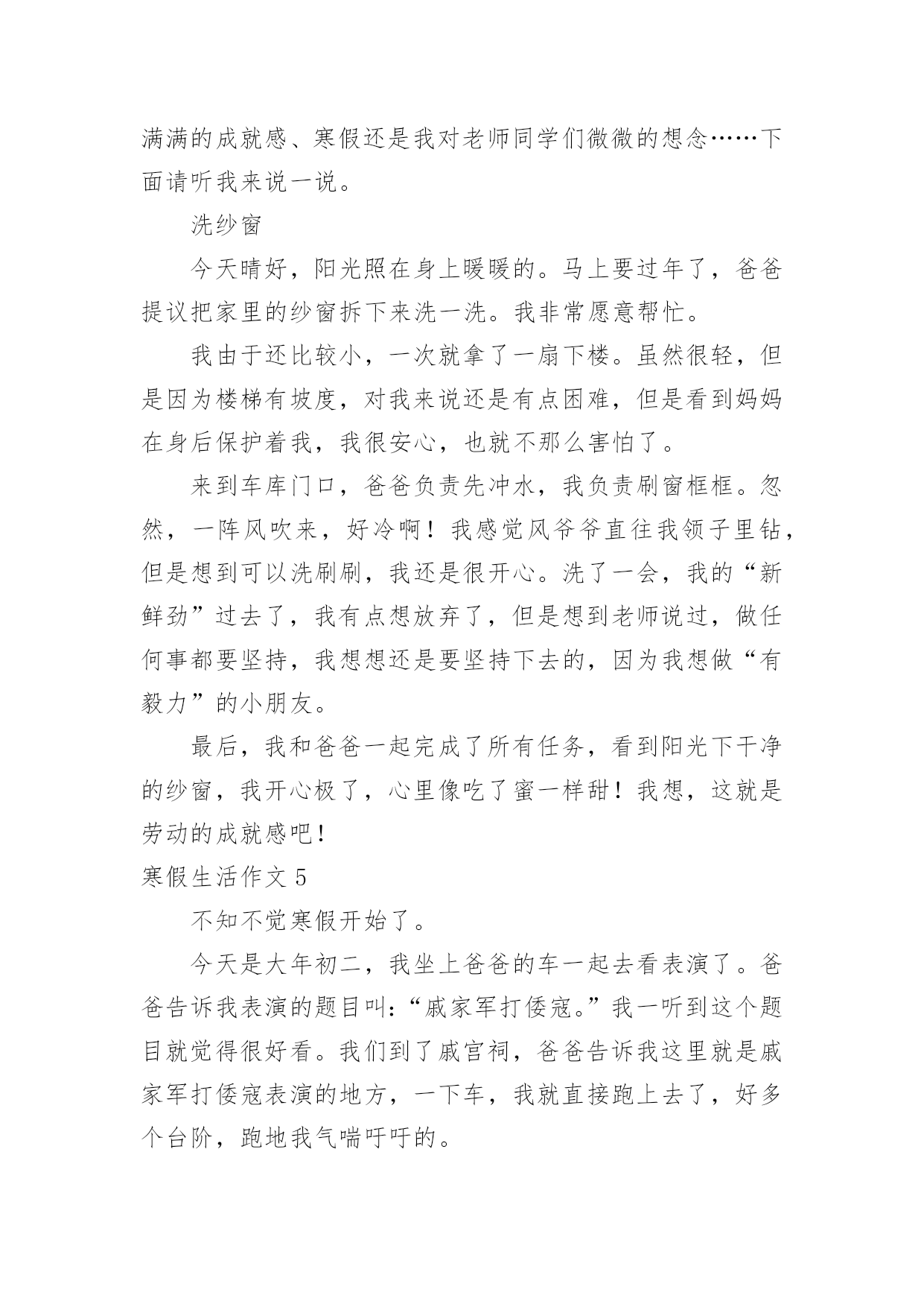 寒假生活作文寒假生活作文(合集15篇)在平日的学习、工作和生活里,大家都接触过作文吧,作文一定要做到主题集中,围绕同一主题作深入阐述,切忌东拉西扯,主题涣散甚至无主题。那么问题来了,到底应如何写一篇优秀的作文呢?以下是小编为大家整理的寒假生活作文,希望对大家有所帮助。寒假生活作文1今天我们去了雅戈尔动物园,本来高高兴兴地去了,妈妈也在网上买好了票。但是还没到门口,我就被汽车排起的长龙惊呆了。我们慢慢地往前挪,我想如果车子可以飞直接飞过堵车的地方就好了。等慢慢开到公园门口那里也是人山人海,我们找了很久的车位也没有找到,最后我们只能退票走了,还损失了很多票钱。我想车子,如果可以变形成一颗胶囊,我直接把它放在口袋里就好了,那样我们就不用车位了。想着想着我突然发现路面的车都没有了,变得非常通畅。天上还飞着好多五颜六色的汽车。啊原来因为我发明了一款会飞的汽车,这种车和普通的汽车差别,可大了他的形象像一只大鸟头和身子,都是细长的可以根据环境和季节变换颜色。它的翅膀由最新智能材料制成可以自由伸缩它的身长2米,也是可以随意伸缩的。重量比一个小孩的体重还要亲这款汽车前窗是一个导航,每当你出门时,他会自动为你选好路线,而且只要你堵车了,就只要轻轻按下按钮,它就会张开翅膀飞上天空快速将你送到,如果你仔细观察就会发现,他的顶可以变成一个降落伞,在需要时就会自动开启。我还在为别人介绍的津津有味突然听到妈妈在叫我,原来我们已经到家了,我做了一个美梦,真想让梦想照进现实。寒假生活作文2一、工作方面1、寒假里,我们组的老师按照不同的单元分工,各自备了一部分自己认为比较擅长的课。用原有的学校教案模板,加上全组老师教学设计的第一稿,形成了一本属于我们自己的教案集。粗略地制订了下学期的教学进度。2、依学校要求读一本书《差异、差距》,完成读书笔记。还读了严歌苓、莫言的多篇小说,老舍的散文集,还读了《教育心理学》部分章节。3、利用上学期的博客资源,写了一篇教学故事。4、利用校信通、QQ群给家长讲预习的好处,让家长有意识地带孩子在生活中找下学期学习的内容,对要学的知识形成初步的认识。二、生活方面1、指导女儿预习了三下语文、数学,完成所有作业内容。2、在节前节后的一日三餐中,尽力替婆婆分担一些,让为我们忙碌一年的公公婆婆有时间出去休闲娱乐一下。寒假生活作文3一眨眼,寒假生活的时光即将逝去,这段时光好似一首不押韵的诗歌,起起伏伏,跳跳跃跃。每一个“词语”都在这本生活的书本里淋漓尽致的体现了出来。这段时间中,我读了一些我非常喜欢的书籍和文章。有《绝望锻炼了我》、《我是太阳花》、《好榜样指引学生人生》中的《成功的路不止一条》、《把自己推向前方》、《为自己奔跑》和《成功的公分母》等等几篇文章,至于《要什么完美》这本书似乎好像有点超出我的年龄了,不过真的让我懂得了许多。那些通俗的做人道理在这些书中巧妙地显露了出来。朴槿惠的坚强,马化腾的毅力,埃菲尔的自信,贝多芬的铿锵人生。不管是谁,书籍才是灵魂最好的养料。只有书籍才会这样客观的告诉你这些道理。别人的议论没什么,只是看好自己对一切事物的态度与想法,成功在于锻炼,把自己推向前方才能获得成功。这使我知道了书籍的力量无限大。在这个短暂的寒假生活里,让我充实了自己的知识。天天的书本才能让自己更加的充实,更加的阳光,更加的健康,更加的快乐,这段时光是我过的最快乐的一段时光。寒假生活作文4仿佛一转眼,寒假已经结束了。妈妈问我,这一次的寒假对你而言是什么?我想了想说,寒假是过年时一家人开开心心的团圆、寒假是阳光下吹泡泡的笑脸、寒假是劳动后满满的成就感、寒假还是我对老师同学们微微的想念……下面请听我来说一说。洗纱窗今天晴好,阳光照在身上暖暖的。马上要过年了,爸爸提议把家里的纱窗拆下来洗一洗。我非常愿意帮忙。我由于还比较小,一次就拿了一扇下楼。虽然很轻,但是因为楼梯有坡度,对我来说还是有点困难,但是看到妈妈在身后保护着我,我很安心,也就不那么害怕了。来到车库门口,爸爸负责先冲水,我负责刷窗框框。忽然,一阵风吹来,好冷啊!我感觉风爷爷直往我领子里钻,但是想到可以洗刷刷,我还是很开心。洗了一会,我的“新鲜劲”过去了,我有点想放弃了,但是想到老师说过,做任何事都要坚持,我想想还是要坚持下去的,因为我想做“有毅力”的小朋友。最后,我和爸爸一起完成了所有任务,看到阳光下干净的纱窗,我开心极了,心里像吃了蜜一样甜!我想,这就是劳动的成就感吧!寒假生活作文5不知不觉寒假开始了。今天是大年初二,我坐上爸爸的车一起去看表演了。爸爸告诉我表演的题目叫:“戚家军打倭寇。”我一听到这个题目就觉得很好看。我们到了戚宫祠,爸爸告诉我这里就是戚家军打倭寇表演的地方,一下车,我就直接跑上去了,好多个台阶,跑地我气喘吁吁的。一到那里,看到有穿着戚家军的衣服,有的穿着倭寇的衣服,还