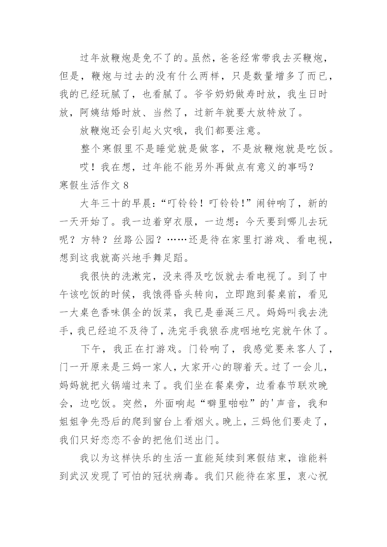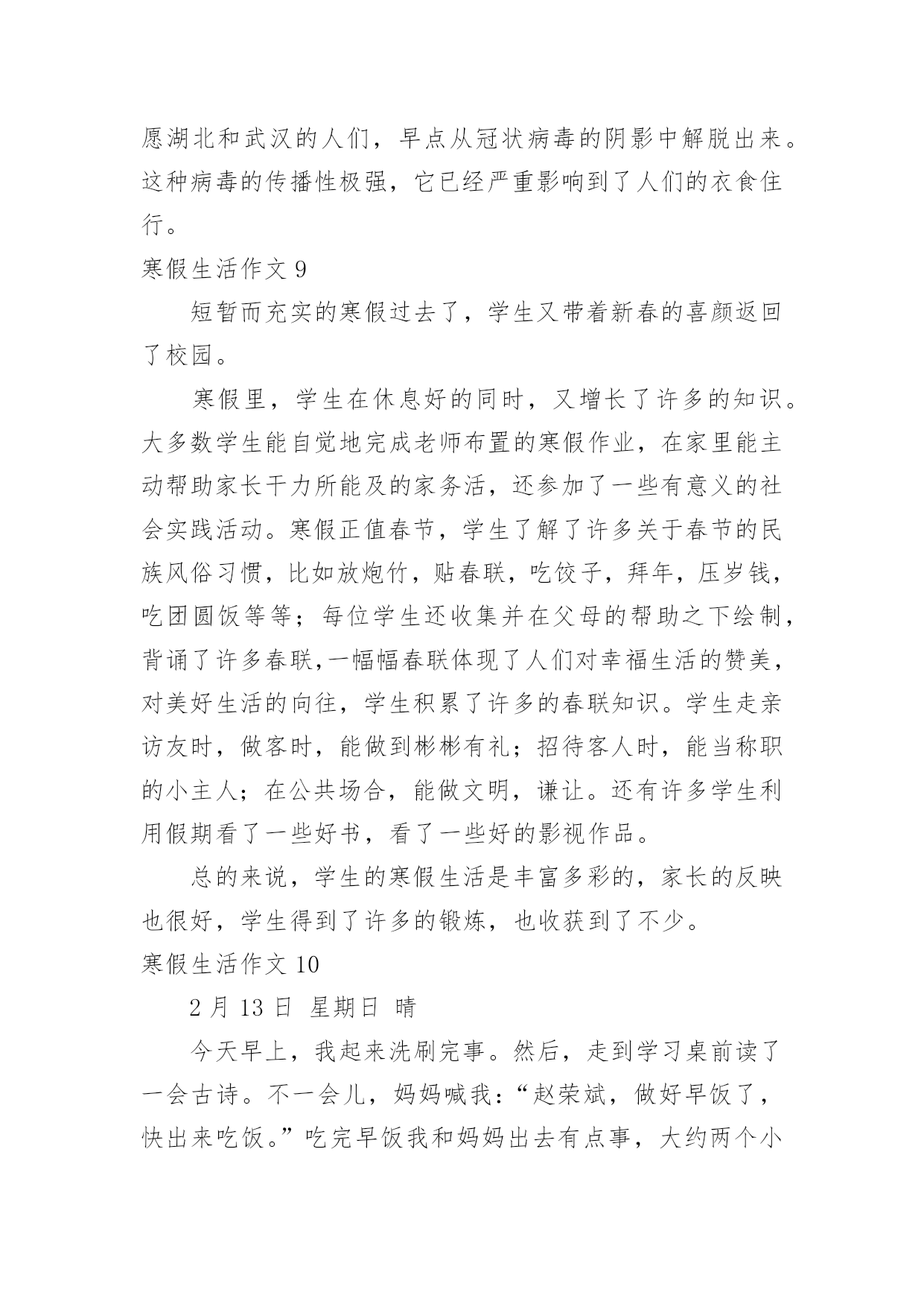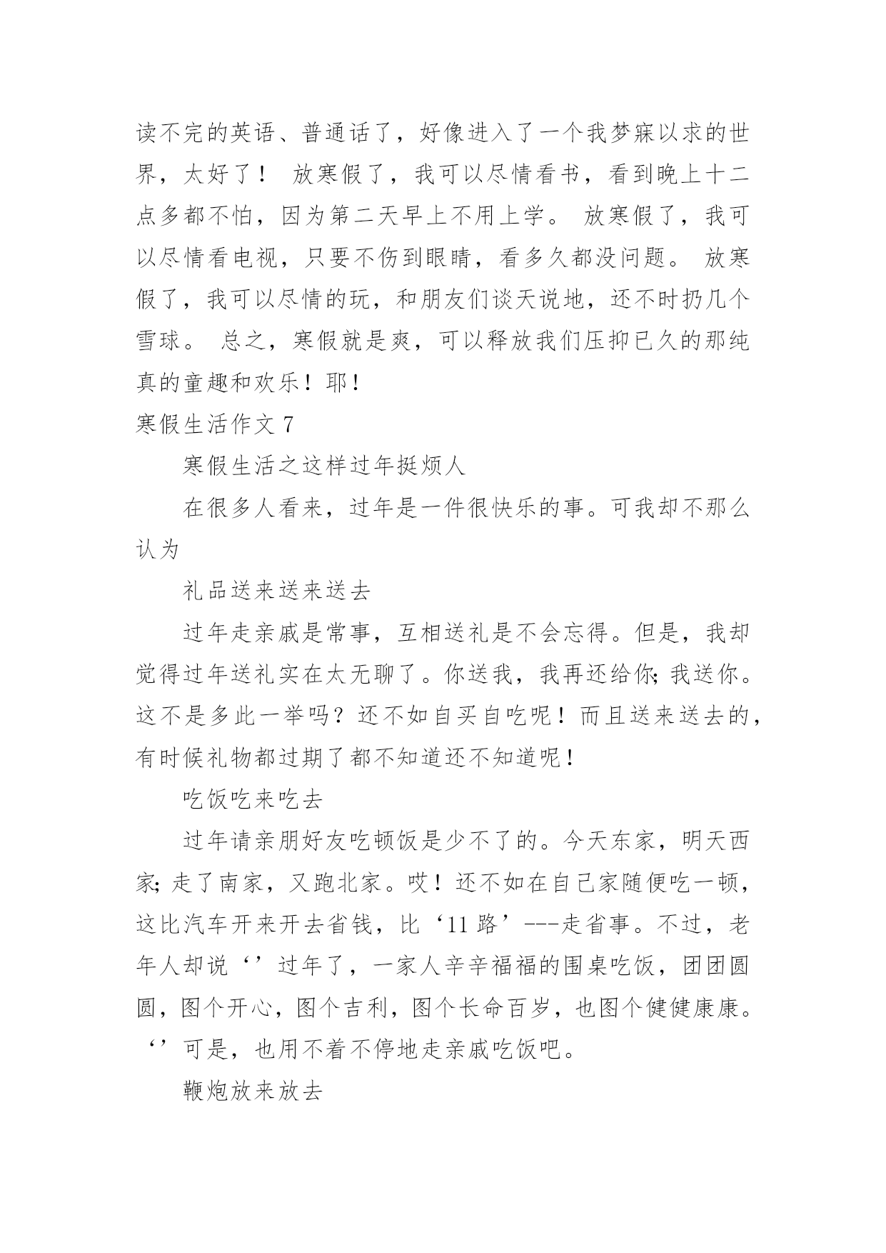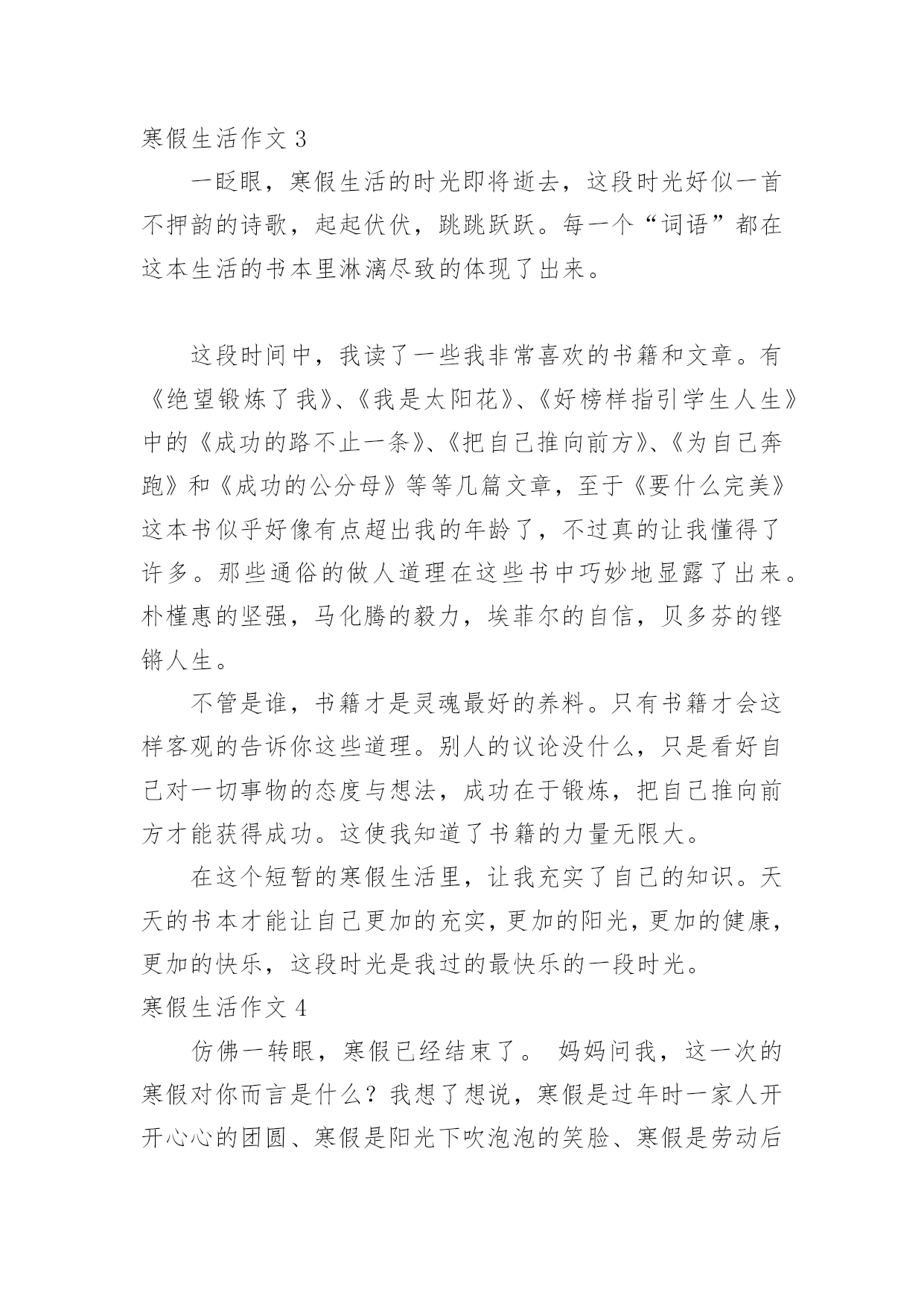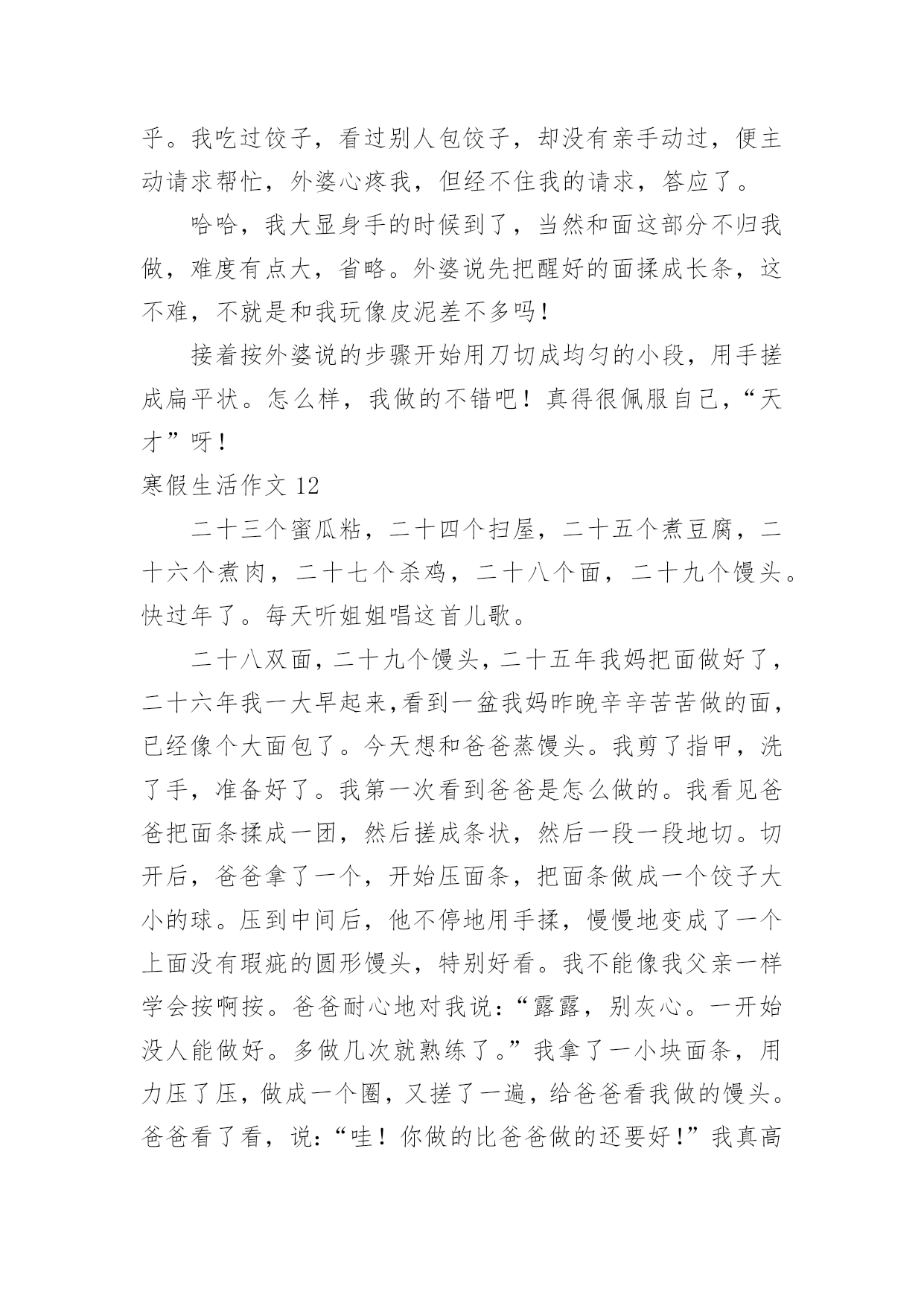 寒假生活作文寒假生活作文(合集15篇)在平日的学习、工作和生活里,大家都接触过作文吧,作文一定要做到主题集中,围绕同一主题作深入阐述,切忌东拉西扯,主题涣散甚至无主题。那么问题来了,到底应如何写一篇优秀的作文呢?以下是小编为大家整理的寒假生活作文,希望对大家有所帮助。寒假生活作文1今天我们去了雅戈尔动物园,本来高高兴兴地去了,妈妈也在网上买好了票。但是还没到门口,我就被汽车排起的长龙惊呆了。我们慢慢地往前挪,我想如果车子可以飞直接飞过堵车的地方就好了。等慢慢开到公园门口那里也是人山人海,我们找了很久的车位也没有找到,最后我们只能退票走了,还损失了很多票钱。我想车子,如果可以变形成一颗胶囊,我直接把它放在口袋里就好了,那样我们就不用车位了。想着想着我突然发现路面的车都没有了,变得非常通畅。天上还飞着好多五颜六色的汽车。啊原来因为我发明了一款会飞的汽车,这种车和普通的汽车差别,可大了他的形象像一只大鸟头和身子,都是细长的可以根据环境和季节变换颜色。它的翅膀由最新智能材料制成可以自由伸缩它的身长2米,也是可以随意伸缩的。重量比一个小孩的体重还要亲这款汽车前窗是一个导航,每当你出门时,他会自动为你选好路线,而且只要你堵车了,就只要轻轻按下按钮,它就会张开翅膀飞上天空快速将你送到,如果你仔细观察就会发现,他的顶可以变成一个降落伞,在需要时就会自动开启。我还在为别人介绍的津津有味突然听到妈妈在叫我,原来我们已经到家了,我做了一个美梦,真想让梦想照进现实。寒假生活作文2一、工作方面1、寒假里,我们组的老师按照不同的单元分工,各自备了一部分自己认为比较擅长的课。用原有的学校教案模板,加上全组老师教学设计的第一稿,形成了一本属于我们自己的教案集。粗略地制订了下学期的教学进度。2、依学校要求读一本书《差异、差距》,完成读书笔记。还读了严歌苓、莫言的多篇小说,老舍的散文集,还读了《教育心理学》部分章节。3、利用上学期的博客资源,写了一篇教学故事。4、利用校信通、QQ群给家长讲预习的好处,让家长有意识地带孩子在生活中找下学期学习的内容,对要学的知识形成初步的认识。二、生活方面1、指导女儿预习了三下语文、数学,完成所有作业内容。2、在节前节后的一日三餐中,尽力替婆婆分担一些,让为我们忙碌一年的公公婆婆有时间出去休闲娱乐一下。寒假生活作文3一眨眼,寒假生活的时光即将逝去,这段时光好似一首不押韵的诗歌,起起伏伏,跳跳跃跃。每一个“词语”都在这本生活的书本里淋漓尽致的体现了出来。这段时间中,我读了一些我非常喜欢的书籍和文章。有《绝望锻炼了我》、《我是太阳花》、《好榜样指引学生人生》中的《成功的路不止一条》、《把自己推向前方》、《为自己奔跑》和《成功的公分母》等等几篇文章,至于《要什么完美》这本书似乎好像有点超出我的年龄了,不过真的让我懂得了许多。那些通俗的做人道理在这些书中巧妙地显露了出来。朴槿惠的坚强,马化腾的毅力,埃菲尔的自信,贝多芬的铿锵人生。不管是谁,书籍才是灵魂最好的养料。只有书籍才会这样客观的告诉你这些道理。别人的议论没什么,只是看好自己对一切事物的态度与想法,成功在于锻炼,把自己推向前方才能获得成功。这使我知道了书籍的力量无限大。在这个短暂的寒假生活里,让我充实了自己的知识。天天的书本才能让自己更加的充实,更加的阳光,更加的健康,更加的快乐,这段时光是我过的最快乐的一段时光。寒假生活作文4仿佛一转眼,寒假已经结束了。妈妈问我,这一次的寒假对你而言是什么?我想了想说,寒假是过年时一家人开开心心的团圆、寒假是阳光下吹泡泡的笑脸、寒假是劳动后满满的成就感、寒假还是我对老师同学们微微的想念……下面请听我来说一说。洗纱窗今天晴好,阳光照在身上暖暖的。马上要过年了,爸爸提议把家里的纱窗拆下来洗一洗。我非常愿意帮忙。我由于还比较小,一次就拿了一扇下楼。虽然很轻,但是因为楼梯有坡度,对我来说还是有点困难,但是看到妈妈在身后保护着我,我很安心,也就不那么害怕了。来到车库门口,爸爸负责先冲水,我负责刷窗框框。忽然,一阵风吹来,好冷啊!我感觉风爷爷直往我领子里钻,但是想到可以洗刷刷,我还是很开心。洗了一会,我的“新鲜劲”过去了,我有点想放弃了,但是想到老师说过,做任何事都要坚持,我想想还是要坚持下去的,因为我想做“有毅力”的小朋友。最后,我和爸爸一起完成了所有任务,看到阳光下干净的纱窗,我开心极了,心里像吃了蜜一样甜!我想,这就是劳动的成就感吧!寒假生活作文5不知不觉寒假开始了。今天是大年初二,我坐上爸爸的车一起去看表演了。爸爸告诉我表演的题目叫:“戚家军打倭寇。”我一听到这个题目就觉得很好看。我们到了戚宫祠,爸爸告诉我这里就是戚家军打倭寇表演的地方,一下车,我就直接跑上去了,好多个台阶,跑地我气喘吁吁的。一到那里,看到有穿着戚家军的衣服,有的穿着倭寇的衣服,还