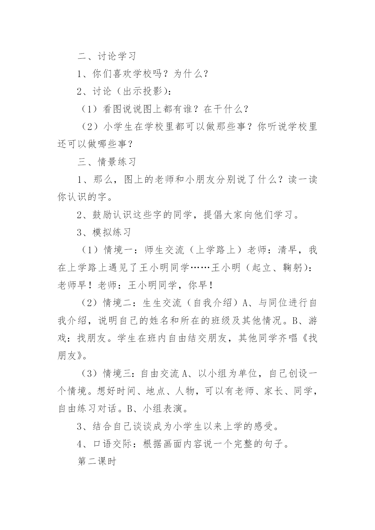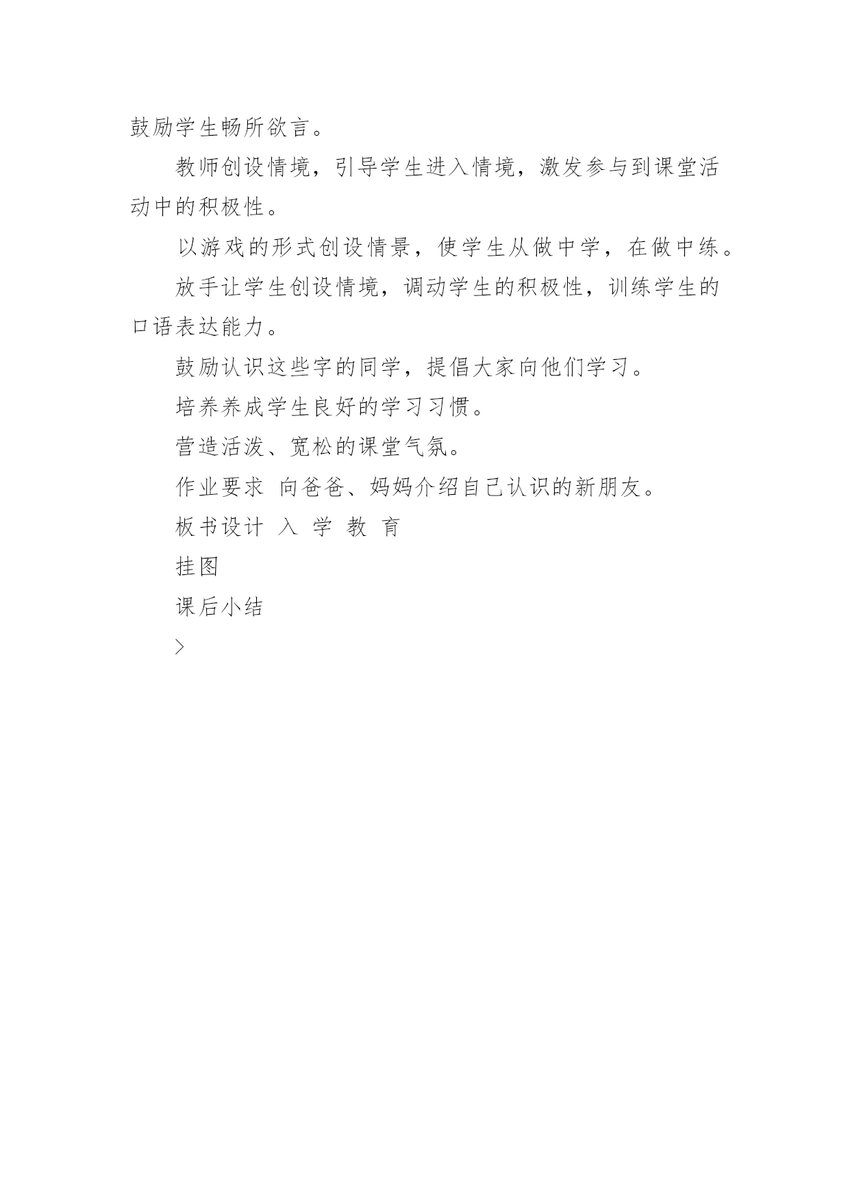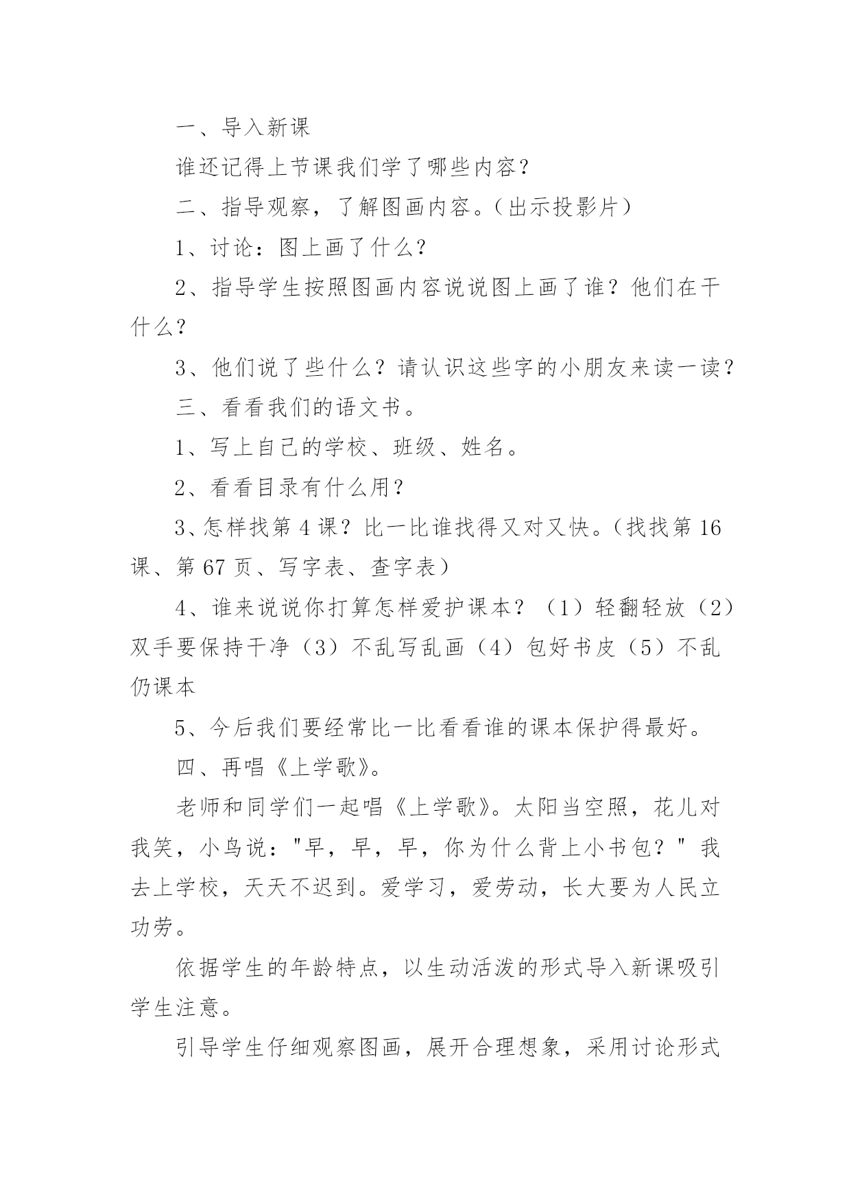 《上学了》的教学设计关于《上学了》的教学设计关于《上学了》的教学设计课题:入学教育课型:新授课时:2双基目标:★1、新生大体了解学校的学习生活,感受教师的温暖、同学的友爱和校园生活的丰富多彩。△2、依据画面提示,进行尊敬老师、遵守纪律、团结友爱、养成良好学习习惯等方面的入学常规教育。能力目标★培养学生的观察能力、逻辑思维能力和口语交际能力。道德情感目标教育学生热爱学校、喜欢上学、喜欢老师、喜欢同学,培养学生养成良好的学习习惯,喜欢课本、爱护课本。教具投影片、投影仪、录音机教学过程第一课时一、导入新课1、同学们,从今天起,你们就正式成为一名小学生了,你们高兴吗?2、让我们一起唱首歌好吗?跟录音齐唱《上学歌》。二、讨论学习1、你们喜欢学校吗?为什么?2、讨论(出示投影):(1)看图说说图上都有谁?在干什么?(2)小学生在学校里都可以做那些事?你听说学校里还可以做哪些事?三、情景练习1、那么,图上的老师和小朋友分别说了什么?读一读你认识的字。2、鼓励认识这些字的同学,提倡大家向他们学习。3、模拟练习(1)情境一:师生交流(上学路上)老师:清早,我在上学路上遇见了王小明同学……王小明(起立、鞠躬):老师早!老师:王小明同学,你早!(2)情境二:生生交流(自我介绍)A、与同位进行自我介绍,说明自己的姓名和所在的班级及其他情况。B、游戏:找朋友。学生在班内自由结交朋友,其他同学齐唱《找朋友》。(3)情境三:自由交流A、以小组为单位,自己创设一个情境。想好时间、地点、人物,可以有老师、家长、同学,自由练习对话。B、小组表演。3、结合自己谈谈成为小学生以来上学的感受。4、口语交际:根据画面内容说一个完整的句子。第二课时一、导入新课谁还记得上节课我们学了哪些内容?二、指导观察,了解图画内容。(出示投影片)1、讨论:图上画了什么?2、指导学生按照图画内容说说图上画了谁?他们在干什么?3、他们说了些什么?请认识这些字的小朋友来读一读?三、看看我们的语文书。1、写上自己的学校、班级、姓名。2、看看目录有什么用?3、怎样找第4课?比一比谁找得又对又快。(找找第16课、、写字表、查字表)4、谁来说说你打算怎样爱护课本?(1)轻翻轻放(2)双手要保持干净(3)不乱写乱画(4)包好书皮(5)不乱仍课本5、今后我们要经常比一比看看谁的课本保护得最好。四、再唱《上学歌》。老师和同学们一起唱《上学歌》。太阳当空照,花儿对我笑,小鸟说:"早,早,早,你为什么背上小书包?"我去上学校,天天不迟到。爱学习,爱劳动,长大要为人民立功劳。依据学生的年龄特点,以生动活泼的形式导入新课吸引学生注意。引导学生仔细观察图画,展开合理想象,采用讨论形式鼓励学生畅所欲言。教师创设情境,引导学生进入情境,激发参与到课堂活动中的积极性。以游戏的形式创设情景,使学生从做中学,在做中练。放手让学生创设情境,调动学生的积极性,训练学生的口语表达能力。鼓励认识这些字的同学,提倡大家向他们学习。培养养成学生良好的学习习惯。营造活泼、宽松的课堂气氛。作业要求向爸爸、妈妈介绍自己认识的新朋友。板书设计入学教育挂图课后小结>