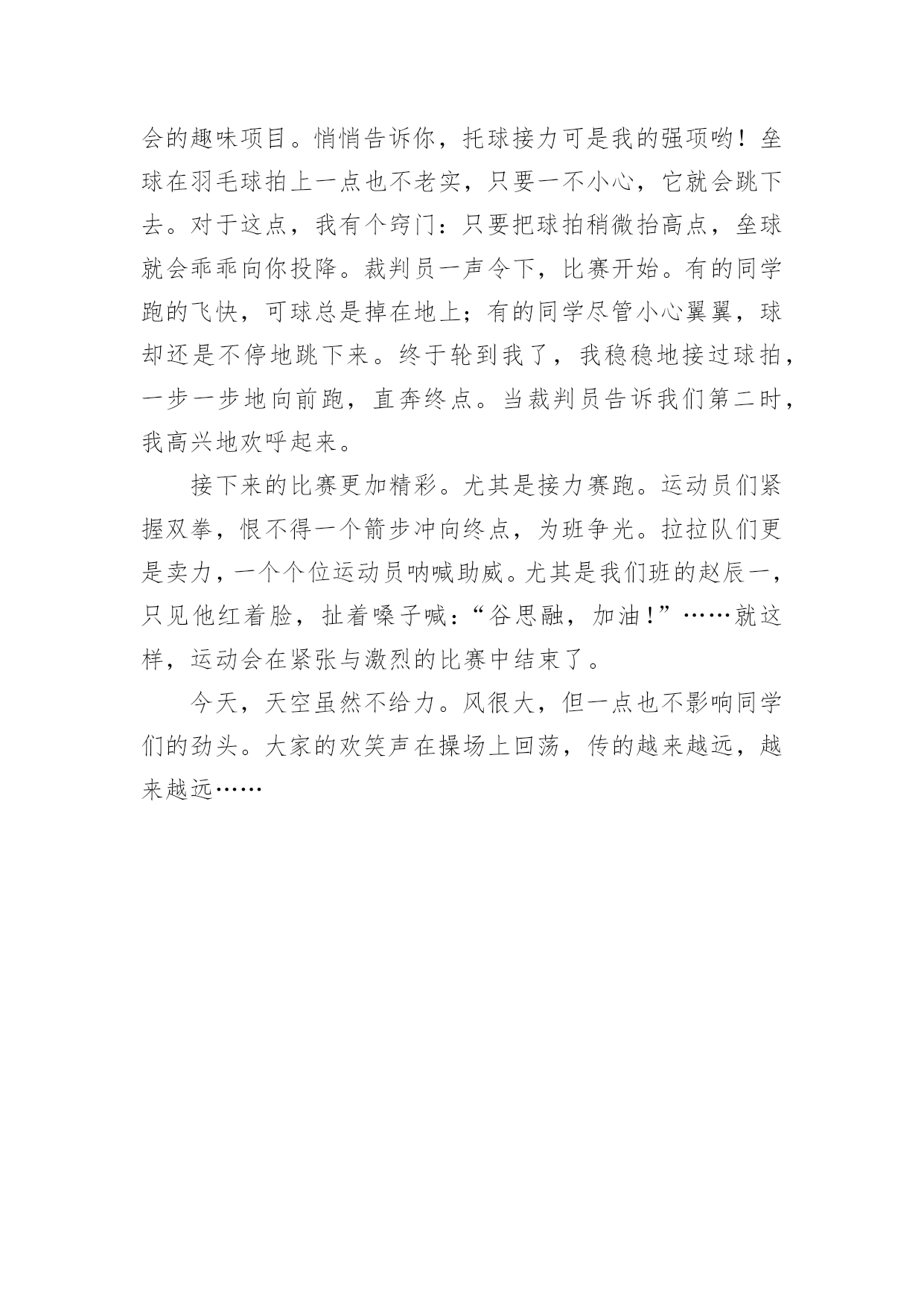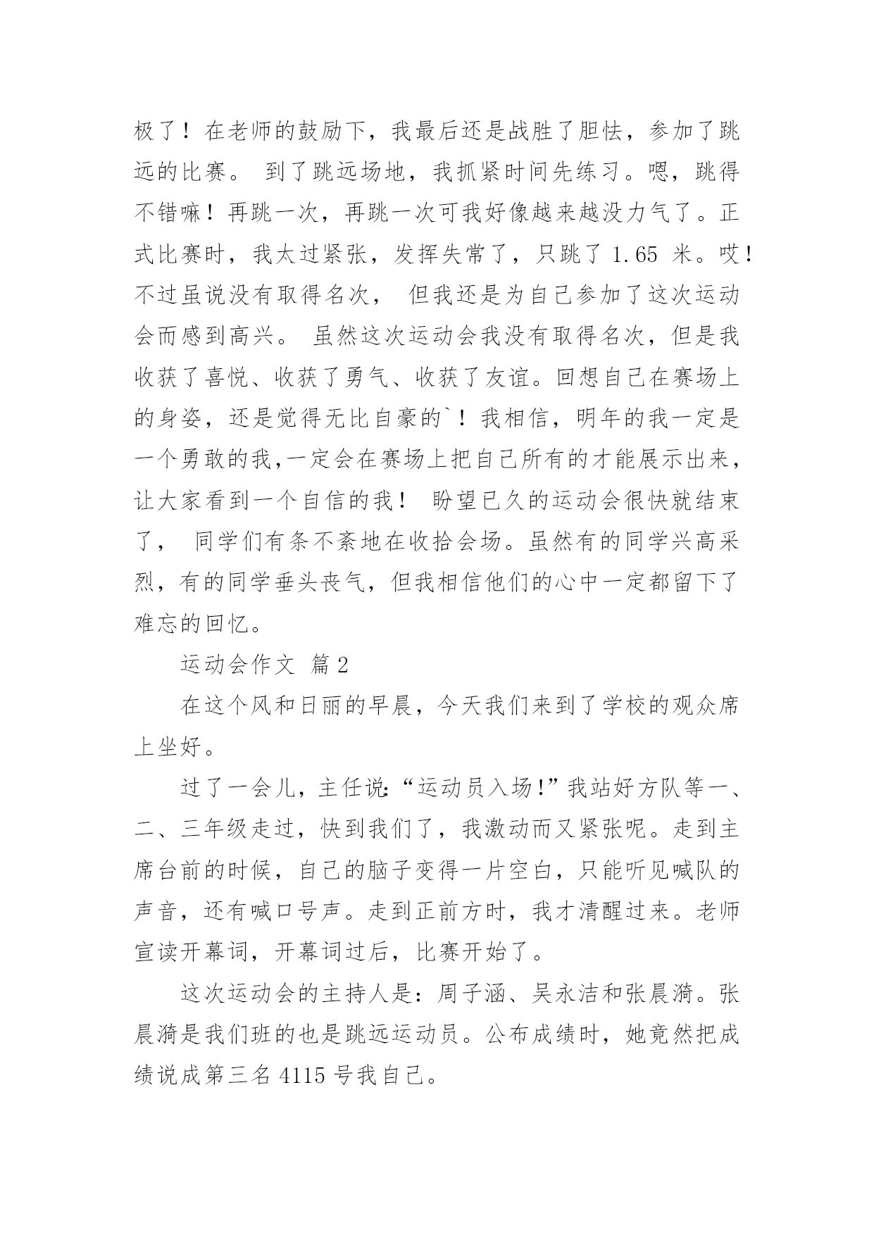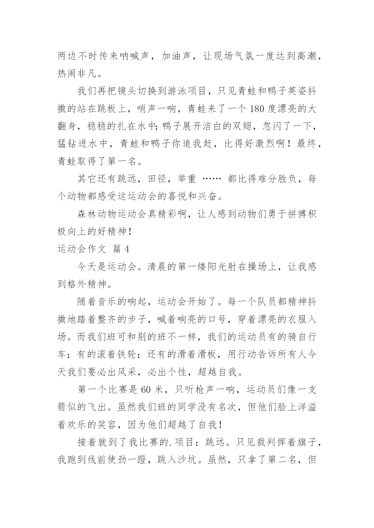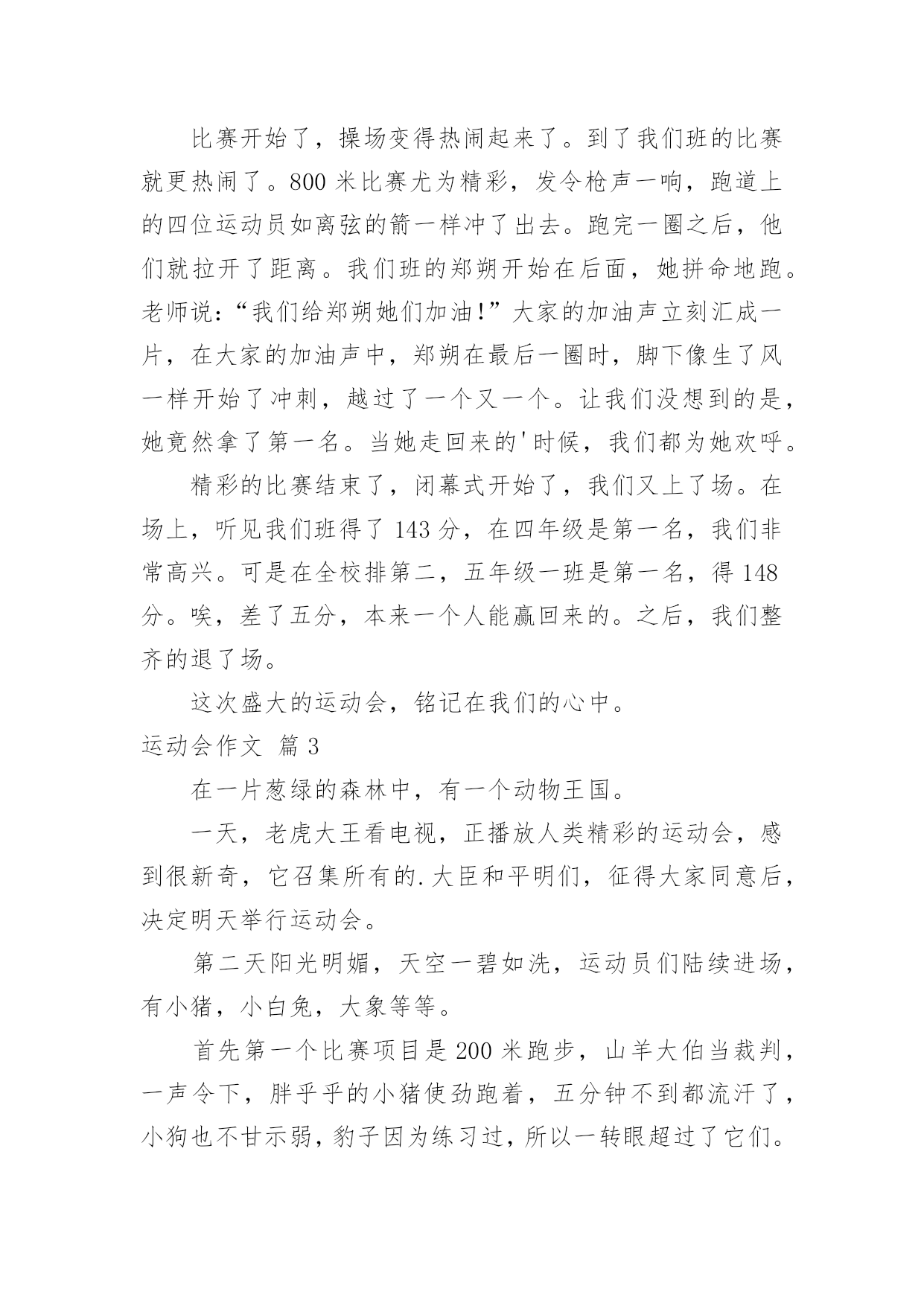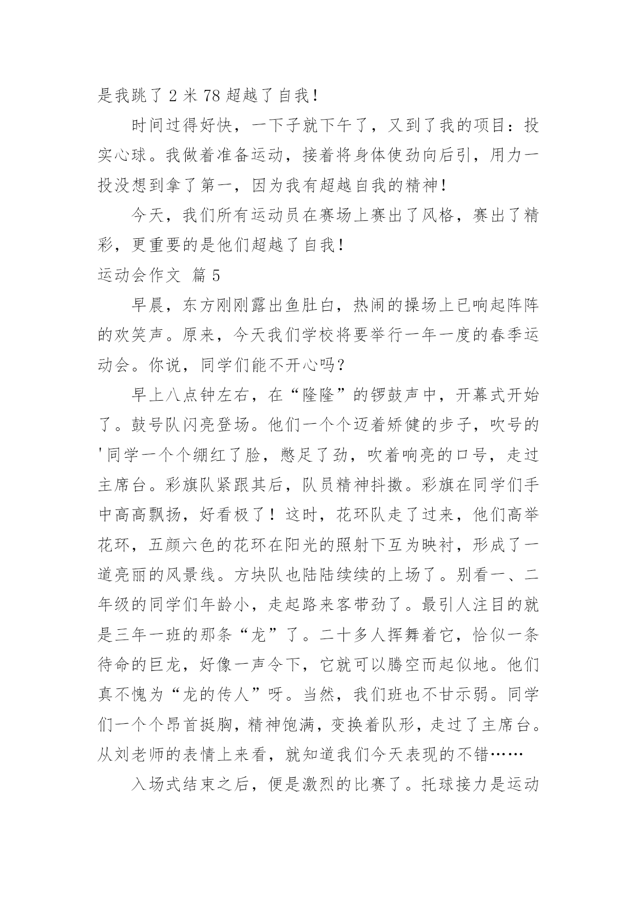 运动会作文关于运动会作文汇编5篇无论是身处学校还是步入社会,许多人都写过作文吧,作文是经过人的思想考虑和语言组织,通过文字来表达一个主题意义的记叙方法。如何写一篇有思想、有文采的作文呢?下面是小编收集整理的运动会作文5篇,希望对大家有所帮助。运动会作文篇1运动会不仅是实力和友谊的竞争,还是我们增加勇气,战胜自己的机会。七月,是我们展示自己的时刻;七月,是我们证明实力的时刻;七月的脚步逐渐加快了我们盼望的七月终于到来了。在开运动会的前夕,大家抓紧时间布置会场,同学们有的搬桌子,有的搬椅子,好不热闹。校园里各个地方张灯结彩、红旗招展,各种各样的气球在空中飘荡。终于迎来了开幕式,在热烈的掌声中,大家选好位置后开始入座。随着礼炮声的响起,一支支接受检阅的队伍向会场走来,我也身在其中。我所在的队伍是标牌队,是脚步最整齐的一队!在检阅队伍整齐划一的踏步声中,解说员开始了那慷慨激昂的解说,说得大家是信心倍增,只等着“摘金夺银”了!开始的时候,我不敢报项目,因为我跑的太慢了,容易拖班级的后腿。而我喜欢的跳远项目,又怕跳得太近被同学笑话。我的心里很矛盾,可看着那些勇敢的同学个个在赛道上你追我赶、互不相让的样子,我羡慕极了!在老师的鼓励下,我最后还是战胜了胆怯,参加了跳远的比赛。到了跳远场地,我抓紧时间先练习。嗯,跳得不错嘛!再跳一次,再跳一次可我好像越来越没力气了。正式比赛时,我太过紧张,发挥失常了,只跳了1.65米。哎!不过虽说没有取得名次,但我还是为自己参加了这次运动会而感到高兴。虽然这次运动会我没有取得名次,但是我收获了喜悦、收获了勇气、收获了友谊。回想自己在赛场上的身姿,还是觉得无比自豪的`!我相信,明年的我一定是一个勇敢的我,一定会在赛场上把自己所有的才能展示出来,让大家看到一个自信的我!盼望已久的运动会很快就结束了,同学们有条不紊地在收拾会场。虽然有的同学兴高采烈,有的同学垂头丧气,但我相信他们的心中一定都留下了难忘的回忆。运动会作文篇2在这个风和日丽的早晨,今天我们来到了学校的观众席上坐好。过了一会儿,主任说:“运动员入场!”我站好方队等一、二、三年级走过,快到我们了,我激动而又紧张呢。走到主席台前的时候,自己的脑子变得一片空白,只能听见喊队的声音,还有喊口号声。走到正前方时,我才清醒过来。老师宣读开幕词,开幕词过后,比赛开始了。这次运动会的主持人是:周子涵、吴永洁和张晨漪。张晨漪是我们班的也是跳远运动员。公布成绩时,她竟然把成绩说成第三名4115号我自己。比赛开始了,操场变得热闹起来了。到了我们班的比赛就更热闹了。800米比赛尤为精彩,发令枪声一响,跑道上的四位运动员如离弦的箭一样冲了出去。跑完一圈之后,他们就拉开了距离。我们班的郑朔开始在后面,她拼命地跑。老师说:“我们给郑朔她们加油!”大家的加油声立刻汇成一片,在大家的加油声中,郑朔在最后一圈时,脚下像生了风一样开始了冲刺,越过了一个又一个。让我们没想到的是,她竟然拿了第一名。当她走回来的'时候,我们都为她欢呼。精彩的比赛结束了,闭幕式开始了,我们又上了场。在场上,听见我们班得了143分,在四年级是第一名,我们非常高兴。可是在全校排第二,五年级一班是第一名,得148分。唉,差了五分,本来一个人能赢回来的。之后,我们整齐的退了场。这次盛大的运动会,铭记在我们的心中。运动会作文篇3在一片葱绿的森林中,有一个动物王国。一天,老虎大王看电视,正播放人类精彩的运动会,感到很新奇,它召集所有的.大臣和平明们,征得大家同意后,决定明天举行运动会。第二天阳光明媚,天空一碧如洗,运动员们陆续进场,有小猪,小白兔,大象等等。首先第一个比赛项目是200米跑步,山羊大伯当裁判,一声令下,胖乎乎的小猪使劲跑着,五分钟不到都流汗了,小狗也不甘示弱,豹子因为练习过,所以一转眼超过了它们。两边不时传来呐喊声,加油声,让现场气氛一度达到高潮,热闹非凡。我们再把镜头切换到游泳项目,只见青蛙和鸭子英姿抖擞的站在跳板上,哨声一响,青蛙来了一个180度漂亮的大翻身,稳稳的扎在水中;鸭子展开洁白的双翅,忽闪了一下,猛钻进水中,青蛙和鸭子你追我赶,比得好激烈啊!最终,青蛙取得了第一名。其它还有跳远,田径,举重……都比得难分胜负,每个动物都感受这运动会的喜悦和兴奋。森林动物运动会真精彩啊,让人感到动物们勇于拼搏积极向上的好精神!运动会作文篇4今天是运动会。清晨的第一缕阳光射在操场上,让我感到格外精神。随着音乐的响起,运动会开始了。每一个队员都精神抖擞地踏着整齐的步子,喊着响亮的口号,穿着漂亮的衣服入场。而我们班可和别的班不一样,我们的运动员有的骑自行车;有的滚着铁轮;还有的滑着滑板,用行动告诉所有人今天我们要必出风采,必出个性,超越自我。第一个比赛是60米,只听枪声一响,运动员们像一支箭似的飞出。虽然我们班的同学没有名
