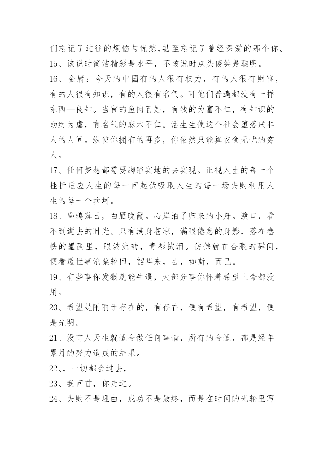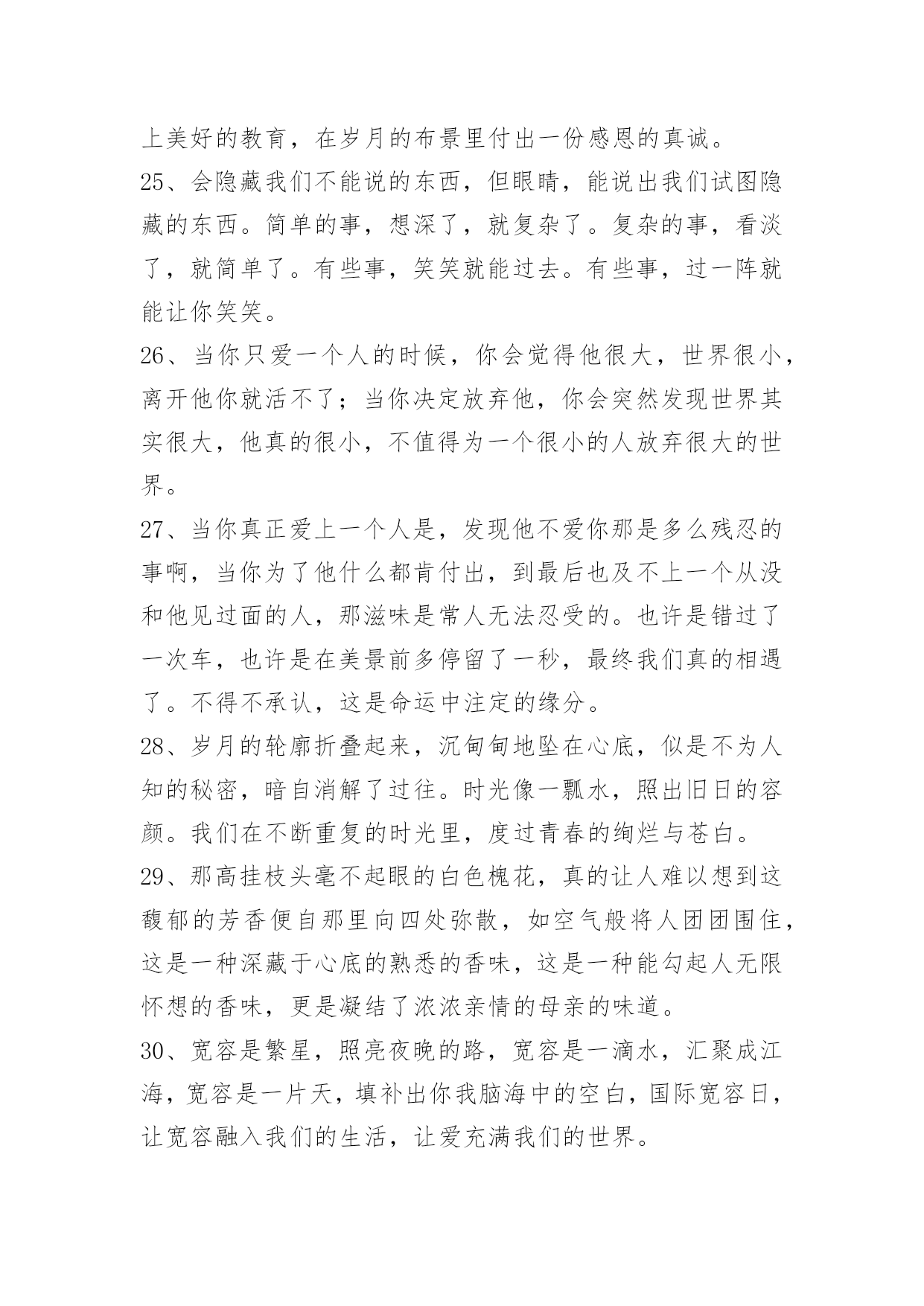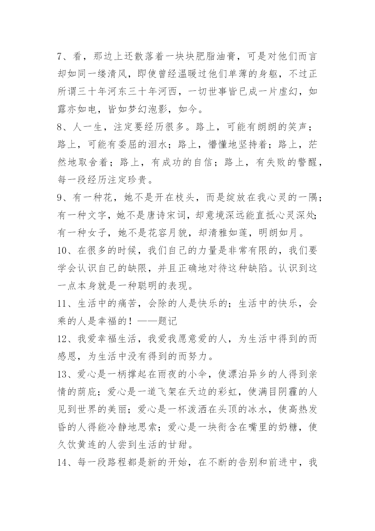 感悟生活的句子2023年有关感悟生活的句子合集45句不需要惊天动地的伟业,不需轰轰烈烈的人生,我们内心深处的感动就像绵绵不断的春雨,将沉睡一冬的万物叫醒,洗涤我们的灵魂。打开人们心灵的天窗,给心底以光亮,点亮世人心中的无知,唤醒社会愚昧的地方,让这份感动永驻人间,让温暖不断传递下去吧!如果我们心念他人,伸出发爱的双手,那么众人的力量可以托起一片湛蓝的天空。以下是小编整理的感悟生活的句子45句,仅供参考,大家一起来看看吧。1、我努力平静下来的心,只要一碰到你,就全盘瓦解了。2、我只能凭着自己一个人的努力,找回属于自己的东西。3、你做梦的时候,总有人在努力,这世界就是这么残酷。4、爱一个人,就给他充裕的空间。别可以去探询他秘密,别奢望了解他的全部,在乎一个人,就给他足够的自由。别随意去束缚他的行为,更别妄想去改变他的生活。5、不愿打扰他的生活,只是想了解他的近况。但从来不留下任何痕迹,只是怕他会感觉不知所措。那种关心,不需要他了解。其实,那只是给自己的安慰而已。6、当我是个玲珑少年的时候,对爱情的解读自信得可谓人木三分,爱情就是那让人死去活来的东西,地老天荒地忠贞不渝的东西,沧海桑田地伴你到黎明的东西。7、看,那边上还散落着一块块肥脂油膏,可是对他们而言却如同一缕清风,即使曾经温暖过他们单薄的身躯,不过正所谓三十年河东三十年河西,一切世事皆已成一片虚幻,如露亦如电,皆如梦幻泡影,如今。8、人一生,注定要经历很多。路上,可能有朗朗的笑声;路上,可能有委屈的泪水;路上,懵懂地坚持着;路上,茫然地取舍着;路上,有成功的自信;路上,有失败的警醒,每一段经历注定珍贵。9、有一种花,她不是开在枝头,而是绽放在我心灵的一隅;有一种文字,她不是唐诗宋词,却意境深远能直抵心灵深处;有一种女子,她不是花容月貌,却清雅如莲,明朗如月。10、在很多的时候,我们自己的力量是非常有限的,我们要学会认识自己的缺限,并且正确地对待这种缺陷。认识到这一点本身就是一种聪明的表现。11、生活中的痛苦,会除的人是快乐的;生活中的快乐,会乘的人是幸福的!——题记12、我爱幸福生活,我爱我愿意爱的人,为生活中得到的而感恩,为生活中没有得到的而努力。13、爱心是一柄撑起在雨夜的小伞,使漂泊异乡的人得到亲情的荫庇;爱心是一道飞架在天边的彩虹,使满目阴霾的人见到世界的美丽;爱心是一杯泼洒在头顶的冰水,使高热发昏的人得能冷静地思索;爱心是一块衔含在嘴里的奶糖,使久饮黄连的人尝到生活的甘甜。14、每一段路程都是新的开始,在不断的告别和前进中,我们忘记了过往的烦恼与忧愁,甚至忘记了曾经深爱的那个你。15、该说时简洁精彩是水平,不该说时点头傻笑是聪明。16、金庸:今天的中国有的人很有权力,有的人很有财富,有的人很有知识,有的人很有名气。可他们普遍都没有一样东西—良知。当官的鱼肉百姓,有钱的为富不仁,有知识的助纣为虐,有名气的麻木不仁。活生生使这个社会堕落成非人的人间。纵使你拥有的再多,你依然只能算衣食无忧的穷人。17、任何梦想都需要脚踏实地的去实现。正视人生的每一个挫折适应人生的每一回起伏吸取人生的每一场失败利用人生的每一个坎坷。18、昏鸦落日,白雁晚霞。心岸泊了归来的小舟。渡口,看不到逝去的时光。只有满身苍凉,满眼倦怠的身影,落在卷帙的墨画里,眼波流转,青衫拭泪。仿佛就在合眼的瞬间,便看透世事沧桑轮回,韶华来,去,如斯,而已。19、有些事你发狠就能牛逼,大部分事你怀着希望上命都没用。20、希望是附丽于存在的,有存在,便有希望,有希望,便是光明。21、没有人天生就适合做任何事情,所有的合适,都是经年累月的努力造成的结果。22、,一切都会过去,23、我回首,你走远。24、失败不是理由,成功不是最终,而是在时间的光轮里写上美好的教育,在岁月的布景里付出一份感恩的真诚。25、会隐藏我们不能说的东西,但眼睛,能说出我们试图隐藏的东西。简单的事,想深了,就复杂了。复杂的事,看淡了,就简单了。有些事,笑笑就能过去。有些事,过一阵就能让你笑笑。26、当你只爱一个人的时候,你会觉得他很大,世界很小,离开他你就活不了;当你决定放弃他,你会突然发现世界其实很大,他真的很小,不值得为一个很小的人放弃很大的世界。27、当你真正爱上一个人是,发现他不爱你那是多么残忍的事啊,当你为了他什么都肯付出,到最后也及不上一个从没和他见过面的人,那滋味是常人无法忍受的。也许是错过了一次车,也许是在美景前多停留了一秒,最终我们真的相遇了。不得不承认,这是命运中注定的缘分。28、岁月的轮廓折叠起来,沉甸甸地坠在心底,似是不为人知的秘密,暗自消解了过往。时光像一瓢水,照出旧日的容颜。我们在不断重复的时光里,度过青春的绚烂与苍白。29、那高挂枝头毫不起眼的白色槐花,真的让人难以想到这馥郁的芳香便自那里向四处弥散,如空气般将人团团