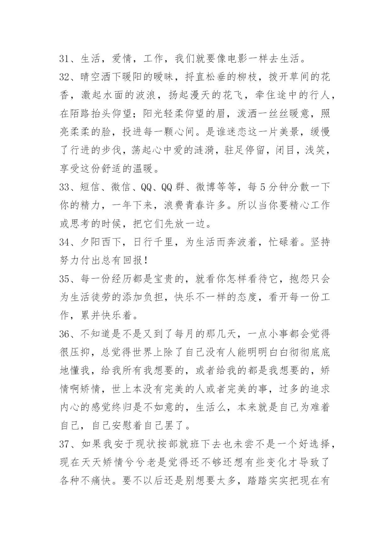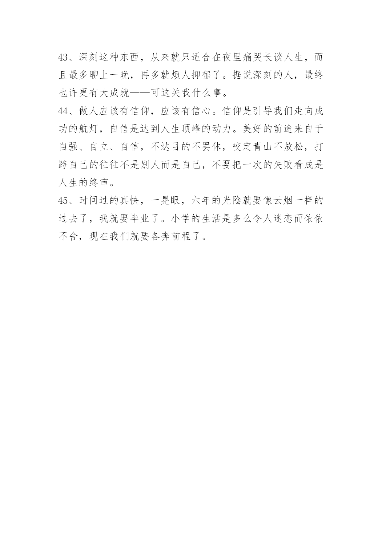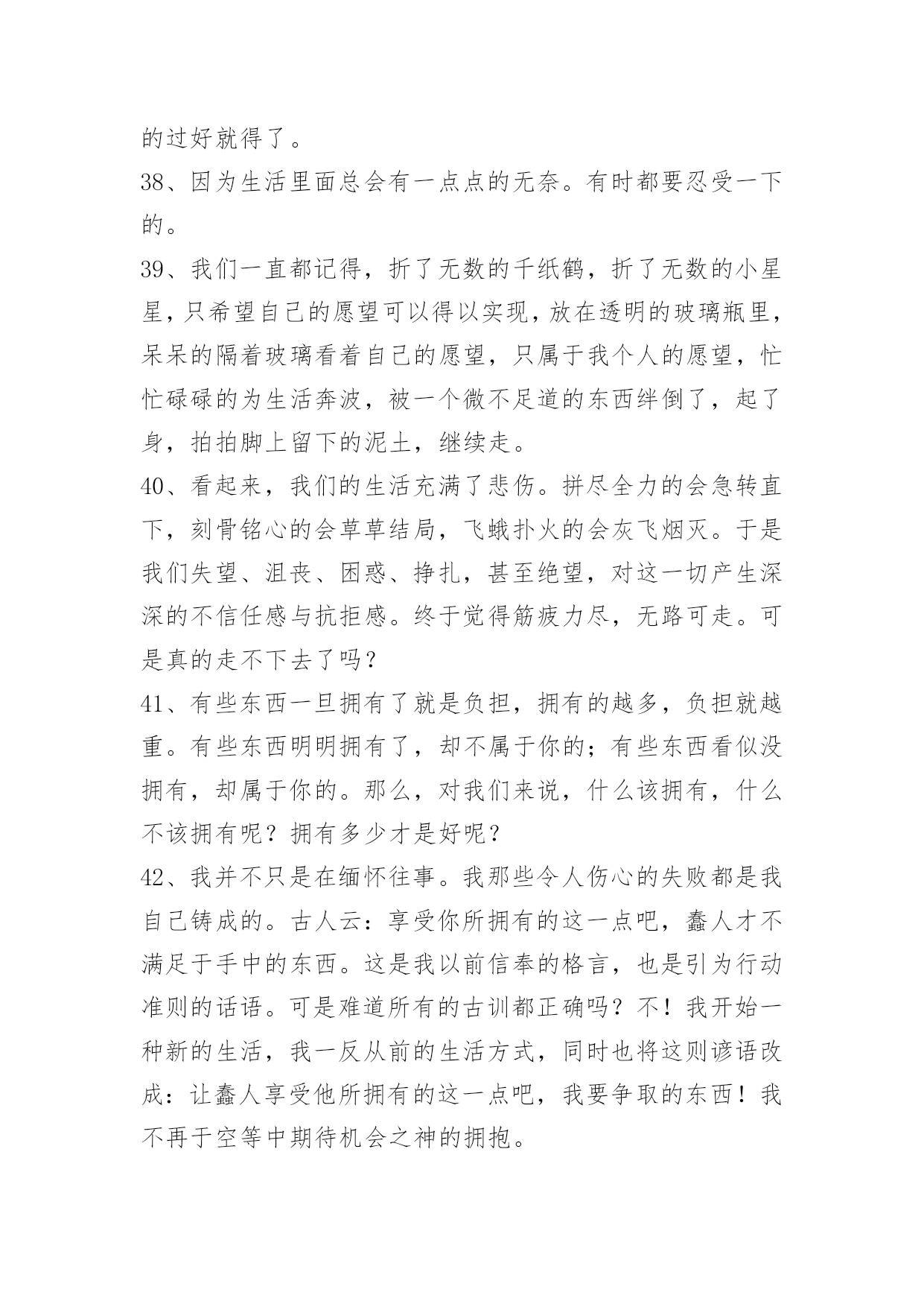 感悟生活的句子2023年有关感悟生活的句子合集45句不需要惊天动地的伟业,不需轰轰烈烈的人生,我们内心深处的感动就像绵绵不断的春雨,将沉睡一冬的万物叫醒,洗涤我们的灵魂。打开人们心灵的天窗,给心底以光亮,点亮世人心中的无知,唤醒社会愚昧的地方,让这份感动永驻人间,让温暖不断传递下去吧!如果我们心念他人,伸出发爱的双手,那么众人的力量可以托起一片湛蓝的天空。以下是小编整理的感悟生活的句子45句,仅供参考,大家一起来看看吧。1、我努力平静下来的心,只要一碰到你,就全盘瓦解了。2、我只能凭着自己一个人的努力,找回属于自己的东西。3、你做梦的时候,总有人在努力,这世界就是这么残酷。4、爱一个人,就给他充裕的空间。别可以去探询他秘密,别奢望了解他的全部,在乎一个人,就给他足够的自由。别随意去束缚他的行为,更别妄想去改变他的生活。5、不愿打扰他的生活,只是想了解他的近况。但从来不留下任何痕迹,只是怕他会感觉不知所措。那种关心,不需要他了解。其实,那只是给自己的安慰而已。6、当我是个玲珑少年的时候,对爱情的解读自信得可谓人木三分,爱情就是那让人死去活来的东西,地老天荒地忠贞不渝的东西,沧海桑田地伴你到黎明的东西。7、看,那边上还散落着一块块肥脂油膏,可是对他们而言却如同一缕清风,即使曾经温暖过他们单薄的身躯,不过正所谓三十年河东三十年河西,一切世事皆已成一片虚幻,如露亦如电,皆如梦幻泡影,如今。8、人一生,注定要经历很多。路上,可能有朗朗的笑声;路上,可能有委屈的泪水;路上,懵懂地坚持着;路上,茫然地取舍着;路上,有成功的自信;路上,有失败的警醒,每一段经历注定珍贵。9、有一种花,她不是开在枝头,而是绽放在我心灵的一隅;有一种文字,她不是唐诗宋词,却意境深远能直抵心灵深处;有一种女子,她不是花容月貌,却清雅如莲,明朗如月。10、在很多的时候,我们自己的力量是非常有限的,我们要学会认识自己的缺限,并且正确地对待这种缺陷。认识到这一点本身就是一种聪明的表现。11、生活中的痛苦,会除的人是快乐的;生活中的快乐,会乘的人是幸福的!——题记12、我爱幸福生活,我爱我愿意爱的人,为生活中得到的而感恩,为生活中没有得到的而努力。13、爱心是一柄撑起在雨夜的小伞,使漂泊异乡的人得到亲情的荫庇;爱心是一道飞架在天边的彩虹,使满目阴霾的人见到世界的美丽;爱心是一杯泼洒在头顶的冰水,使高热发昏的人得能冷静地思索;爱心是一块衔含在嘴里的奶糖,使久饮黄连的人尝到生活的甘甜。14、每一段路程都是新的开始,在不断的告别和前进中,我们忘记了过往的烦恼与忧愁,甚至忘记了曾经深爱的那个你。15、该说时简洁精彩是水平,不该说时点头傻笑是聪明。16、金庸:今天的中国有的人很有权力,有的人很有财富,有的人很有知识,有的人很有名气。可他们普遍都没有一样东西—良知。当官的鱼肉百姓,有钱的为富不仁,有知识的助纣为虐,有名气的麻木不仁。活生生使这个社会堕落成非人的人间。纵使你拥有的再多,你依然只能算衣食无忧的穷人。17、任何梦想都需要脚踏实地的去实现。正视人生的每一个挫折适应人生的每一回起伏吸取人生的每一场失败利用人生的每一个坎坷。18、昏鸦落日,白雁晚霞。心岸泊了归来的小舟。渡口,看不到逝去的时光。只有满身苍凉,满眼倦怠的身影,落在卷帙的墨画里,眼波流转,青衫拭泪。仿佛就在合眼的瞬间,便看透世事沧桑轮回,韶华来,去,如斯,而已。19、有些事你发狠就能牛逼,大部分事你怀着希望上命都没用。20、希望是附丽于存在的,有存在,便有希望,有希望,便是光明。21、没有人天生就适合做任何事情,所有的合适,都是经年累月的努力造成的结果。22、,一切都会过去,23、我回首,你走远。24、失败不是理由,成功不是最终,而是在时间的光轮里写上美好的教育,在岁月的布景里付出一份感恩的真诚。25、会隐藏我们不能说的东西,但眼睛,能说出我们试图隐藏的东西。简单的事,想深了,就复杂了。复杂的事,看淡了,就简单了。有些事,笑笑就能过去。有些事,过一阵就能让你笑笑。26、当你只爱一个人的时候,你会觉得他很大,世界很小,离开他你就活不了;当你决定放弃他,你会突然发现世界其实很大,他真的很小,不值得为一个很小的人放弃很大的世界。27、当你真正爱上一个人是,发现他不爱你那是多么残忍的事啊,当你为了他什么都肯付出,到最后也及不上一个从没和他见过面的人,那滋味是常人无法忍受的。也许是错过了一次车,也许是在美景前多停留了一秒,最终我们真的相遇了。不得不承认,这是命运中注定的缘分。28、岁月的轮廓折叠起来,沉甸甸地坠在心底,似是不为人知的秘密,暗自消解了过往。时光像一瓢水,照出旧日的容颜。我们在不断重复的时光里,度过青春的绚烂与苍白。29、那高挂枝头毫不起眼的白色槐花,真的让人难以想到这馥郁的芳香便自那里向四处弥散,如空气般将人团团