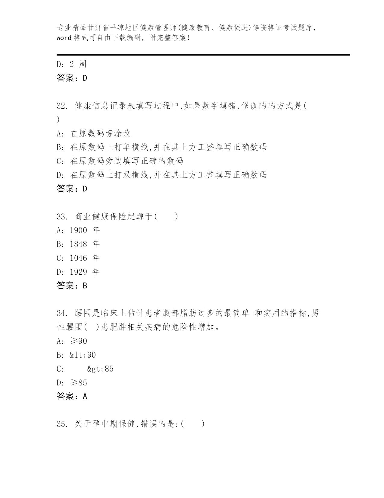 甘肃省平凉地区健康管理师(健康教育、健康促进)等资格证考试内部题库含答案【达标题】.docx
