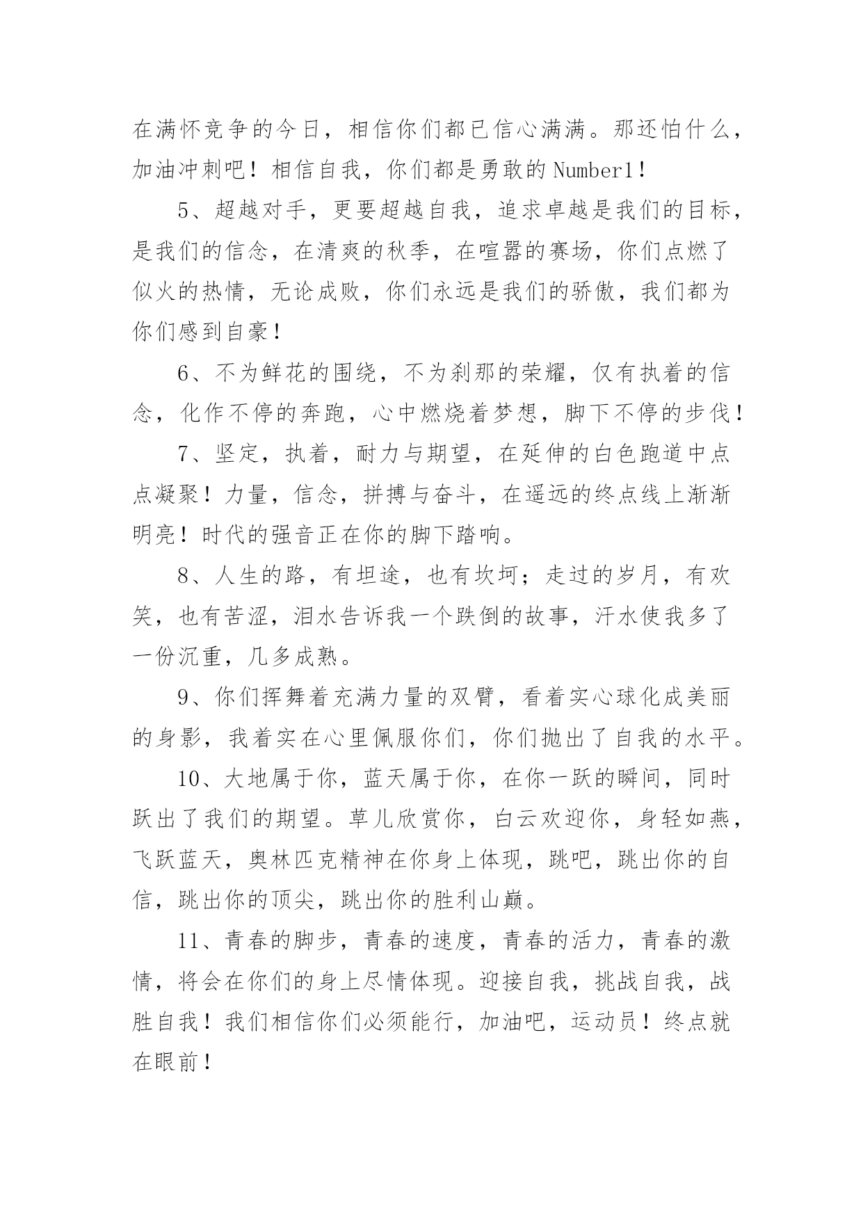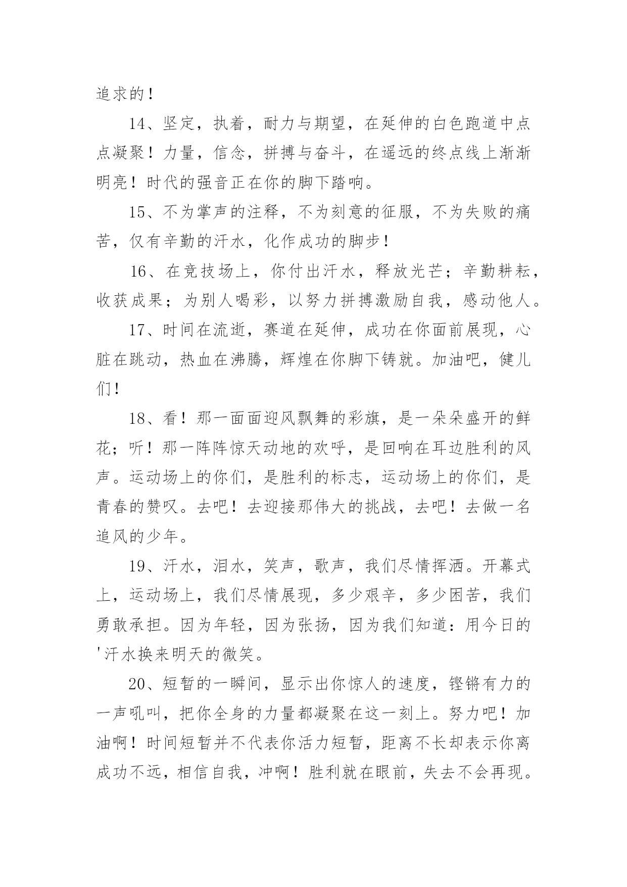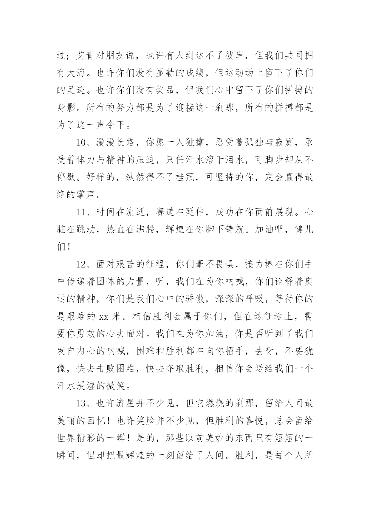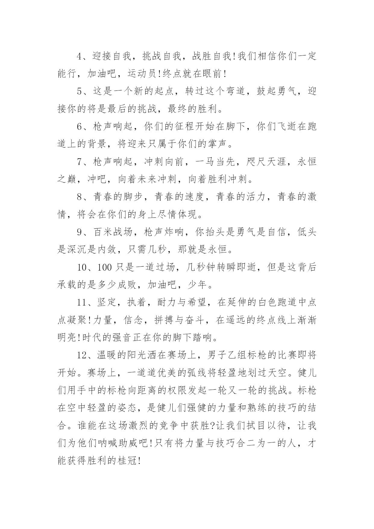 运动会加油稿【优选】运动会加油稿15篇在生活中,需要使用加油稿的情况越来越多,借助加油稿可以活跃气氛,催人奋进。你所见过的加油稿是什么样的呢?以下是小编收集整理的运动会加油稿,供大家参考借鉴,希望可以帮助到有需要的朋友。运动会加油稿1致铅球运动员铅球从你手里抛出,在空中划过一条,优美的抛物线。铅球从空中划过,落在竞赛场上,留下一个精彩的`痕迹。每一次的投掷,都是激情的展现;每一次的落地,都是努力的结果。运动会加油稿21、不长不短的距离,需要的是全身心全程投入,自始至终你们都在拼全力此时此刻,你们处在最风光的一刻,无论第几坚持胜利的信心,只要跑下来,你们就是英雄。2、时间在流逝,赛道在延伸,成功在你面前展现心脏的跳动,热血在沸腾,辉煌在你脚下铸就加油吧,健儿们!3、这是意志的拼搏。这是速度的挑战。胜利在向你们招手/胜利在向你们呼唤。4、迎接自我,挑战自我,战胜自我!我们相信你们一定能行,加油吧,运动员!终点就在眼前!5、这是一个新的起点,转过这个弯道,鼓起勇气,迎接你的将是最后的挑战,最终的胜利。6、枪声响起,你们的征程开始在脚下,你们飞逝在跑道上的背景,将迎来只属于你们的掌声。7、枪声响起,冲刺向前,一马当先,咫尺天涯,永恒之巅,冲吧,向着未来冲刺,向着胜利冲刺。8、青春的脚步,青春的速度,青春的活力,青春的激情,将会在你们的身上尽情体现。9、百米战场,枪声炸响,你抬头是勇气是自信,低头是深沉是内敛,只需几秒,那就是永恒。10、100只是一道过场,几秒钟转瞬即逝,但是这背后承载的是多少成败,加油吧,少年。11、坚定,执着,耐力与希望,在延伸的白色跑道中点点凝聚!力量,信念,拼搏与奋斗,在遥远的终点线上渐渐明亮!时代的强音正在你的脚下踏响。12、温暖的阳光洒在赛场上,男子乙组标枪的比赛即将开始。赛场上,一道道优美的弧线将轻盈地划过天空。健儿们用手中的标枪向距离的权限发起一轮又一轮的挑战。标枪在空中轻盈的姿态,是健儿们强健的力量和熟练的技巧的结合。谁能在这场激烈的竞争中获胜?让我们拭目以待,让我们为他们呐喊助威吧!只有将力量与技巧合二为一的人,才能获得胜利的桂冠!13、人生的路,有坦途,也有坎坷,走过的岁月,有欢笑,也有苦涩,泪水告诉我一个跌倒的故事,汗水使我多了一份沉重,几多成熟。理想毕竟不一样于现实,失败是生活的一部分,谁也无法选择,无法抗拒,人生要自己去拼搏,去奋斗,在风雨中百折不饶勇往直前。流泪不是失落,徘徊不是迷惑,成功属于那些战胜失败,坚持不懈,勇于追求梦想的人。14、你是运动场的心脏,跳动梦想;你是漫长路的精神,激励辉煌;你们是将上下求索的人!风为你加油,云为你助兴,坚定,执着,耐力与希望,在延伸的白色跑道中点点凝聚!力量,信念,拼搏与奋斗,在遥远的终点线上渐渐明亮!时代的强音正在你的脚下踏响。15、看,终点就在眼前,听,同学为你呼喊。鼓起勇气奋力向前,用你的荣誉带给我们希望。16、你们挥舞着充满力量的双臂看着实心球化成美丽的弧线我着实在心里佩服你们你们抛出了自己的'水平17、虽然你们在场上的时间很短暂,但你们的身影依然停留在人们的脑海里,因为你们是赛场上最可爱的人18、踏上跑道,是一种选择。离开起点,是一种勇气。驰骋赛场,是一种胜利。19、也许流星并不少见,但它燃烧的刹那,留给人间最美丽的回忆!也许笑脸并不少见,但胜利的喜悦,总会留给世界精彩的一瞬!是的,那些以前美妙的东西只有短短的一瞬间,但那却把最辉煌的一刻留给了人间。胜利,是每个人所追求的,胜利的喜悦,是胜利与重新开始的转折,胜利是新的开始!20、不长不短的距离,需要的是全身心全程投入,自始至终你们都在拼全力此时此刻,你们处在最风光的一刻,无论第几坚持胜利的信心,只要跑下来,你们就是英雄。运动会加油稿31、你没有忘记,把闪亮的青春飞扬,你没有忘记,把身姿驰向胜利的方向,风一样的驰骋,风一样的纵横,不要轻言放下,因为我们已为青春宣誓——风行天下!2、踏着春天的气息,迈着轻盈的脚步,我们迎来了心仪已久的运动会。那里就是展示自我的舞台。我们向往高山的坚忍不拔,我们渴望大海的博大精深,还有,我们更痴迷于你们的速度激情。来吧,尽情释放你的活力。你的每一次冲刺,都叩动着我们的心弦;你的每一次跨越,都吸引着我们的视线;你的每一次起跳,都绷紧我们的神经。我们为你呐喊,我们为你自豪,我们为你疯狂。3、泰戈尔在诗中说,天空没有翅膀的影子,但我已飞过;艾青对朋友说,也许有人到达不了彼岸,但我们共同拥有大海。也许你们没有显赫的成绩,但运动场上留下了你们的足迹。也许你们没有奖品,但我们心中留下了你们拼搏的身影。所有的努力都是为了迎接这一刹那,所有的拼搏都是为了这一声令下。4、九年级男子xx米预赛来临了,九年级的男同胞们,是否都准备好了?看那xx米,不长也不短,却充满着活力。在满怀竞