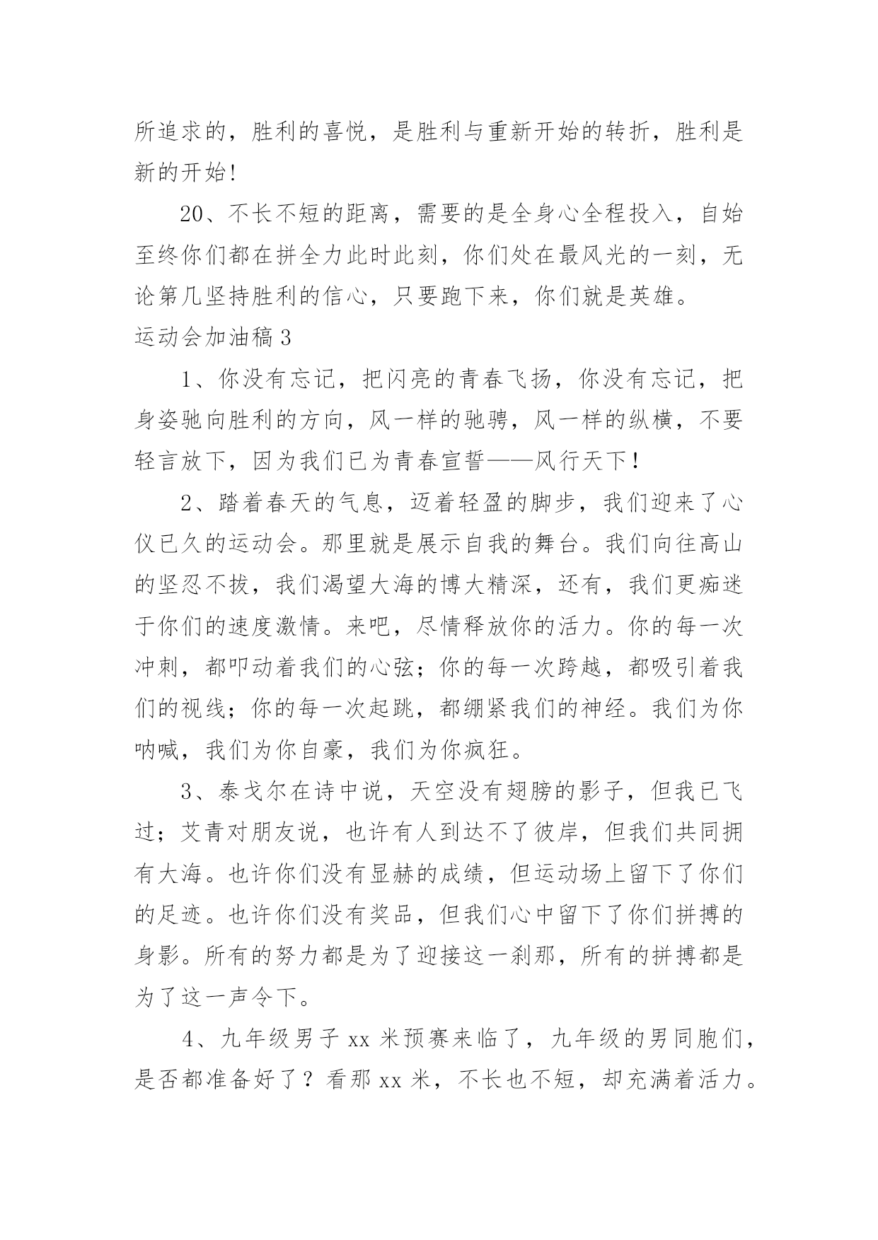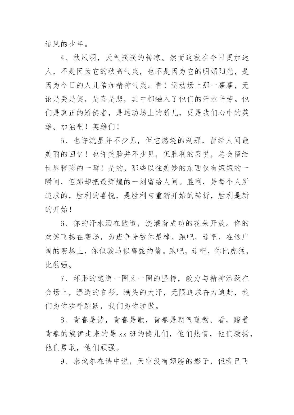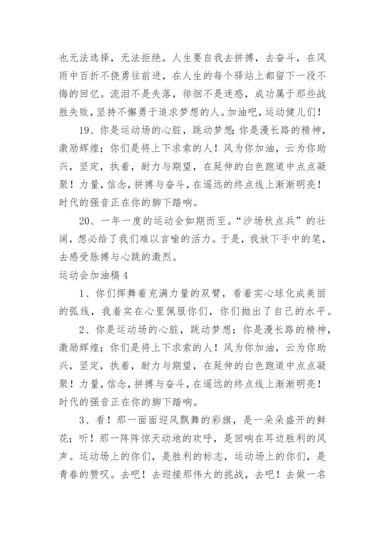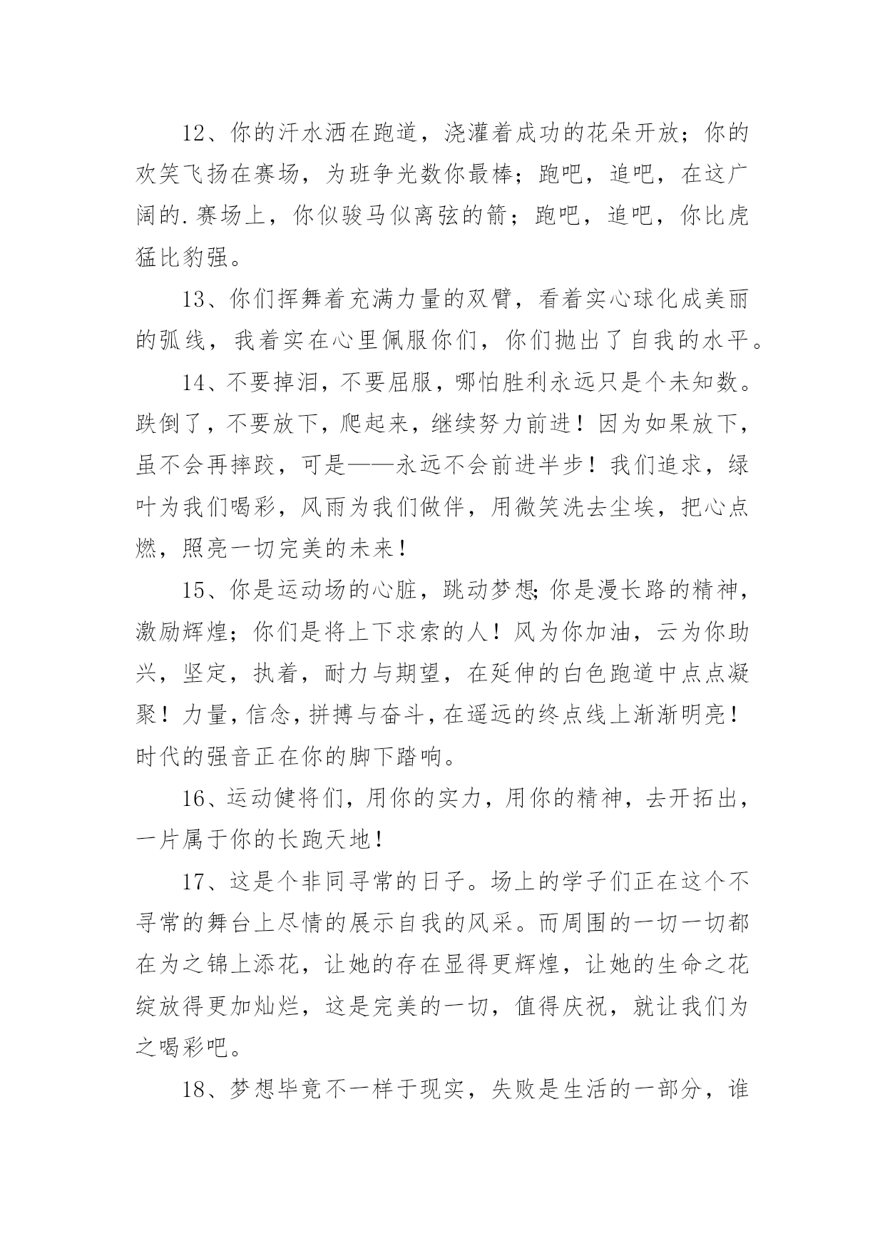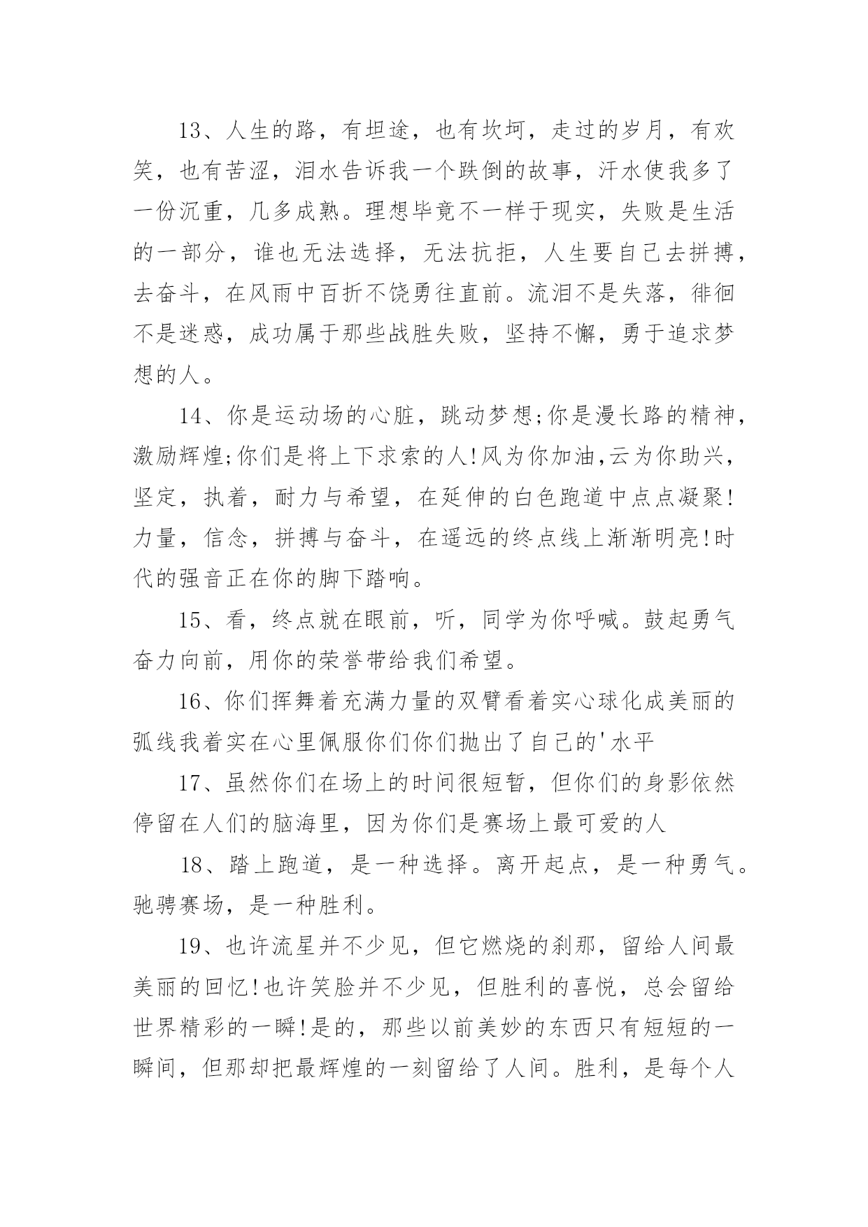 运动会加油稿【优选】运动会加油稿15篇在生活中,需要使用加油稿的情况越来越多,借助加油稿可以活跃气氛,催人奋进。你所见过的加油稿是什么样的呢?以下是小编收集整理的运动会加油稿,供大家参考借鉴,希望可以帮助到有需要的朋友。运动会加油稿1致铅球运动员铅球从你手里抛出,在空中划过一条,优美的抛物线。铅球从空中划过,落在竞赛场上,留下一个精彩的`痕迹。每一次的投掷,都是激情的展现;每一次的落地,都是努力的结果。运动会加油稿21、不长不短的距离,需要的是全身心全程投入,自始至终你们都在拼全力此时此刻,你们处在最风光的一刻,无论第几坚持胜利的信心,只要跑下来,你们就是英雄。2、时间在流逝,赛道在延伸,成功在你面前展现心脏的跳动,热血在沸腾,辉煌在你脚下铸就加油吧,健儿们!3、这是意志的拼搏。这是速度的挑战。胜利在向你们招手/胜利在向你们呼唤。4、迎接自我,挑战自我,战胜自我!我们相信你们一定能行,加油吧,运动员!终点就在眼前!5、这是一个新的起点,转过这个弯道,鼓起勇气,迎接你的将是最后的挑战,最终的胜利。6、枪声响起,你们的征程开始在脚下,你们飞逝在跑道上的背景,将迎来只属于你们的掌声。7、枪声响起,冲刺向前,一马当先,咫尺天涯,永恒之巅,冲吧,向着未来冲刺,向着胜利冲刺。8、青春的脚步,青春的速度,青春的活力,青春的激情,将会在你们的身上尽情体现。9、百米战场,枪声炸响,你抬头是勇气是自信,低头是深沉是内敛,只需几秒,那就是永恒。10、100只是一道过场,几秒钟转瞬即逝,但是这背后承载的是多少成败,加油吧,少年。11、坚定,执着,耐力与希望,在延伸的白色跑道中点点凝聚!力量,信念,拼搏与奋斗,在遥远的终点线上渐渐明亮!时代的强音正在你的脚下踏响。12、温暖的阳光洒在赛场上,男子乙组标枪的比赛即将开始。赛场上,一道道优美的弧线将轻盈地划过天空。健儿们用手中的标枪向距离的权限发起一轮又一轮的挑战。标枪在空中轻盈的姿态,是健儿们强健的力量和熟练的技巧的结合。谁能在这场激烈的竞争中获胜?让我们拭目以待,让我们为他们呐喊助威吧!只有将力量与技巧合二为一的人,才能获得胜利的桂冠!13、人生的路,有坦途,也有坎坷,走过的岁月,有欢笑,也有苦涩,泪水告诉我一个跌倒的故事,汗水使我多了一份沉重,几多成熟。理想毕竟不一样于现实,失败是生活的一部分,谁也无法选择,无法抗拒,人生要自己去拼搏,去奋斗,在风雨中百折不饶勇往直前。流泪不是失落,徘徊不是迷惑,成功属于那些战胜失败,坚持不懈,勇于追求梦想的人。14、你是运动场的心脏,跳动梦想;你是漫长路的精神,激励辉煌;你们是将上下求索的人!风为你加油,云为你助兴,坚定,执着,耐力与希望,在延伸的白色跑道中点点凝聚!力量,信念,拼搏与奋斗,在遥远的终点线上渐渐明亮!时代的强音正在你的脚下踏响。15、看,终点就在眼前,听,同学为你呼喊。鼓起勇气奋力向前,用你的荣誉带给我们希望。16、你们挥舞着充满力量的双臂看着实心球化成美丽的弧线我着实在心里佩服你们你们抛出了自己的'水平17、虽然你们在场上的时间很短暂,但你们的身影依然停留在人们的脑海里,因为你们是赛场上最可爱的人18、踏上跑道,是一种选择。离开起点,是一种勇气。驰骋赛场,是一种胜利。19、也许流星并不少见,但它燃烧的刹那,留给人间最美丽的回忆!也许笑脸并不少见,但胜利的喜悦,总会留给世界精彩的一瞬!是的,那些以前美妙的东西只有短短的一瞬间,但那却把最辉煌的一刻留给了人间。胜利,是每个人所追求的,胜利的喜悦,是胜利与重新开始的转折,胜利是新的开始!20、不长不短的距离,需要的是全身心全程投入,自始至终你们都在拼全力此时此刻,你们处在最风光的一刻,无论第几坚持胜利的信心,只要跑下来,你们就是英雄。运动会加油稿31、你没有忘记,把闪亮的青春飞扬,你没有忘记,把身姿驰向胜利的方向,风一样的驰骋,风一样的纵横,不要轻言放下,因为我们已为青春宣誓——风行天下!2、踏着春天的气息,迈着轻盈的脚步,我们迎来了心仪已久的运动会。那里就是展示自我的舞台。我们向往高山的坚忍不拔,我们渴望大海的博大精深,还有,我们更痴迷于你们的速度激情。来吧,尽情释放你的活力。你的每一次冲刺,都叩动着我们的心弦;你的每一次跨越,都吸引着我们的视线;你的每一次起跳,都绷紧我们的神经。我们为你呐喊,我们为你自豪,我们为你疯狂。3、泰戈尔在诗中说,天空没有翅膀的影子,但我已飞过;艾青对朋友说,也许有人到达不了彼岸,但我们共同拥有大海。也许你们没有显赫的成绩,但运动场上留下了你们的足迹。也许你们没有奖品,但我们心中留下了你们拼搏的身影。所有的努力都是为了迎接这一刹那,所有的拼搏都是为了这一声令下。4、九年级男子xx米预赛来临了,九年级的男同胞们,是否都准备好了?看那xx米,不长也不短,却充满着活力。在满怀竞