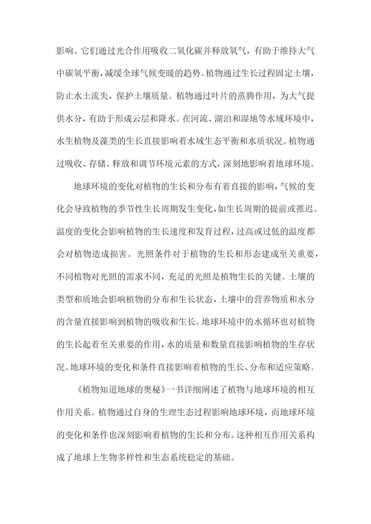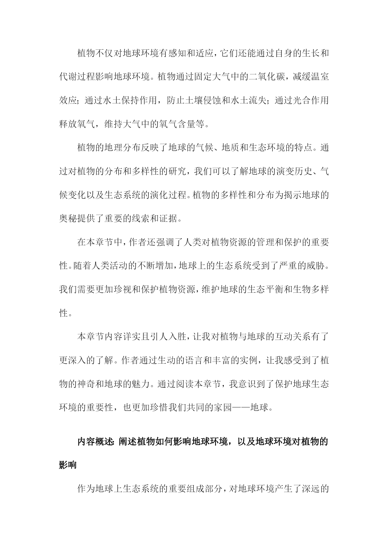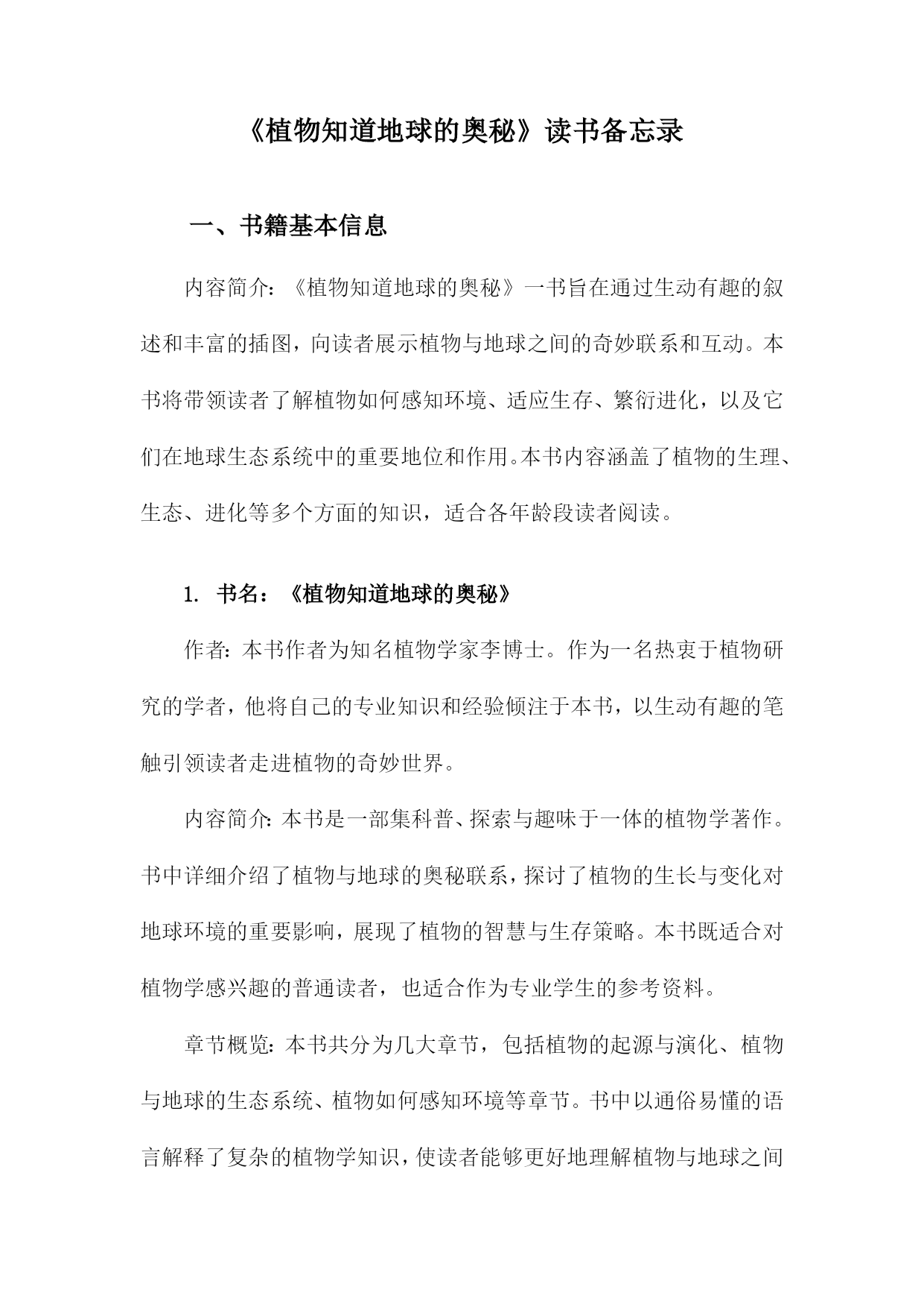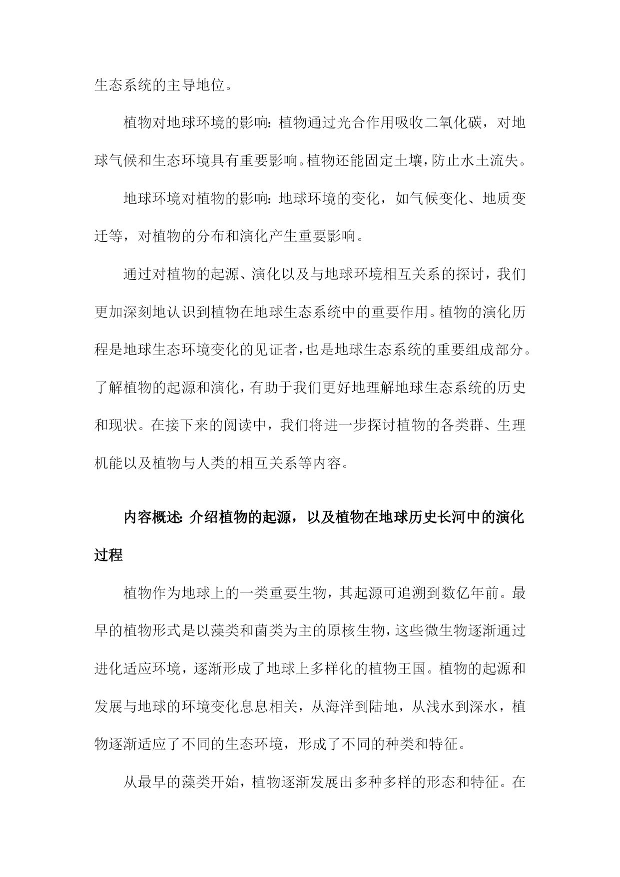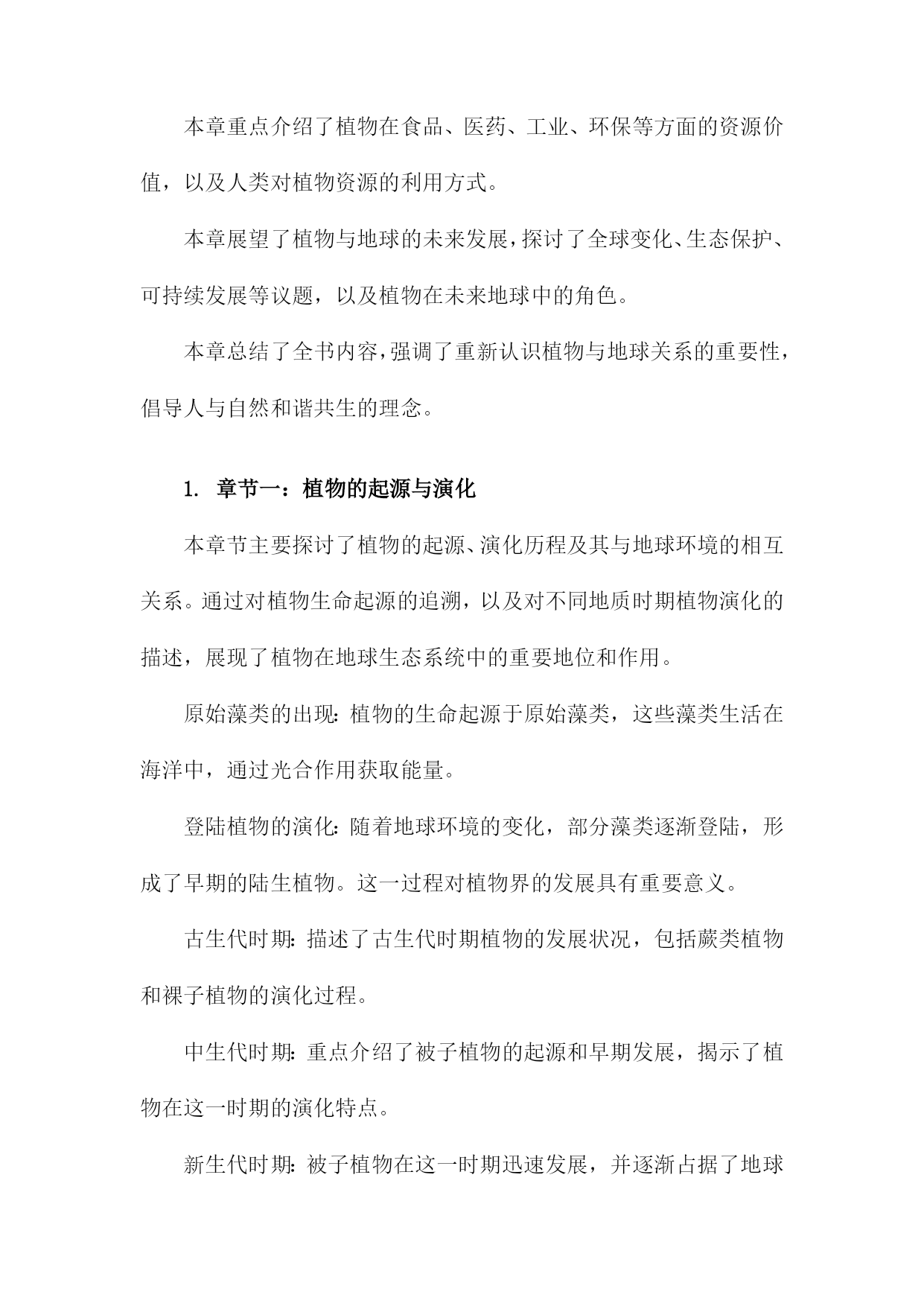 《植物知道地球的奥秘》读书备忘录一、书籍基本信息内容简介:《植物知道地球的奥秘》一书旨在通过生动有趣的叙述和丰富的插图,向读者展示植物与地球之间的奇妙联系和互动。本书将带领读者了解植物如何感知环境、适应生存、繁衍进化,以及它们在地球生态系统中的重要地位和作用。本书内容涵盖了植物的生理、生态、进化等多个方面的知识,适合各年龄段读者阅读。1.书名:《植物知道地球的奥秘》作者:本书作者为知名植物学家李博士。作为一名热衷于植物研究的学者,他将自己的专业知识和经验倾注于本书,以生动有趣的笔触引领读者走进植物的奇妙世界。内容简介:本书是一部集科普、探索与趣味于一体的植物学著作。书中详细介绍了植物与地球的奥秘联系,探讨了植物的生长与变化对地球环境的重要影响,展现了植物的智慧与生存策略。本书既适合对植物学感兴趣的普通读者,也适合作为专业学生的参考资料。章节概览:本书共分为几大章节,包括植物的起源与演化、植物与地球的生态系统、植物如何感知环境等章节。书中以通俗易懂的语言解释了复杂的植物学知识,使读者能够更好地理解植物与地球之间的奥秘联系。书中还穿插了许多有趣的实例和故事,增强了阅读的趣味性。主题思想:本书旨在通过介绍植物与地球的奥秘联系,唤起读者对自然环境的关注与热爱,引导人们更加珍惜地球上的每一种生命。通过对植物学知识的普及,提高公众的科学素养,促进人类与自然和谐共生。2.作者:(作者姓名)本段落简要交代了《植物知道地球的奥秘》的作者姓名,为后续的读书内容和感悟提供背景和参照。实际文档中作者姓名部分需要具体书籍对应的作者信息,暂时用XXX代替。同时后续段落会围绕本书内容展开读书备忘录的具体描述。3.出版社:(出版社名称)本书由XX出版社出版,该出版社在植物学、自然科学及科普读物方面有着深厚的出版背景和丰富的出版经验。选择该出版社出版本书,确保了内容的准确性和专业性,同时也体现了出版社对于推广科学知识、提高公众科学素养的重视。在阅读本书时,可以信赖该出版社所带来的专业性和权威性,更好地理解和探索植物的奥秘以及地球的秘密。4.出版时间:(出版年份)该书的出版时间可追溯至年,正值自然科学领域蓬勃发展的时期,其内容的编纂与整理都紧密结合了当时的科学研究进展与发现。值得一提的是,该书的出版年份标志着植物学领域的一次重要突破,为后来的研究者和爱好者提供了宝贵的参考资料和前沿知识。通过这一时间点的记录,读者可以更好地理解该书所处的时代背景及其在学术界的影响。经过严谨的编纂和修订,该书最终在出版后获得了广泛的认可和好评,成为植物学科普读物中的佳作之一。二、章节概览本章介绍了植物与地球之间的紧密联系,阐述了植物在地球生态系统中的重要地位,以及本书的目的和主要内容。本章详细描述了植物的分类及其特点,包括种子植物、蕨类植物、苔藓植物等,让读者对植物的基本特征有一个全面的了解。本章介绍了植物的生理过程,如光合作用、营养吸收、生长调节等,以及植物与环境的互动,如植物对环境因素的适应和响应。本章探讨了地球的气候对植物分布的影响,阐述了不同气候带的植被特征,以及气候变化对植物分布的影响。本章讲述了植物演化的历史,以及地球变迁对植物演化的影响。通过时间线的梳理,让读者了解植物与地球共同演化的历程。本章重点介绍了植物在食品、医药、工业、环保等方面的资源价值,以及人类对植物资源的利用方式。本章展望了植物与地球的未来发展,探讨了全球变化、生态保护、可持续发展等议题,以及植物在未来地球中的角色。本章总结了全书内容,强调了重新认识植物与地球关系的重要性,倡导人与自然和谐共生的理念。1.章节一:植物的起源与演化本章节主要探讨了植物的起源、演化历程及其与地球环境的相互关系。通过对植物生命起源的追溯,以及对不同地质时期植物演化的描述,展现了植物在地球生态系统中的重要地位和作用。原始藻类的出现:植物的生命起源于原始藻类,这些藻类生活在海洋中,通过光合作用获取能量。登陆植物的演化:随着地球环境的变化,部分藻类逐渐登陆,形成了早期的陆生植物。这一过程对植物界的发展具有重要意义。古生代时期:描述了古生代时期植物的发展状况,包括蕨类植物和裸子植物的演化过程。中生代时期:重点介绍了被子植物的起源和早期发展,揭示了植物在这一时期的演化特点。新生代时期:被子植物在这一时期迅速发展,并逐渐占据了地球生态系统的主导地位。植物对地球环境的影响:植物通过光合作用吸收二氧化碳,对地球气候和生态环境具有重要影响。植物还能固定土壤,防止水土流失。地球环境对植物的影响:地球环境的变化,如气候变化、地质变迁等,对植物的分布和演化产生重要影响。通过对植物的起源、演化以及与地球环境相互关系的探讨,我们更加深刻地认识到植物在地球生态系统中的重要作用。植物的演化历程是