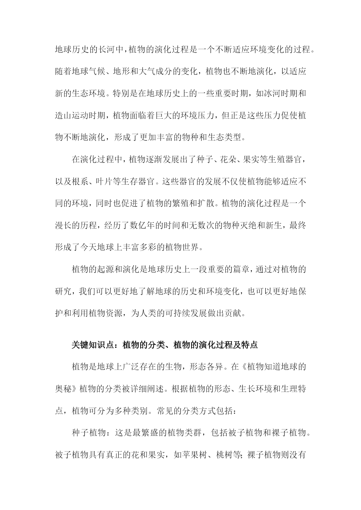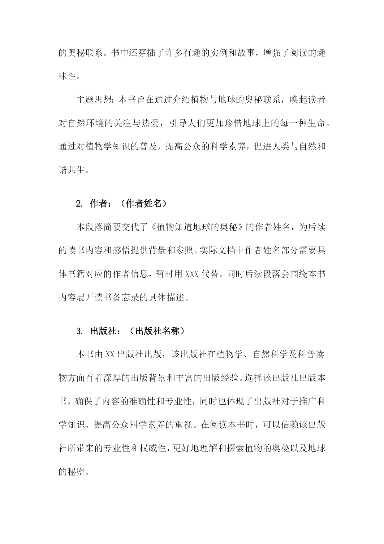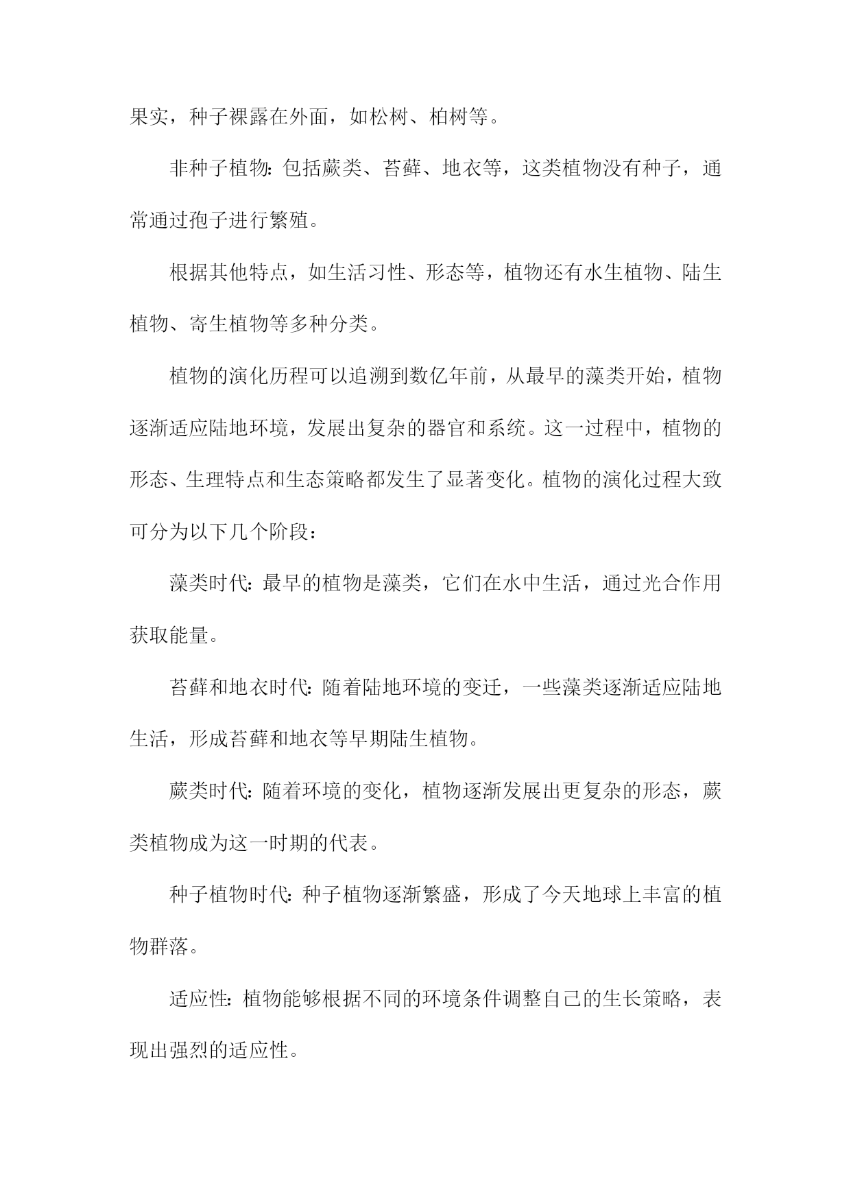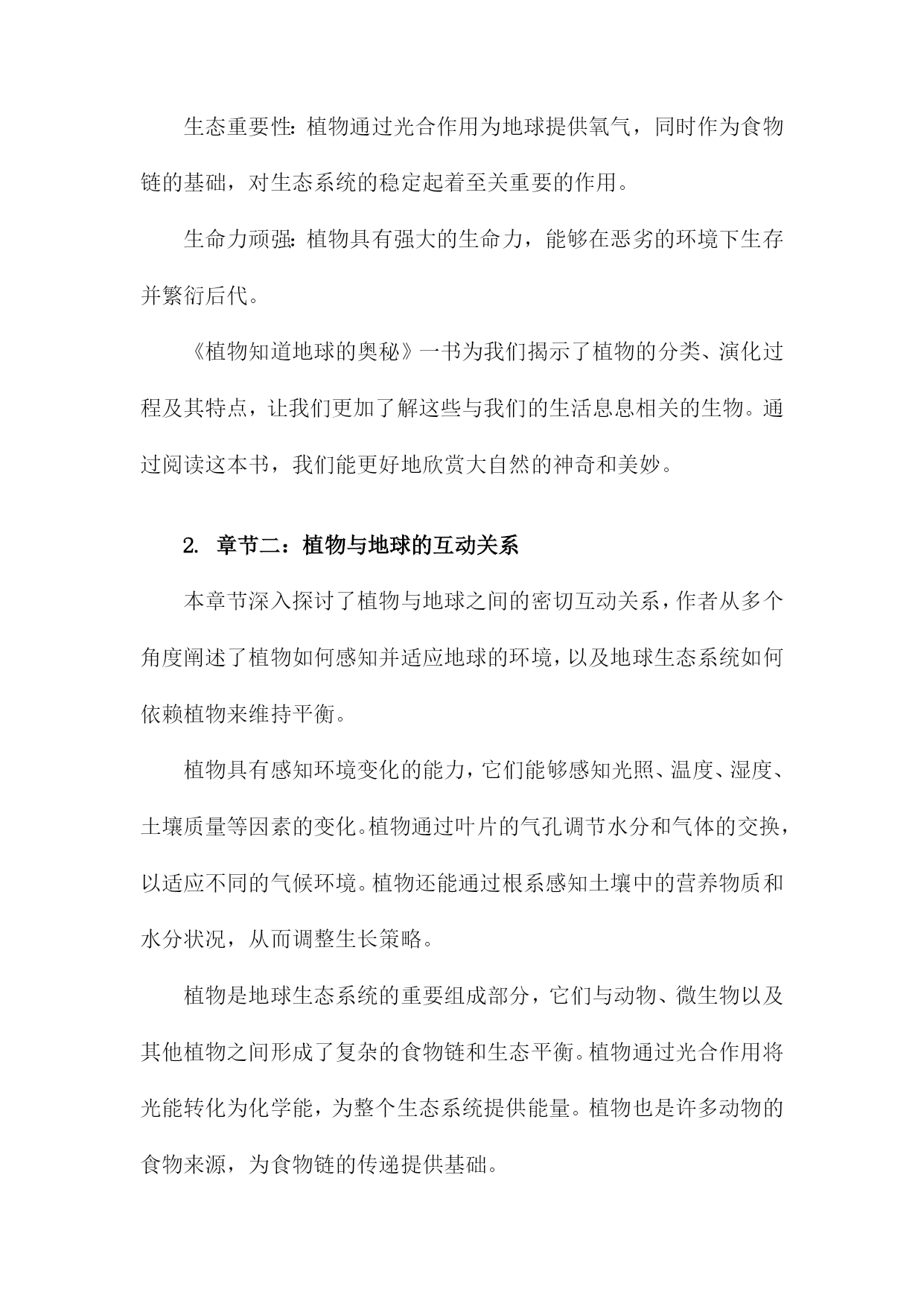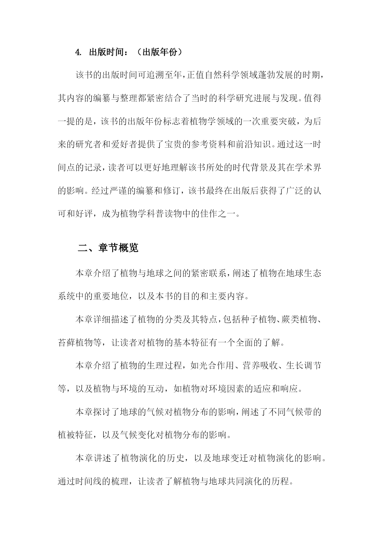 《植物知道地球的奥秘》读书备忘录一、书籍基本信息内容简介:《植物知道地球的奥秘》一书旨在通过生动有趣的叙述和丰富的插图,向读者展示植物与地球之间的奇妙联系和互动。本书将带领读者了解植物如何感知环境、适应生存、繁衍进化,以及它们在地球生态系统中的重要地位和作用。本书内容涵盖了植物的生理、生态、进化等多个方面的知识,适合各年龄段读者阅读。1.书名:《植物知道地球的奥秘》作者:本书作者为知名植物学家李博士。作为一名热衷于植物研究的学者,他将自己的专业知识和经验倾注于本书,以生动有趣的笔触引领读者走进植物的奇妙世界。内容简介:本书是一部集科普、探索与趣味于一体的植物学著作。书中详细介绍了植物与地球的奥秘联系,探讨了植物的生长与变化对地球环境的重要影响,展现了植物的智慧与生存策略。本书既适合对植物学感兴趣的普通读者,也适合作为专业学生的参考资料。章节概览:本书共分为几大章节,包括植物的起源与演化、植物与地球的生态系统、植物如何感知环境等章节。书中以通俗易懂的语言解释了复杂的植物学知识,使读者能够更好地理解植物与地球之间的奥秘联系。书中还穿插了许多有趣的实例和故事,增强了阅读的趣味性。主题思想:本书旨在通过介绍植物与地球的奥秘联系,唤起读者对自然环境的关注与热爱,引导人们更加珍惜地球上的每一种生命。通过对植物学知识的普及,提高公众的科学素养,促进人类与自然和谐共生。2.作者:(作者姓名)本段落简要交代了《植物知道地球的奥秘》的作者姓名,为后续的读书内容和感悟提供背景和参照。实际文档中作者姓名部分需要具体书籍对应的作者信息,暂时用XXX代替。同时后续段落会围绕本书内容展开读书备忘录的具体描述。3.出版社:(出版社名称)本书由XX出版社出版,该出版社在植物学、自然科学及科普读物方面有着深厚的出版背景和丰富的出版经验。选择该出版社出版本书,确保了内容的准确性和专业性,同时也体现了出版社对于推广科学知识、提高公众科学素养的重视。在阅读本书时,可以信赖该出版社所带来的专业性和权威性,更好地理解和探索植物的奥秘以及地球的秘密。4.出版时间:(出版年份)该书的出版时间可追溯至年,正值自然科学领域蓬勃发展的时期,其内容的编纂与整理都紧密结合了当时的科学研究进展与发现。值得一提的是,该书的出版年份标志着植物学领域的一次重要突破,为后来的研究者和爱好者提供了宝贵的参考资料和前沿知识。通过这一时间点的记录,读者可以更好地理解该书所处的时代背景及其在学术界的影响。经过严谨的编纂和修订,该书最终在出版后获得了广泛的认可和好评,成为植物学科普读物中的佳作之一。二、章节概览本章介绍了植物与地球之间的紧密联系,阐述了植物在地球生态系统中的重要地位,以及本书的目的和主要内容。本章详细描述了植物的分类及其特点,包括种子植物、蕨类植物、苔藓植物等,让读者对植物的基本特征有一个全面的了解。本章介绍了植物的生理过程,如光合作用、营养吸收、生长调节等,以及植物与环境的互动,如植物对环境因素的适应和响应。本章探讨了地球的气候对植物分布的影响,阐述了不同气候带的植被特征,以及气候变化对植物分布的影响。本章讲述了植物演化的历史,以及地球变迁对植物演化的影响。通过时间线的梳理,让读者了解植物与地球共同演化的历程。本章重点介绍了植物在食品、医药、工业、环保等方面的资源价值,以及人类对植物资源的利用方式。本章展望了植物与地球的未来发展,探讨了全球变化、生态保护、可持续发展等议题,以及植物在未来地球中的角色。本章总结了全书内容,强调了重新认识植物与地球关系的重要性,倡导人与自然和谐共生的理念。1.章节一:植物的起源与演化本章节主要探讨了植物的起源、演化历程及其与地球环境的相互关系。通过对植物生命起源的追溯,以及对不同地质时期植物演化的描述,展现了植物在地球生态系统中的重要地位和作用。原始藻类的出现:植物的生命起源于原始藻类,这些藻类生活在海洋中,通过光合作用获取能量。登陆植物的演化:随着地球环境的变化,部分藻类逐渐登陆,形成了早期的陆生植物。这一过程对植物界的发展具有重要意义。古生代时期:描述了古生代时期植物的发展状况,包括蕨类植物和裸子植物的演化过程。中生代时期:重点介绍了被子植物的起源和早期发展,揭示了植物在这一时期的演化特点。新生代时期:被子植物在这一时期迅速发展,并逐渐占据了地球生态系统的主导地位。植物对地球环境的影响:植物通过光合作用吸收二氧化碳,对地球气候和生态环境具有重要影响。植物还能固定土壤,防止水土流失。地球环境对植物的影响:地球环境的变化,如气候变化、地质变迁等,对植物的分布和演化产生重要影响。通过对植物的起源、演化以及与地球环境相互关系的探讨,我们更加深刻地认识到植物在地球生态系统中的重要作用。植物的演化历程是