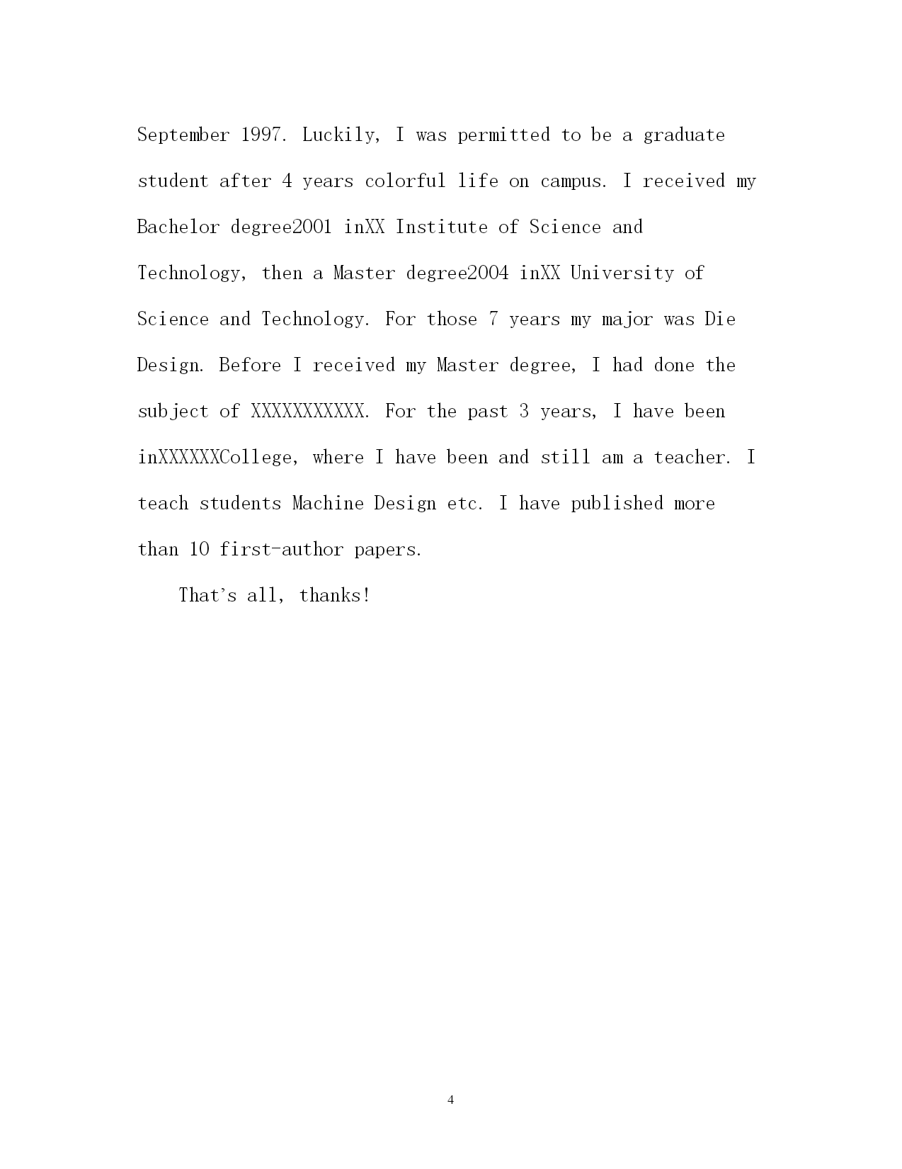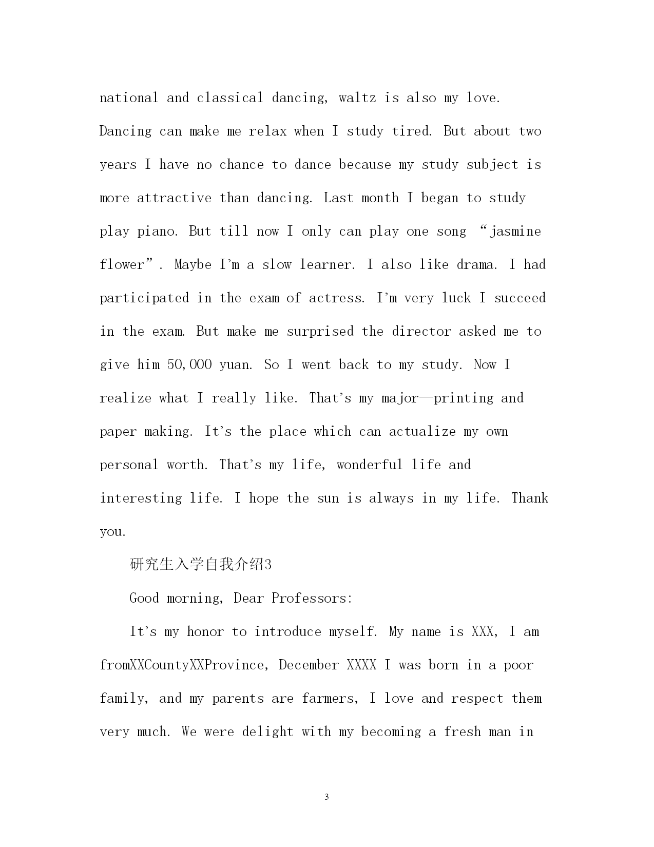 此资料由网络收集而来,如有侵权请告知上传者立即删除。资料共分享,我们负责传递知识。PAGEPAGE4研究生入学自我介绍「中英文」研究生入学自我介绍「中英文」研究生入学自我介绍是同学间相互了解的一个通过,同时也是展示自我的一种手段。下面是小编搜集整理的研究生入学自我介绍,欢迎阅读。研究生入学自我介绍1尊敬的老师、各位同学:大家好!我知道能够有这个机会到这里来深造是我的荣幸,我很感谢大学时代老师对我的栽培和支持,我很高兴能够遇到各位,我相信我们一定会相处得很愉快。从在大学期间大学担任职务,再到和同学一起创办社团,让我受益匪浅,组织能力和策划能力有了很大的提高。尤其是在我们策划各种活动,对我的交际和团队合作能力也有非长大的提高。当然在组建社团的同时,我并没有忘记对自己学业的要求,顺利地通过了国家英语和计算机二级考试,在学有余力的情况下我阅读很多课外书籍。这不仅拓展了我的知识结构,也让我能够全面的发展。我认为虽然大学的生活不是万能的,但是如果能够利用好这些宝贵的时间和资源,我们还是有很大的`收获的。纵观这四年的生活是非常精彩的,但是也留下了一些遗憾。但是这都是我人生路上的财富。所以我会在今后的研究生学习中弥补大学期间的不足毛病。争取在研究生阶段能够更加完善自我,如果大家觉得我有哪些方面做得不好,希望大家能够提出来,我会积极改进的。谢谢大家。研究生入学自我介绍2It’smypleasuretobeheretointroducemyself.That’sadifficultquestion.Ithinkallthenight.Howtointroducemyself?TellyouwhoIam?Youallknowmynameis.TellyouwhatmymajorisorwhatIamdoingnow?YouallknowIstudyink-jetpaper,andyesterdayyouallmyexaminers.SotodayI’lltellyoumycharactersandfavorites.I’manopen-minded,kindandsmartgirl.Ilikedancing,especiallynationalandclassicaldancing,waltzisalsomylove.DancingcanmakemerelaxwhenIstudytired.ButabouttwoyearsIhavenochancetodancebecausemystudysubjectismoreattractivethandancing.LastmonthIbegantostudyplaypiano.ButtillnowIonlycanplayonesong“jasmineflower”.MaybeI’maslowlearner.Ialsolikedrama.Ihadparticipatedintheexamofactress.I’mveryluckIsucceedintheexam.Butmakemesurprisedthedirectoraskedmetogivehim50,000yuan.SoIwentbacktomystudy.NowIrealizewhatIreallylike.That’smymajor—printingandpapermaking.It’stheplacewhichcanactualizemyownpersonalworth.That’smylife,wonderfullifeandinterestinglife.Ihopethesunisalwaysinmylife.Thankyou.研究生入学自我介绍3Goodmorning,DearProfessors:It’smyhonortointroducemyself.MynameisXXX,IamfromXXCountyXXProvince,DecemberXXXXIwasborninapoorfamily,andmyparentsarefarmers,Iloveandrespectthemverymuch.WeweredelightwithmybecomingafreshmaninSeptember1997.Luckily,Iwaspermittedtobeagraduatestudentafter4yearscolorfullifeoncampus.IreceivedmyBachelordegree2001inXXInstituteofScienceandTechnology,thenaMasterdegree2004inXXUniversityofScienceandTechnology.F