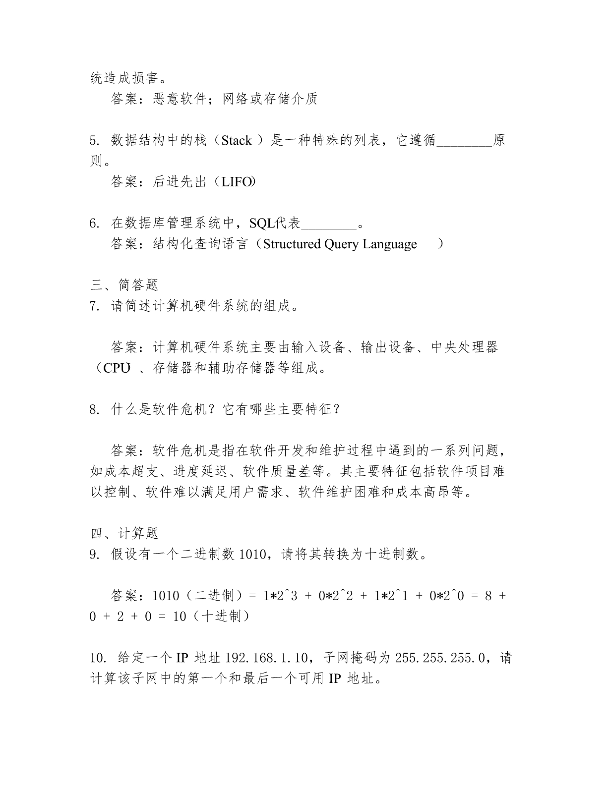 计算机考试题库及答案一、选择题1.在计算机科学中,冯·诺依曼架构指的是什么?A.一种编程语言B.一种网络协议C.一种计算机组织方式D.一种数据库管理系统答案:C2.下列哪个选项不是操作系统的功能?A.文件管理B.设备管理C.进程管理D.数据加密答案:D3.在计算机网络中,TCP和UDP协议的主要区别是什么?A.TCP提供可靠的连接,而UDP不提供B.TCP是网络层协议,UDP是传输层协议C.TCP基于IP协议,UDP基于HTTP协议D.TCP和UDP都提供可靠的连接答案:A二、填空题4.计算机病毒是一种________,能够通过________传播,对计算机系统造成损害。答案:恶意软件;网络或存储介质5.数据结构中的栈(Stack)是一种特殊的列表,它遵循________原则。答案:后进先出(LIFO)6.在数据库管理系统中,SQL代表________。答案:结构化查询语言(StructuredQueryLanguage)三、简答题7.请简述计算机硬件系统的组成。答案:计算机硬件系统主要由输入设备、输出设备、中央处理器(CPU)、存储器和辅助存储器等组成。8.什么是软件危机?它有哪些主要特征?答案:软件危机是指在软件开发和维护过程中遇到的一系列问题,如成本超支、进度延迟、软件质量差等。其主要特征包括软件项目难以控制、软件难以满足用户需求、软件维护困难和成本高昂等。四、计算题9.假设有一个二进制数1010,请将其转换为十进制数。答案:1010(二进制)=1*2^3+0*2^2+1*2^1+0*2^0=8+0+2+0=10(十进制)10.给定一个IP地址192.168.1.10,子网掩码为255.255.255.0,请计算该子网中的第一个和最后一个可用IP地址。答案:子网掩码255.255.255.0表示最后一个八位字节用于主机地址。因此,网络地址是192.168.1.0,第一个可用IP地址是192.168.1.1,最后一个可用IP地址是192.168.1.254。五、论述题11.论述软件开发过程中的需求分析阶段的重要性。答案:需求分析是软件开发过程中的关键阶段,它确保开发团队和用户之间有共同的理解。在这个阶段,开发人员需要收集和分析用户的需求,确定软件必须执行的功能,以及用户期望的性能和界面。需求分析的准确性直接影响到软件项目的成功与否。如果需求分析不准确或不完整,可能会导致开发出的软件无法满足用户的实际需求,增加项目成本,延长开发时间,甚至导致项目失败。六、编程题12.使用Python编写一个函数,实现计算两个整数的最小公倍数(LCM)。```pythondefgcd(x,y):while(y):x,y=y,x%yreturnxdeflcm(x,y):return(x*y)//gcd(x,y)#示例print(lcm(4,6))#输出:12```请注意,这只是一个简单的计算机考试题库示例,实际的考试内容可能会更加复杂和多样化。