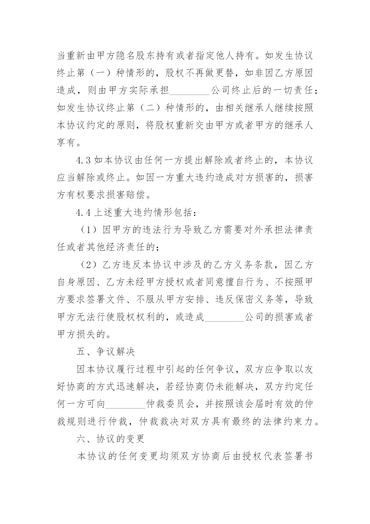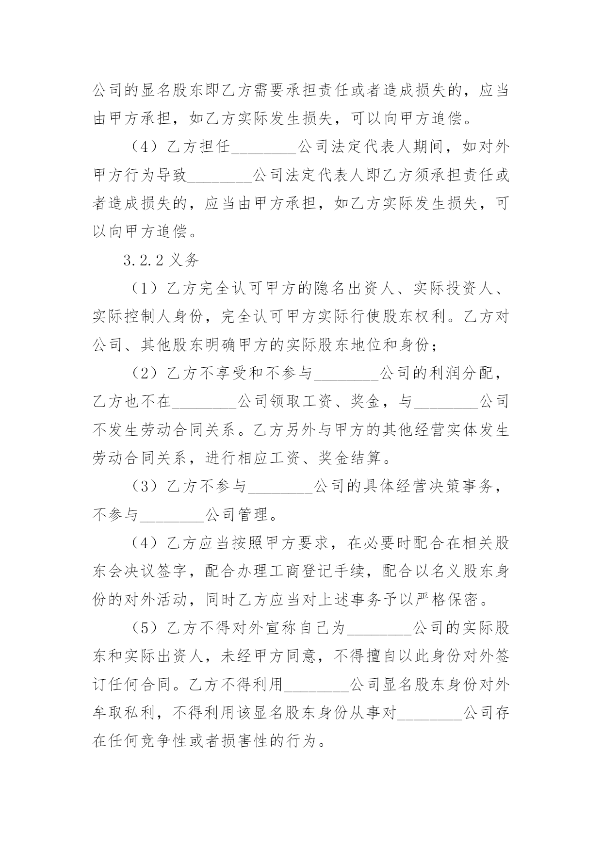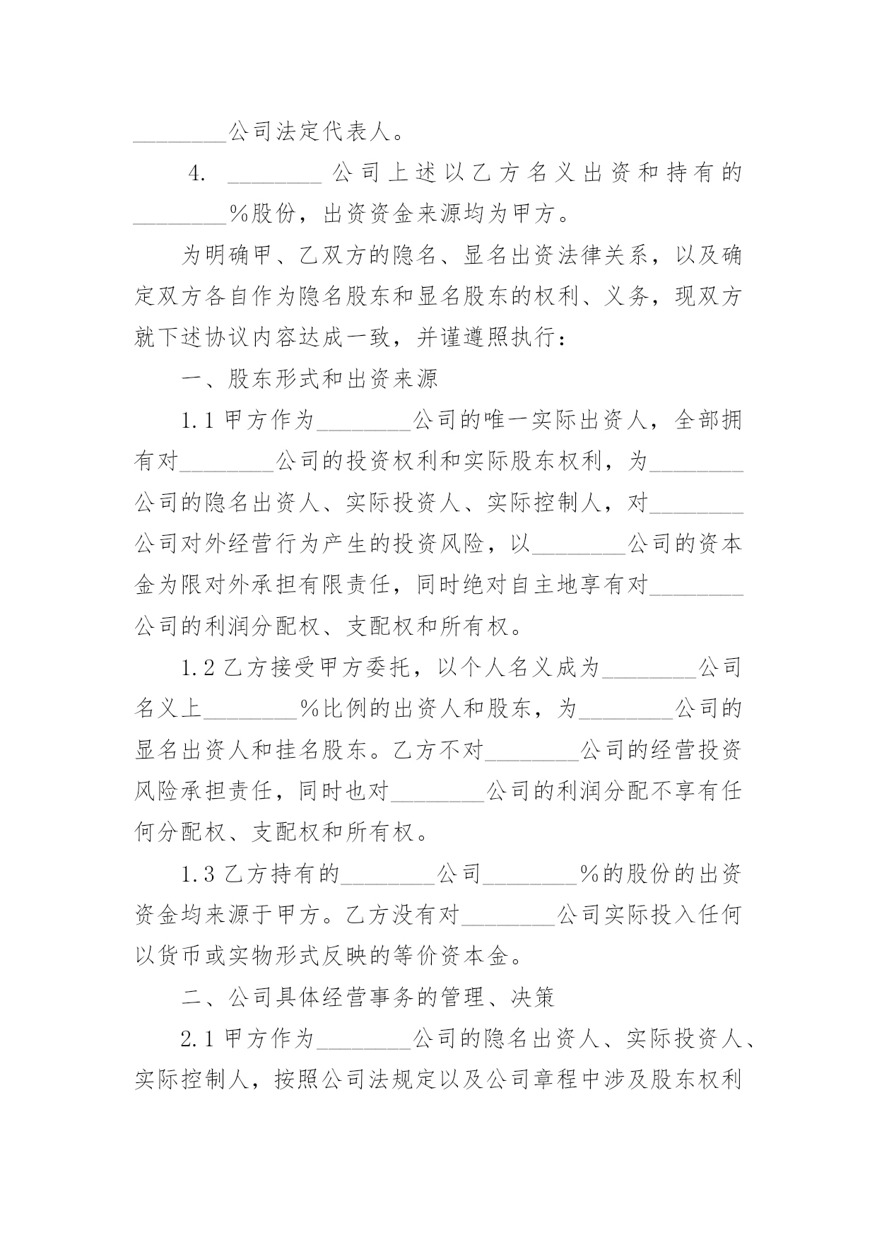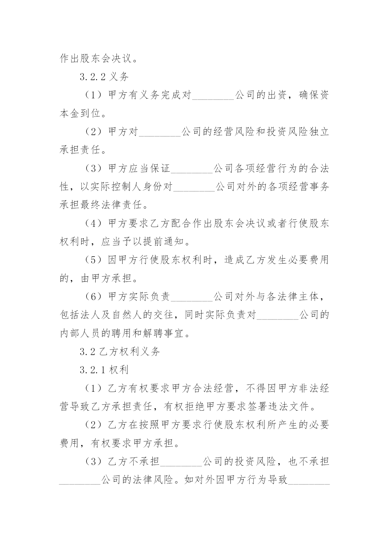 隐名出资协议书隐名出资协议书在当今社会生活中,协议使用的频率越来越高,协议能够成为双方当事人的合法依据。相信很多朋友都对拟协议感到非常苦恼吧,下面是小编整理的隐名出资协议书,欢迎大家分享。隐名出资协议书1隐名出资人(甲方):____________,身份证号:【___________】显名出资人(乙方):____________,身份证号:【___________】鉴于:截至本协议签署之日,1.________________有限公司(以下简称“________公司”)是一家已于【________年】在___________市工商局登记注册的有限责任公司,注册资本金为人民币壹千万元。2.甲方作为实际出资人,实际已向该公司出资人民币陆百万元,并享有向________公司余下肆佰万元出资的认缴权。3.公司目前由乙方____________自愿接受甲方崔赢委托,以显名出资人即名义股东之身份,登记于公司章程、股东名册以及其他工商登记材料中。乙方____________名义上在________公司出资比例为90%,并自愿接受甲方委托担任________公司法定代表人。4.________公司上述以乙方名义出资和持有的________%股份,出资资金来源均为甲方。为明确甲、乙双方的隐名、显名出资法律关系,以及确定双方各自作为隐名股东和显名股东的权利、义务,现双方就下述协议内容达成一致,并谨遵照执行:一、股东形式和出资来源1.1甲方作为________公司的唯一实际出资人,全部拥有对________公司的投资权利和实际股东权利,为________公司的隐名出资人、实际投资人、实际控制人,对________公司对外经营行为产生的投资风险,以________公司的资本金为限对外承担有限责任,同时绝对自主地享有对________公司的利润分配权、支配权和所有权。1.2乙方接受甲方委托,以个人名义成为________公司名义上________%比例的出资人和股东,为________公司的显名出资人和挂名股东。乙方不对________公司的经营投资风险承担责任,同时也对________公司的利润分配不享有任何分配权、支配权和所有权。1.3乙方持有的________公司________%的股份的出资资金均来源于甲方。乙方没有对________公司实际投入任何以货币或实物形式反映的等价资本金。二、公司具体经营事务的管理、决策2.1甲方作为________公司的隐名出资人、实际投资人、实际控制人,按照公司法规定以及公司章程中涉及股东权利的规定,对公司的全部经营事务,享有管理、控制和最终决策的权利。甲方具体负责________公司的.各项经营事务,并实际行使股东各项权利,掌管公司的各种印鉴。2.2乙方作为________公司的显名出资人和挂名股东,不负责________公司的具体经营事务。也对________公司的经营无最终决策权利。乙方对________公司及其他股东,应当披露其与甲方之间的关系,使公司及其他股东认可甲方实际行使股东权利。三、甲、乙双方的权利、义务3.1甲方权利、义务3.1.1权利(1)甲方享有________公司中乙方名义下的各项实际股东权利,包括但不限于________公司的经营决策权利和利润分配权利。(2)甲方有权随时根据________公司的经营情况,随时调整________公司中乙方名义下的股权比例,包括但不限于股权的增减持、公司的增资扩股、合并重组、分立、解散、清算等事宜。(3)甲方有权自己或派专人掌管________公司的公章、财务印鉴、财务账册等。(4)在认为乙方不能诚实履行受托义务时,有权随时依法解除对乙方的委托,并有权要求乙方将所持的显名股东权无条件的过户至甲方或甲方指定的第三人。(5)甲方有权通过乙方显名股东身份,召开股东会并作出股东会决议。3.2.2义务(1)甲方有义务完成对________公司的出资,确保资本金到位。(2)甲方对________公司的经营风险和投资风险独立承担责任。(3)甲方应当保证________公司各项经营行为的合法性,以实际控制人身份对________公司对外的各项经营事务承担最终法律责任。(4)甲方要求乙方配合作出股东会决议或者行使股东权利时,应当予以提前通知。(5)因甲方行使股东权利时,造成乙方发生必要费用的,由甲方承担。(6)甲方实际负责________公司对外与各法律主体,包括法人及自然人的交往,同时实际负责对________公司的内部人员的聘用和解聘事宜。3.2乙方权利义务3.2.1权利(1)乙方有权要求甲方合法经营,不得因甲方非法经营导致乙方承担责任,有权拒绝甲方要求签署违法文件。(2)乙方在按照甲方要求行使股东权利所产生的必要费用,有权要求甲方承担。(3)乙方不承担_____