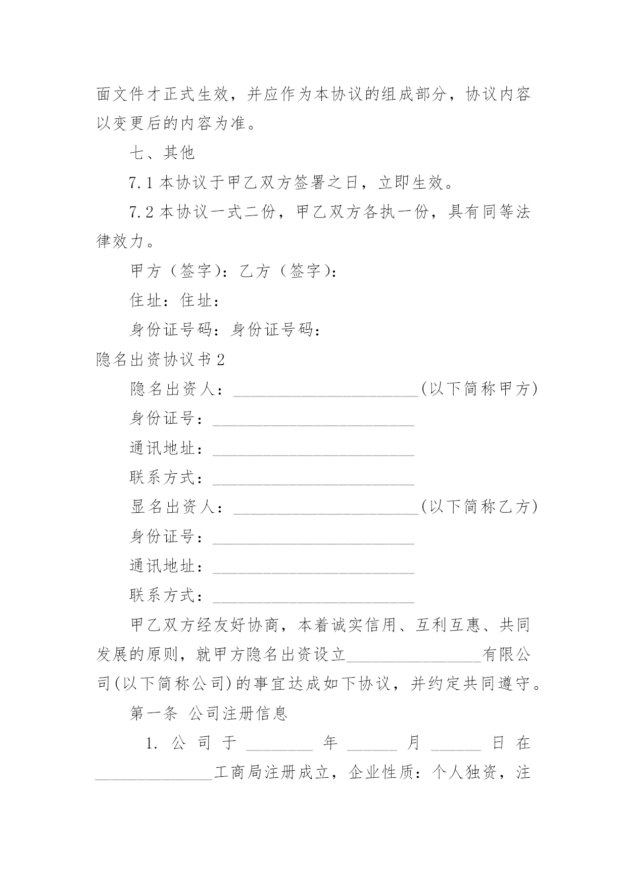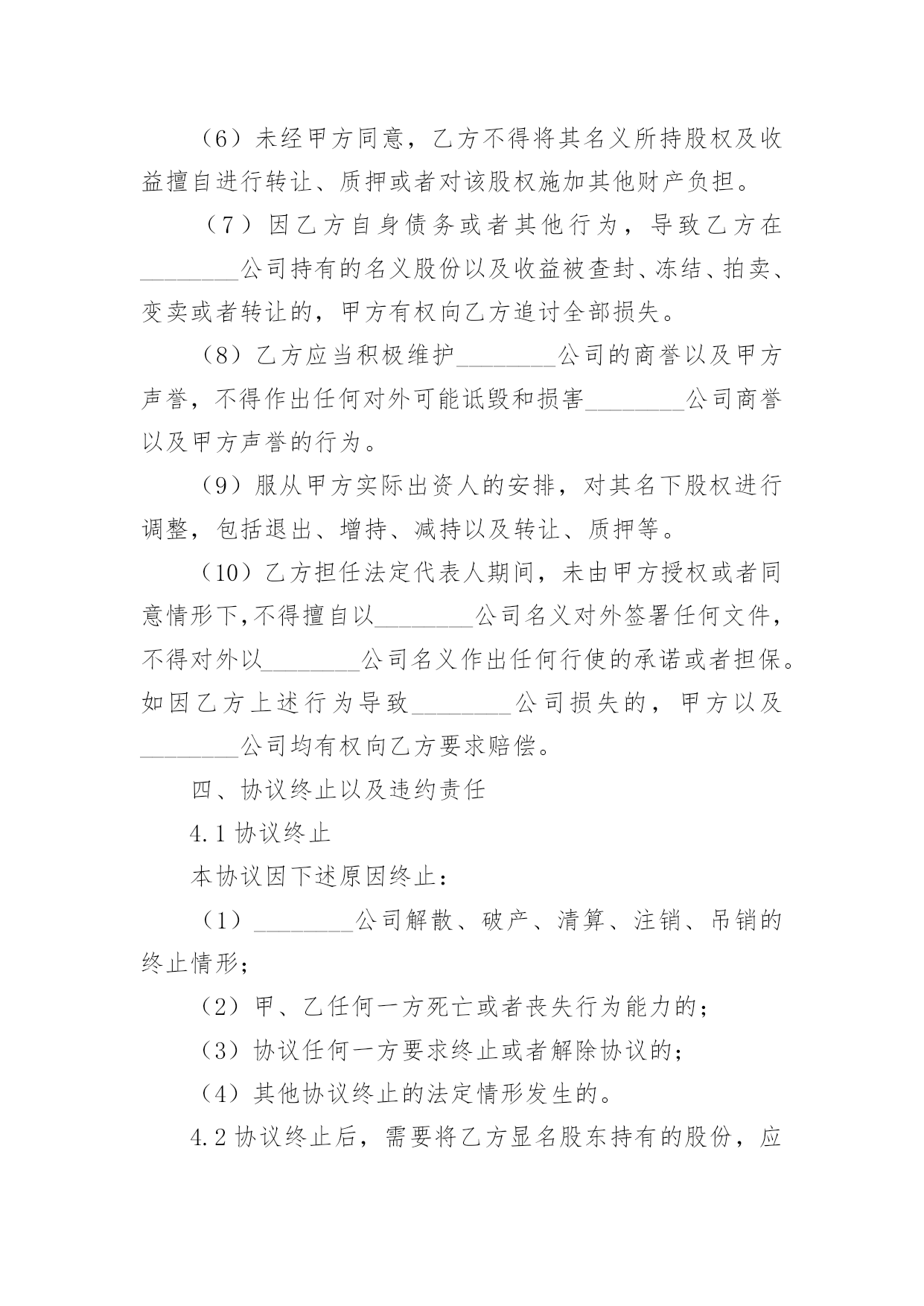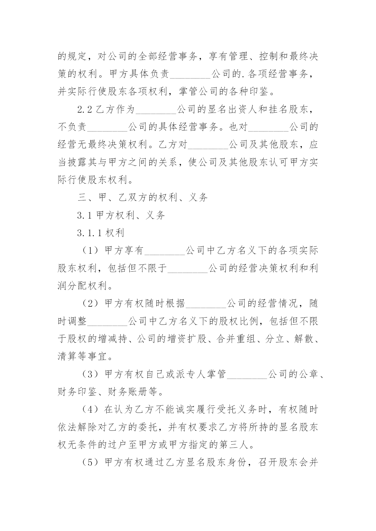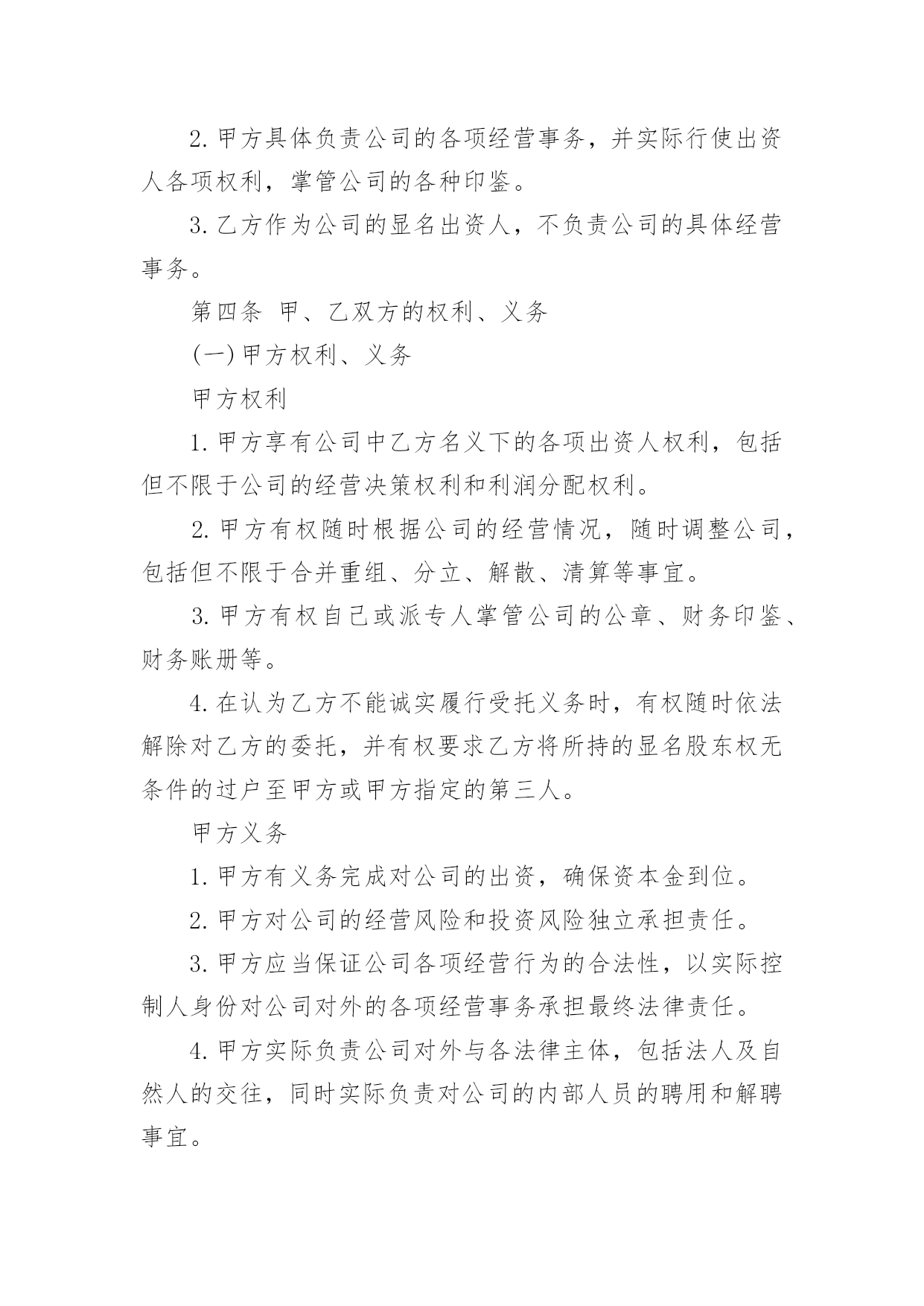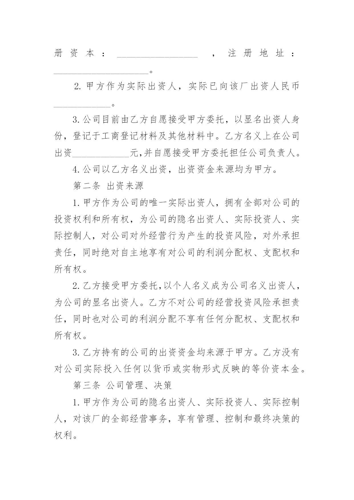 隐名出资协议书隐名出资协议书在当今社会生活中,协议使用的频率越来越高,协议能够成为双方当事人的合法依据。相信很多朋友都对拟协议感到非常苦恼吧,下面是小编整理的隐名出资协议书,欢迎大家分享。隐名出资协议书1隐名出资人(甲方):____________,身份证号:【___________】显名出资人(乙方):____________,身份证号:【___________】鉴于:截至本协议签署之日,1.________________有限公司(以下简称“________公司”)是一家已于【________年】在___________市工商局登记注册的有限责任公司,注册资本金为人民币壹千万元。2.甲方作为实际出资人,实际已向该公司出资人民币陆百万元,并享有向________公司余下肆佰万元出资的认缴权。3.公司目前由乙方____________自愿接受甲方崔赢委托,以显名出资人即名义股东之身份,登记于公司章程、股东名册以及其他工商登记材料中。乙方____________名义上在________公司出资比例为90%,并自愿接受甲方委托担任________公司法定代表人。4.________公司上述以乙方名义出资和持有的________%股份,出资资金来源均为甲方。为明确甲、乙双方的隐名、显名出资法律关系,以及确定双方各自作为隐名股东和显名股东的权利、义务,现双方就下述协议内容达成一致,并谨遵照执行:一、股东形式和出资来源1.1甲方作为________公司的唯一实际出资人,全部拥有对________公司的投资权利和实际股东权利,为________公司的隐名出资人、实际投资人、实际控制人,对________公司对外经营行为产生的投资风险,以________公司的资本金为限对外承担有限责任,同时绝对自主地享有对________公司的利润分配权、支配权和所有权。1.2乙方接受甲方委托,以个人名义成为________公司名义上________%比例的出资人和股东,为________公司的显名出资人和挂名股东。乙方不对________公司的经营投资风险承担责任,同时也对________公司的利润分配不享有任何分配权、支配权和所有权。1.3乙方持有的________公司________%的股份的出资资金均来源于甲方。乙方没有对________公司实际投入任何以货币或实物形式反映的等价资本金。二、公司具体经营事务的管理、决策2.1甲方作为________公司的隐名出资人、实际投资人、实际控制人,按照公司法规定以及公司章程中涉及股东权利的规定,对公司的全部经营事务,享有管理、控制和最终决策的权利。甲方具体负责________公司的.各项经营事务,并实际行使股东各项权利,掌管公司的各种印鉴。2.2乙方作为________公司的显名出资人和挂名股东,不负责________公司的具体经营事务。也对________公司的经营无最终决策权利。乙方对________公司及其他股东,应当披露其与甲方之间的关系,使公司及其他股东认可甲方实际行使股东权利。三、甲、乙双方的权利、义务3.1甲方权利、义务3.1.1权利(1)甲方享有________公司中乙方名义下的各项实际股东权利,包括但不限于________公司的经营决策权利和利润分配权利。(2)甲方有权随时根据________公司的经营情况,随时调整________公司中乙方名义下的股权比例,包括但不限于股权的增减持、公司的增资扩股、合并重组、分立、解散、清算等事宜。(3)甲方有权自己或派专人掌管________公司的公章、财务印鉴、财务账册等。(4)在认为乙方不能诚实履行受托义务时,有权随时依法解除对乙方的委托,并有权要求乙方将所持的显名股东权无条件的过户至甲方或甲方指定的第三人。(5)甲方有权通过乙方显名股东身份,召开股东会并作出股东会决议。3.2.2义务(1)甲方有义务完成对________公司的出资,确保资本金到位。(2)甲方对________公司的经营风险和投资风险独立承担责任。(3)甲方应当保证________公司各项经营行为的合法性,以实际控制人身份对________公司对外的各项经营事务承担最终法律责任。(4)甲方要求乙方配合作出股东会决议或者行使股东权利时,应当予以提前通知。(5)因甲方行使股东权利时,造成乙方发生必要费用的,由甲方承担。(6)甲方实际负责________公司对外与各法律主体,包括法人及自然人的交往,同时实际负责对________公司的内部人员的聘用和解聘事宜。3.2乙方权利义务3.2.1权利(1)乙方有权要求甲方合法经营,不得因甲方非法经营导致乙方承担责任,有权拒绝甲方要求签署违法文件。(2)乙方在按照甲方要求行使股东权利所产生的必要费用,有权要求甲方承担。(3)乙方不承担_____