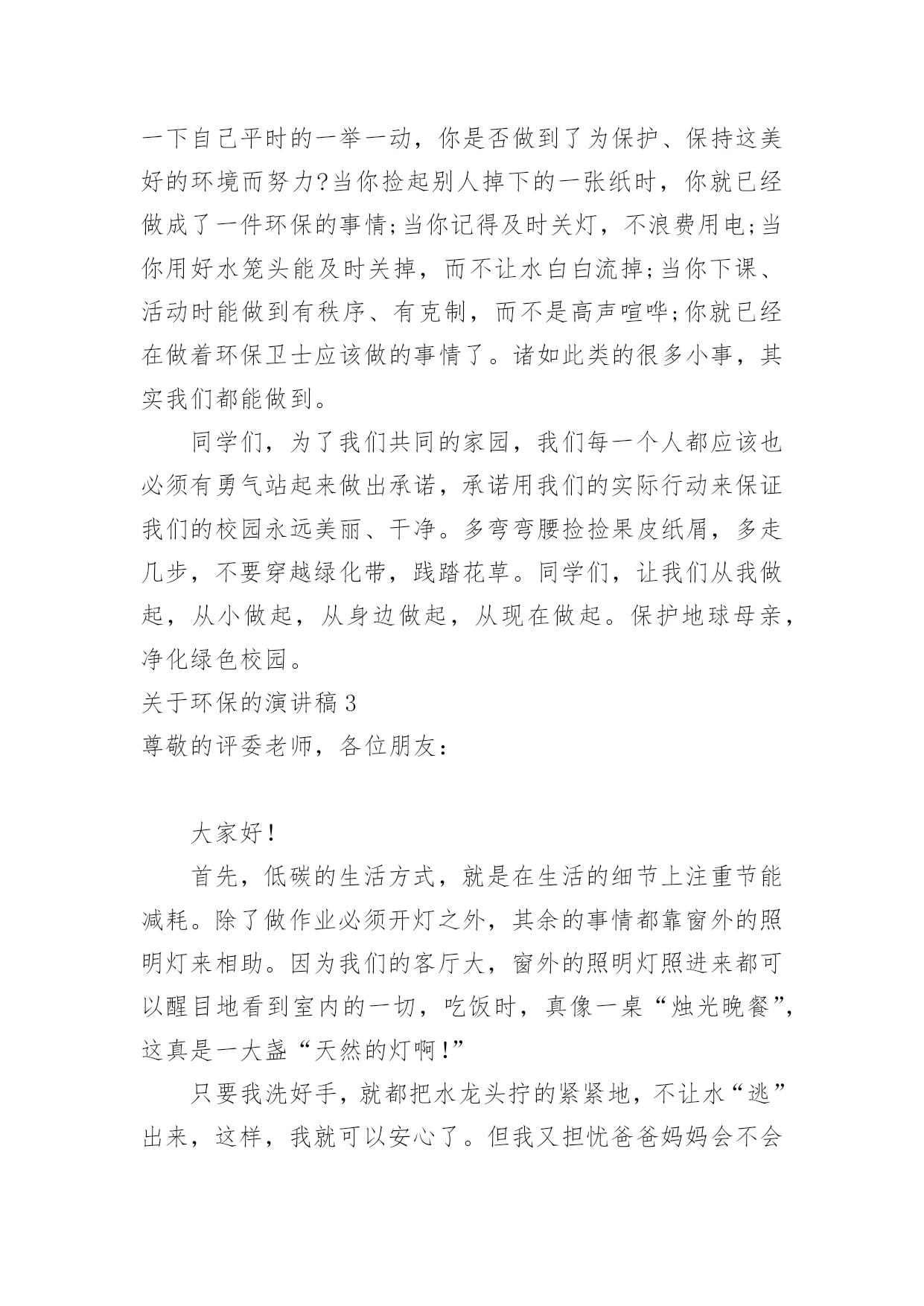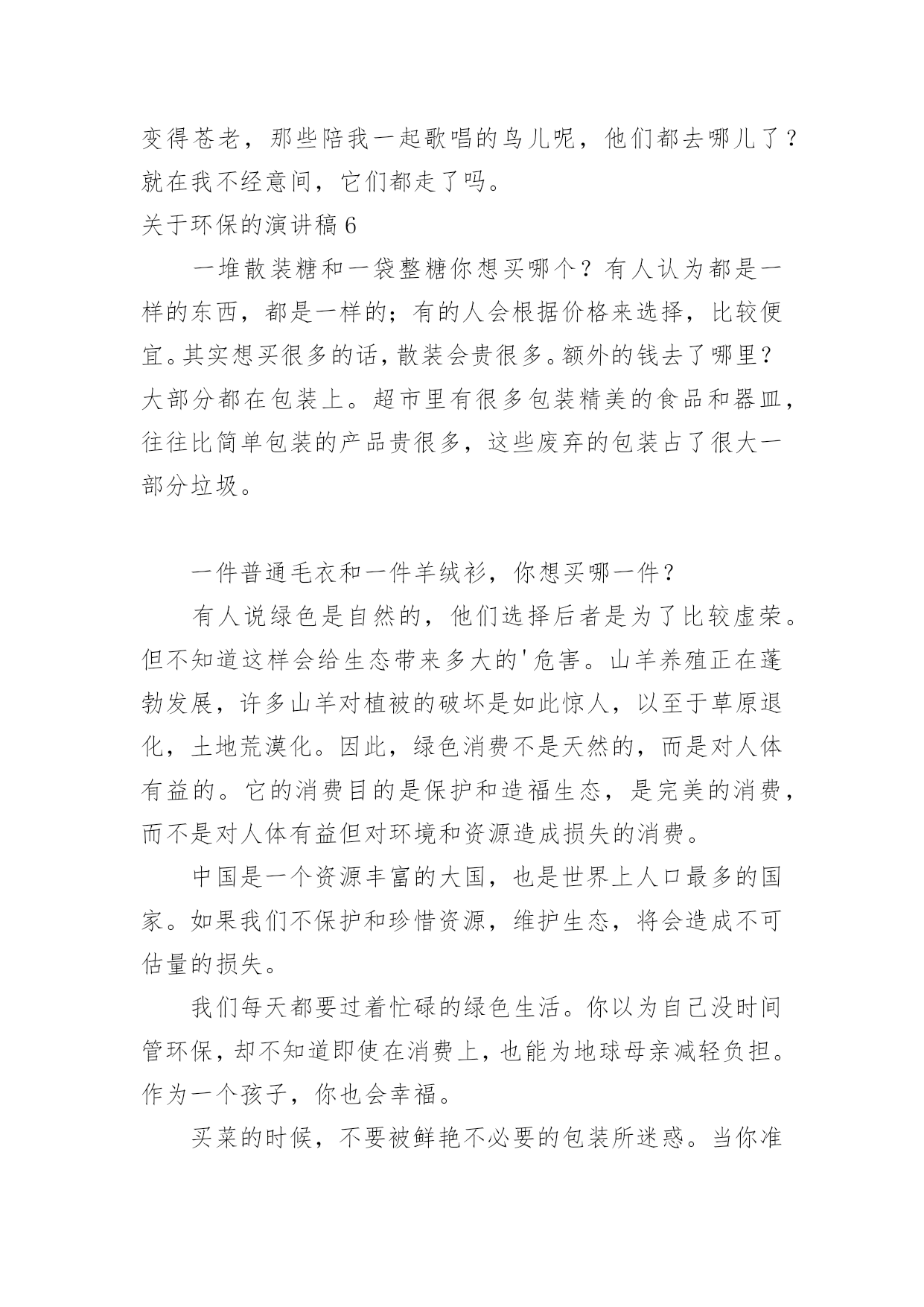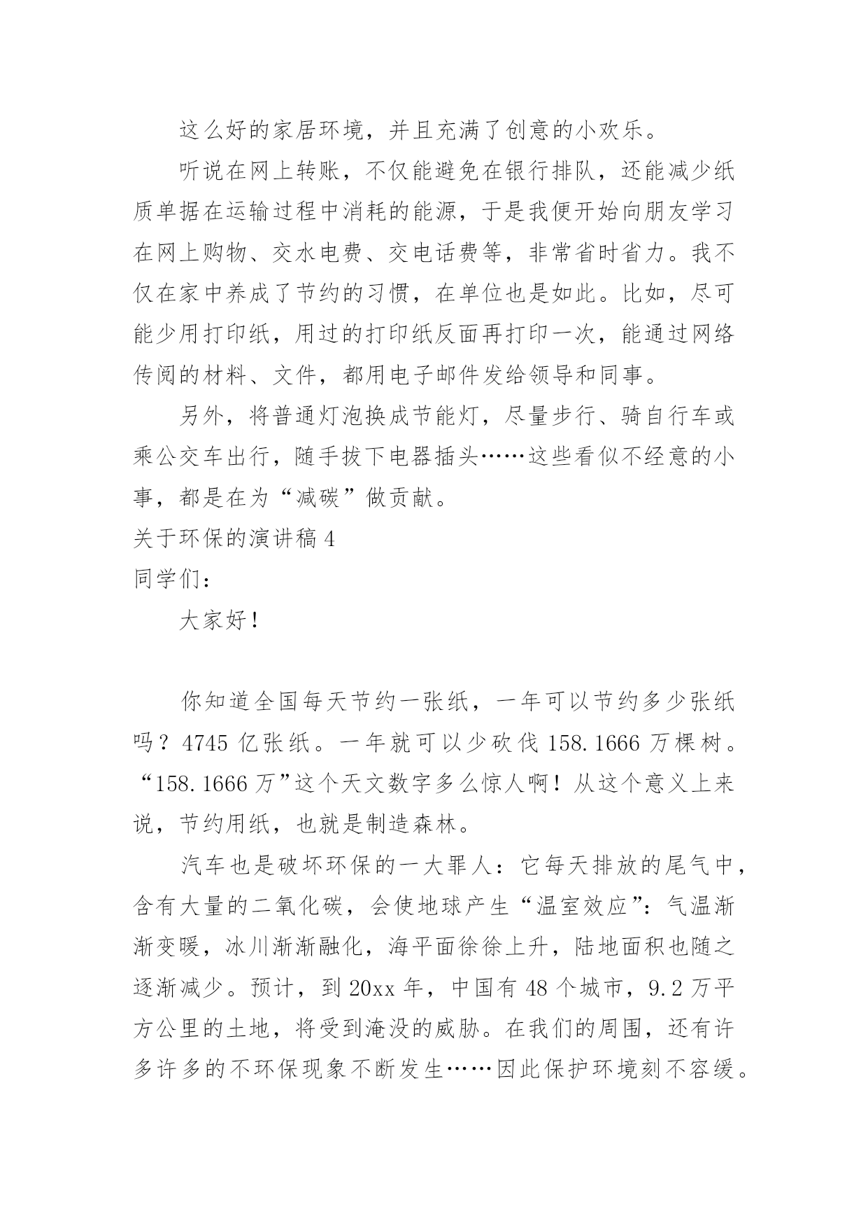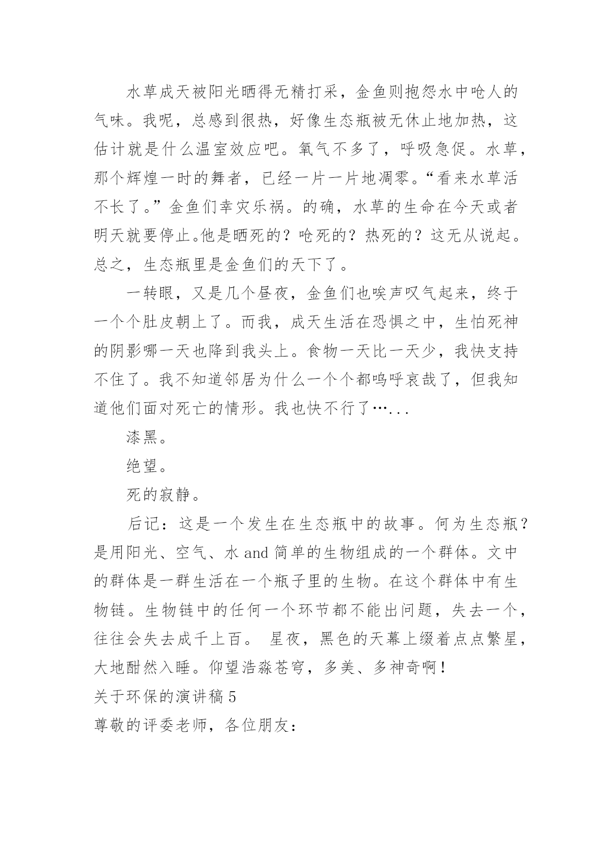 环保的演讲稿关于环保的演讲稿演讲稿的写法比较灵活,可以根据会议的内容、一件事事后的感想、需要等情况而有所区别。在日新月异的现代社会中,演讲稿在演讲中起到的作用越来越大,如何写一份恰当的演讲稿呢?下面是小编帮大家整理的关于环保的演讲稿,欢迎大家借鉴与参考,希望对大家有所帮助。关于环保的演讲稿1尊敬的老师、亲爱的同学们:大家好!地球是属于大家的,他无偿的供给我们各种资源,我们不能不顾后果肆意去破坏她,应该去保护,爱护她。一天,我来到了神秘世界,首先映入眼帘的是那片一望无际的沙漠,在阳光的照耀下,金黄的'沙子闪闪发光,但是却没有一点绿色的足迹。于是,我拿出树木种子,把它们投入了浩瀚的沙漠中。走过了沙漠,来到了小河边,原本清澈见底的河水,如今已变得浑浊不清了,一层层垃圾飘浮在水面上,自由自在地“游”来“游”去,我找来捞网,把垃圾捞到岸边,经过一次又一次的努力,垃圾终于被我全部捞完了,看着那堆积如山的垃圾,再看看那干净的湖水,心情一下子舒畅了许多。接着我来到了大森林,里面只有几棵年迈的老松树,剩下的是一片荒凉的土地,还有几根变黄的树枝“躺”在这土地上。我拿出水桶和铲子,把新生命播种到土地里,洒上了生命之水。最后我来到了花园,里面只剩下几朵即将凋零的花朵,地板上有着许多枯枝败叶,没有了色彩、没有了生机。我装了一壶水,向那些即将没生命的花朵洒去,似乎是洗了一身澡,那些花朵抬起了头,微风一吹,花朵儿频频点头,又给花园带来了生机,带来了活力。这时“叮叮”的响声唤起了我,原来是地球妈妈送给我的一场梦!地球是我家,地球妈妈爱我们,我们也要爱她,让我们携起手来共创这独一无二的美好家园吧!关于环保的演讲稿2各位老师、各位同学:早上好!今天国旗下讲话的题目是:绿色环保。绿色是生命的象征,绿色代表了希望。当你跨进校门时,你已经生活、学习在一个充满绿色的美丽的校园里。你真要为此而感到幸福和骄傲。让我们把目光扫向整个学校,每一个角落都洋溢着浓厚的艺术氛围。看,美观大方的教学楼,构筑了积极向上的`校园氛围;随处可见令人心情舒畅的草坪、花坛,意韵无穷,花草树木错落有致;春夏鲜花吐艳,绿意盎然,形成了四季长青的园林环境;草坪上立着温馨的提示牌。这一切,让我们感受到学校的绿色和美丽。学校为我们创造了这么好的学习和生活的环境,你想过要珍惜这来之不易的一切吗?回忆一下自己平时的一举一动,你是否做到了为保护、保持这美好的环境而努力?当你捡起别人掉下的一张纸时,你就已经做成了一件环保的事情;当你记得及时关灯,不浪费用电;当你用好水笼头能及时关掉,而不让水白白流掉;当你下课、活动时能做到有秩序、有克制,而不是高声喧哗;你就已经在做着环保卫士应该做的事情了。诸如此类的很多小事,其实我们都能做到。同学们,为了我们共同的家园,我们每一个人都应该也必须有勇气站起来做出承诺,承诺用我们的实际行动来保证我们的校园永远美丽、干净。多弯弯腰捡捡果皮纸屑,多走几步,不要穿越绿化带,践踏花草。同学们,让我们从我做起,从小做起,从身边做起,从现在做起。保护地球母亲,净化绿色校园。关于环保的演讲稿3尊敬的评委老师,各位朋友:大家好!首先,低碳的生活方式,就是在生活的细节上注重节能减耗。除了做作业必须开灯之外,其余的事情都靠窗外的照明灯来相助。因为我们的客厅大,窗外的照明灯照进来都可以醒目地看到室内的一切,吃饭时,真像一桌“烛光晚餐”,这真是一大盏“天然的灯啊!”只要我洗好手,就都把水龙头拧的紧紧地,不让水“逃”出来,这样,我就可以安心了。但我又担忧爸爸妈妈会不会做好,每次看见爸爸妈妈进洗手间洗手并顺其自然的把水龙头关紧,我十分高兴,我希望“低碳家庭”会做的更好。冰箱里放着乱七八糟的东西,妈妈说很浪费电,我灵机一动,想出了妙招:于是,我就拿起以前堆积如山的硬纸板,把它做成一个个大小不一的盒子,上面贴上了各种分类的标志,然后,按分类去整理,不一会儿,冰箱变得又干净又整洁,焕然一新,一眼就目睹摆放整整齐齐的东西。这样,既帮助了我们,又节省了电。原来,电器开着,就连小小的手机电池在插座上插着时都会排放出可怕的二氧化碳,只要充完电就应该将电池立刻取下。我本来以为,二氧化碳只有汽车尾气、煤炭燃烧这些会排放,没想到生活中处处都有微弱的“碳”在侵害着我们大家的生活和地球。每当我看见妈妈要把洗衣粉的桶扔掉时,我会上前去阻止。我会把它做成一个小垃圾桶,有的像个洋娃娃,粉嘟嘟的脸,可爱极了!有的又的`像只小动物,活灵活现的,真像一道美丽的“风景”!当夜幕降临,晚饭过后,路边的霓虹灯为夜晚增添了一份光彩,老爸总是把家里所有的灯都关掉,只剩下一片伸手不见五指的黑暗中,然后,趴在窗户上,一边欣赏路边的风景,一边唱着一首歌:“月亮代表我的心……”真是五音不全,一塌糊涂。养花是妈妈的爱好。家里的吊兰、常春藤一年四季都是绿意盎然。