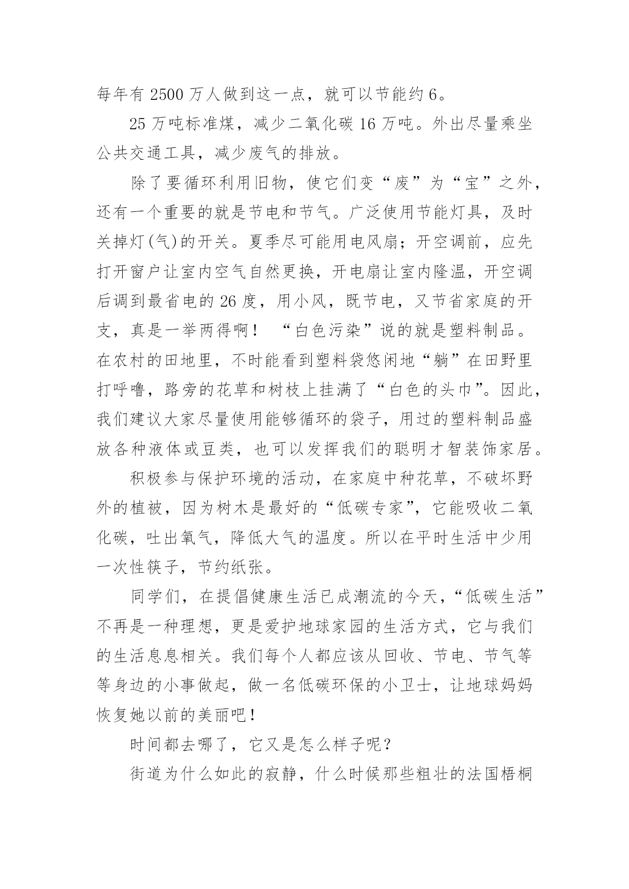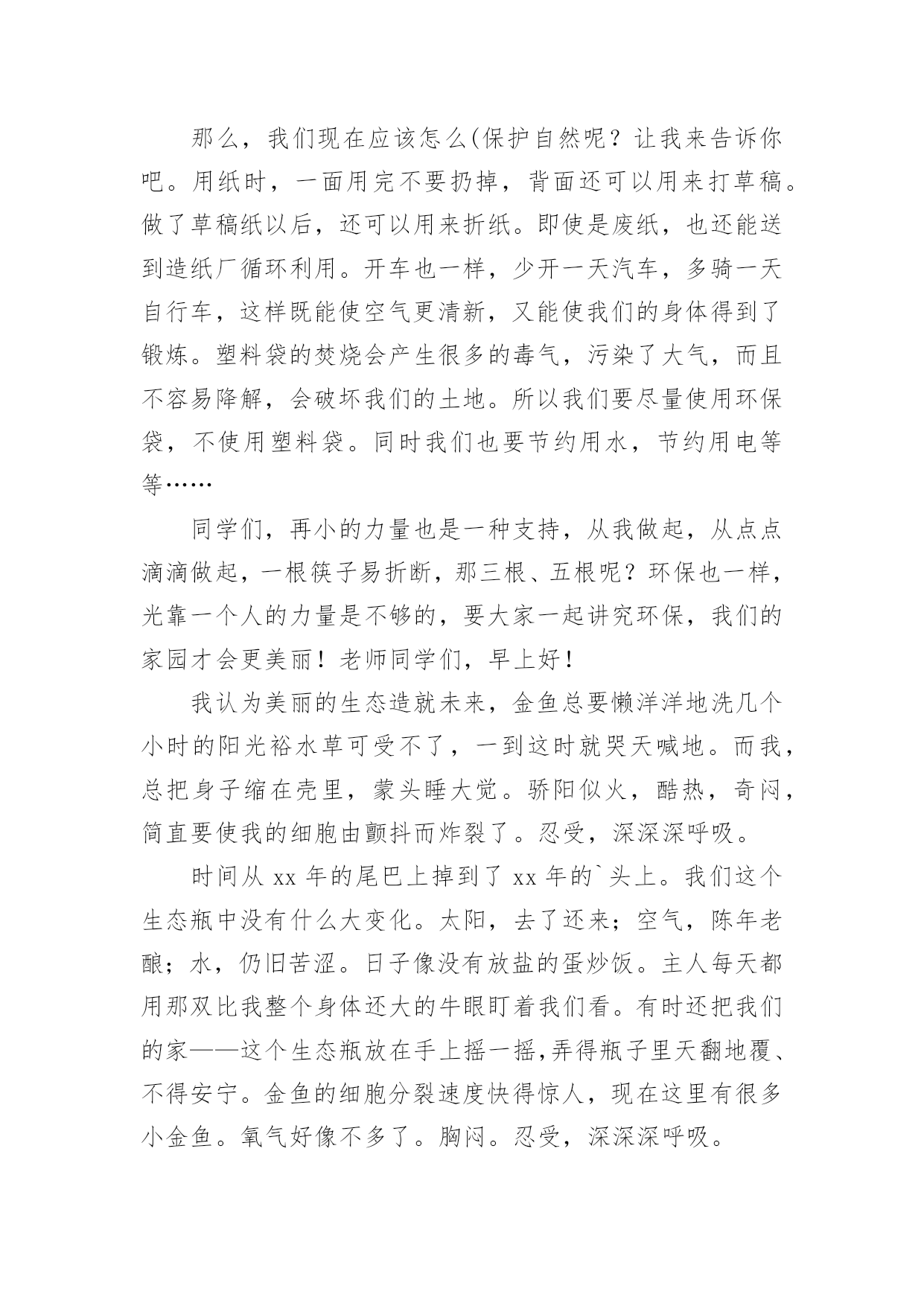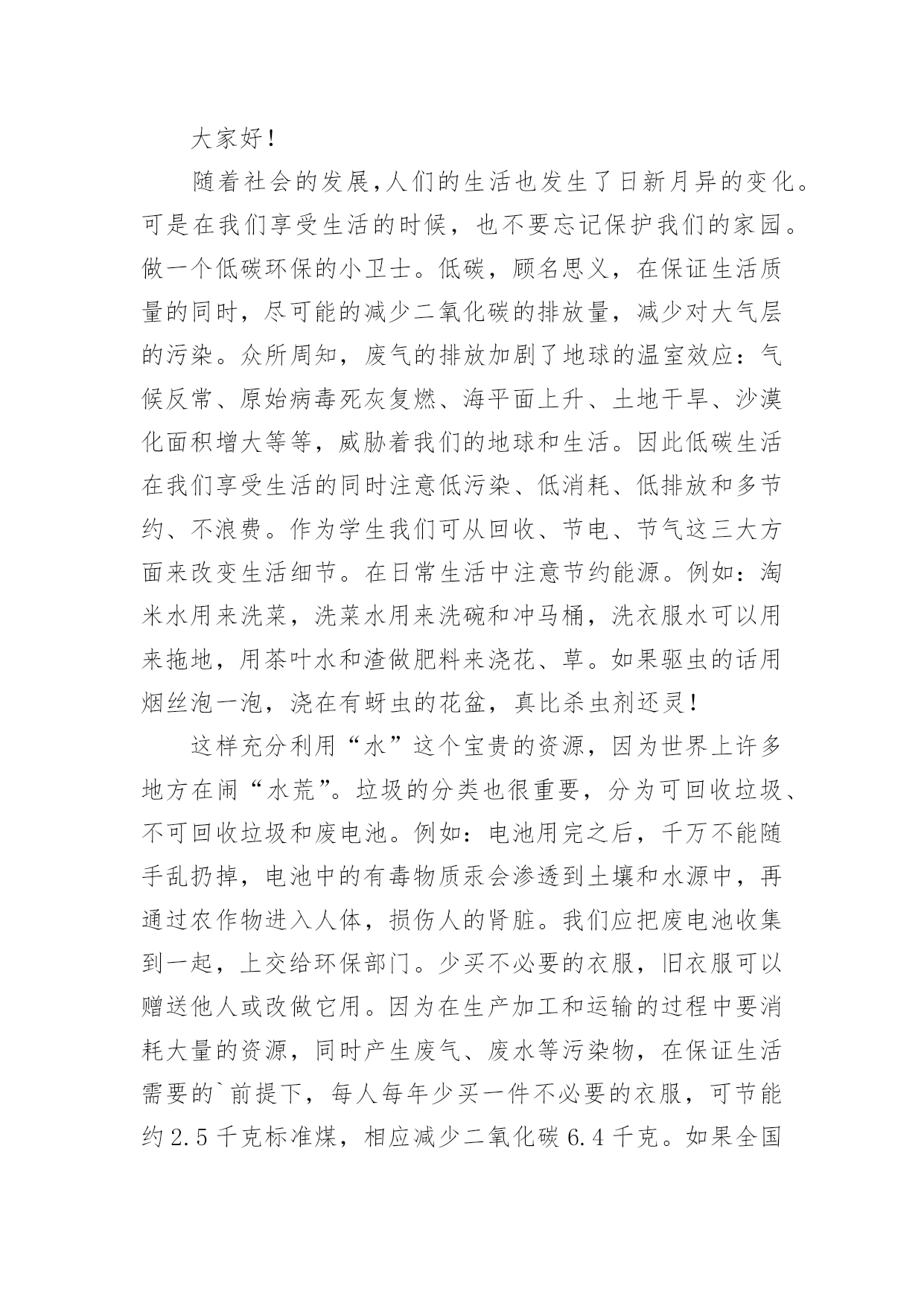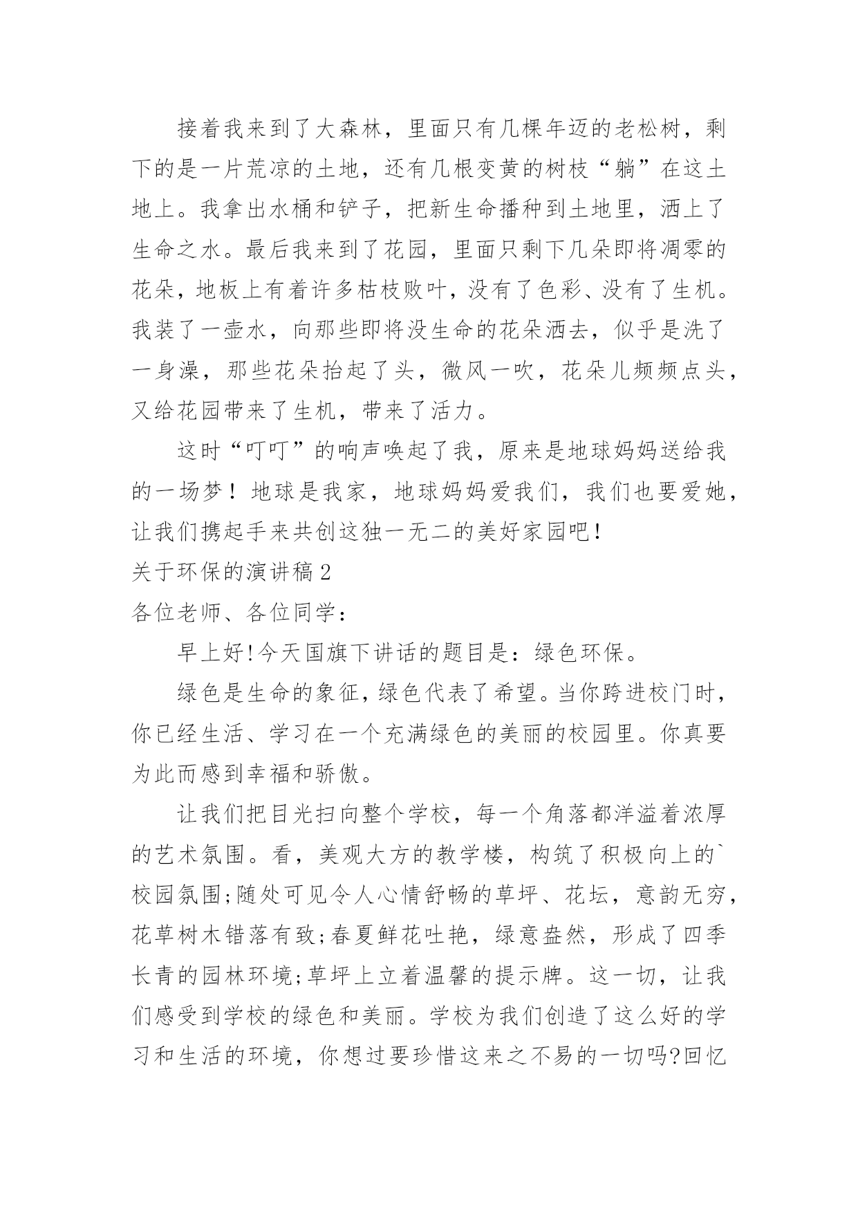 环保的演讲稿关于环保的演讲稿演讲稿的写法比较灵活,可以根据会议的内容、一件事事后的感想、需要等情况而有所区别。在日新月异的现代社会中,演讲稿在演讲中起到的作用越来越大,如何写一份恰当的演讲稿呢?下面是小编帮大家整理的关于环保的演讲稿,欢迎大家借鉴与参考,希望对大家有所帮助。关于环保的演讲稿1尊敬的老师、亲爱的同学们:大家好!地球是属于大家的,他无偿的供给我们各种资源,我们不能不顾后果肆意去破坏她,应该去保护,爱护她。一天,我来到了神秘世界,首先映入眼帘的是那片一望无际的沙漠,在阳光的照耀下,金黄的'沙子闪闪发光,但是却没有一点绿色的足迹。于是,我拿出树木种子,把它们投入了浩瀚的沙漠中。走过了沙漠,来到了小河边,原本清澈见底的河水,如今已变得浑浊不清了,一层层垃圾飘浮在水面上,自由自在地“游”来“游”去,我找来捞网,把垃圾捞到岸边,经过一次又一次的努力,垃圾终于被我全部捞完了,看着那堆积如山的垃圾,再看看那干净的湖水,心情一下子舒畅了许多。接着我来到了大森林,里面只有几棵年迈的老松树,剩下的是一片荒凉的土地,还有几根变黄的树枝“躺”在这土地上。我拿出水桶和铲子,把新生命播种到土地里,洒上了生命之水。最后我来到了花园,里面只剩下几朵即将凋零的花朵,地板上有着许多枯枝败叶,没有了色彩、没有了生机。我装了一壶水,向那些即将没生命的花朵洒去,似乎是洗了一身澡,那些花朵抬起了头,微风一吹,花朵儿频频点头,又给花园带来了生机,带来了活力。这时“叮叮”的响声唤起了我,原来是地球妈妈送给我的一场梦!地球是我家,地球妈妈爱我们,我们也要爱她,让我们携起手来共创这独一无二的美好家园吧!关于环保的演讲稿2各位老师、各位同学:早上好!今天国旗下讲话的题目是:绿色环保。绿色是生命的象征,绿色代表了希望。当你跨进校门时,你已经生活、学习在一个充满绿色的美丽的校园里。你真要为此而感到幸福和骄傲。让我们把目光扫向整个学校,每一个角落都洋溢着浓厚的艺术氛围。看,美观大方的教学楼,构筑了积极向上的`校园氛围;随处可见令人心情舒畅的草坪、花坛,意韵无穷,花草树木错落有致;春夏鲜花吐艳,绿意盎然,形成了四季长青的园林环境;草坪上立着温馨的提示牌。这一切,让我们感受到学校的绿色和美丽。学校为我们创造了这么好的学习和生活的环境,你想过要珍惜这来之不易的一切吗?回忆一下自己平时的一举一动,你是否做到了为保护、保持这美好的环境而努力?当你捡起别人掉下的一张纸时,你就已经做成了一件环保的事情;当你记得及时关灯,不浪费用电;当你用好水笼头能及时关掉,而不让水白白流掉;当你下课、活动时能做到有秩序、有克制,而不是高声喧哗;你就已经在做着环保卫士应该做的事情了。诸如此类的很多小事,其实我们都能做到。同学们,为了我们共同的家园,我们每一个人都应该也必须有勇气站起来做出承诺,承诺用我们的实际行动来保证我们的校园永远美丽、干净。多弯弯腰捡捡果皮纸屑,多走几步,不要穿越绿化带,践踏花草。同学们,让我们从我做起,从小做起,从身边做起,从现在做起。保护地球母亲,净化绿色校园。关于环保的演讲稿3尊敬的评委老师,各位朋友:大家好!首先,低碳的生活方式,就是在生活的细节上注重节能减耗。除了做作业必须开灯之外,其余的事情都靠窗外的照明灯来相助。因为我们的客厅大,窗外的照明灯照进来都可以醒目地看到室内的一切,吃饭时,真像一桌“烛光晚餐”,这真是一大盏“天然的灯啊!”只要我洗好手,就都把水龙头拧的紧紧地,不让水“逃”出来,这样,我就可以安心了。但我又担忧爸爸妈妈会不会做好,每次看见爸爸妈妈进洗手间洗手并顺其自然的把水龙头关紧,我十分高兴,我希望“低碳家庭”会做的更好。冰箱里放着乱七八糟的东西,妈妈说很浪费电,我灵机一动,想出了妙招:于是,我就拿起以前堆积如山的硬纸板,把它做成一个个大小不一的盒子,上面贴上了各种分类的标志,然后,按分类去整理,不一会儿,冰箱变得又干净又整洁,焕然一新,一眼就目睹摆放整整齐齐的东西。这样,既帮助了我们,又节省了电。原来,电器开着,就连小小的手机电池在插座上插着时都会排放出可怕的二氧化碳,只要充完电就应该将电池立刻取下。我本来以为,二氧化碳只有汽车尾气、煤炭燃烧这些会排放,没想到生活中处处都有微弱的“碳”在侵害着我们大家的生活和地球。每当我看见妈妈要把洗衣粉的桶扔掉时,我会上前去阻止。我会把它做成一个小垃圾桶,有的像个洋娃娃,粉嘟嘟的脸,可爱极了!有的又的`像只小动物,活灵活现的,真像一道美丽的“风景”!当夜幕降临,晚饭过后,路边的霓虹灯为夜晚增添了一份光彩,老爸总是把家里所有的灯都关掉,只剩下一片伸手不见五指的黑暗中,然后,趴在窗户上,一边欣赏路边的风景,一边唱着一首歌:“月亮代表我的心……”真是五音不全,一塌糊涂。养花是妈妈的爱好。家里的吊兰、常春藤一年四季都是绿意盎然。