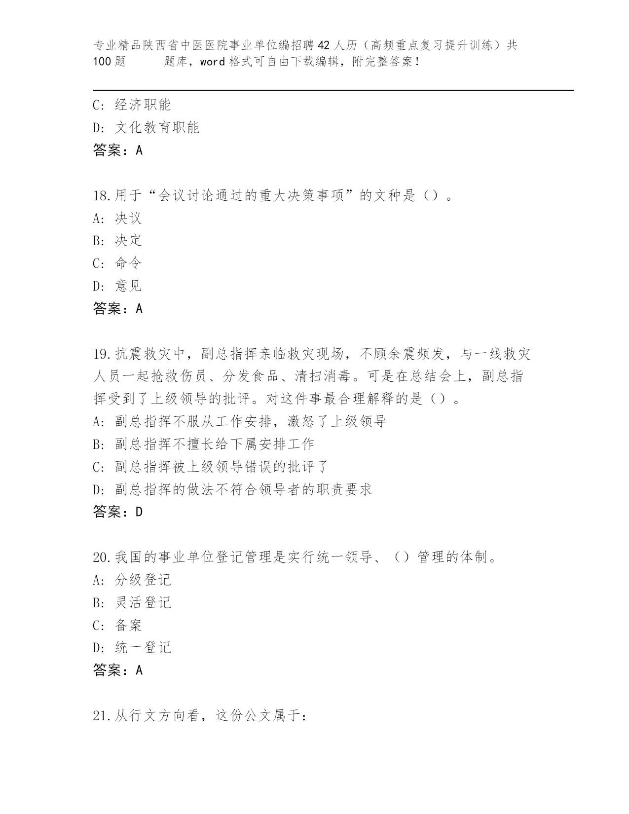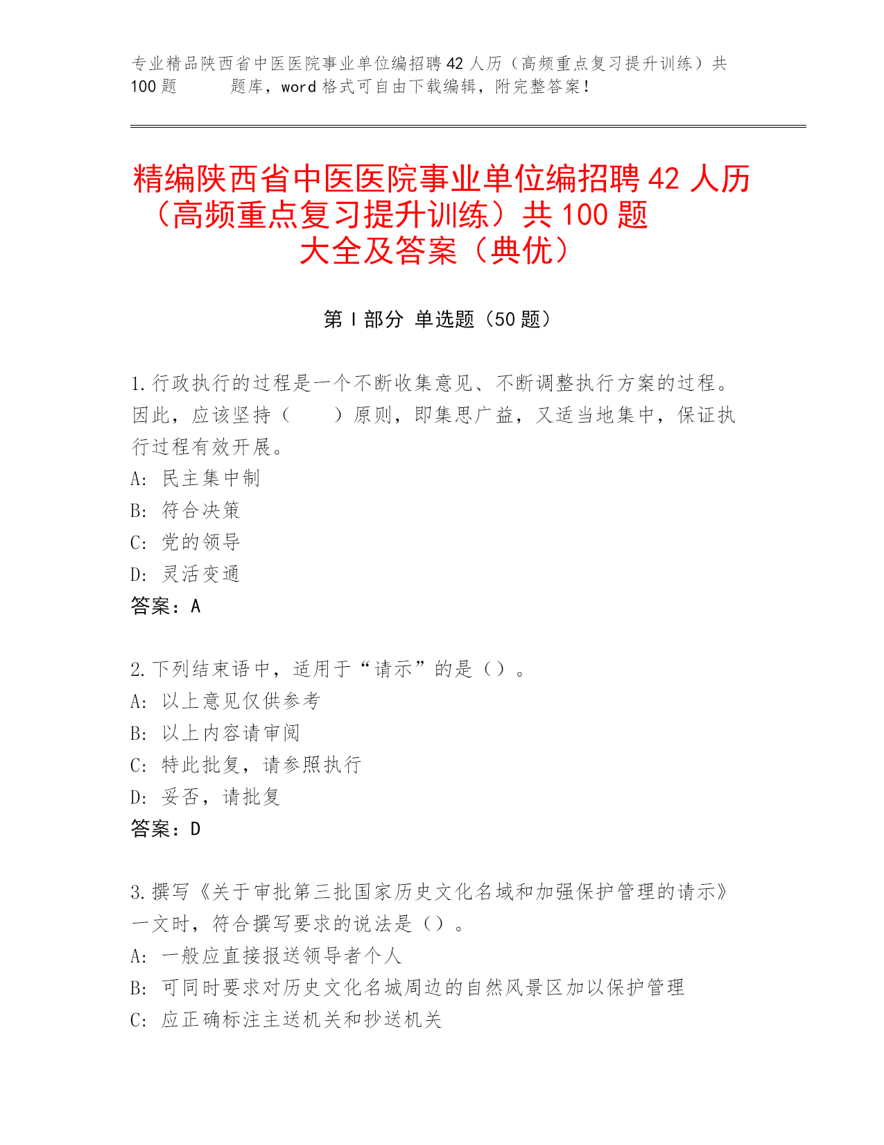精心整理陕西省中医医院事业单位编招聘42人历(高频重点复习提升训练)共100题 优选题库(典优)