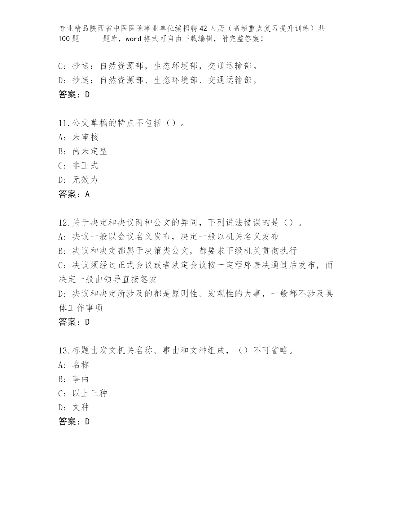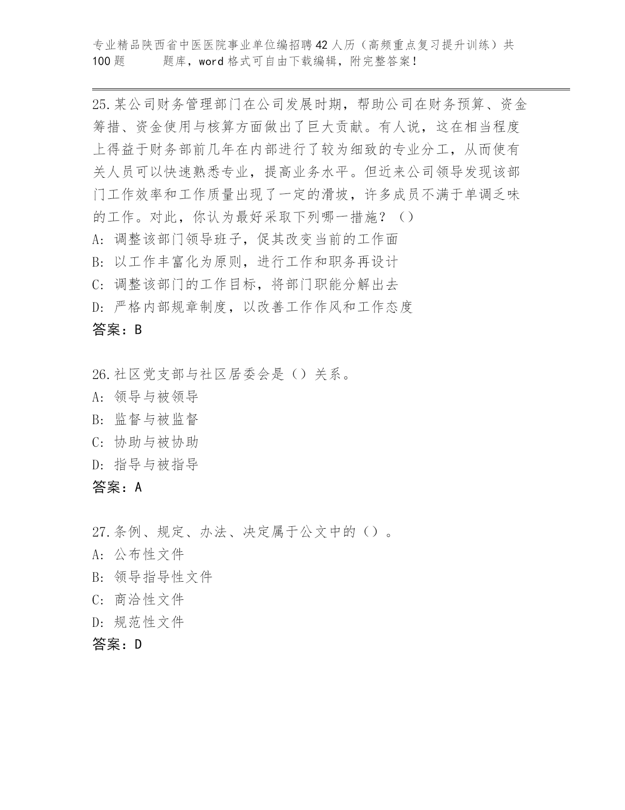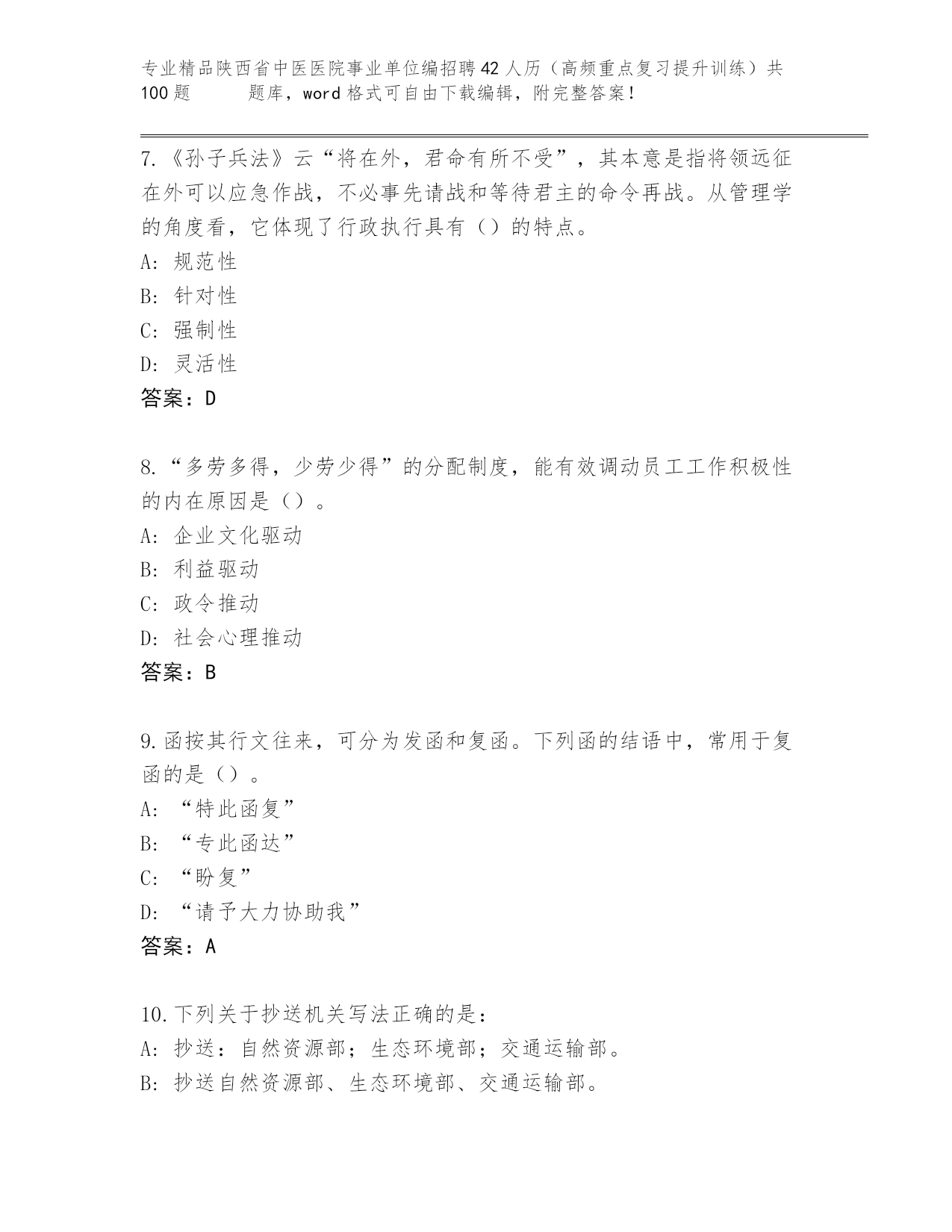 精编陕西省中医医院事业单位编招聘42人历(高频重点复习提升训练)共100题 题库大全可打印