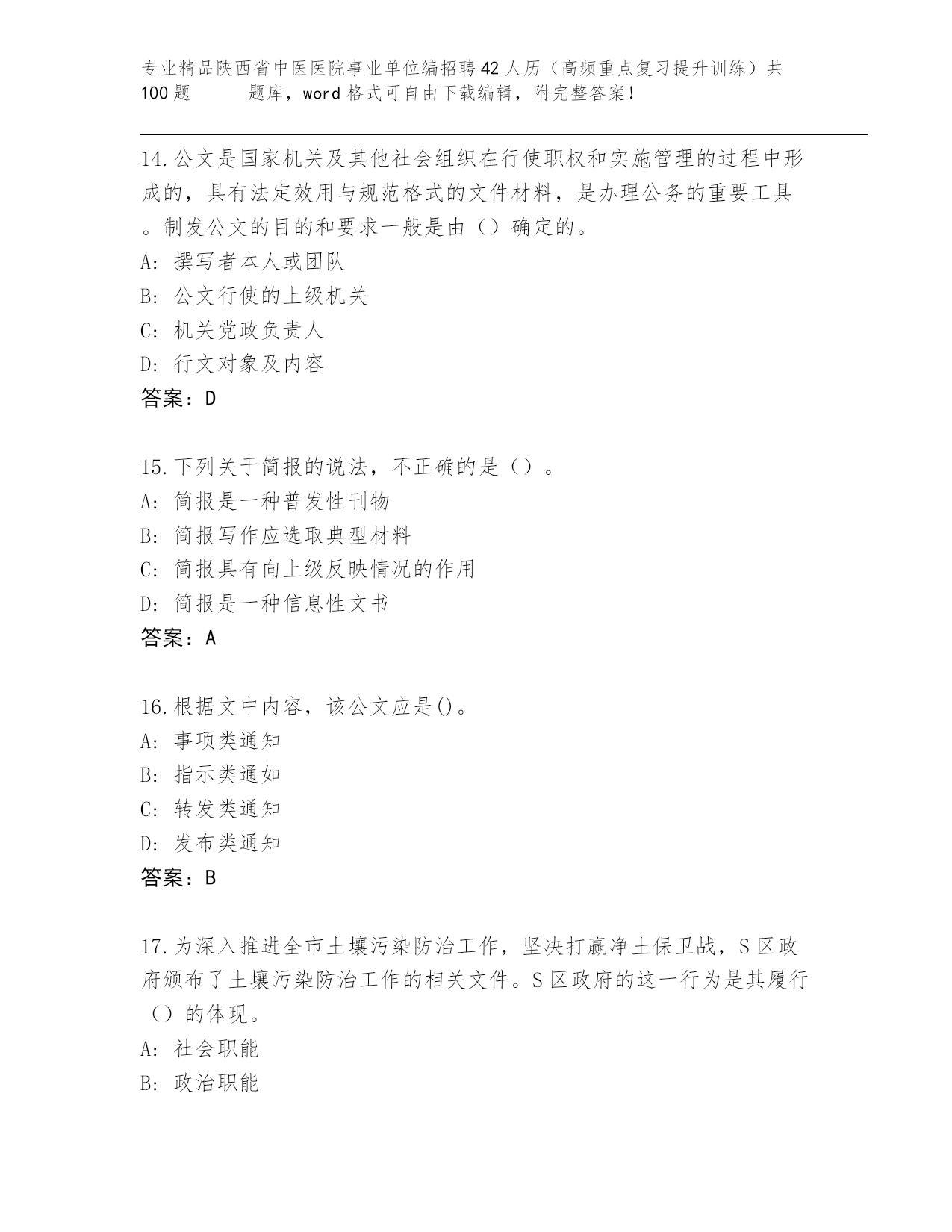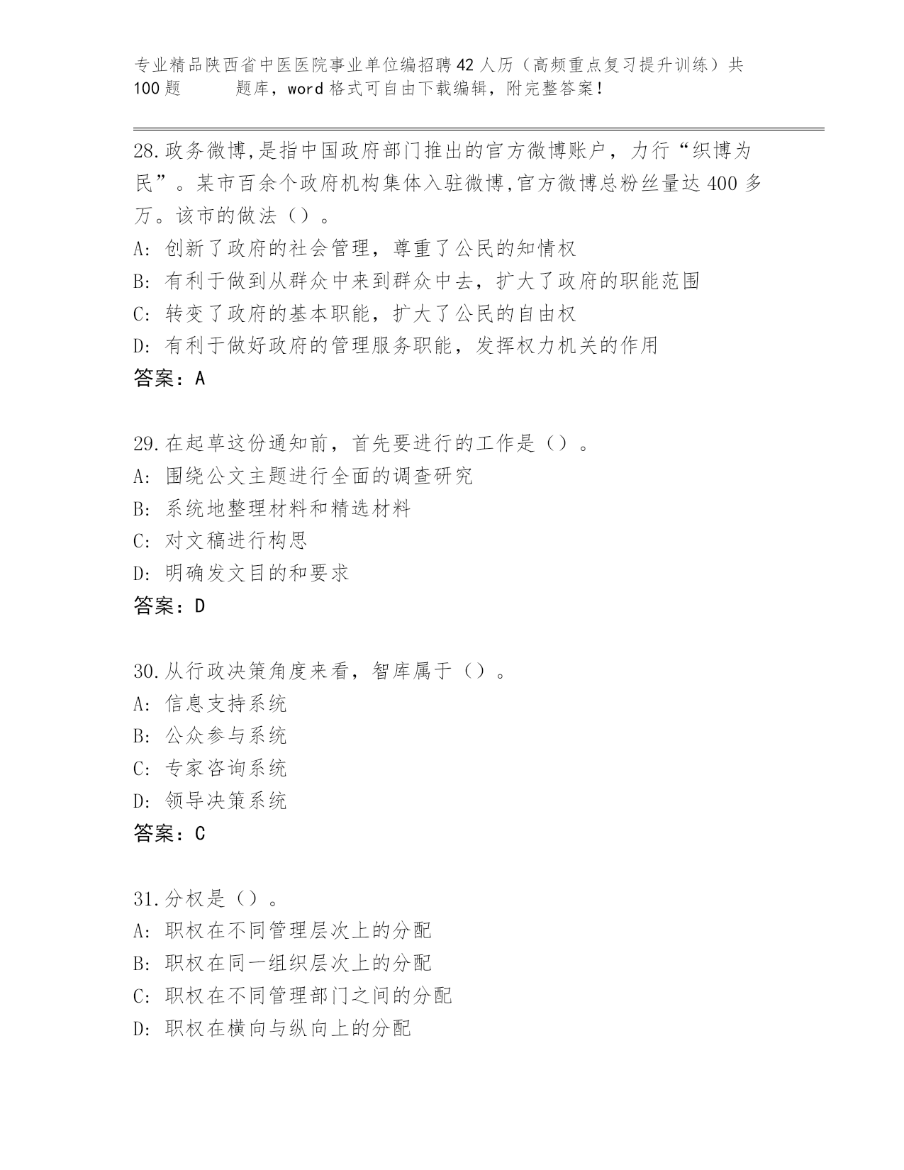精编陕西省中医医院事业单位编招聘42人历(高频重点复习提升训练)共100题 大全及答案(典优)