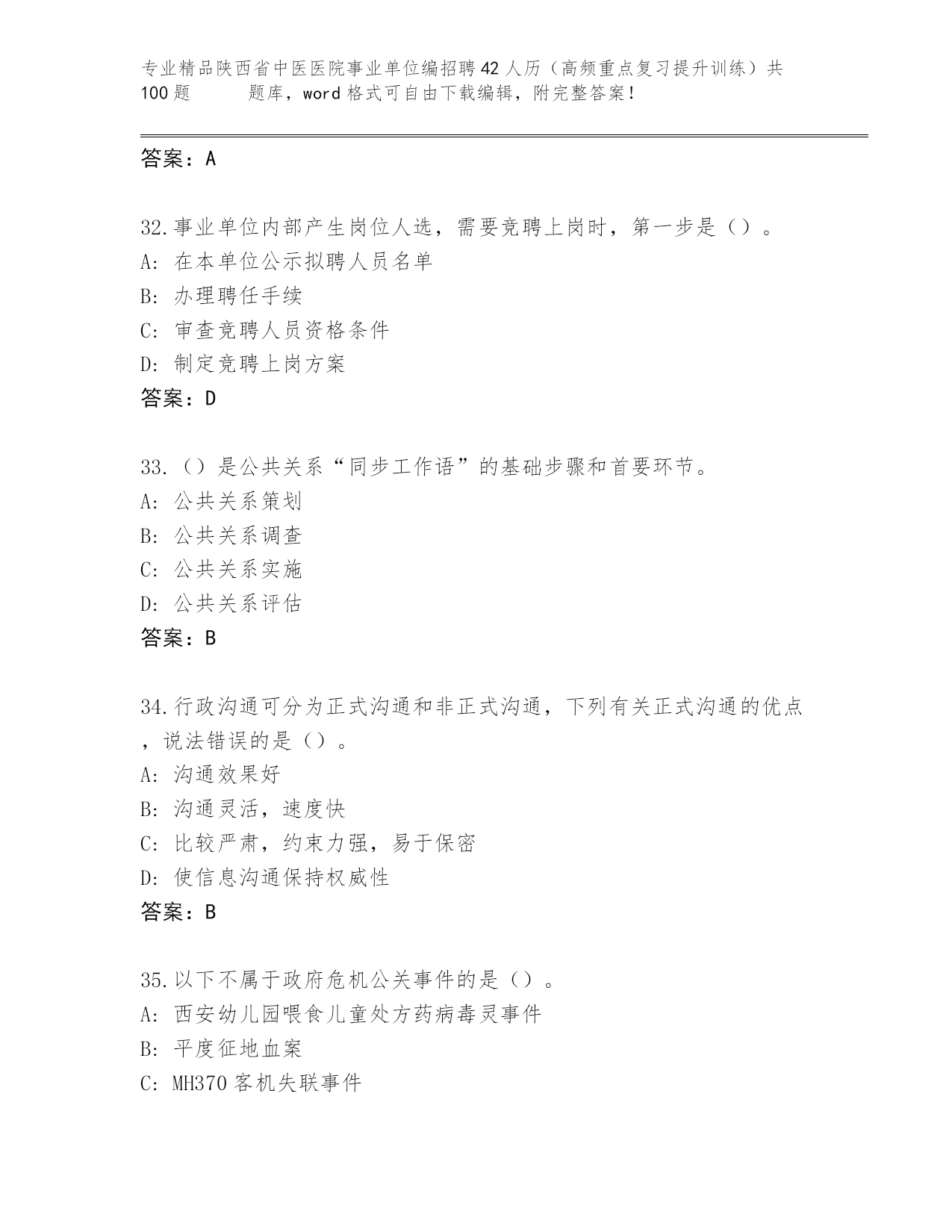 精编陕西省中医医院事业单位编招聘42人历(高频重点复习提升训练)共100题 通用题库附答案【基础题】