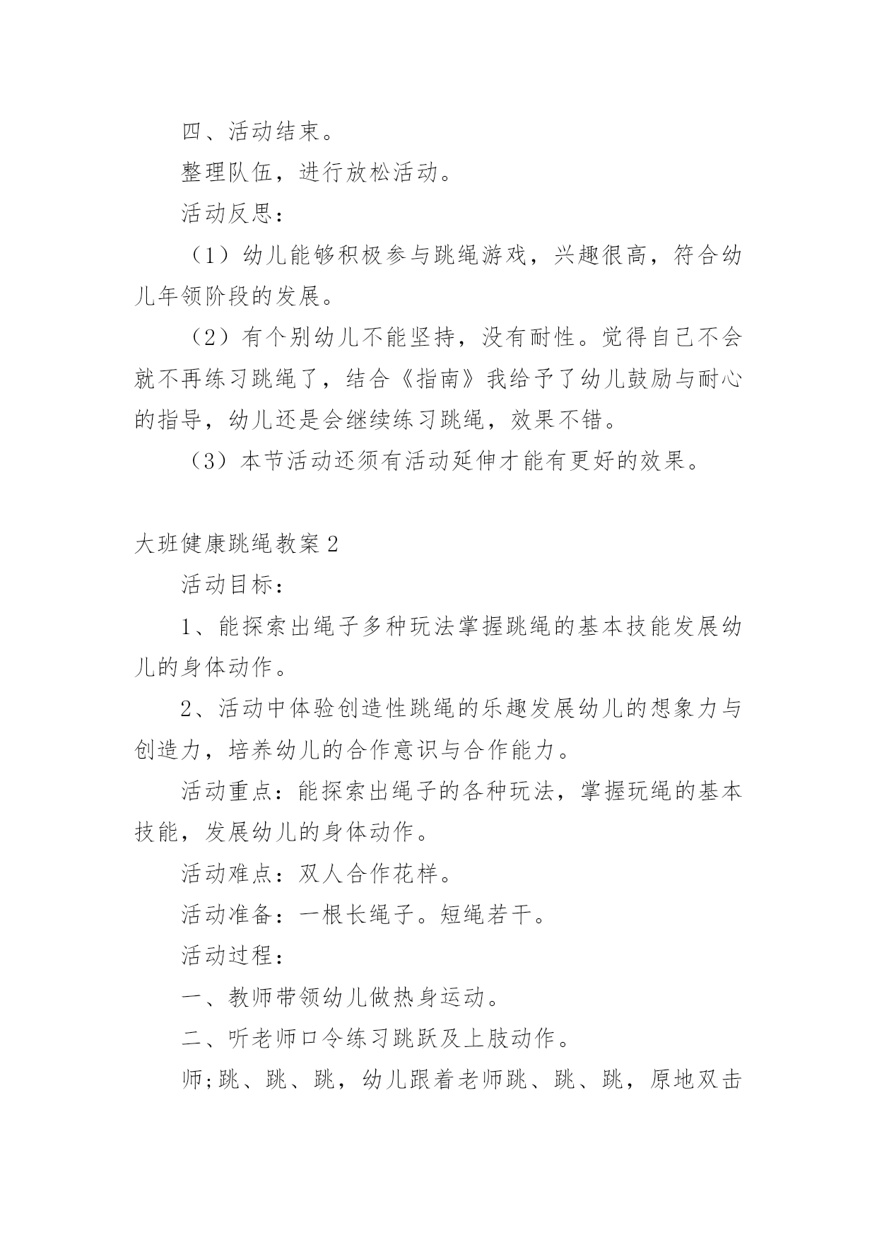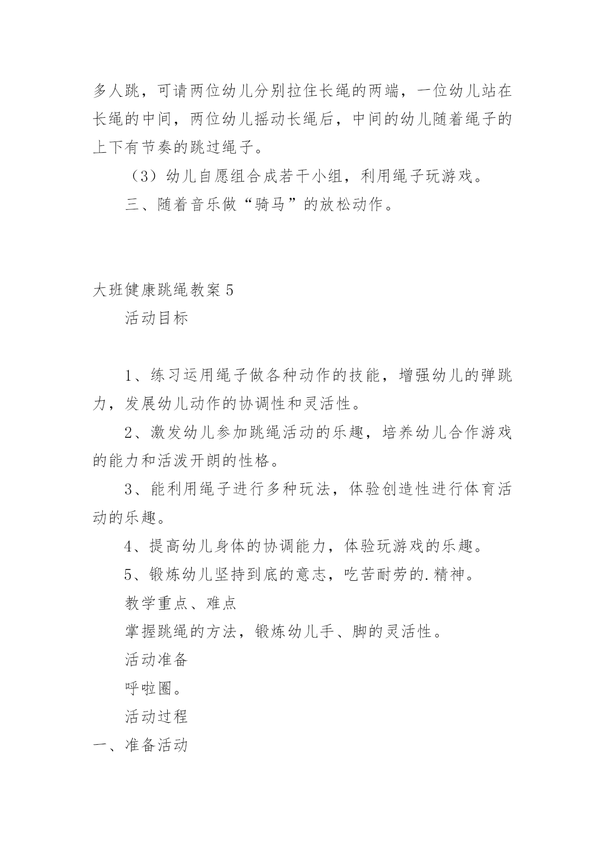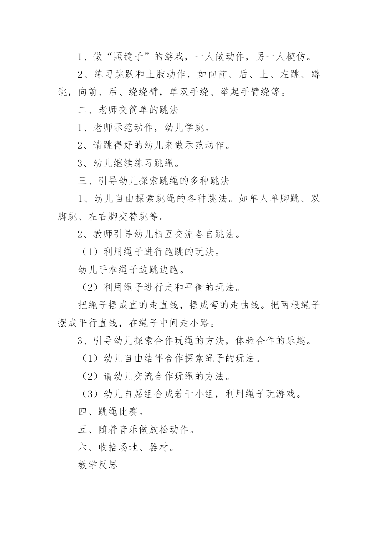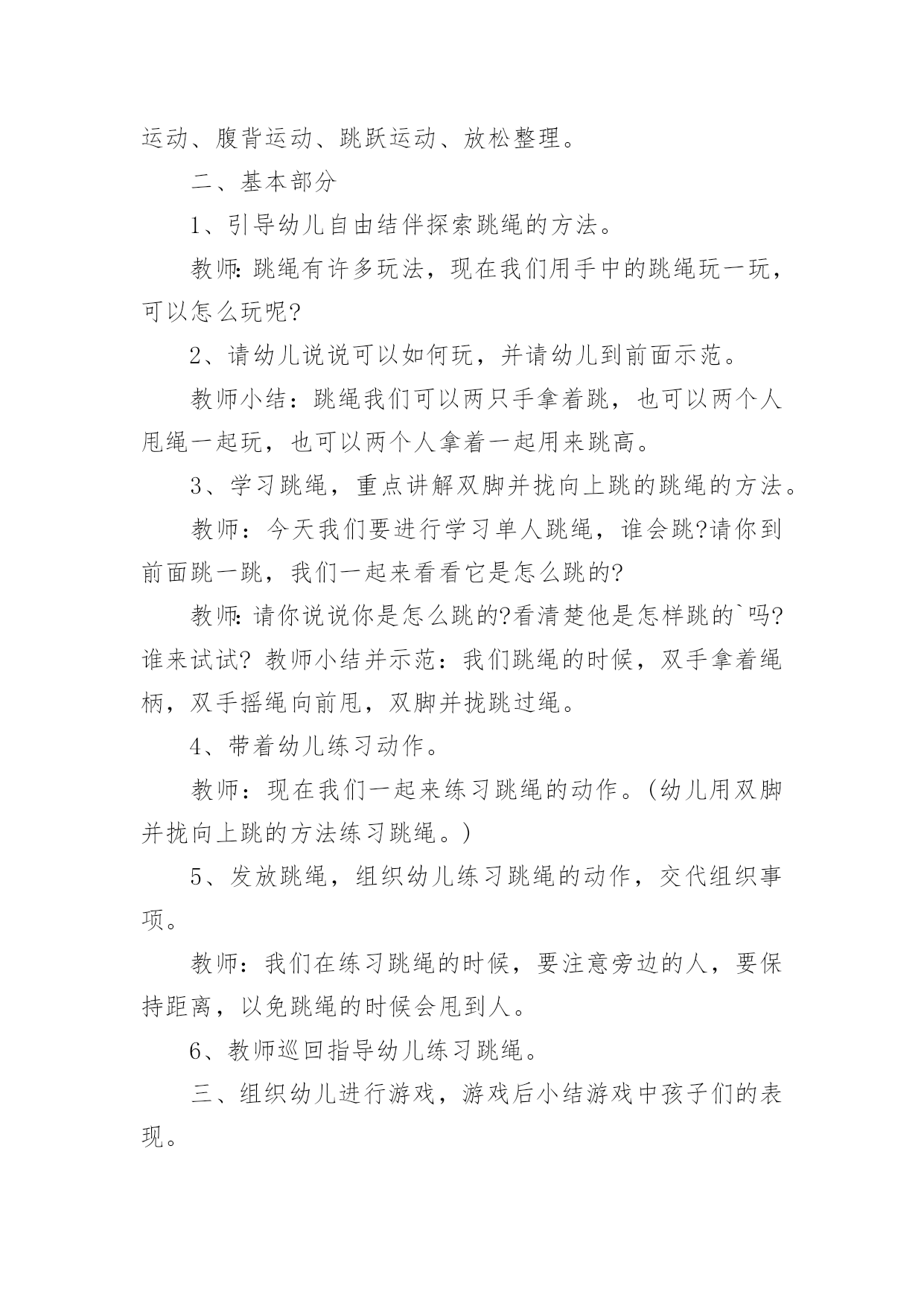 大班健康跳绳教案作为一名无私奉献的老师,时常需要用到教案,教案有助于学生理解并掌握系统的知识。那么优秀的教案是什么样的呢?以下是小编收集整理的大班健康跳绳教案,欢迎大家分享。大班健康跳绳教案1活动目标:1、初步掌握向前甩绳,双脚并拢向上跳的跳绳方法。2、培养幼儿不怕失败,不断努力的坚韧精神。3、通过活动锻炼幼儿的跳跃能力,让他们的身体得到锻炼。4、培养竞争意识,体验游戏带来的挑战与快乐。5、锻炼平衡能力及快速反应能力。活动准备:每位幼儿一根绳。活动过程:一、开始部分。1、两两拉手排好队到操场,进行队列练习。教师:进行基本队列练习,幼儿由一路纵队站成六队:立正、向前看齐、成体操队形散开。2、进行热身运动。教师带领幼儿做上肢运动、下蹲运动、体侧运动、体转运动、腹背运动、跳跃运动、放松整理。二、基本部分1、引导幼儿自由结伴探索跳绳的方法。教师:跳绳有许多玩法,现在我们用手中的跳绳玩一玩,可以怎么玩呢?2、请幼儿说说可以如何玩,并请幼儿到前面示范。教师小结:跳绳我们可以两只手拿着跳,也可以两个人甩绳一起玩,也可以两个人拿着一起用来跳高。3、学习跳绳,重点讲解双脚并拢向上跳的跳绳的方法。教师:今天我们要进行学习单人跳绳,谁会跳?请你到前面跳一跳,我们一起来看看它是怎么跳的?教师:请你说说你是怎么跳的?看清楚他是怎样跳的`吗?谁来试试?教师小结并示范:我们跳绳的时候,双手拿着绳柄,双手摇绳向前甩,双脚并拢跳过绳。4、带着幼儿练习动作。教师:现在我们一起来练习跳绳的动作。(幼儿用双脚并拢向上跳的方法练习跳绳。)5、发放跳绳,组织幼儿练习跳绳的动作,交代组织事项。教师:我们在练习跳绳的时候,要注意旁边的人,要保持距离,以免跳绳的时候会甩到人。6、教师巡回指导幼儿练习跳绳。三、组织幼儿进行游戏,游戏后小结游戏中孩子们的表现。四、活动结束。整理队伍,进行放松活动。活动反思:(1)幼儿能够积极参与跳绳游戏,兴趣很高,符合幼儿年领阶段的发展。(2)有个别幼儿不能坚持,没有耐性。觉得自己不会就不再练习跳绳了,结合《指南》我给予了幼儿鼓励与耐心的指导,幼儿还是会继续练习跳绳,效果不错。(3)本节活动还须有活动延伸才能有更好的效果。大班健康跳绳教案2活动目标:1、能探索出绳子多种玩法掌握跳绳的基本技能发展幼儿的身体动作。2、活动中体验创造性跳绳的乐趣发展幼儿的想象力与创造力,培养幼儿的合作意识与合作能力。活动重点:能探索出绳子的各种玩法,掌握玩绳的基本技能,发展幼儿的身体动作。活动难点:双人合作花样。活动准备:一根长绳子。短绳若干。活动过程:一、教师带领幼儿做热身运动。二、听老师口令练习跳跃及上肢动作。师;跳、跳、跳,幼儿跟着老师跳、跳、跳,原地双击此处师问;"还可以怎么跳?"引导幼儿向前跳、向后跳、向上跳、蹲跳、向左跳、向右跳、单、双脚跳。三、上肢活动师绕绕臂,绕绕臂。幼儿跟着老师绕绕臂。师问"还可怎样绕"引导幼儿向前饶、向后绕、单、双手绕、举起手臂绕等,发展幼儿动作的灵活性。四、引导幼儿探索跳绳的多种玩法1、单人双脚跳。幼儿两人或三人一组,有人单脚跳绳,其他人跟着节奏数数。看一看谁跳的多。2、双人双脚跳。两人一根绳子,幼儿面对面,两人同时双脚一起跳,跳得多者为胜。3、幼儿自由结伴2人、3人或多人合作探索跳绳的玩法。长绳一根,两名幼儿在两头摇动绳子,其他幼儿2-3人一起跳。看谁跳得多,多者为胜。4、请幼儿相互交流合作玩游戏的方法。五、活动结束随着老师做整理运动活动反思:1、在活动中,探索了绳子的多种玩法,充分调动了幼儿参与跳绳活动的乐趣,发展了幼儿的.想像力和创造力。2、活动安排既有个人自由探索,又有小组探索,教师在幼儿自由探索时,能够较多地观察幼儿,发现幼儿找到的好的玩法,从而介绍给别的幼儿相互交流。通过小组探索,培养了幼儿的合作意识。3、作为教师在引导幼儿探索跳绳的玩法时,对能力弱的幼儿没能有针对性的进行帮助和指导。大班健康跳绳教案3一、由易到难不同程度的进行跳绳活动我们大班的老师经过研究决定跳绳可分为:连续不间断的跳绳、单脚跳、两脚行进跳、跳大绳等活动,我们会根据每个孩子的体能来进行活动的安排。二、不同阶段的教学安排1、连续不间断跳绳我们首先以集体为单位进行学习跳绳的基本技能,请孩子们利用课余时间和早接待时间进行练习,对于个别的孩子老师应该进行个别辅导,特别是动作协调不好的幼儿教师要进行跟踪,让每个孩子都能掌握跳绳的技能,多练习,多锻炼,其次以小组为单位进行展示活动,老师会拿出一节课的时间请小朋友们自己来展示跳绳活动,通过以大带小或是以强带弱来进行帮扶活动这样也可以激发孩子们的跳绳兴趣。最后进行跳绳比赛。经过几周的练习孩子们会在不同程度上有提高的,所以为了增加跳绳的兴趣我们会进行跳绳的比赛活动,以班级小组为单位,先选出小组中的佼佼者,然后进行小