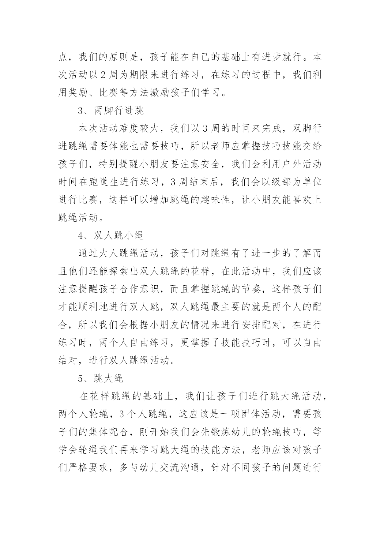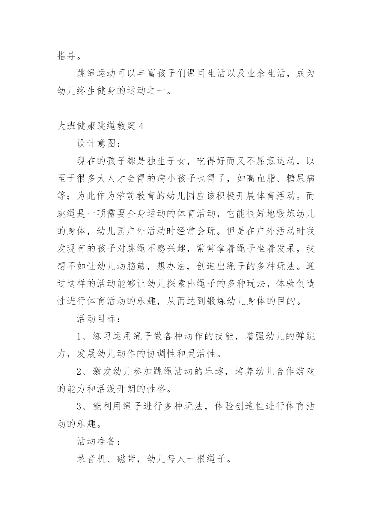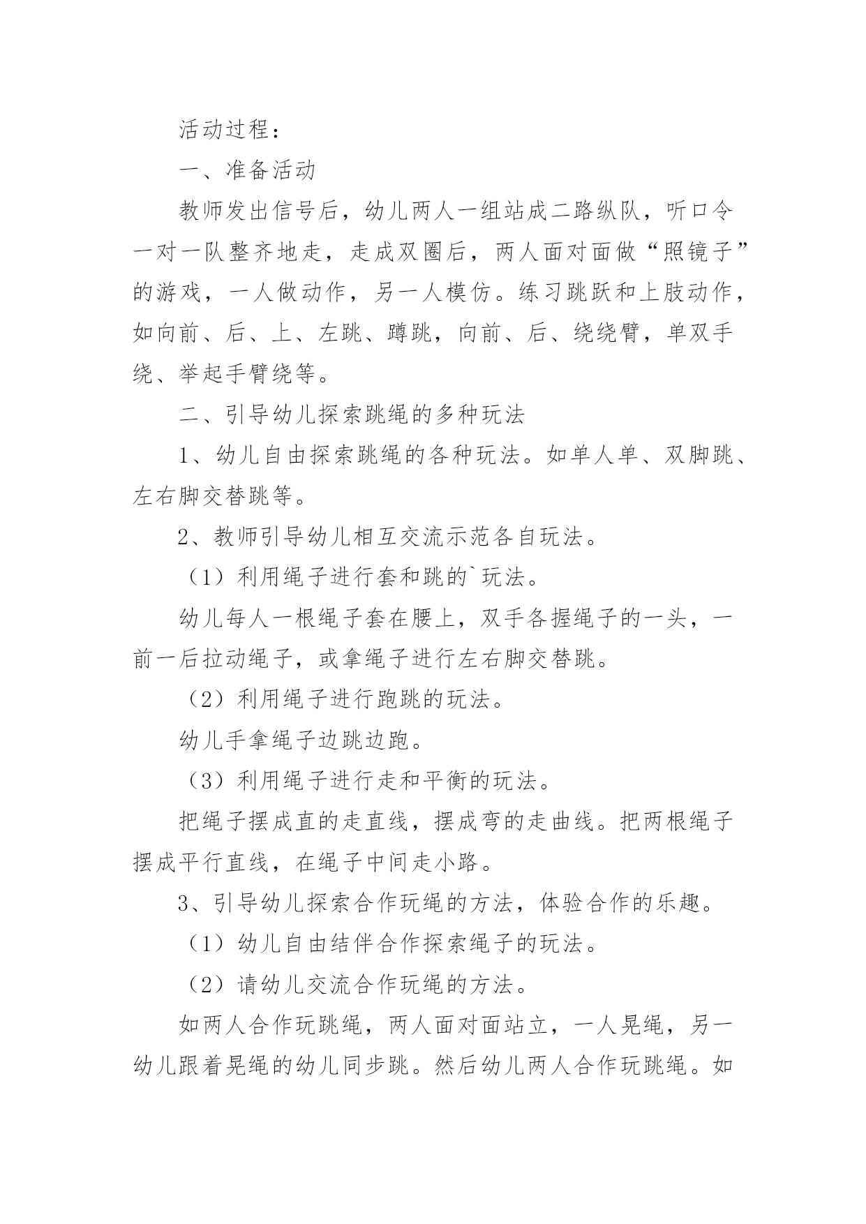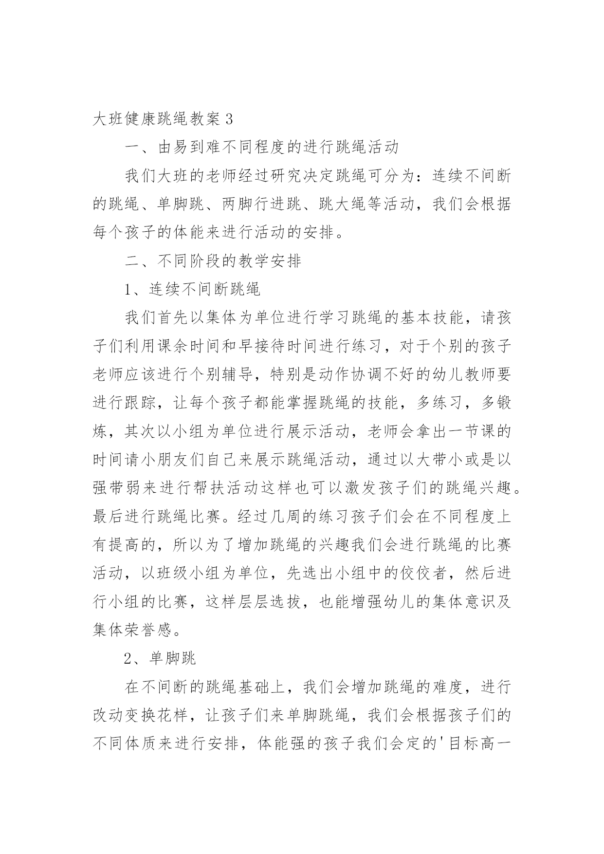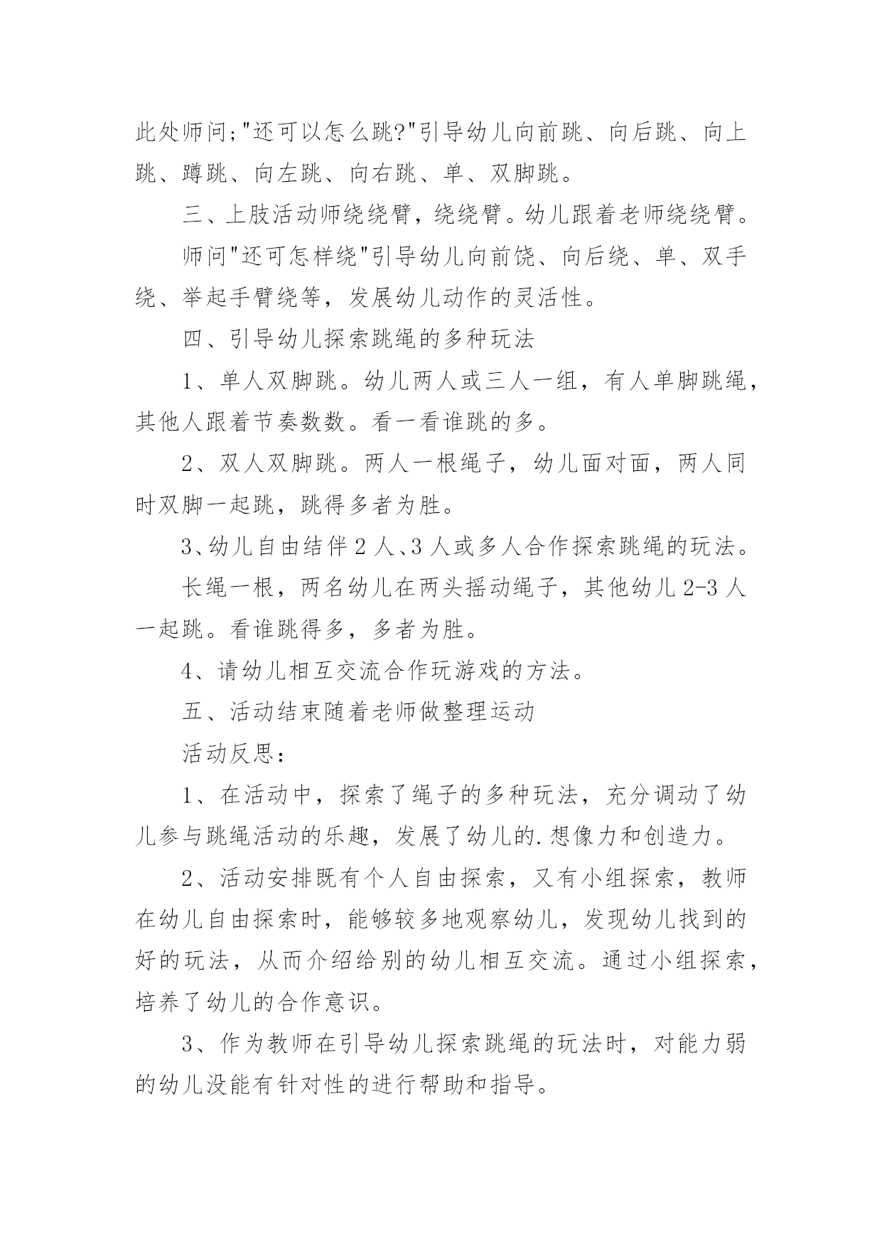 大班健康跳绳教案作为一名无私奉献的老师,时常需要用到教案,教案有助于学生理解并掌握系统的知识。那么优秀的教案是什么样的呢?以下是小编收集整理的大班健康跳绳教案,欢迎大家分享。大班健康跳绳教案1活动目标:1、初步掌握向前甩绳,双脚并拢向上跳的跳绳方法。2、培养幼儿不怕失败,不断努力的坚韧精神。3、通过活动锻炼幼儿的跳跃能力,让他们的身体得到锻炼。4、培养竞争意识,体验游戏带来的挑战与快乐。5、锻炼平衡能力及快速反应能力。活动准备:每位幼儿一根绳。活动过程:一、开始部分。1、两两拉手排好队到操场,进行队列练习。教师:进行基本队列练习,幼儿由一路纵队站成六队:立正、向前看齐、成体操队形散开。2、进行热身运动。教师带领幼儿做上肢运动、下蹲运动、体侧运动、体转运动、腹背运动、跳跃运动、放松整理。二、基本部分1、引导幼儿自由结伴探索跳绳的方法。教师:跳绳有许多玩法,现在我们用手中的跳绳玩一玩,可以怎么玩呢?2、请幼儿说说可以如何玩,并请幼儿到前面示范。教师小结:跳绳我们可以两只手拿着跳,也可以两个人甩绳一起玩,也可以两个人拿着一起用来跳高。3、学习跳绳,重点讲解双脚并拢向上跳的跳绳的方法。教师:今天我们要进行学习单人跳绳,谁会跳?请你到前面跳一跳,我们一起来看看它是怎么跳的?教师:请你说说你是怎么跳的?看清楚他是怎样跳的`吗?谁来试试?教师小结并示范:我们跳绳的时候,双手拿着绳柄,双手摇绳向前甩,双脚并拢跳过绳。4、带着幼儿练习动作。教师:现在我们一起来练习跳绳的动作。(幼儿用双脚并拢向上跳的方法练习跳绳。)5、发放跳绳,组织幼儿练习跳绳的动作,交代组织事项。教师:我们在练习跳绳的时候,要注意旁边的人,要保持距离,以免跳绳的时候会甩到人。6、教师巡回指导幼儿练习跳绳。三、组织幼儿进行游戏,游戏后小结游戏中孩子们的表现。四、活动结束。整理队伍,进行放松活动。活动反思:(1)幼儿能够积极参与跳绳游戏,兴趣很高,符合幼儿年领阶段的发展。(2)有个别幼儿不能坚持,没有耐性。觉得自己不会就不再练习跳绳了,结合《指南》我给予了幼儿鼓励与耐心的指导,幼儿还是会继续练习跳绳,效果不错。(3)本节活动还须有活动延伸才能有更好的效果。大班健康跳绳教案2活动目标:1、能探索出绳子多种玩法掌握跳绳的基本技能发展幼儿的身体动作。2、活动中体验创造性跳绳的乐趣发展幼儿的想象力与创造力,培养幼儿的合作意识与合作能力。活动重点:能探索出绳子的各种玩法,掌握玩绳的基本技能,发展幼儿的身体动作。活动难点:双人合作花样。活动准备:一根长绳子。短绳若干。活动过程:一、教师带领幼儿做热身运动。二、听老师口令练习跳跃及上肢动作。师;跳、跳、跳,幼儿跟着老师跳、跳、跳,原地双击此处师问;"还可以怎么跳?"引导幼儿向前跳、向后跳、向上跳、蹲跳、向左跳、向右跳、单、双脚跳。三、上肢活动师绕绕臂,绕绕臂。幼儿跟着老师绕绕臂。师问"还可怎样绕"引导幼儿向前饶、向后绕、单、双手绕、举起手臂绕等,发展幼儿动作的灵活性。四、引导幼儿探索跳绳的多种玩法1、单人双脚跳。幼儿两人或三人一组,有人单脚跳绳,其他人跟着节奏数数。看一看谁跳的多。2、双人双脚跳。两人一根绳子,幼儿面对面,两人同时双脚一起跳,跳得多者为胜。3、幼儿自由结伴2人、3人或多人合作探索跳绳的玩法。长绳一根,两名幼儿在两头摇动绳子,其他幼儿2-3人一起跳。看谁跳得多,多者为胜。4、请幼儿相互交流合作玩游戏的方法。五、活动结束随着老师做整理运动活动反思:1、在活动中,探索了绳子的多种玩法,充分调动了幼儿参与跳绳活动的乐趣,发展了幼儿的.想像力和创造力。2、活动安排既有个人自由探索,又有小组探索,教师在幼儿自由探索时,能够较多地观察幼儿,发现幼儿找到的好的玩法,从而介绍给别的幼儿相互交流。通过小组探索,培养了幼儿的合作意识。3、作为教师在引导幼儿探索跳绳的玩法时,对能力弱的幼儿没能有针对性的进行帮助和指导。大班健康跳绳教案3一、由易到难不同程度的进行跳绳活动我们大班的老师经过研究决定跳绳可分为:连续不间断的跳绳、单脚跳、两脚行进跳、跳大绳等活动,我们会根据每个孩子的体能来进行活动的安排。二、不同阶段的教学安排1、连续不间断跳绳我们首先以集体为单位进行学习跳绳的基本技能,请孩子们利用课余时间和早接待时间进行练习,对于个别的孩子老师应该进行个别辅导,特别是动作协调不好的幼儿教师要进行跟踪,让每个孩子都能掌握跳绳的技能,多练习,多锻炼,其次以小组为单位进行展示活动,老师会拿出一节课的时间请小朋友们自己来展示跳绳活动,通过以大带小或是以强带弱来进行帮扶活动这样也可以激发孩子们的跳绳兴趣。最后进行跳绳比赛。经过几周的练习孩子们会在不同程度上有提高的,所以为了增加跳绳的兴趣我们会进行跳绳的比赛活动,以班级小组为单位,先选出小组中的佼佼者,然后进行小