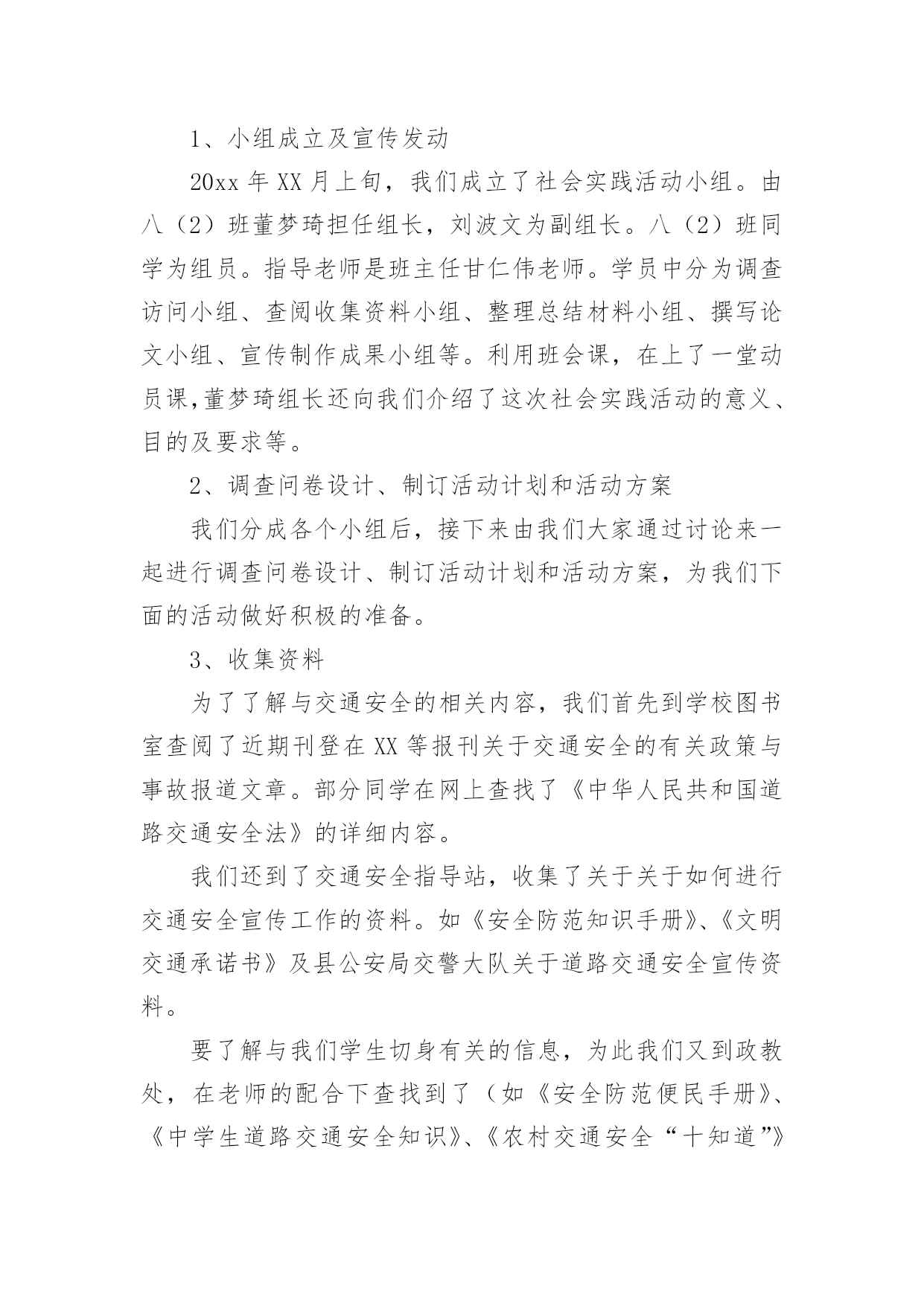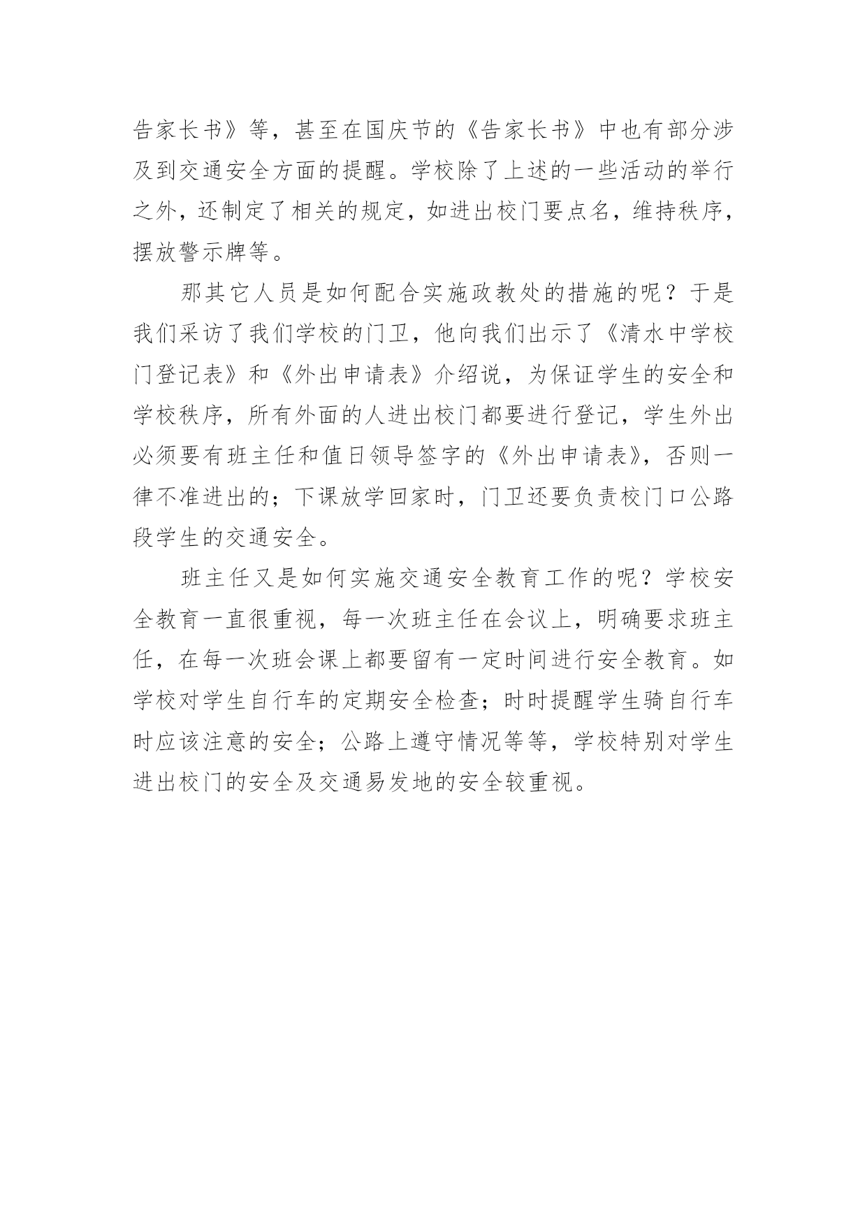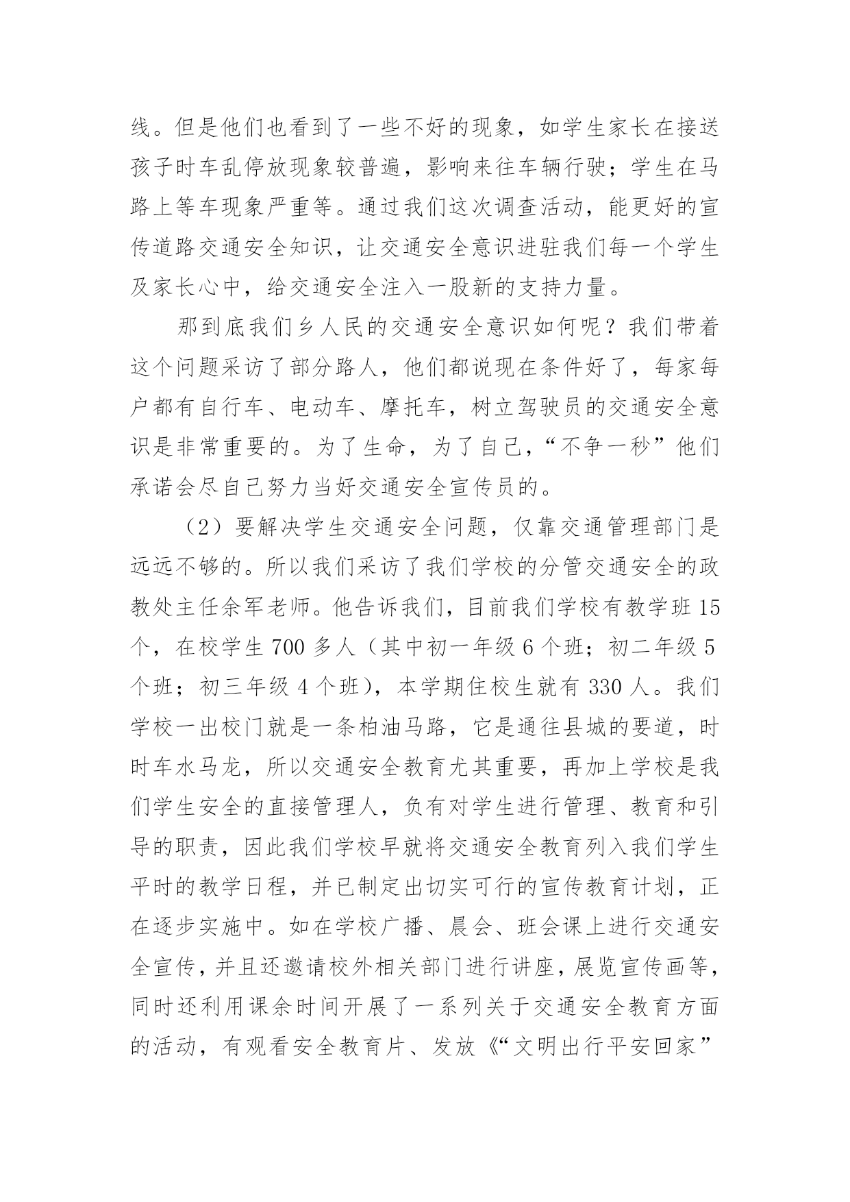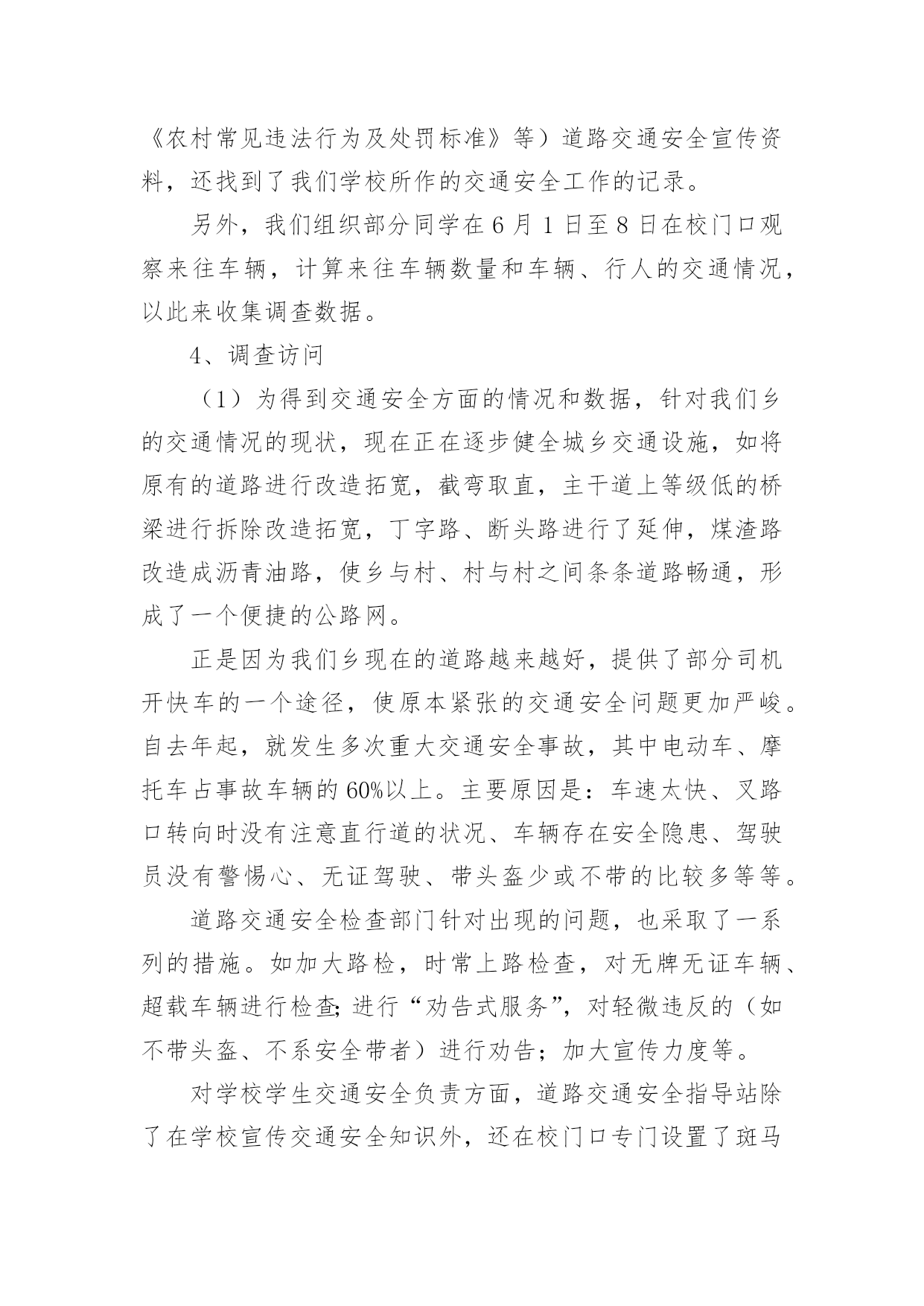 道路交通安全调研报告道路交通安全调研报告范文在人们素养不断提高的今天,报告的适用范围越来越广泛,我们在写报告的时候要注意逻辑的合理性。相信许多人会觉得报告很难写吧,下面是小编帮大家整理的道路交通安全调研报告范文,希望对大家有所帮助。一、调查目的随着社会的飞速发展,工作、生活节奏也越来越快,交通工具给我们带来了前所未有的方便。然而在大家感叹社会进步的同时,它也给我们带来了灾难,一个个蓬勃的生命消失在飞驰的车轮下,一个个幸福美满的家庭转眼间支离破碎,特别是那些还没有踏上社会的中小学生,也遇到了这样的灾难,亲人哀伤的呼唤,始终留不住弱小的生命。我们能做些什么呢?由于我们学校处在交通事故多发段,在校学生居住地比较分散,还有相当一部分同学居住地较远。因此,交通安全教育是我们学校安全工作中的重中之重,同时也是我们中学生应该要、必须要进行的教育。为此,在老师的指导和带领下作了一次深入的社会实践活动。二、调查过程本次社会调查活动以学生和我们周围的人们(如老师、家长等)为主体,以实践为载体,准备充分,层层推进,逐步深入。1、小组成立及宣传发动20xx年XX月上旬,我们成立了社会实践活动小组。由八(2)班董梦琦担任组长,刘波文为副组长。八(2)班同学为组员。指导老师是班主任甘仁伟老师。学员中分为调查访问小组、查阅收集资料小组、整理总结材料小组、撰写论文小组、宣传制作成果小组等。利用班会课,在上了一堂动员课,董梦琦组长还向我们介绍了这次社会实践活动的意义、目的及要求等。2、调查问卷设计、制订活动计划和活动方案我们分成各个小组后,接下来由我们大家通过讨论来一起进行调查问卷设计、制订活动计划和活动方案,为我们下面的活动做好积极的准备。3、收集资料为了了解与交通安全的相关内容,我们首先到学校图书室查阅了近期刊登在XX等报刊关于交通安全的有关政策与事故报道文章。部分同学在网上查找了《中华人民共和国道路交通安全法》的详细内容。我们还到了交通安全指导站,收集了关于关于如何进行交通安全宣传工作的资料。如《安全防范知识手册》、《文明交通承诺书》及县公安局交警大队关于道路交通安全宣传资料。要了解与我们学生切身有关的信息,为此我们又到政教处,在老师的配合下查找到了(如《安全防范便民手册》、《中学生道路交通安全知识》、《农村交通安全“十知道”》《农村常见违法行为及处罚标准》等)道路交通安全宣传资料,还找到了我们学校所作的交通安全工作的记录。另外,我们组织部分同学在6月1日至8日在校门口观察来往车辆,计算来往车辆数量和车辆、行人的交通情况,以此来收集调查数据。4、调查访问(1)为得到交通安全方面的情况和数据,针对我们乡的交通情况的现状,现在正在逐步健全城乡交通设施,如将原有的道路进行改造拓宽,截弯取直,主干道上等级低的桥梁进行拆除改造拓宽,丁字路、断头路进行了延伸,煤渣路改造成沥青油路,使乡与村、村与村之间条条道路畅通,形成了一个便捷的公路网。正是因为我们乡现在的道路越来越好,提供了部分司机开快车的一个途径,使原本紧张的交通安全问题更加严峻。自去年起,就发生多次重大交通安全事故,其中电动车、摩托车占事故车辆的60%以上。主要原因是:车速太快、叉路口转向时没有注意直行道的状况、车辆存在安全隐患、驾驶员没有警惕心、无证驾驶、带头盔少或不带的比较多等等。道路交通安全检查部门针对出现的问题,也采取了一系列的措施。如加大路检,时常上路检查,对无牌无证车辆、超载车辆进行检查;进行“劝告式服务”,对轻微违反的(如不带头盔、不系安全带者)进行劝告;加大宣传力度等。对学校学生交通安全负责方面,道路交通安全指导站除了在学校宣传交通安全知识外,还在校门口专门设置了斑马线。但是他们也看到了一些不好的现象,如学生家长在接送孩子时车乱停放现象较普遍,影响来往车辆行驶;学生在马路上等车现象严重等。通过我们这次调查活动,能更好的宣传道路交通安全知识,让交通安全意识进驻我们每一个学生及家长心中,给交通安全注入一股新的支持力量。那到底我们乡人民的交通安全意识如何呢?我们带着这个问题采访了部分路人,他们都说现在条件好了,每家每户都有自行车、电动车、摩托车,树立驾驶员的交通安全意识是非常重要的。为了生命,为了自己,“不争一秒”他们承诺会尽自己努力当好交通安全宣传员的。(2)要解决学生交通安全问题,仅靠交通管理部门是远远不够的。所以我们采访了我们学校的分管交通安全的政教处主任余军老师。他告诉我们,目前我们学校有教学班15个,在校学生700多人(其中初一年级6个班;初二年级5个班;初三年级4个班),本学期住校生就有330人。我们学校一出校门就是一条柏油马路,它是通往县城的要道,时时车水马龙,所以交通安全教育尤其重要,再加上学校是我们学生安全的直接管理人,负有对学生进行管理、教育和引导的职责,因此我们学校早就将交