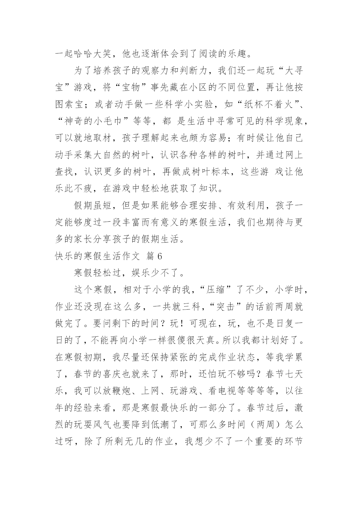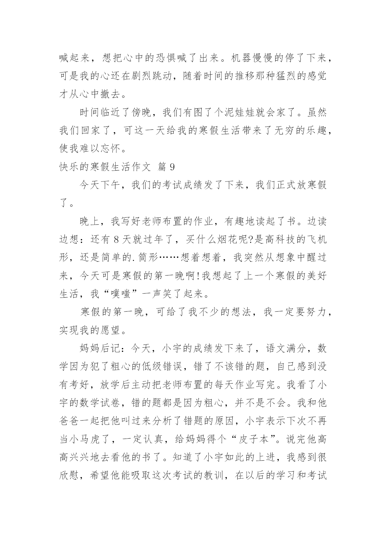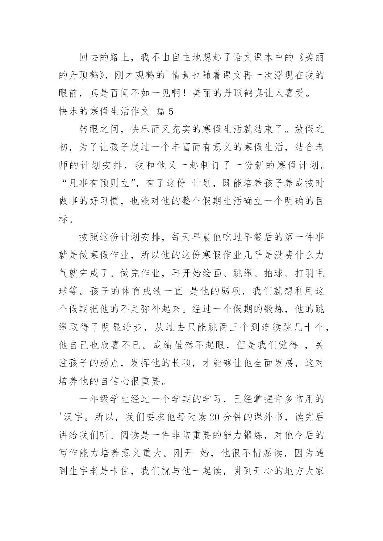 快乐的寒假生活作文【推荐】快乐的寒假生活作文汇编9篇在日常学习、工作和生活中,大家都写过作文,肯定对各类作文都很熟悉吧,作文是一种言语活动,具有高度的综合性和创造性。相信很多朋友都对写作文感到非常苦恼吧,下面是小编整理的快乐的寒假生活作文9篇,欢迎阅读,希望大家能够喜欢。快乐的寒假生活作文篇1寒假这些天发生的趣事可真多啊,寒假的第一天,也是,我跑步打卡的'第一天。最开始,我是和妹妹一起跑的。妹妹和我在院子里比赛,院子里还有一个池子,池子里还有我的宠物-小鱼。雨天的时候,我在车库里跑,因为雨太大了,你就像一个巨人在跺脚。阴天的时候,我在马路上跑,周围的车子上奔流不息的河水,飞快地向前开去,我一时兴起就和车子比起赛来了,我奋力地向前奔跑,眼看着就要落后了,突然红灯亮了,车子停下了,最后我终于赢了!我立刻眉开眼笑起来。有一次,我在马路上跑的时候,突然听到了,有人喊救命!我跑过去一看好大一个坑啊,仔细一看,里面有一个外国人,个子矮矮的,像小人国里出来的。他很胖,我使出九牛二虎之力,终于把他拉上来了,他连声说感谢就走了。我喜欢跑步打卡这一项运动,其实我想去森林跑,因为那里有小动物,空气也很清新。这就是我寒假中,最有趣的事。快乐的寒假生活作文篇2今天爸爸带我到东湖公园玩,我们进去迎面看到了梅花,梅花红的似火,白的似雪,粉的似云霞,五彩缤纷,美不胜收,好看极了,然后,我踩着石头来到了湖边,我近处看,水平如镜的湖面倒映着青山。忽然,一阵微风吹过,平静的湖面立刻泛起了片片的波纹。湖面上还有鹅,大白鹅很爱打扮,洁白的羽毛,鲜红的冠儿。唱起歌来,高亢雄壮,啊,啊,啊!走起路来,昂首阔步,那副骄傲的'样子,活像一个高傲的王子。再往前走,就来到崇和门广场,我们一起玩套圈,打枪,玩得很开心。快乐的寒假生活作文篇3寒假来临了,又得一阵子不能见到同学啰!现在就和大家分享我的寒假生活。除夕当天,我们全家回到奶奶家吃团圆饭,大家有说有笑边吃年夜饭边聊天,而我们这群顽皮的小孩在看电视,好不容易等到奶奶发红包,奶奶手上拿了一叠红包一个一个叫名字,当叫到我时,我带着满心欢喜的心情去领红包并向奶奶说吉祥话(阿婆!新年快乐!身体健康!),奶奶说我好乖哦!年初二我们一家人搭机前往三亚(陪妈妈回娘家顺便旅游),在三亚的这几天我看到了许多既感人又有趣的事,例如:在旅游途中亲眼看见一位七十八岁的阿婆牵着黄牛埋头苦干在田里工作,在她脸上看不见忧愁伤感的一面,而是露出了和蔼亲切的`笑容。还有外婆做红粿,瞧她忙里忙外的准备前置工作,真是辛苦!外婆手巧灵活一个接一个做出漂亮的红粿,真是厉害!(我也有参与哦!很好玩耶!!)不一会儿的功夫外公便将蒸好的红粿端出,看着那又香又软又Q的红粿,心想一定很好吃!不知不觉口水即流下了。更好玩的是我们去海边挖蛤仔,大家都很努力的挖,一起同心协力的挖了两大锅,哈!又有一顿丰富的晚餐啰!三亚之旅回味无穷,在三亚亲眼目睹感人事情深深牢记在我的脑海里,我们除了要学习阿婆的精神以外,更要随时记得孝顺父母哦!快乐的寒假生活作文篇4寒假的一天,我和爸爸妈妈兴致勃勃地来到盐城湿地观鹤。进入丹顶鹤保护区,讲解员首先把我们带到了丹顶鹤人工饲养区参观,我们便和这些美丽的天使有了近距离的接触。丹顶鹤拥有光洁的羽毛,鲜红的头顶,修长的脖子和双腿,它们气质高雅,亭亭玉立,走起路来楚楚动人。讲解员姐姐告诉我们,丹顶鹤非常忠贞,成年丹顶鹤通常是成对地生活在一起,如果其中一只病亡,另一只便会终生独居。听了她的介绍,我想,丹顶鹤真是圣洁的化身啊!离开了家鹤饲养区,我们登上了高高的观鹤台。讲解员告诉我们,能不能观看到野生鹤全凭运气。我们等了好久,终于发现四只野鹤在远处飞过,看着它们在空中盘旋的英姿,我激动地跳了起来!回去的路上,我不由自主地想起了语文课本中的《美丽的丹顶鹤》,刚才观鹤的`情景也随着课文再一次浮现在我的眼前,真是百闻不如一见啊!美丽的丹顶鹤真让人喜爱。快乐的寒假生活作文篇5转眼之间,快乐而又充实的寒假生活就结束了。放假之初,为了让孩子度过一个丰富而有意义的寒假生活,结合老师的计划安排,我和他又一起制订了一份新的寒假计划。“凡事有预则立”,有了这份计划,既能培养孩子养成按时做事的好习惯,也能对他的整个假期生活确立一个明确的目标。按照这份计划安排,每天早晨他吃过早餐后的第一件事就是做寒假作业,所以他的这份寒假作业几乎是没费什么力气就完成了。做完作业,再开始绘画、跳绳、拍球、打羽毛球等。孩子的体育成绩一直是他的弱项,我们就想利用这个假期把他的不足弥补起来。经过一个假期的锻炼,他的跳绳取得了明显进步,从过去只能跳两三个到连续跳几十个,他自己也欣喜不已。成绩虽然不起眼,但是我们觉得,关注孩子的弱点,发挥他的长项,才能够让他全面发展,这对培养他的自信心很重要。一年级学生经过一个学期的学